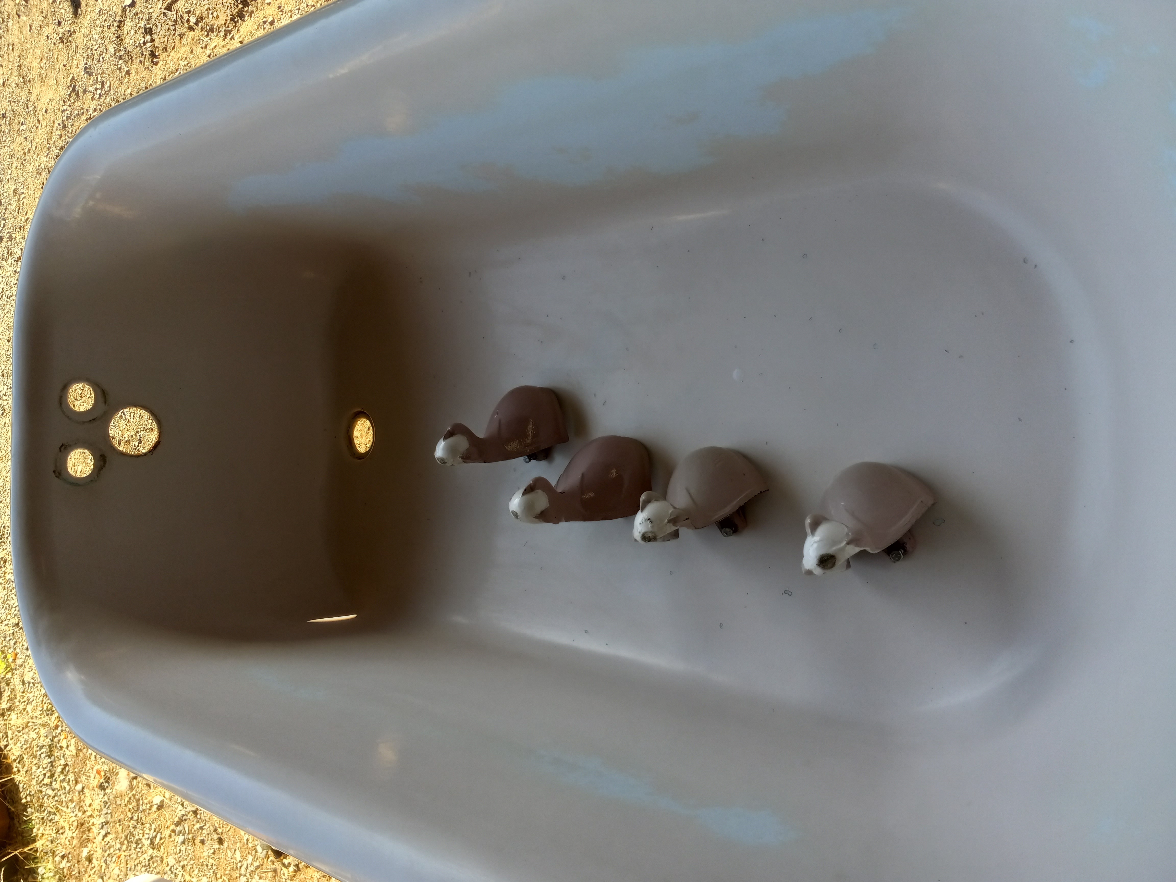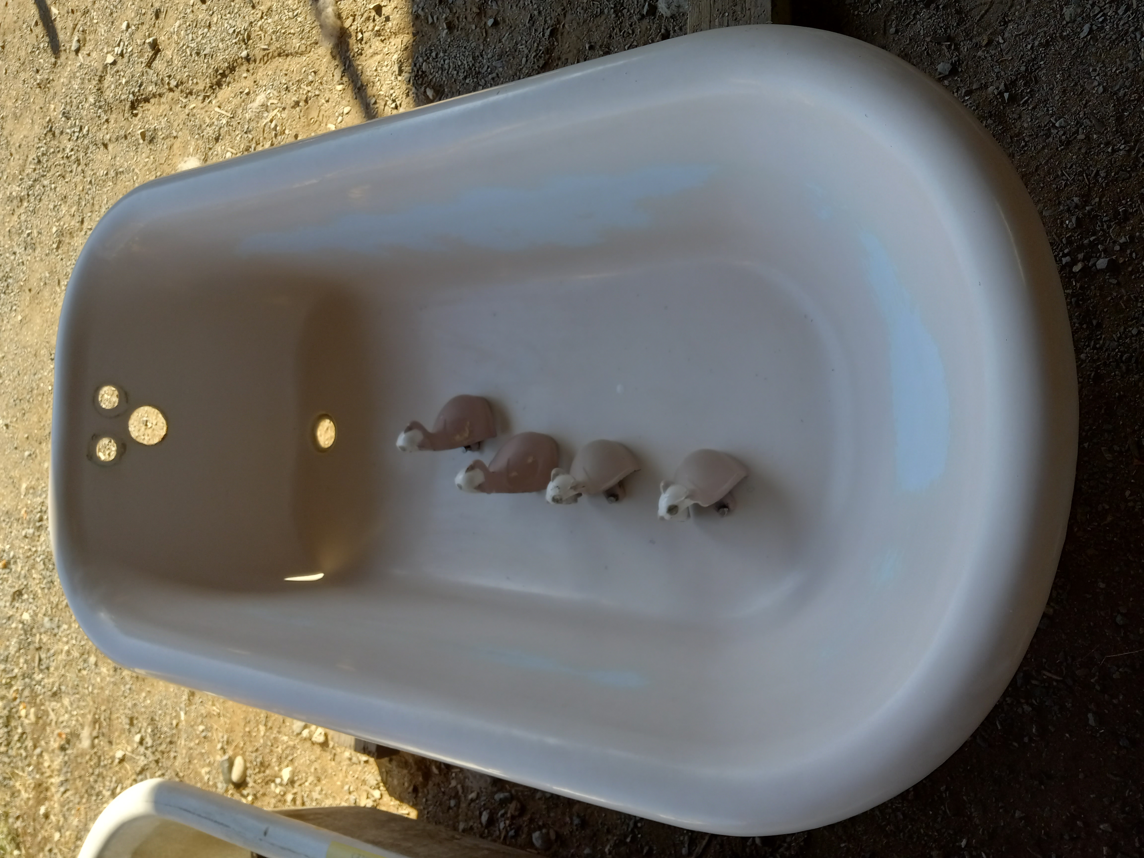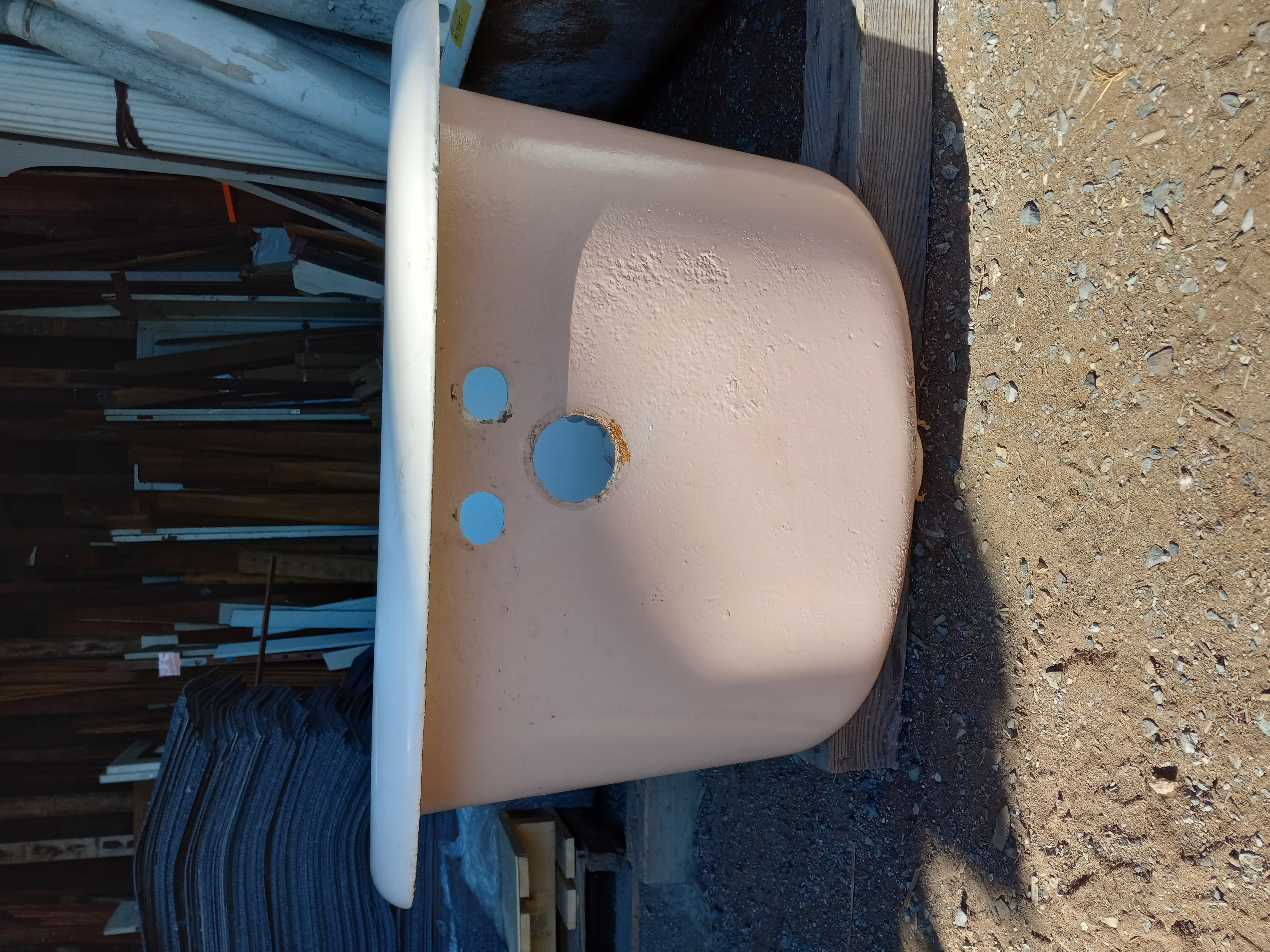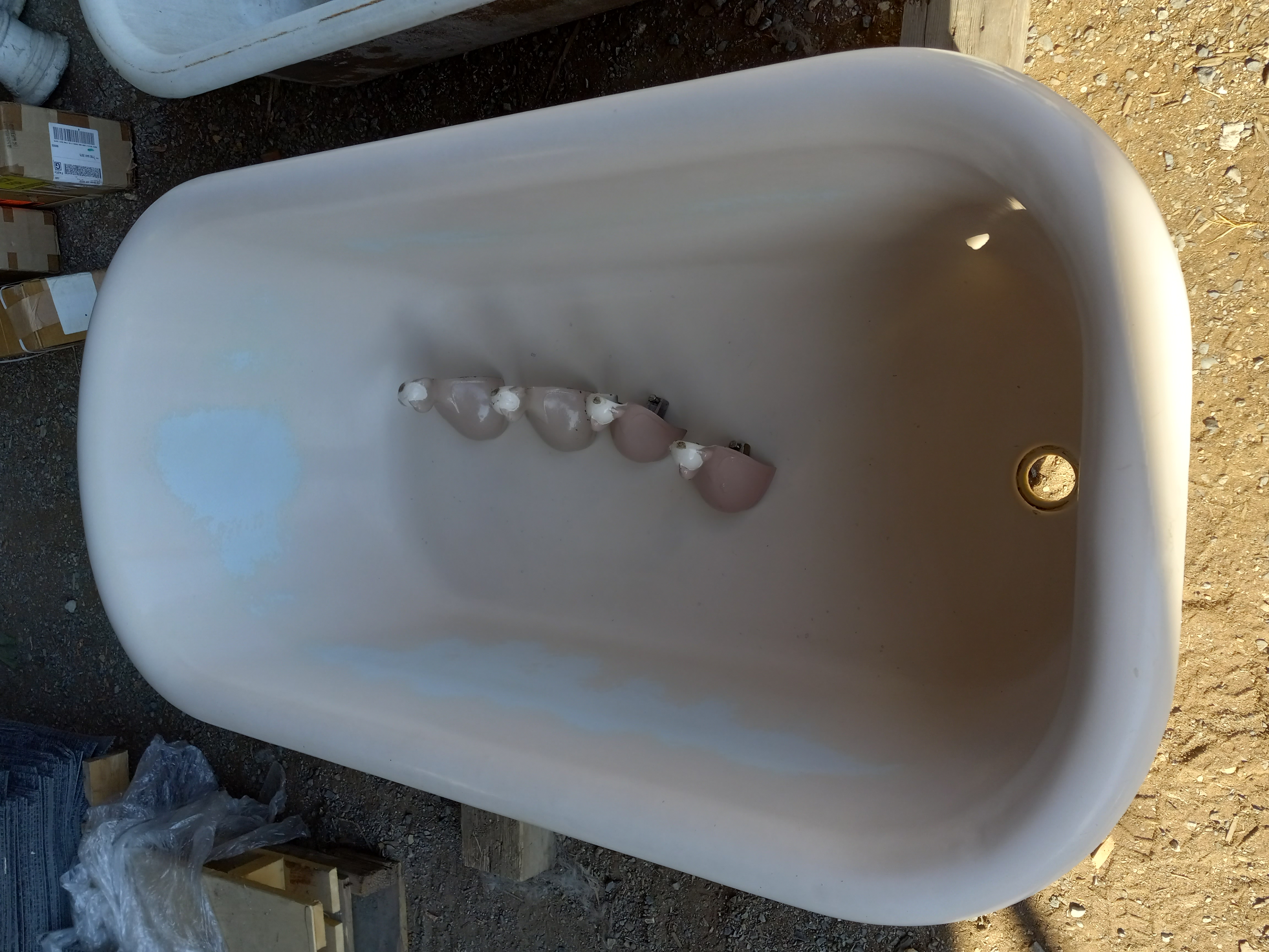 Vintage clawfoot cast iron bathtub, has some nicks in the enamel and a little miscoloring. Looks to be mostly pink with a little bit of white enamel. The enameling in these tubs can be replaced. Has all four clawfeet. Dimensions are 60 inches long by 30 inches wide and 16 inches deep.
