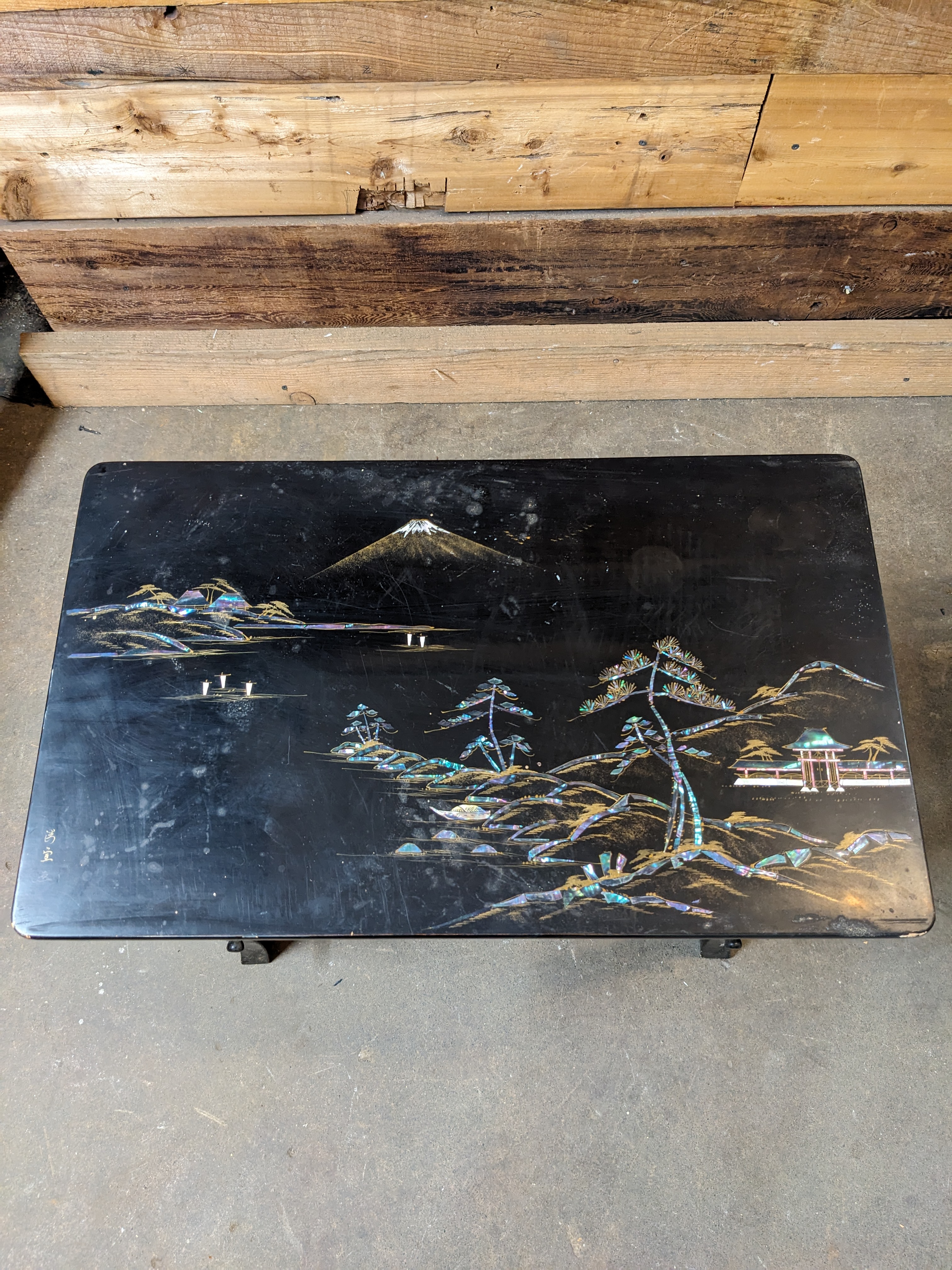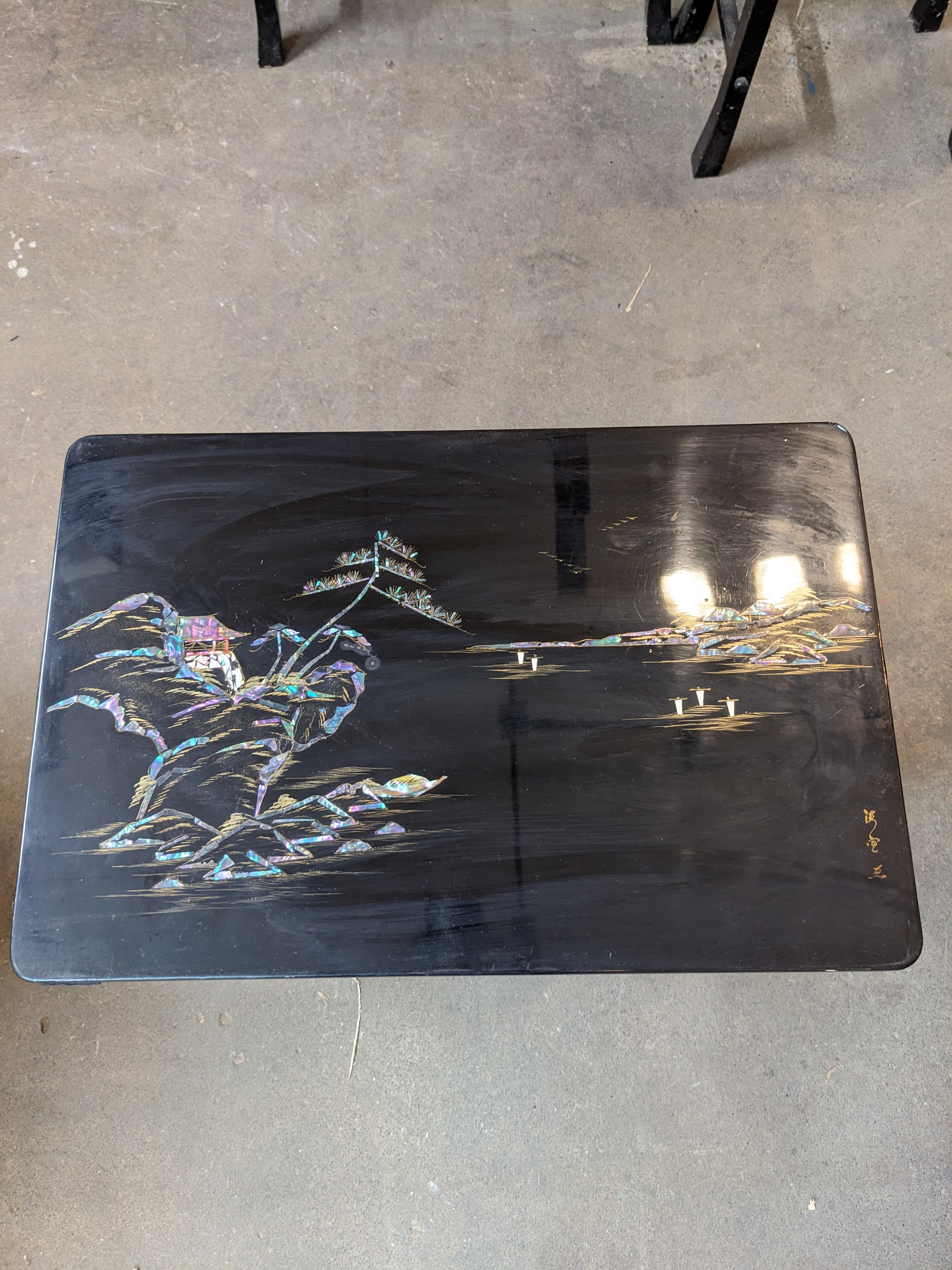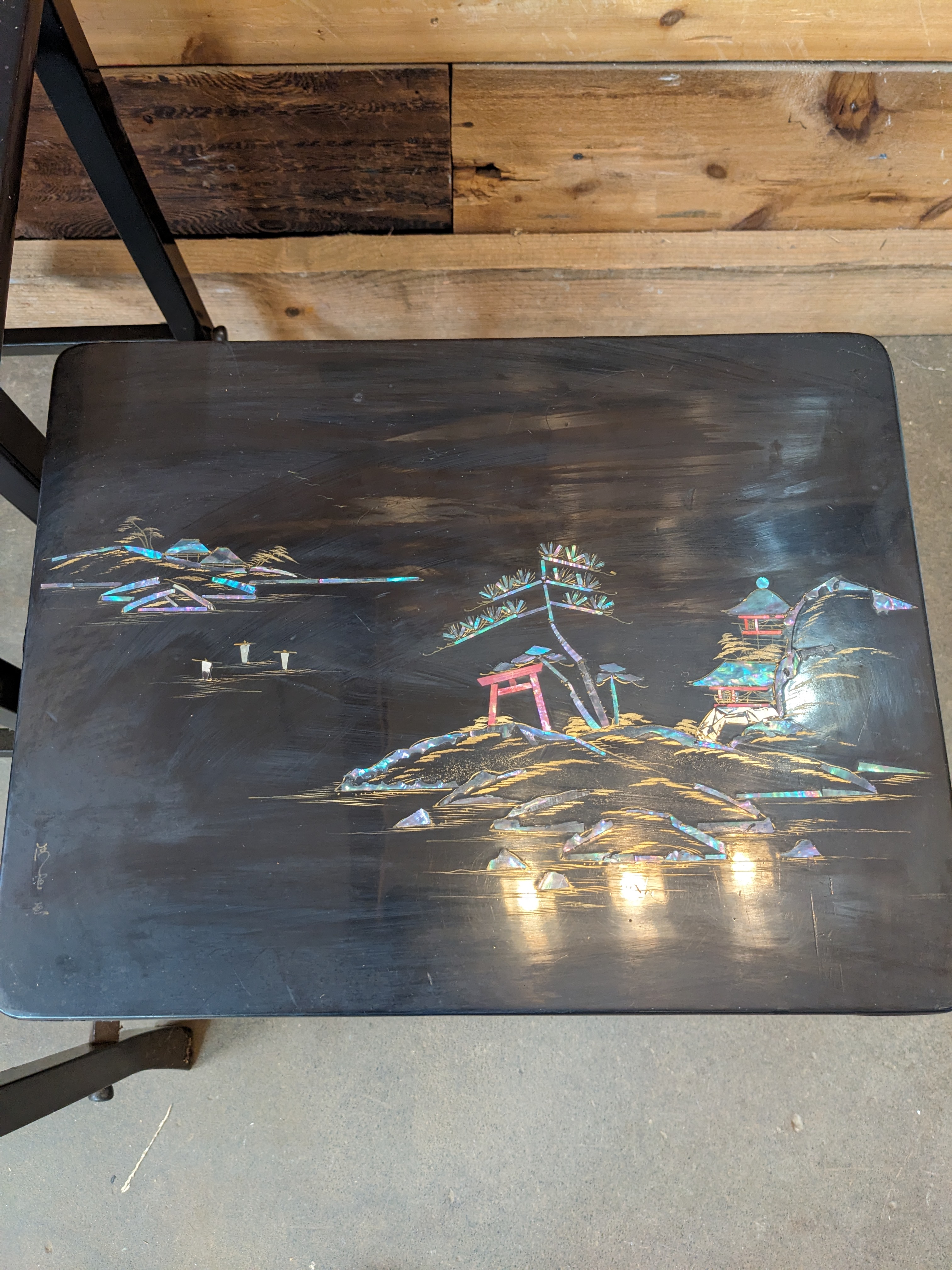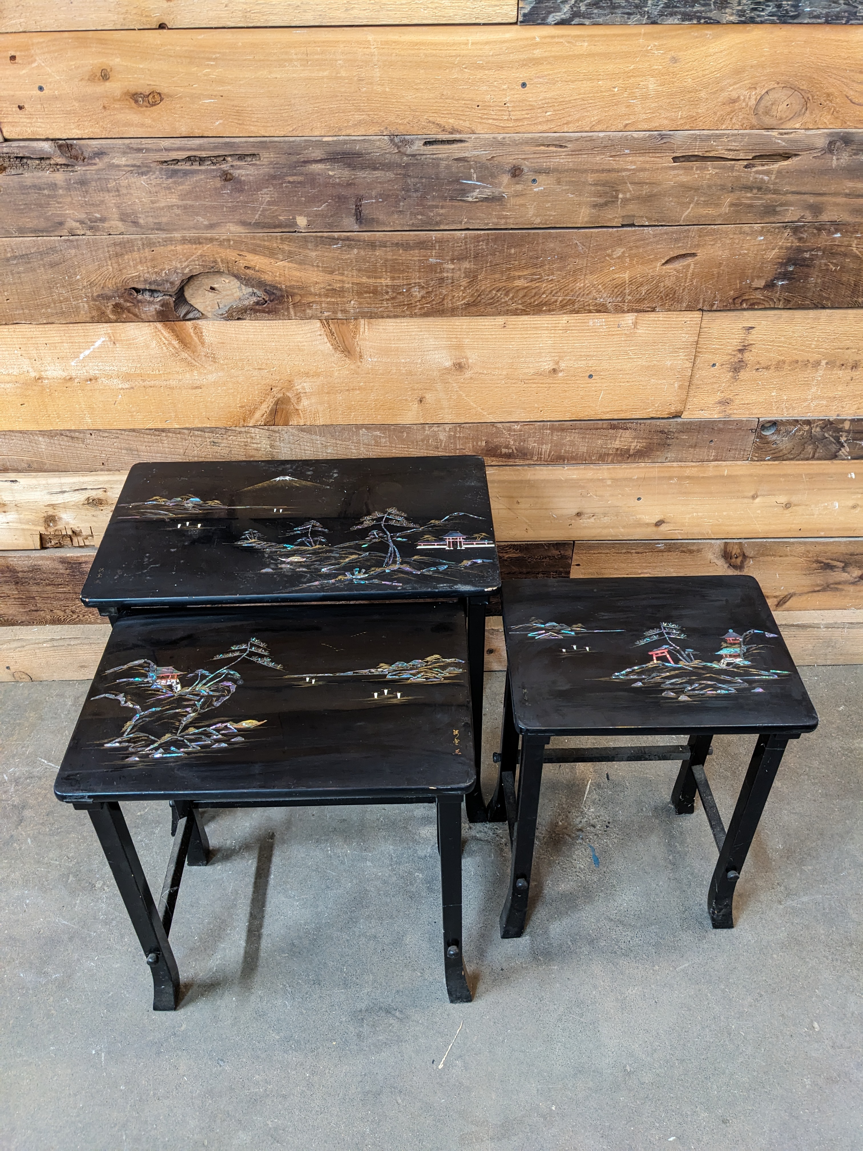 Decorative opalescent nesting tables with a black lacquer finish in good condition.
