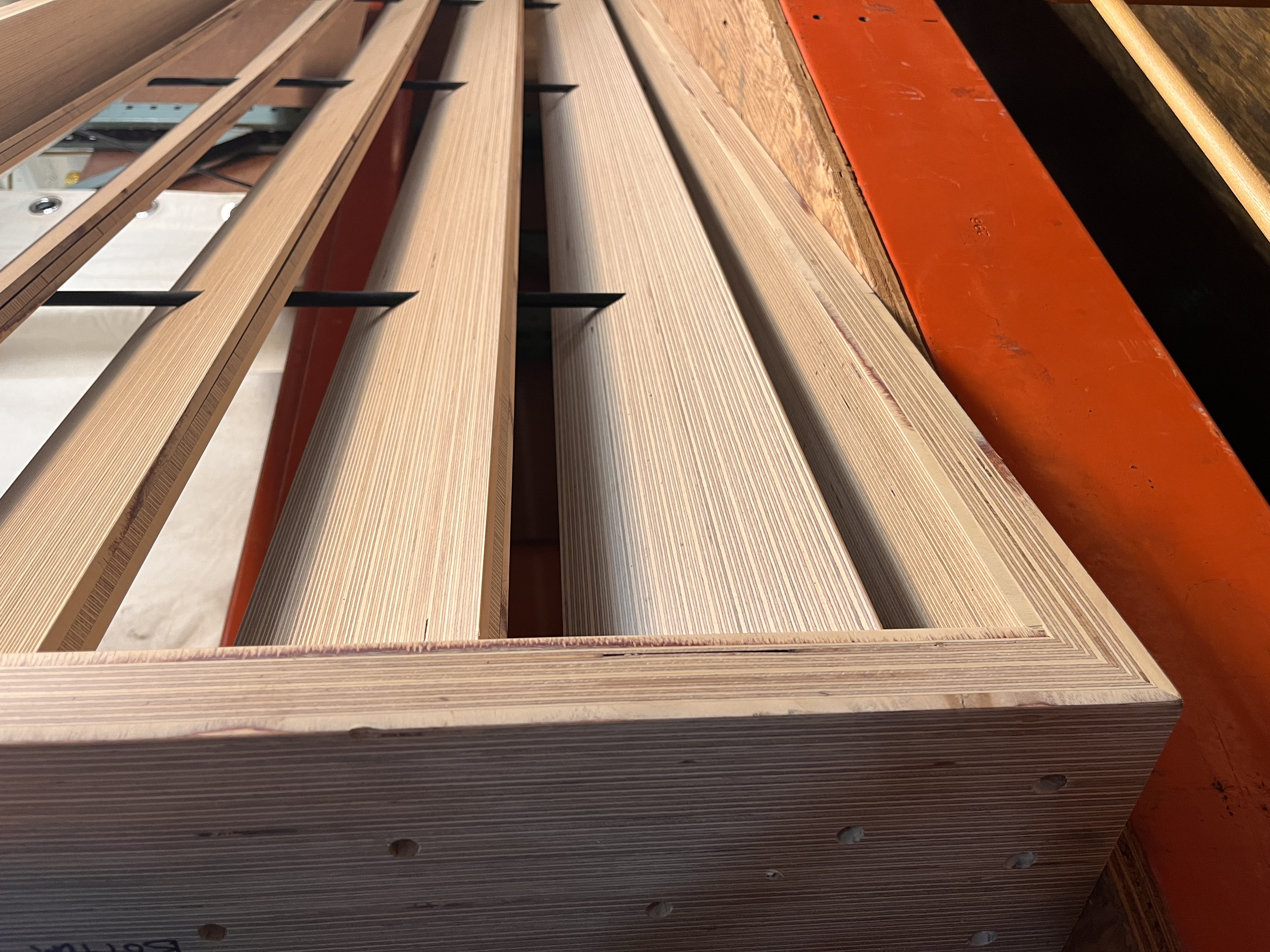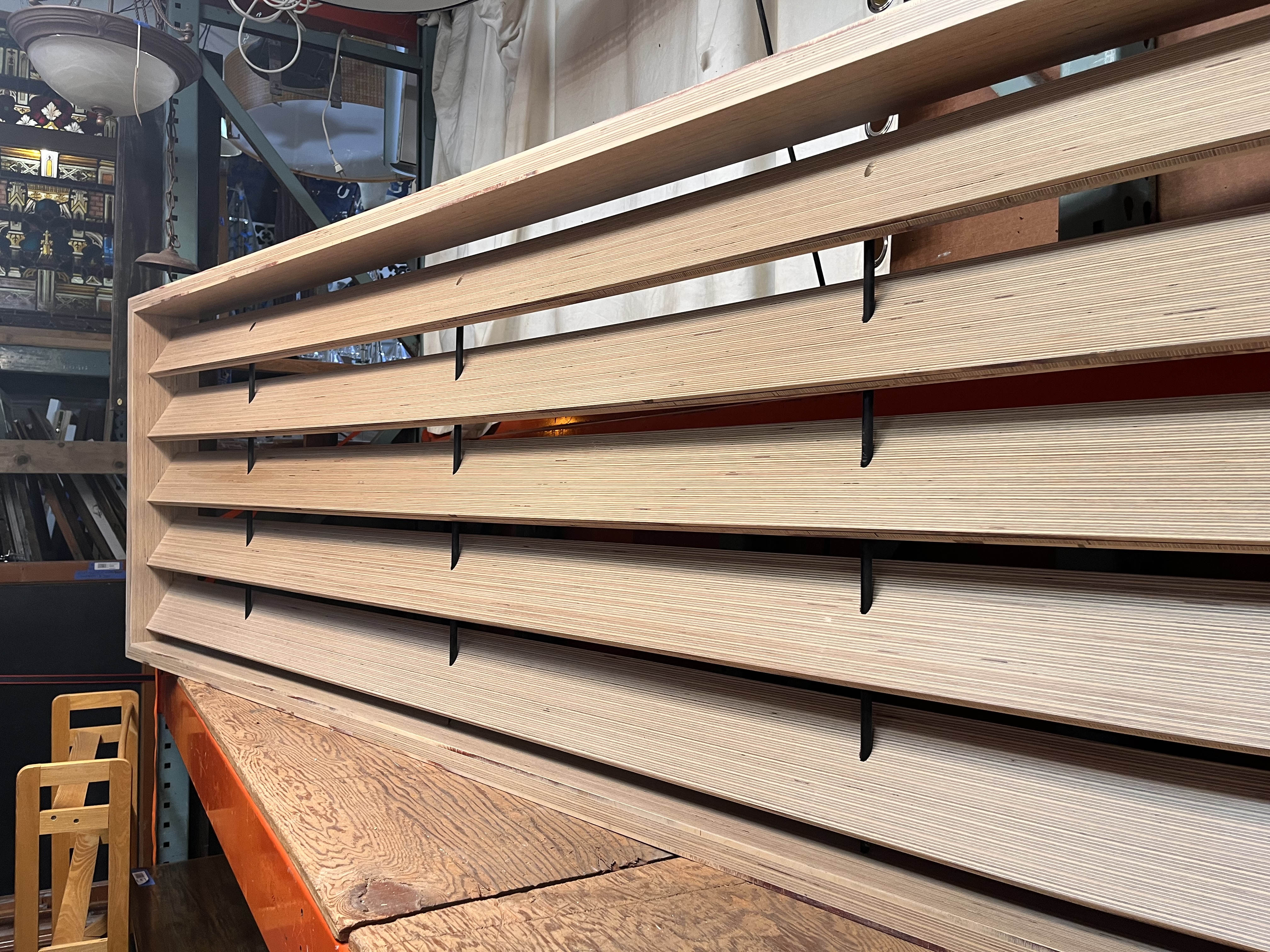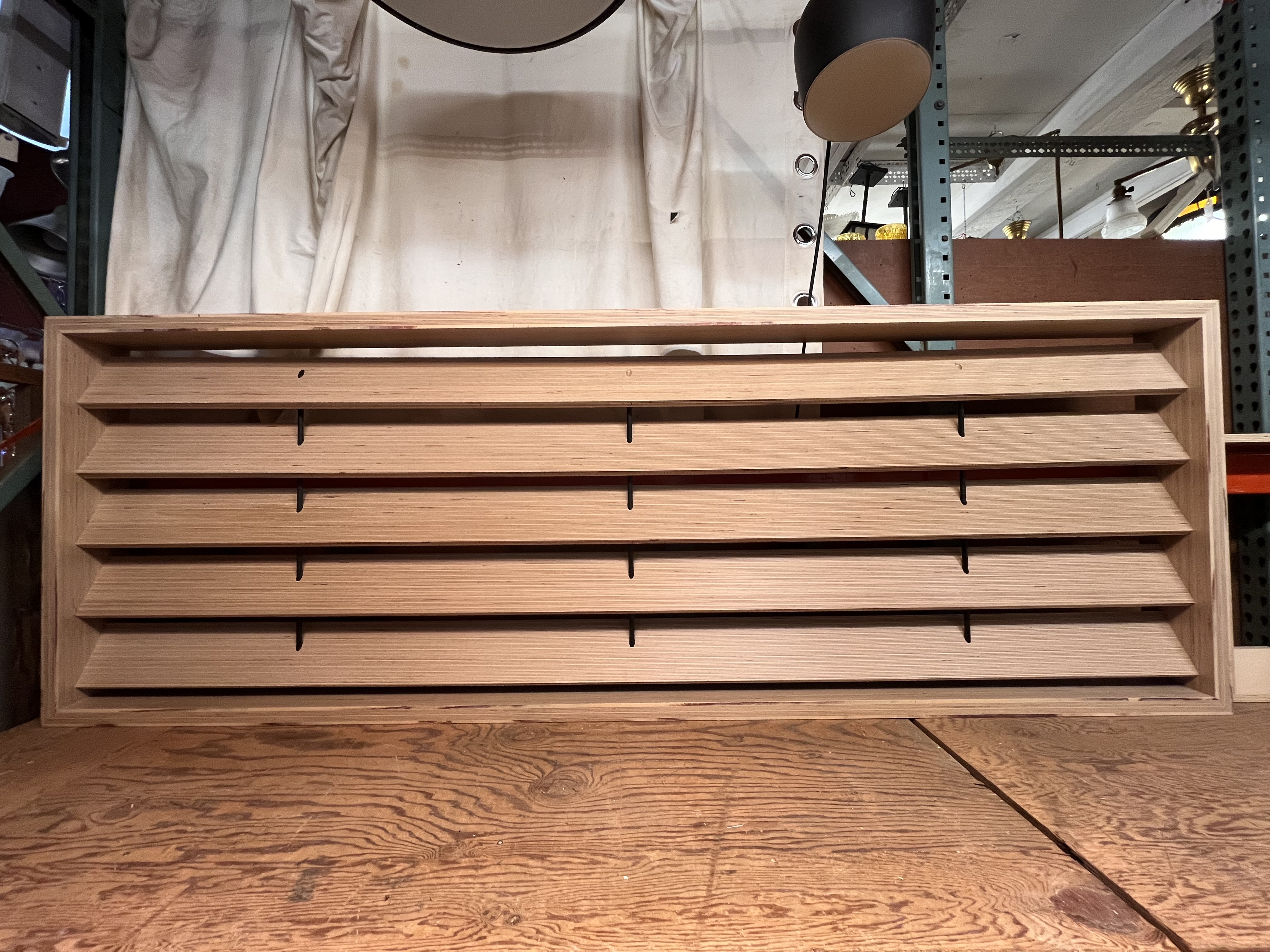 Designed to create a division in space while light and air to permeate the space. Creates a modern linear focus. Made from laminated engineered wood. Some of the wood rings going between the louvered slats have some damage.