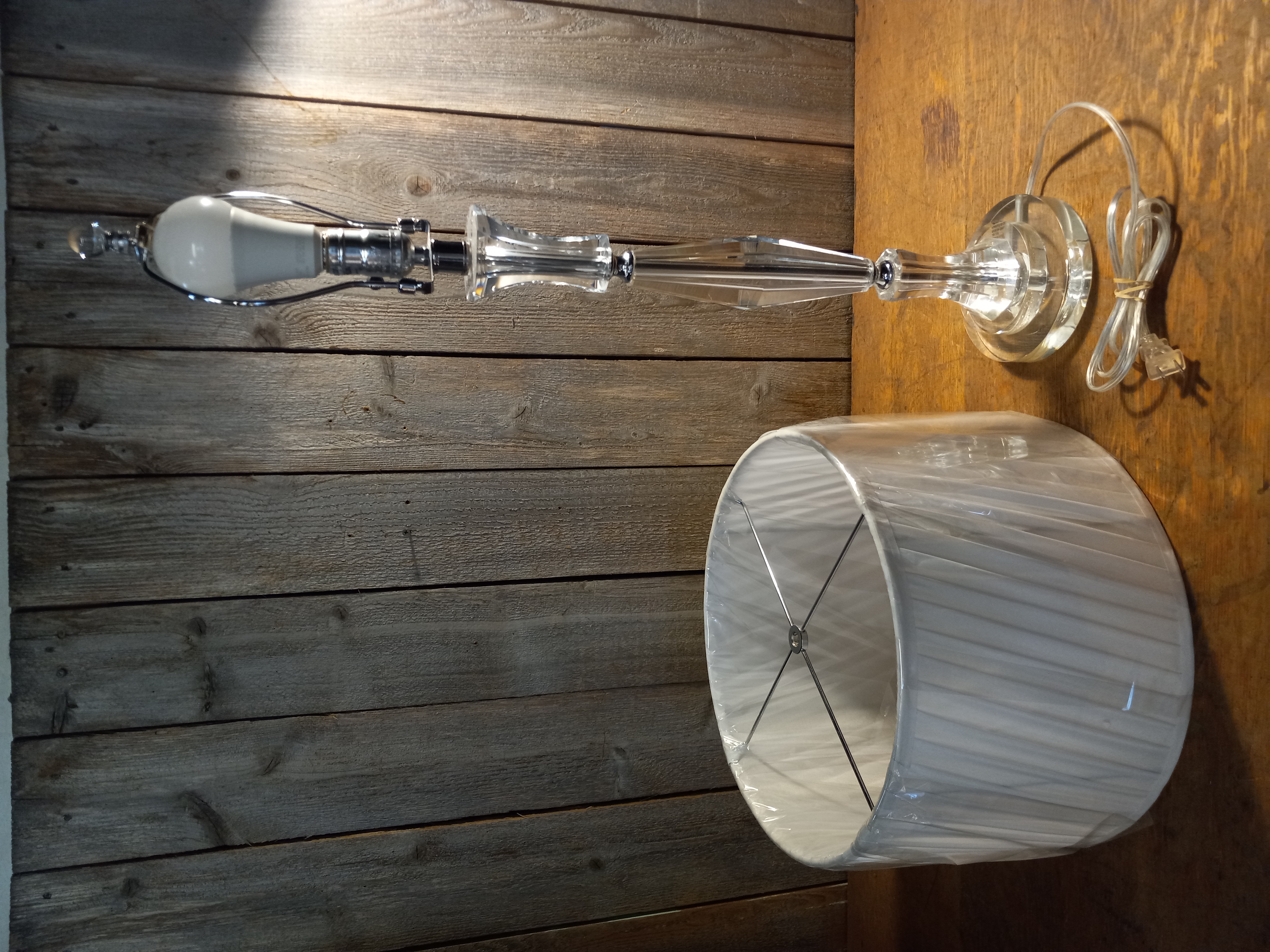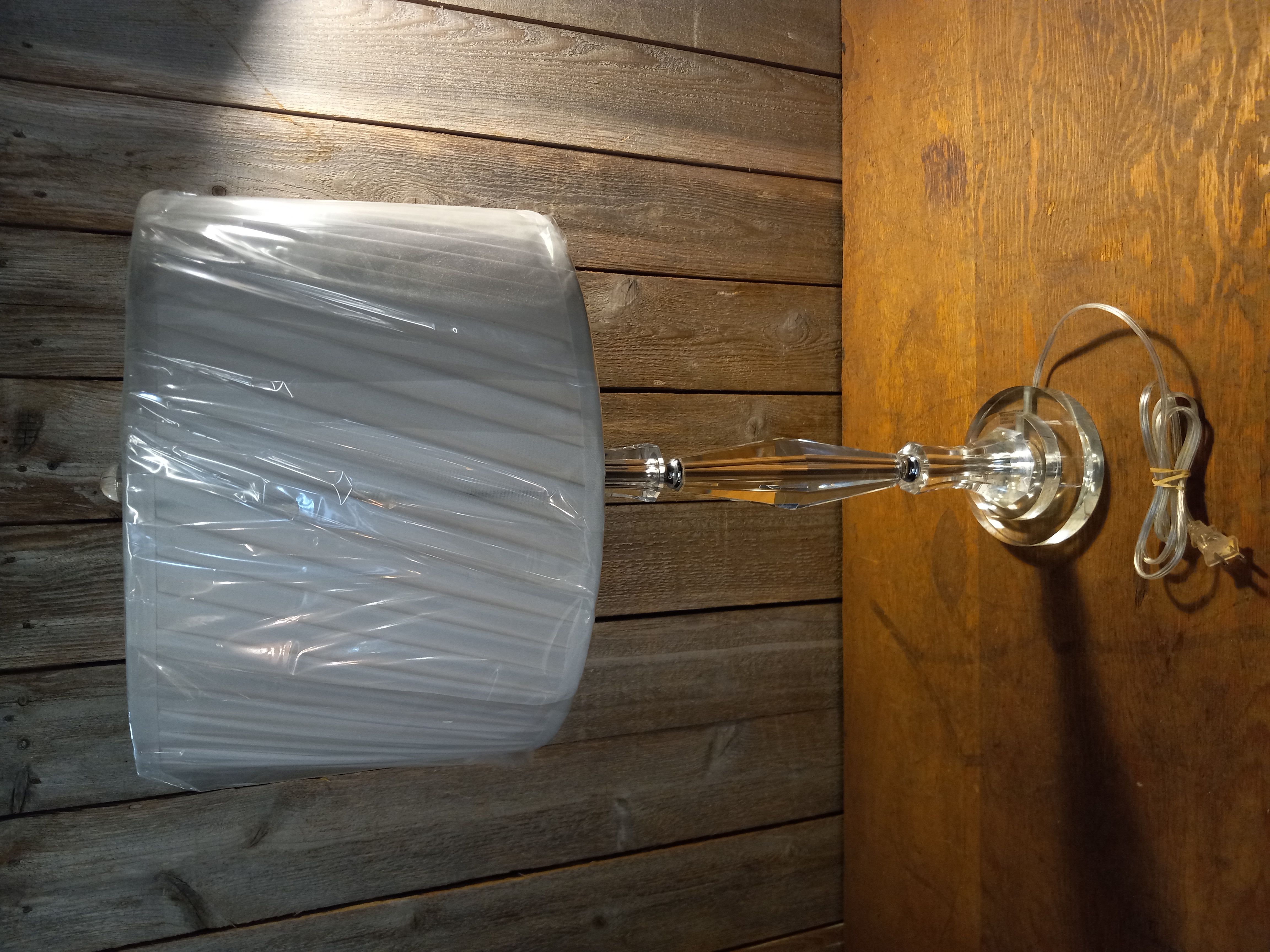 A side table lamp with an elegant crystal like body and an new unopened shade. This lamp works just fine when plugged in, and has three levels of brightness. It measures 5.75 x 30.75 inches, and the shade measures 14 x 9.5 inches.