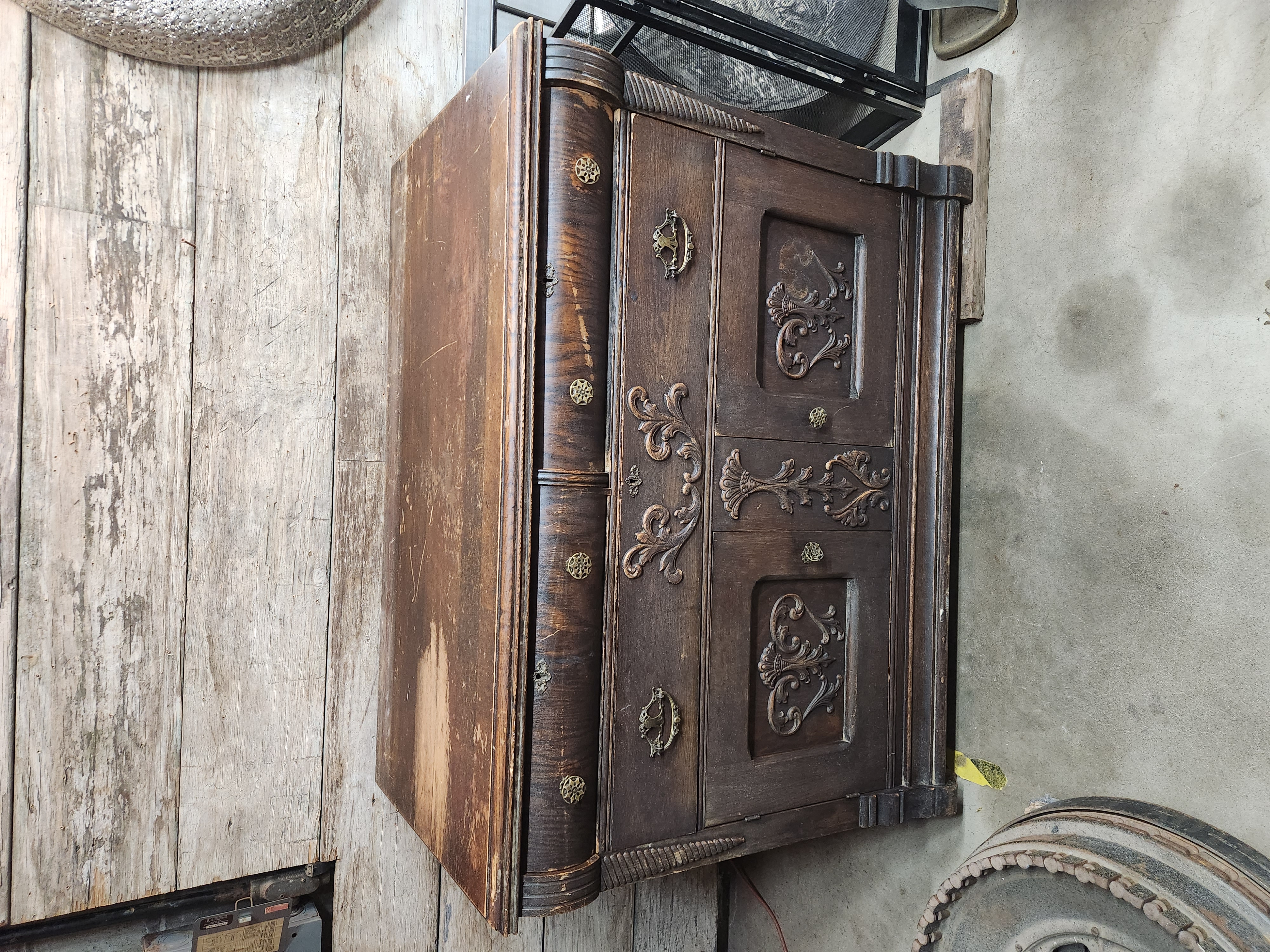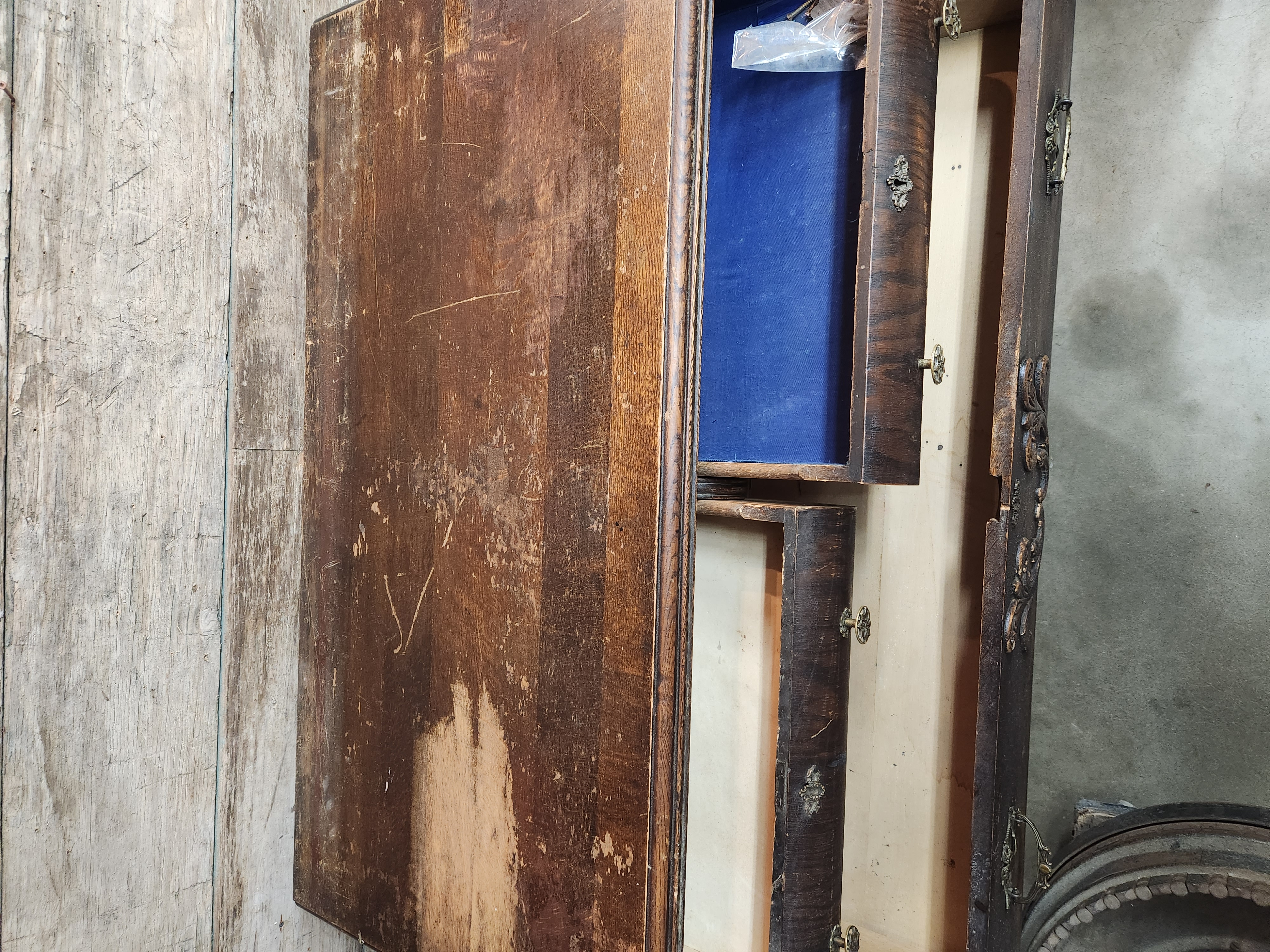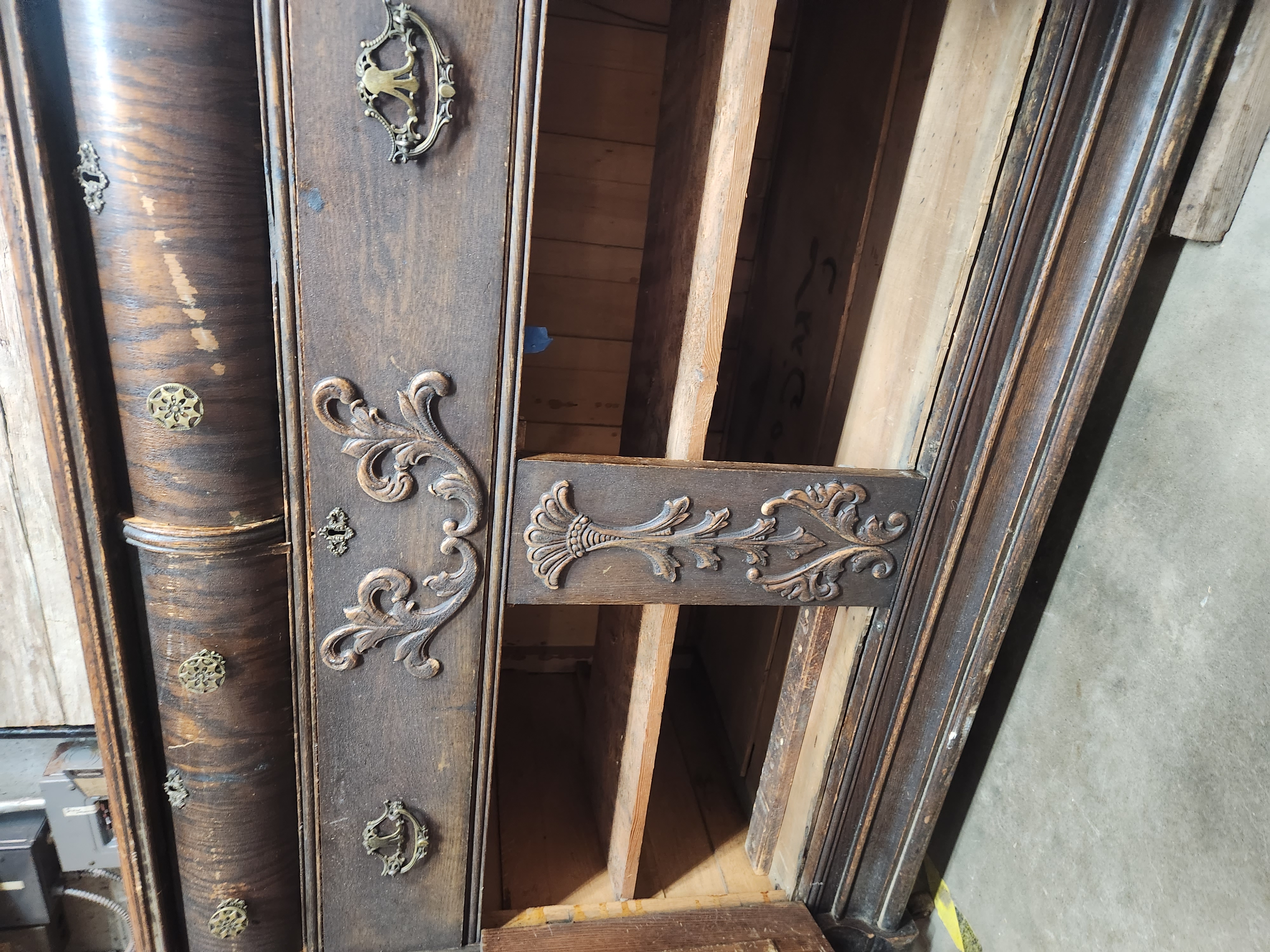 While this buffet is amazing as it is, it needs some care and effort. It is missing a couple pieces and there are some surface scratches. It is missing a caster on the front leg. There is still a lot to admire like the quarter sawn oak and decorative details. Any work put into this will not go to waste!