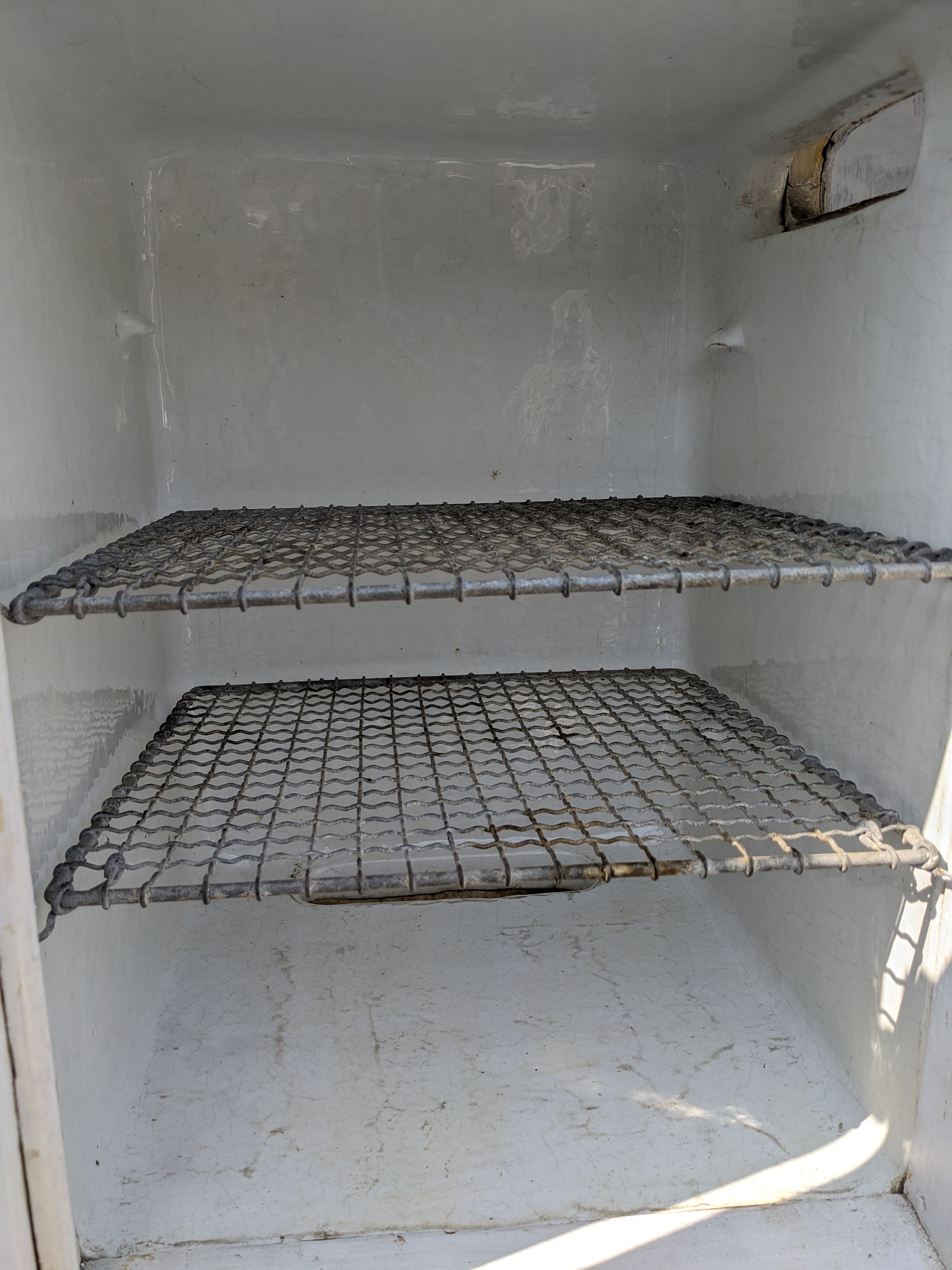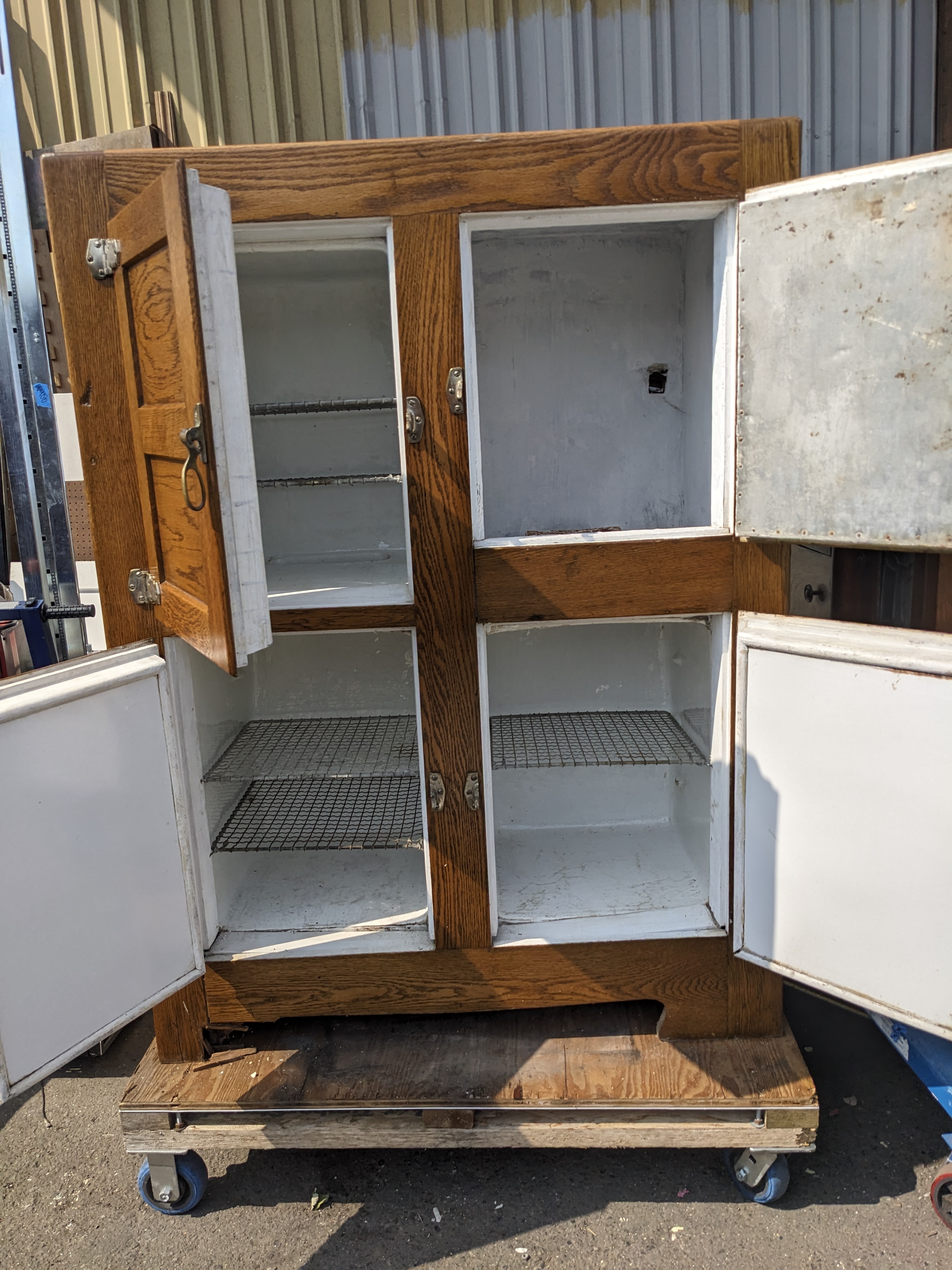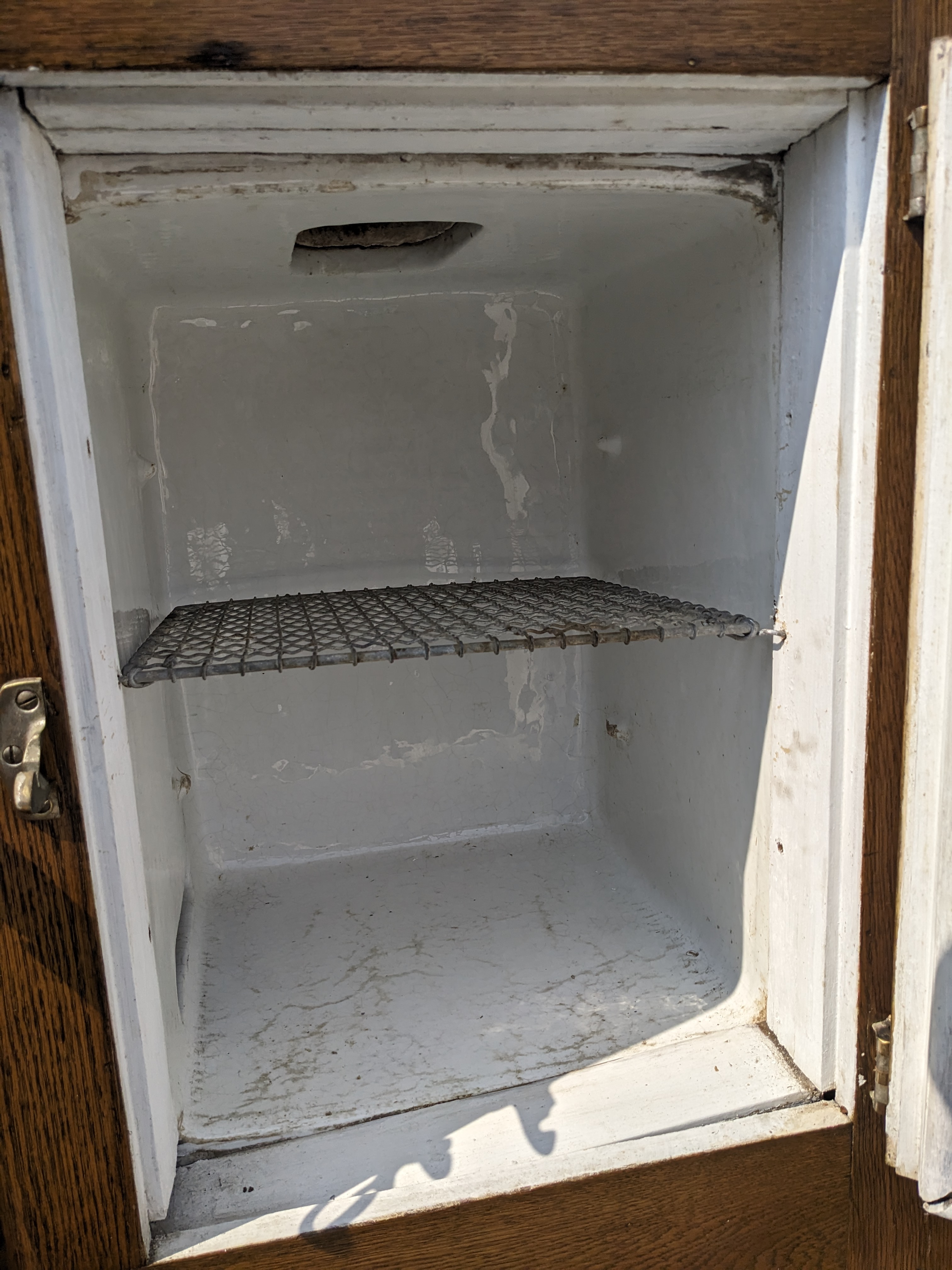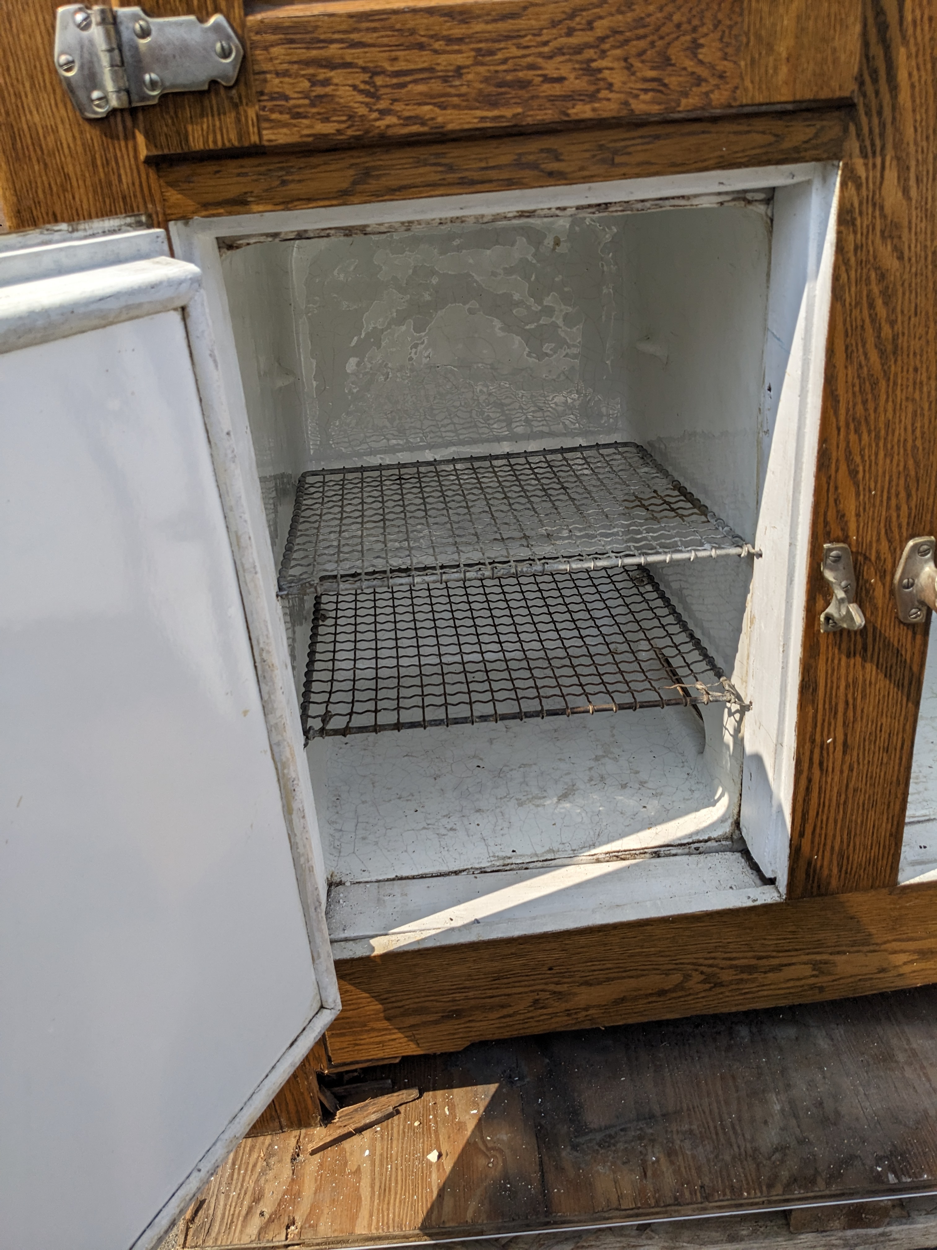 This one is a big ice box! 4 full sized compartments that are enameled on the inside. The one that is different, top right, may have been the freezer? Or housed the refrigeration? The metal is rusted through in the cap piece but was coated with paint since then. The door is covered with metal. It looks in nice condition considering its age. We don't know about its operation, if it works or not.