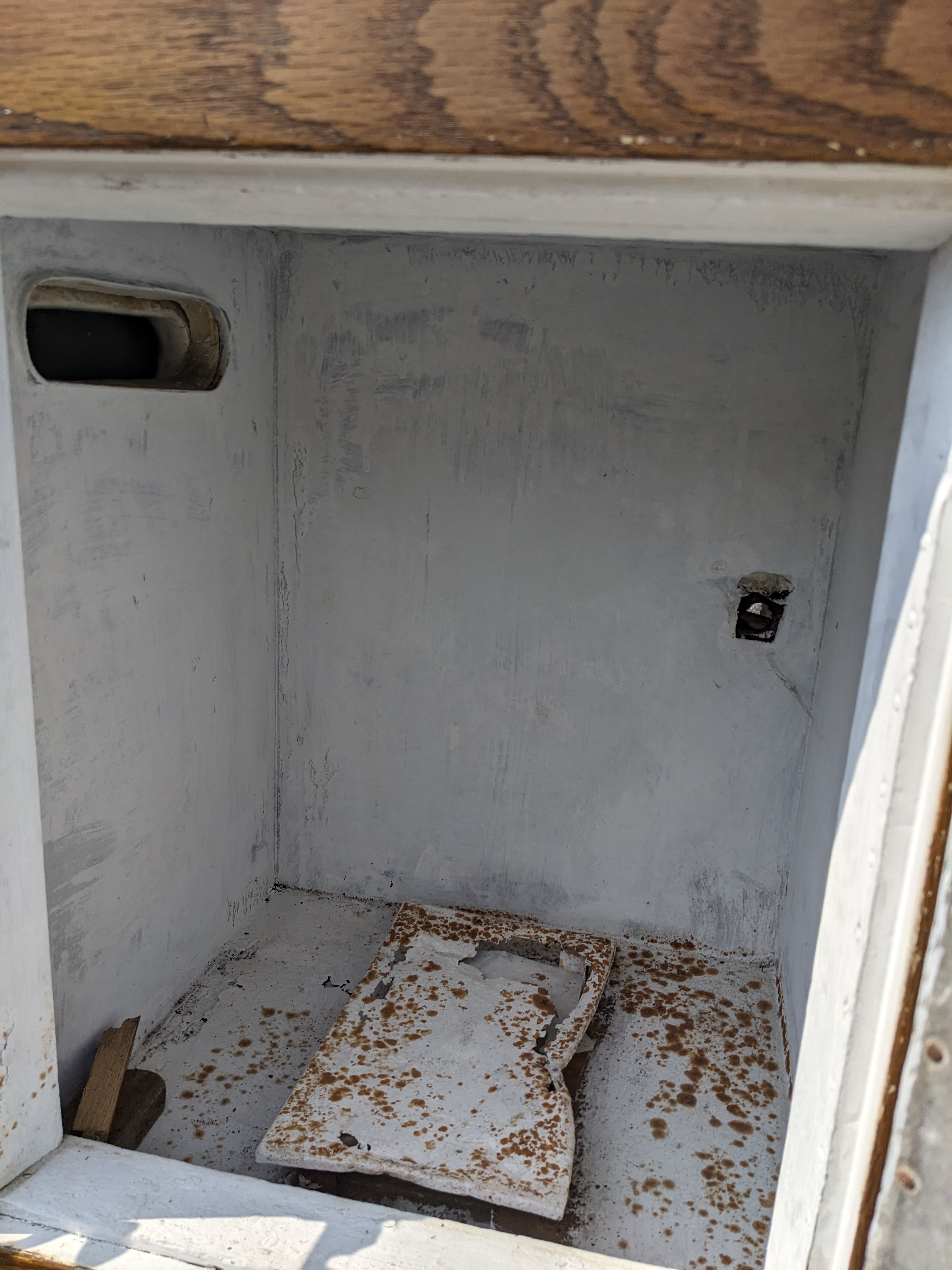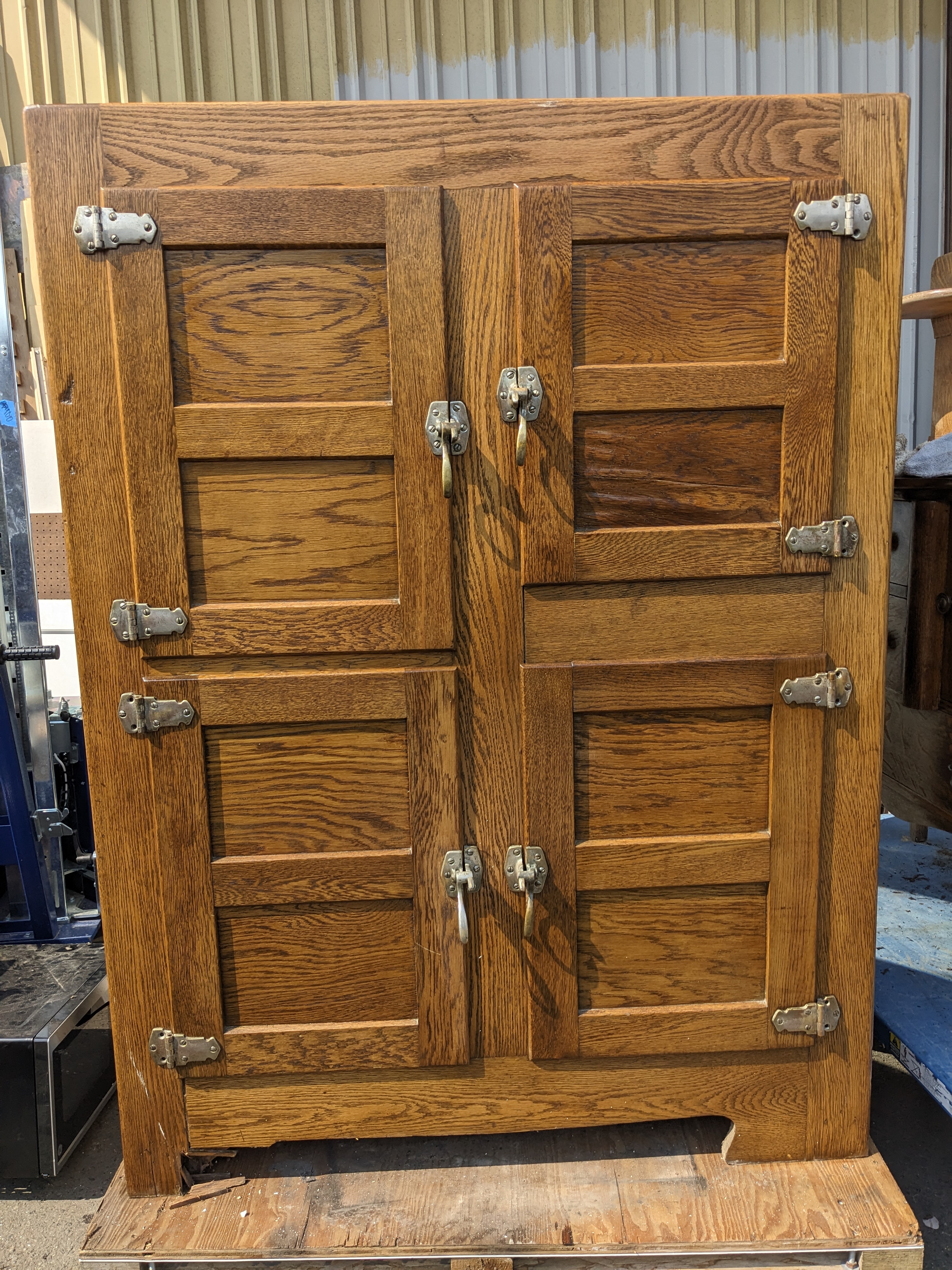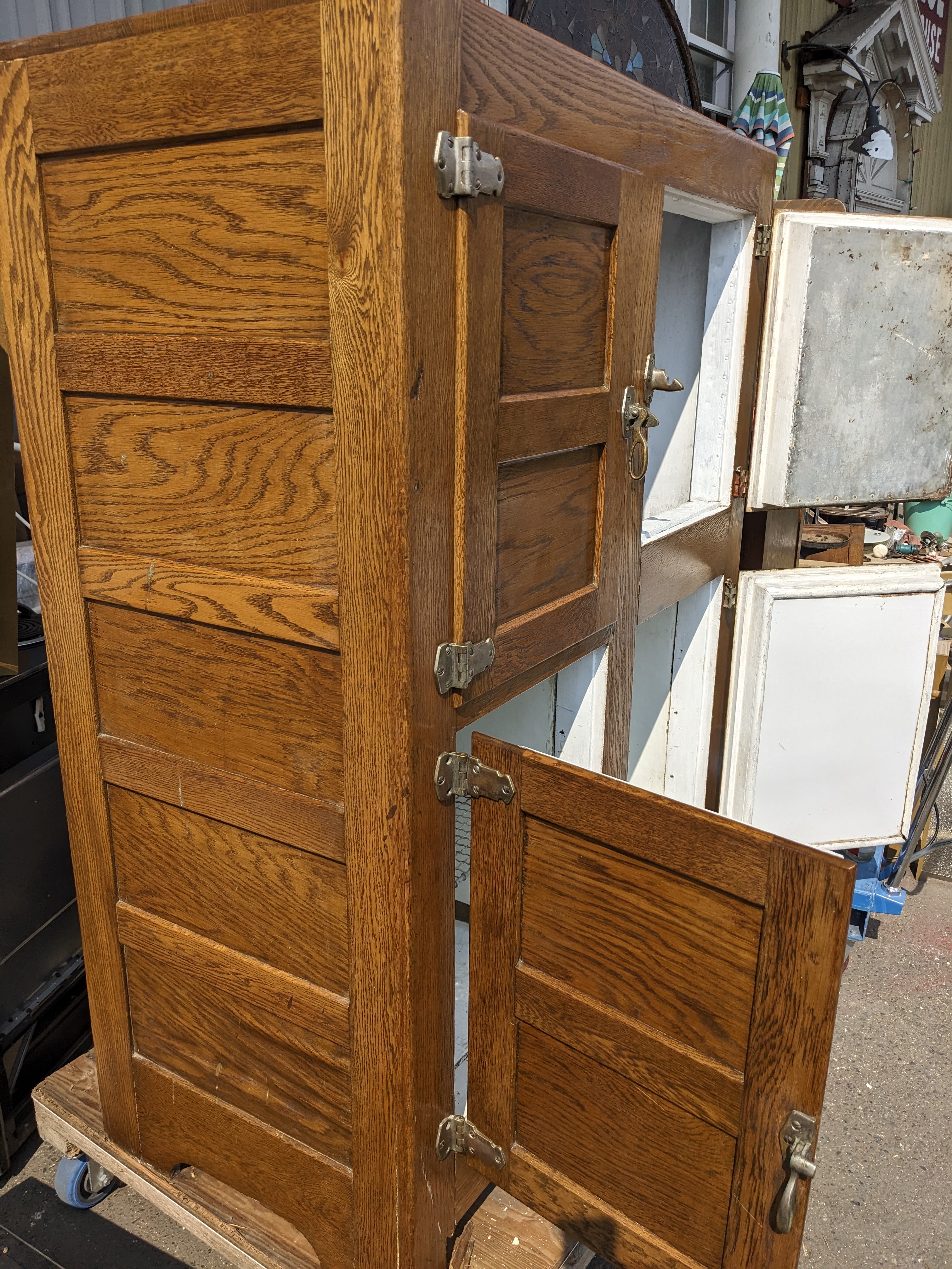 This one is a big ice box! 4 full sized compartments that are enameled on the inside. The one that is different, top right, may have been the freezer? Or housed the refrigeration? The metal is rusted through in the cap piece but was coated with paint since then. The door is covered with metal. It looks in nice condition considering its age. We don't know about its operation, if it works or not.