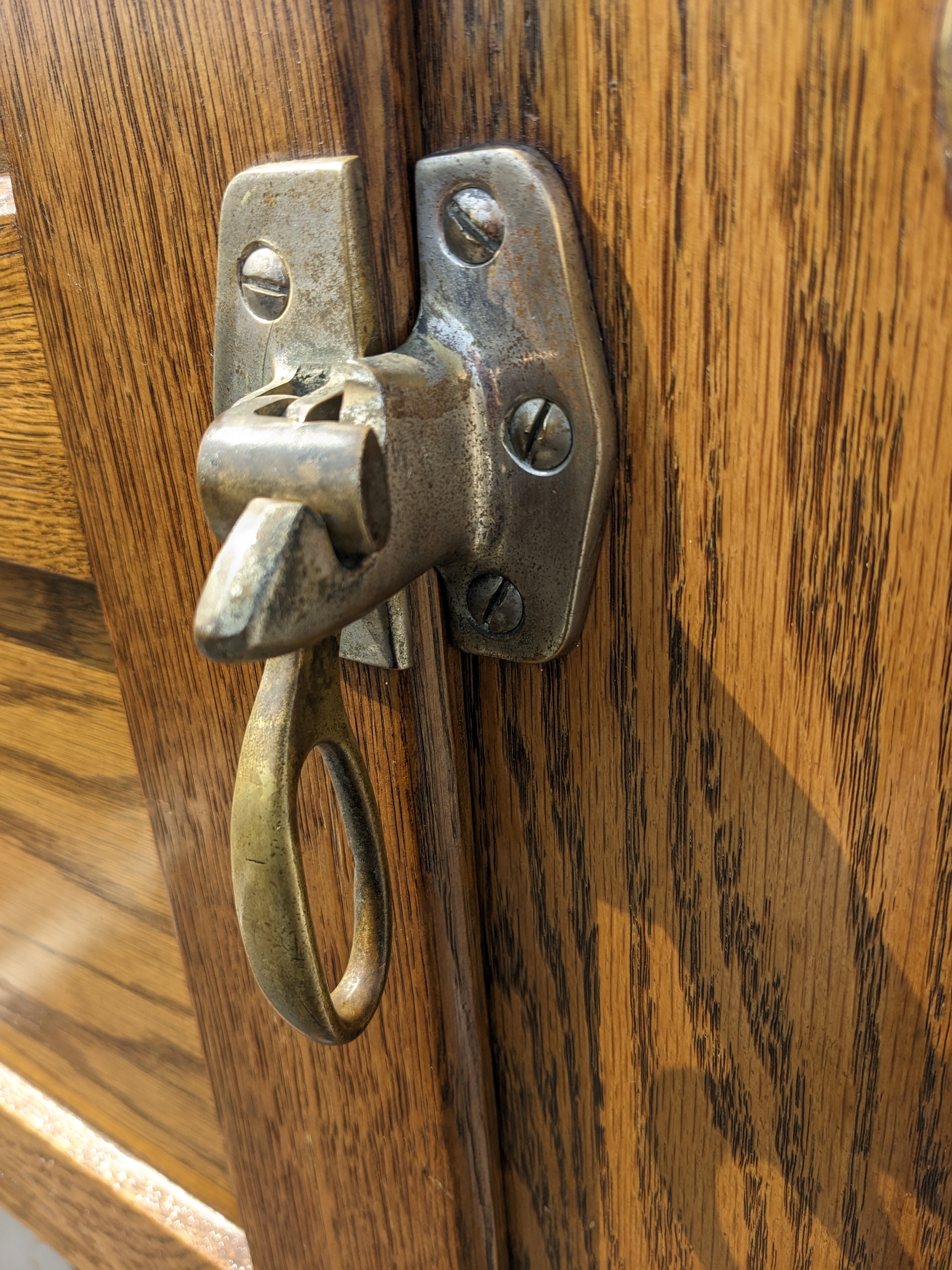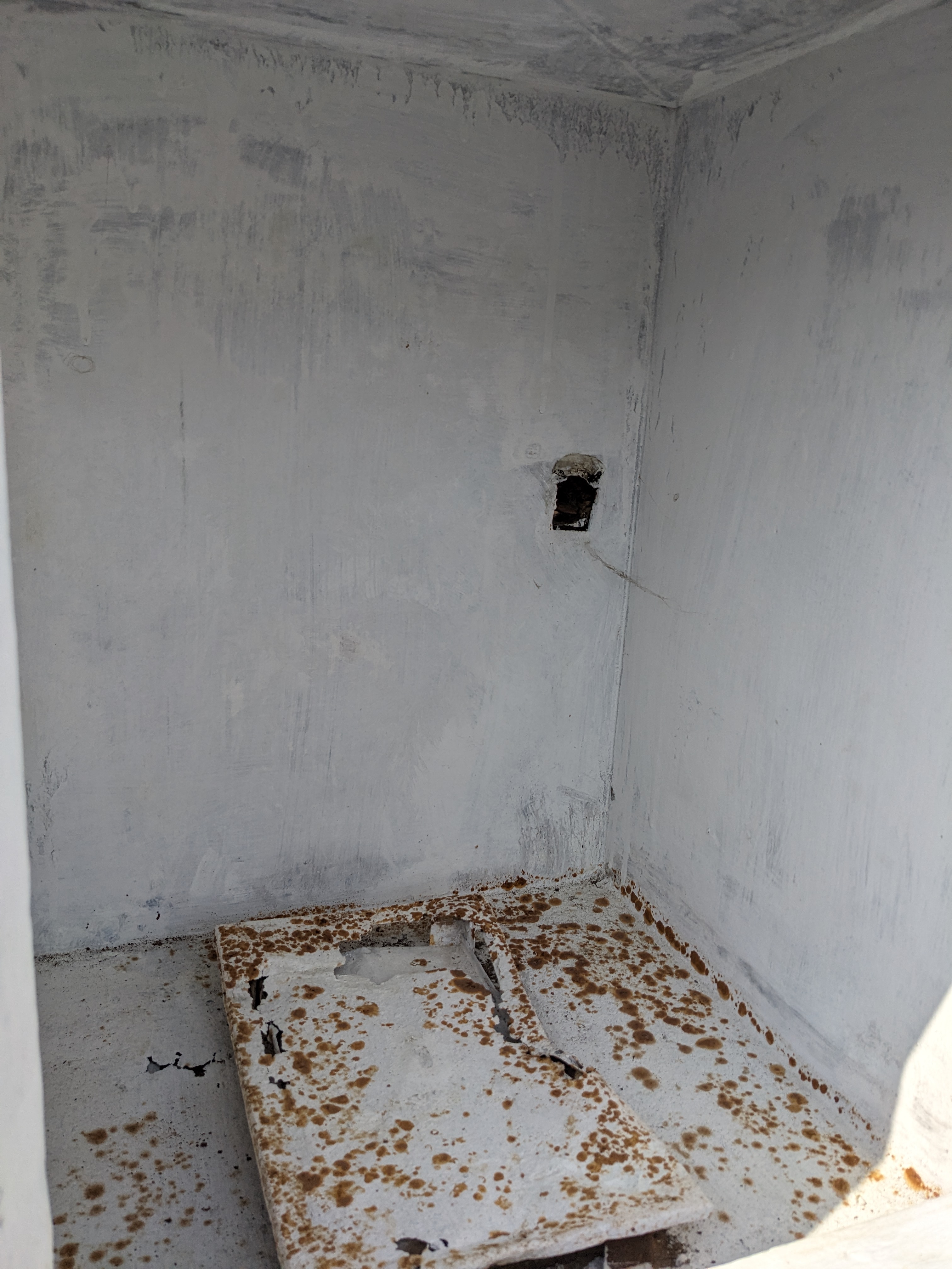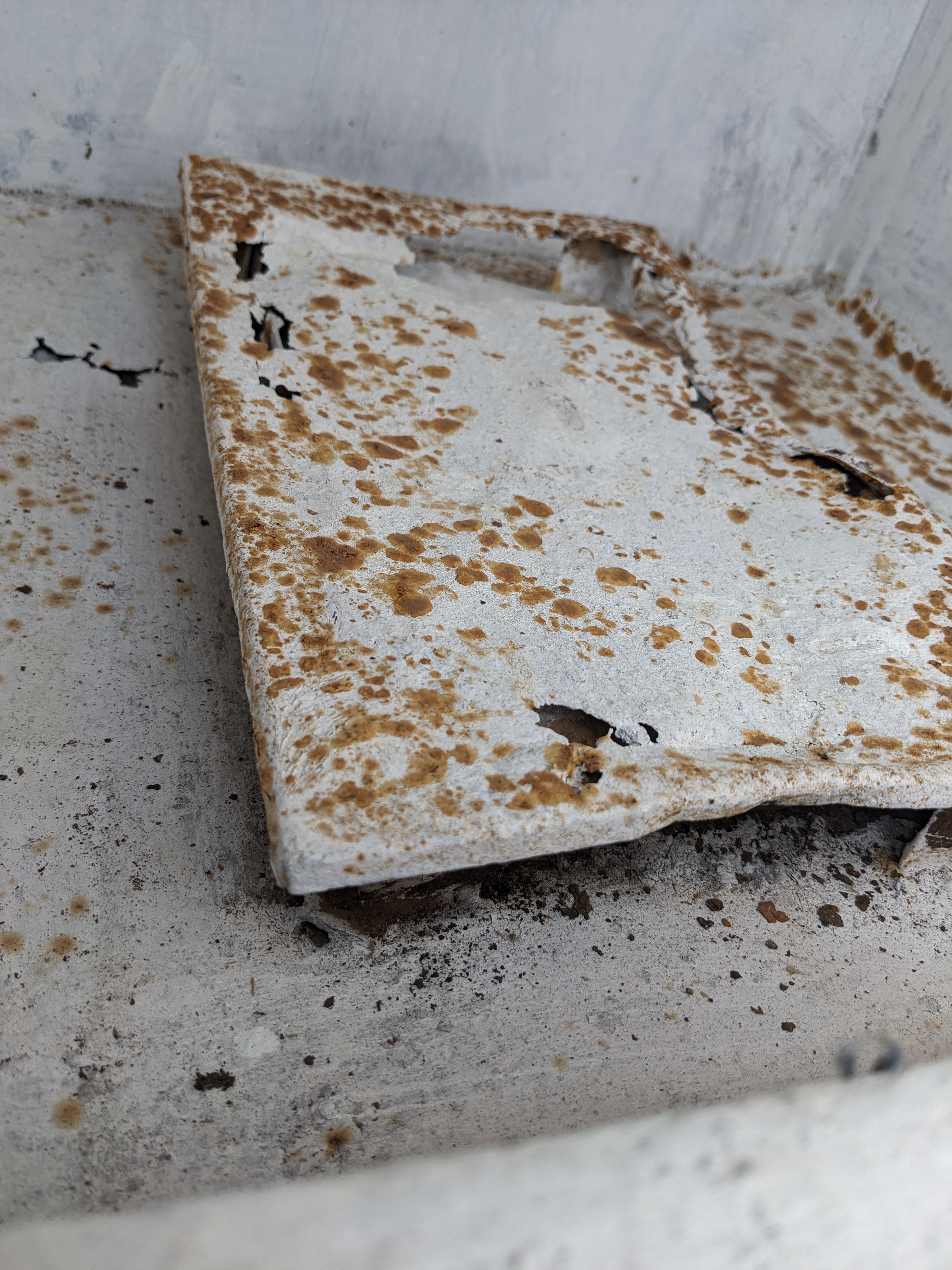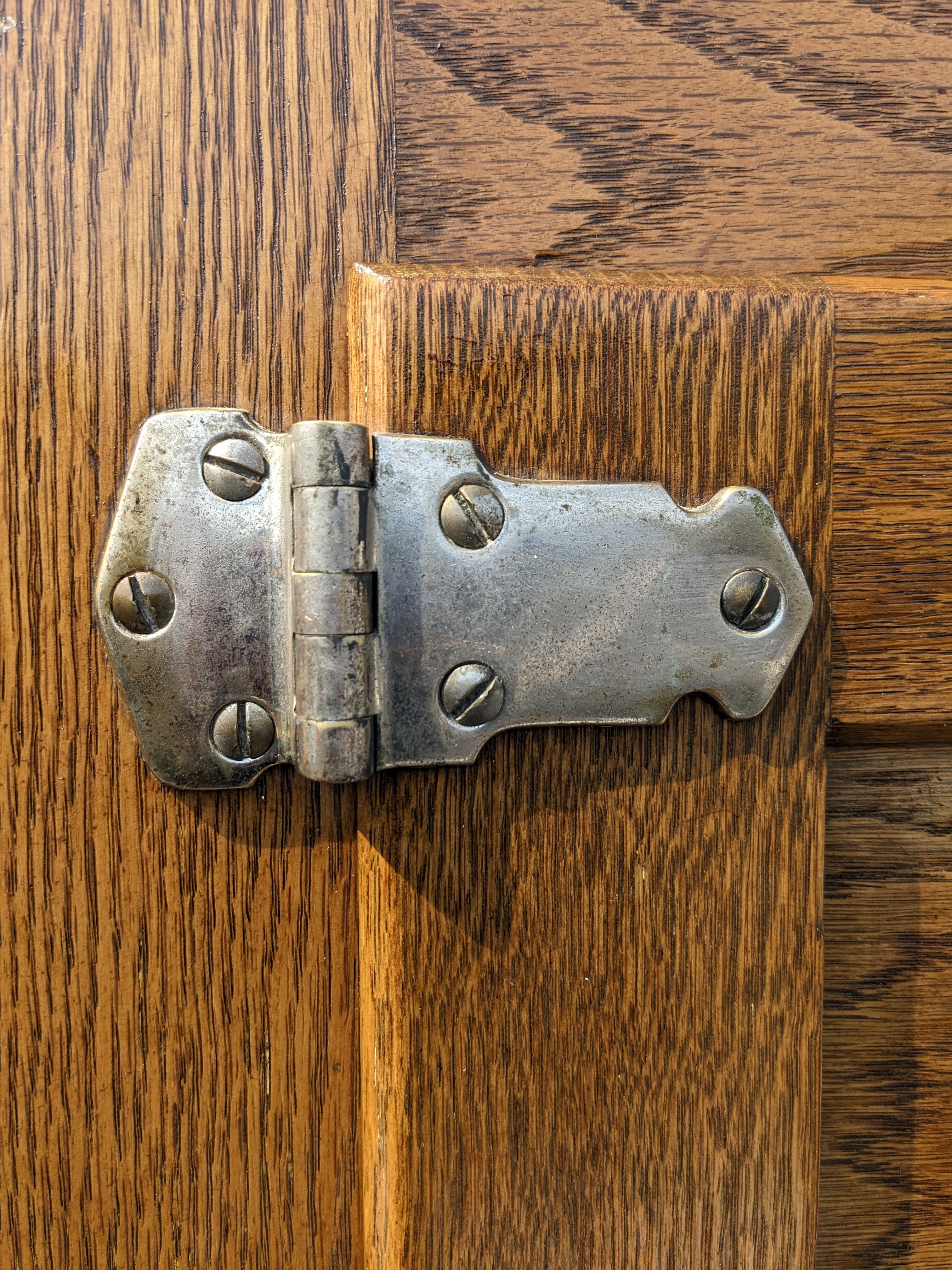 This one is a big ice box! 4 full sized compartments that are enameled on the inside. The one that is different, top right, may have been the freezer? Or housed the refrigeration? The metal is rusted through in the cap piece but was coated with paint since then. The door is covered with metal. It looks in nice condition considering its age. We don't know about its operation, if it works or not.