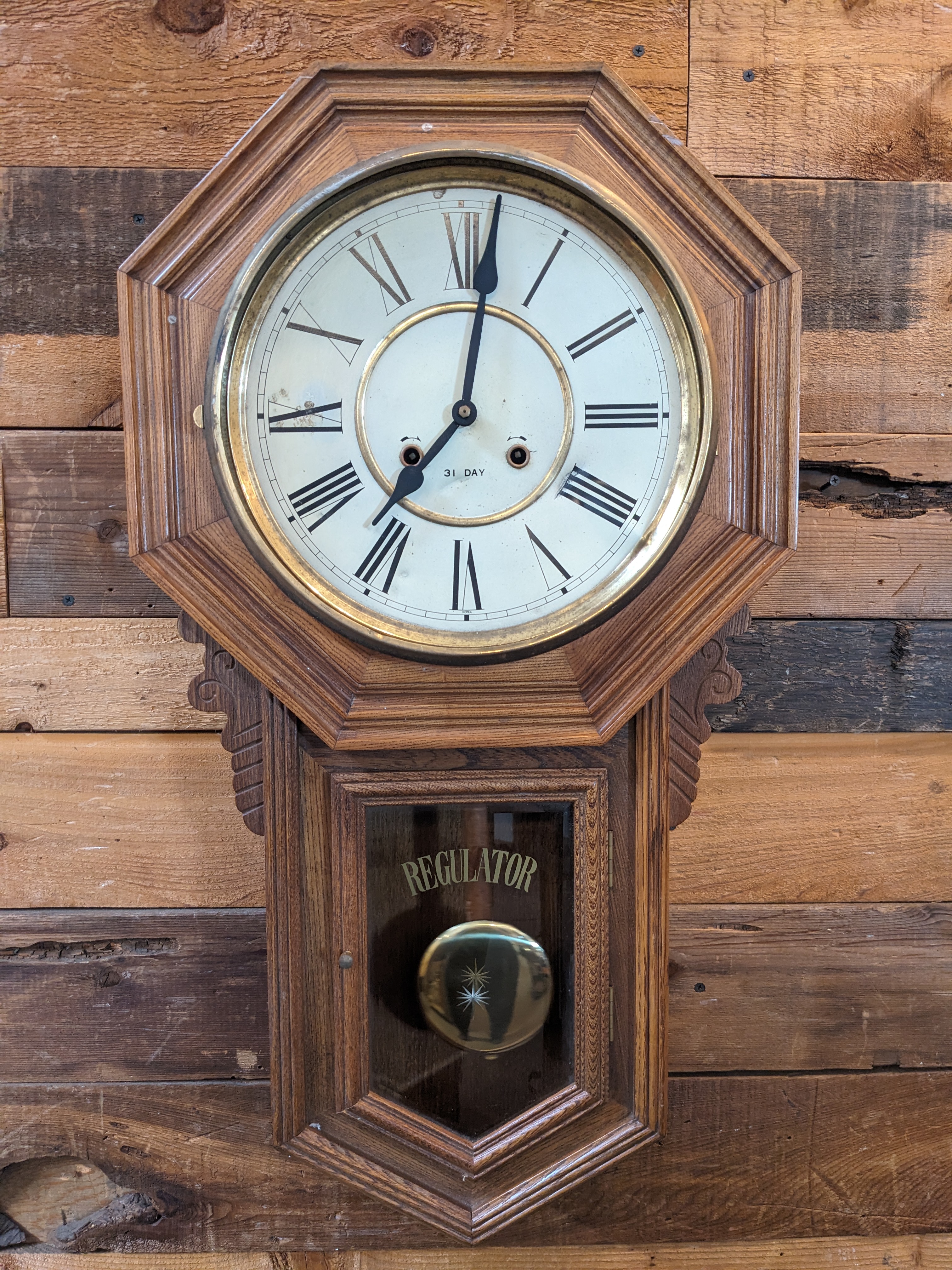 This clock is in really great condition. The glass on the face of the clock is missing. It still works and is ticking as you read this! This clock is a really cool piece that just needs some love and work. The clock also has its clock key.
