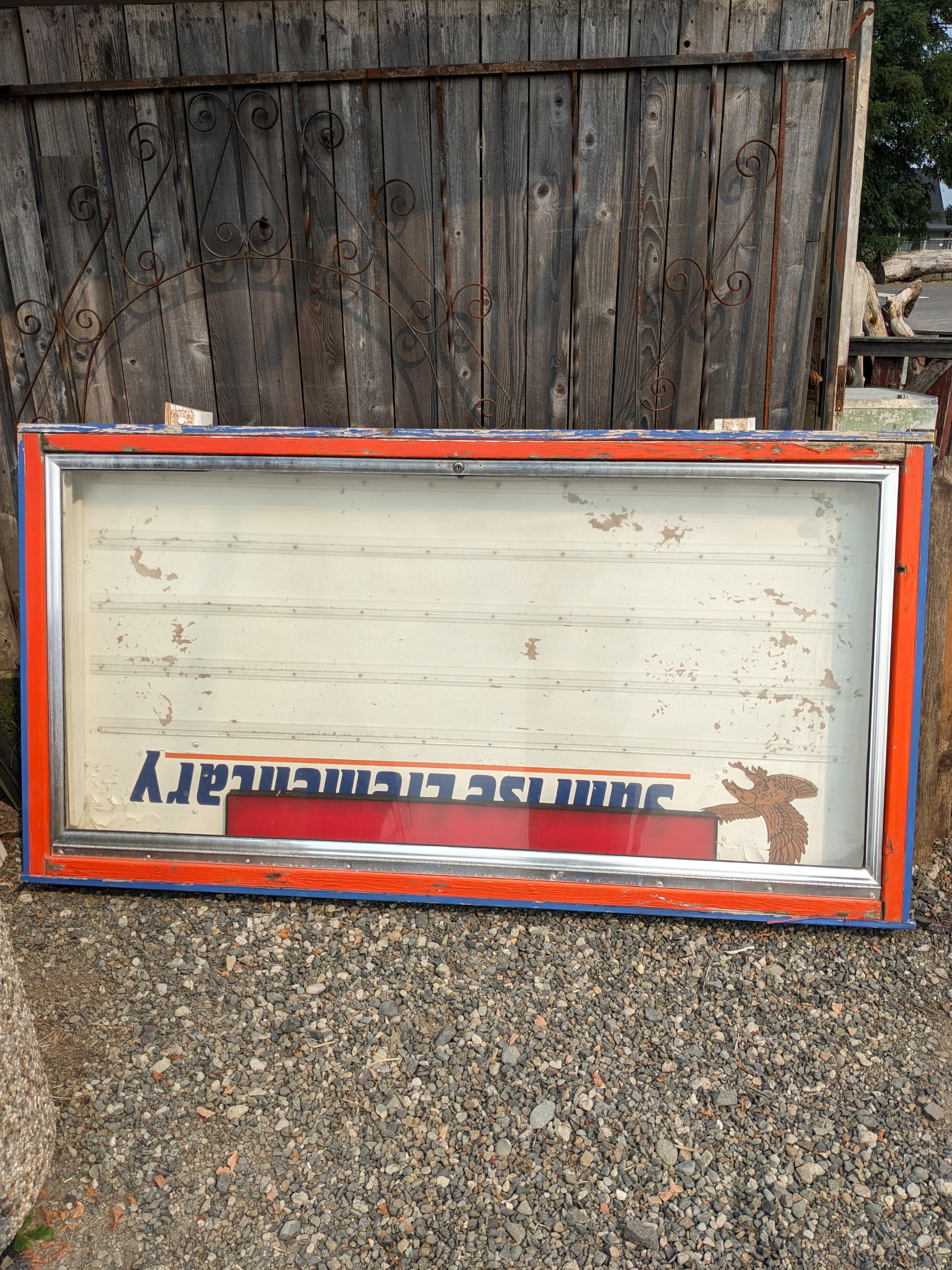 Framed letter board commercial sign in fair condition. Does not have a key for the front lock but the lock can easily be replaced. The sign is unlocked. Great for a business. Dimensions are 76.5 inches wide by 42.5 inches tall and 9 inches deep.