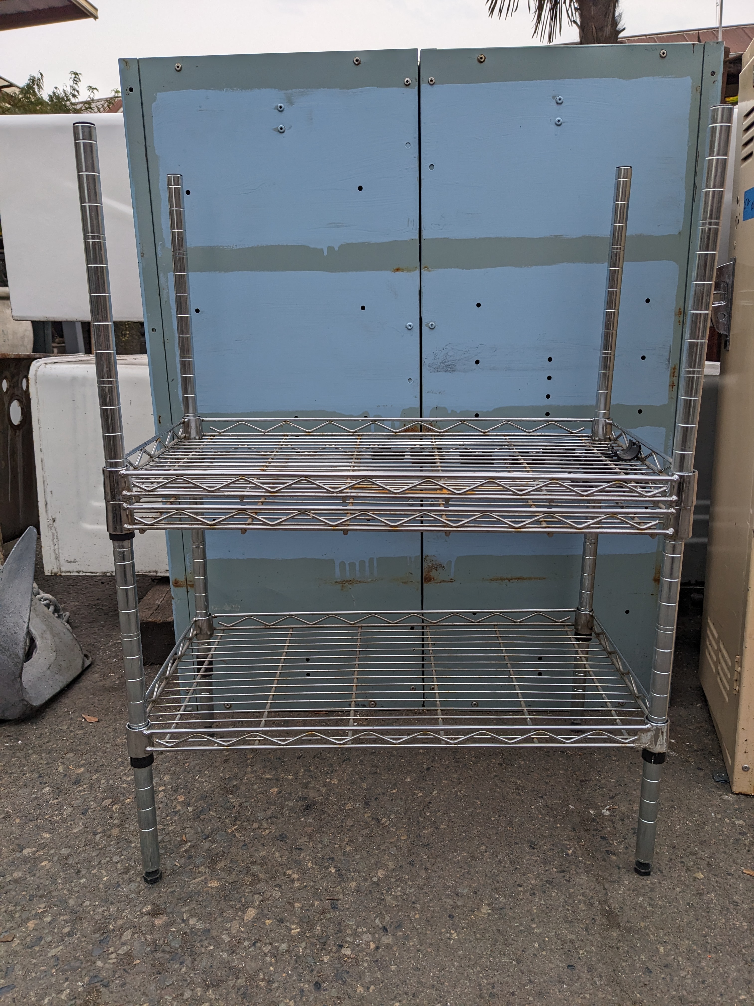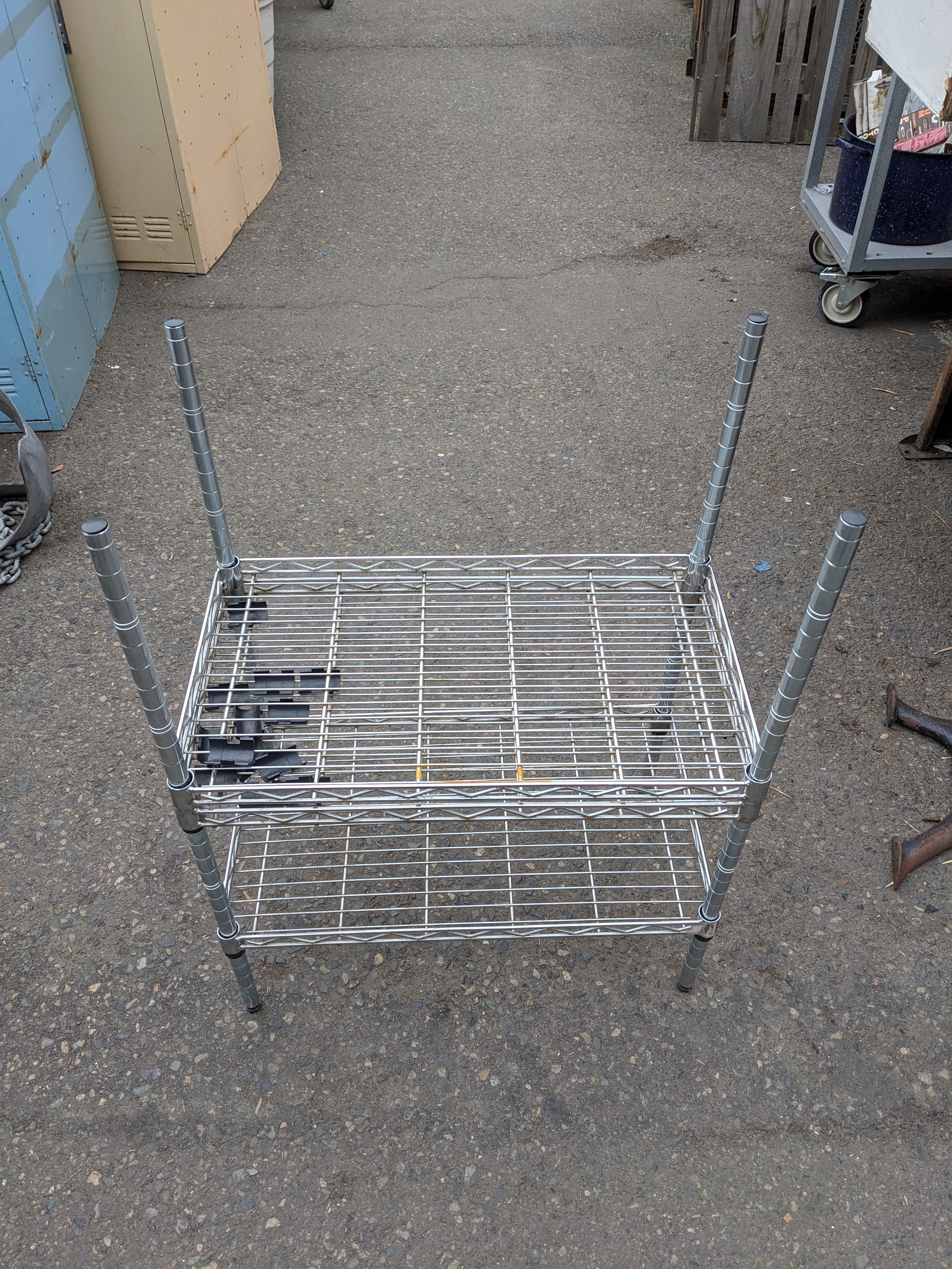 Small, 3 tiered metal shelving rack. Could fit on a table top or similar set-up.