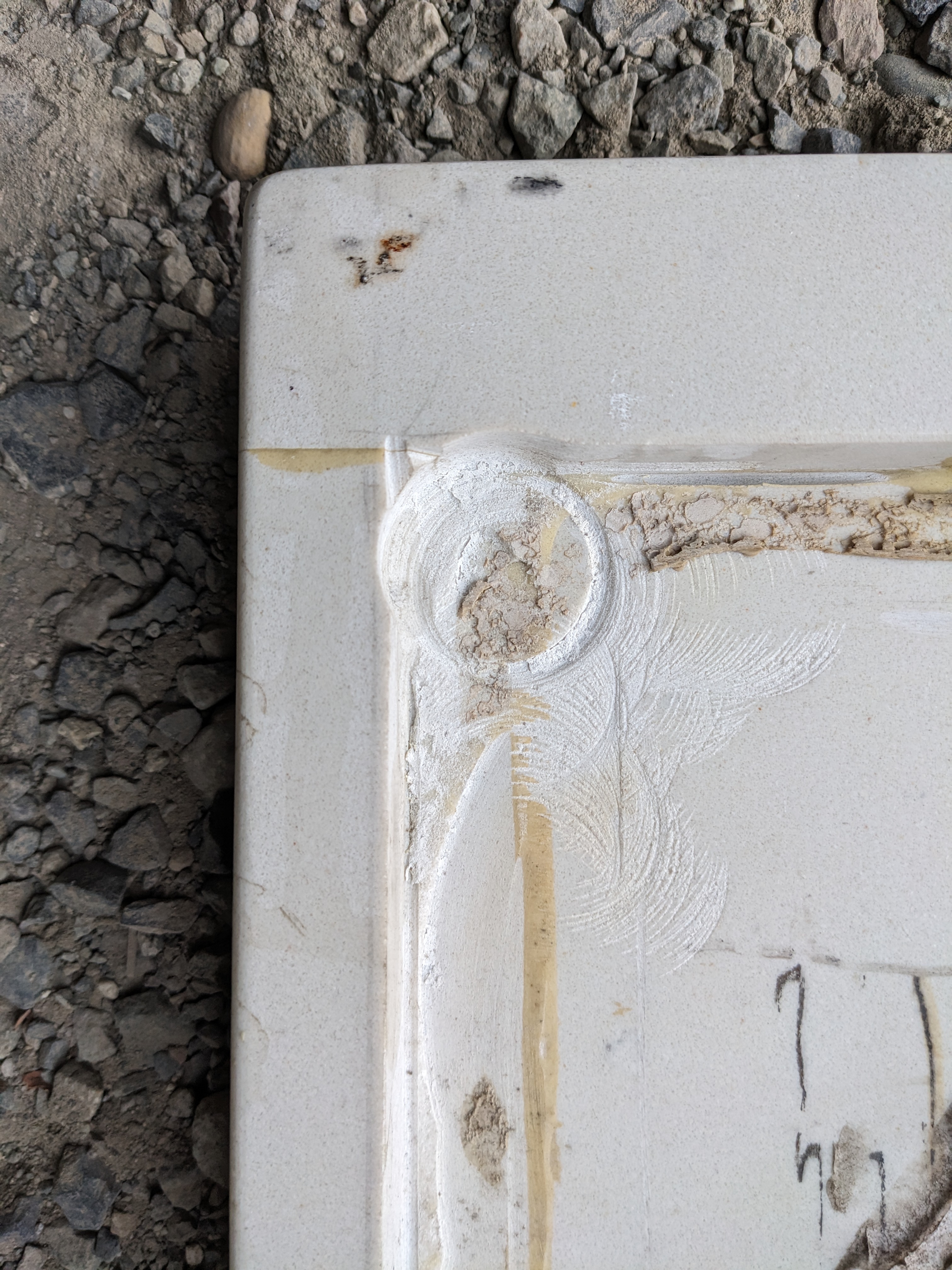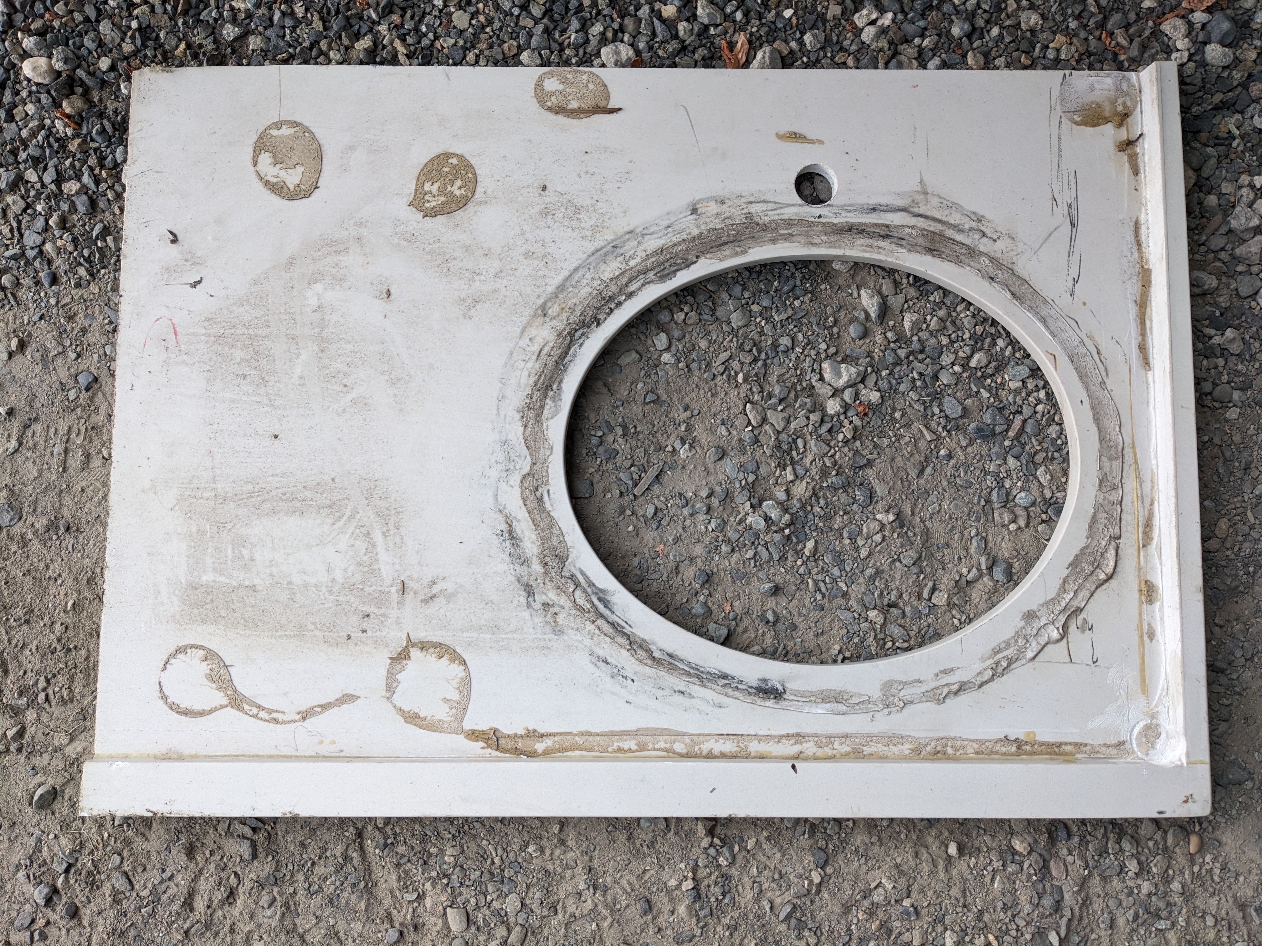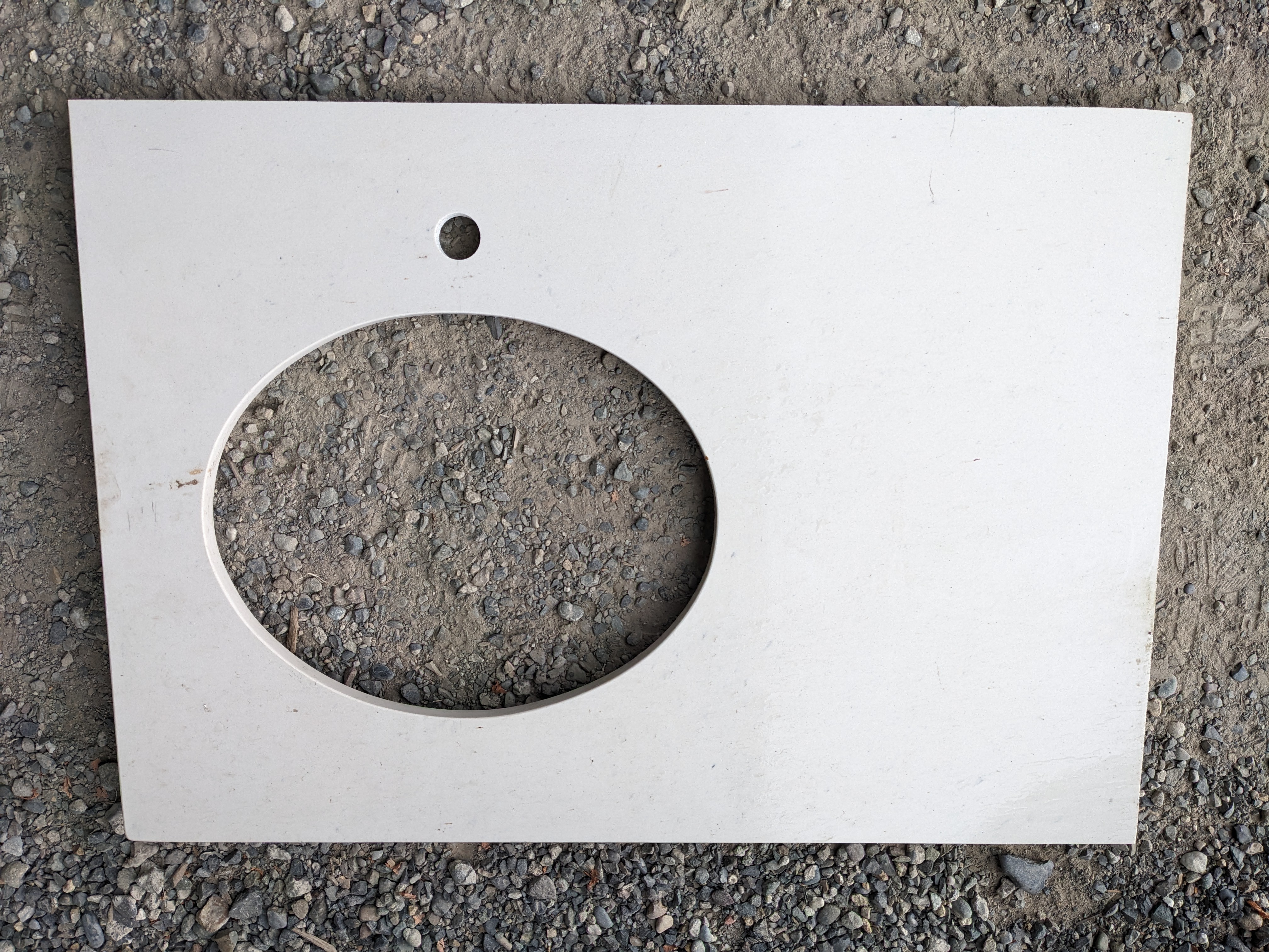 A beautiful countertop for a vanity made from a white quartz composite. This countertop is in excellent condition, with only some leftover caulk and glue from a previous installation, and some small wear. It has two holes cut out for a round sink and the faucet, as well as two finished edges that form a lip. The countertop itself measures 24.5 x 34.875 x 0.875 inches, the large hole measures 13.5 x 16.75 inches, the small hole is 1 inch in diameter, and the finished edges are 1.5 inches wide.