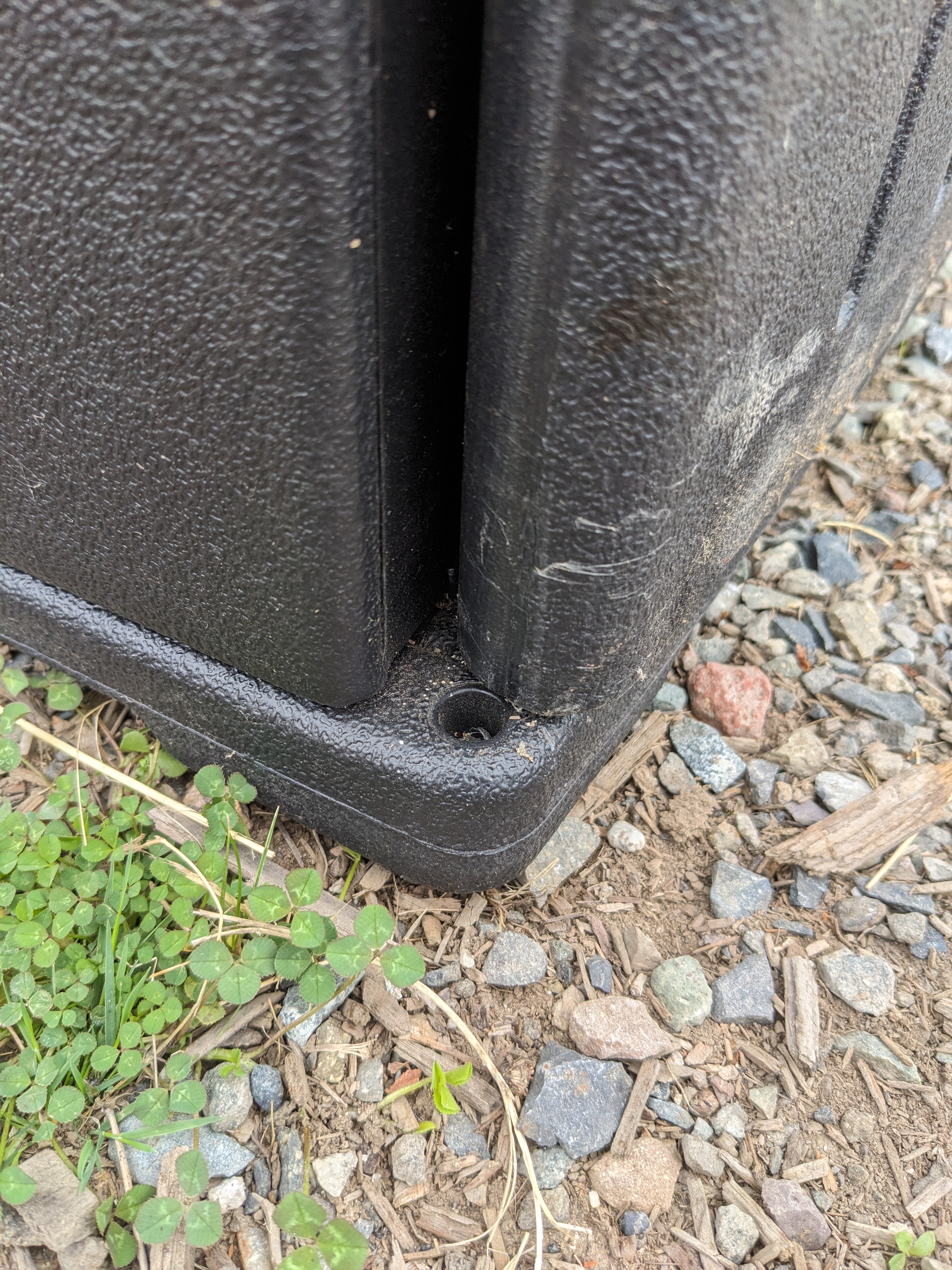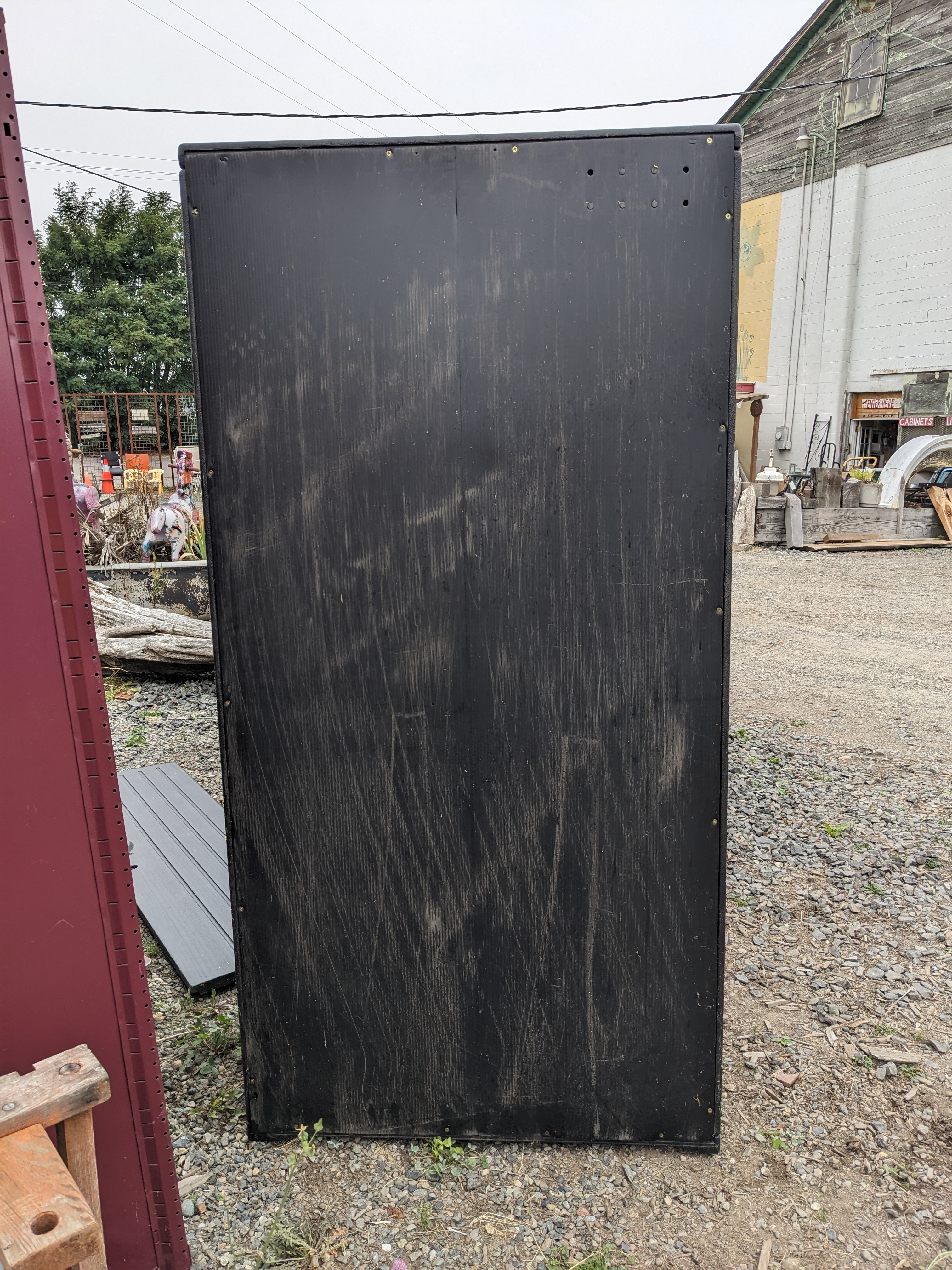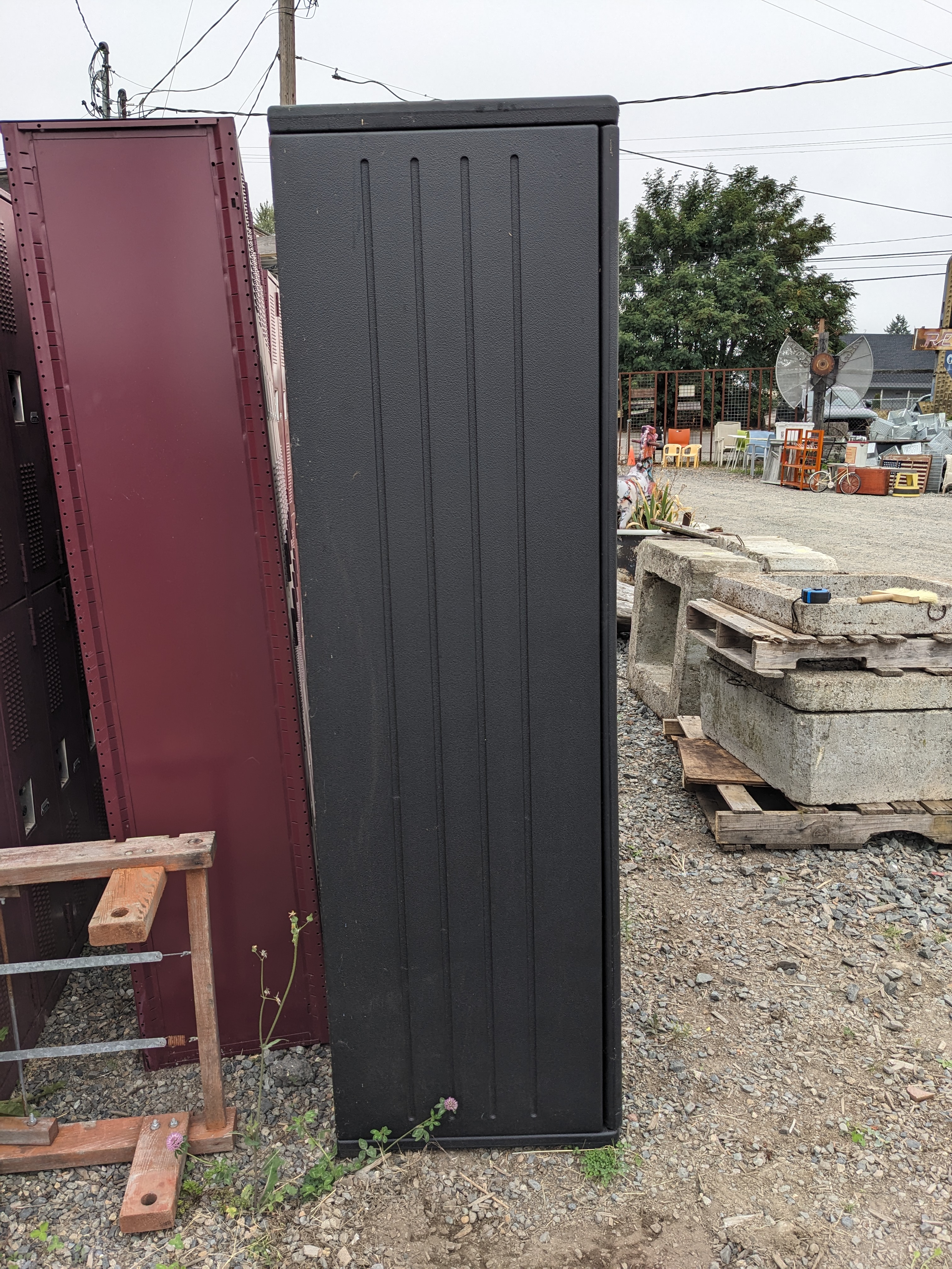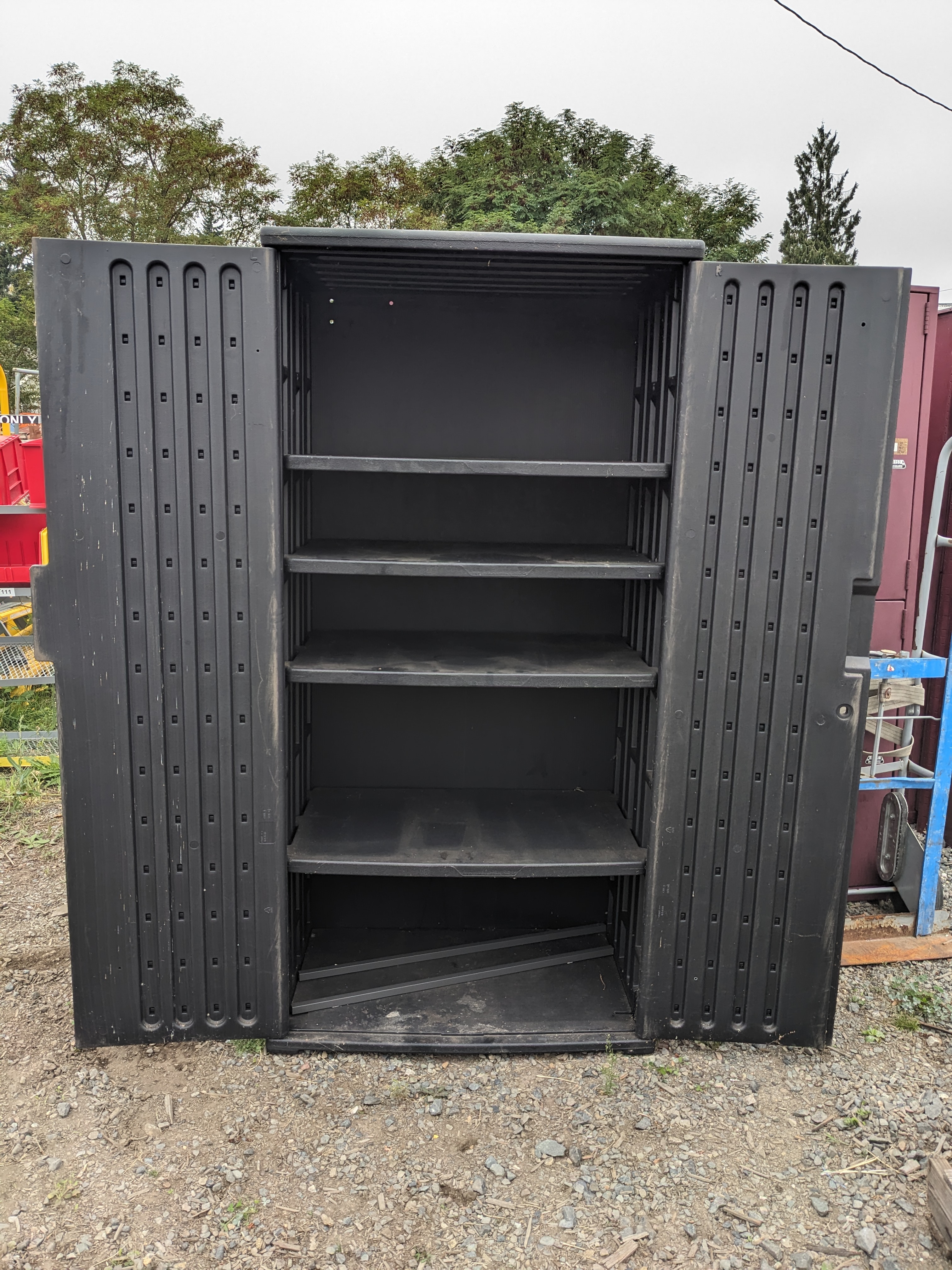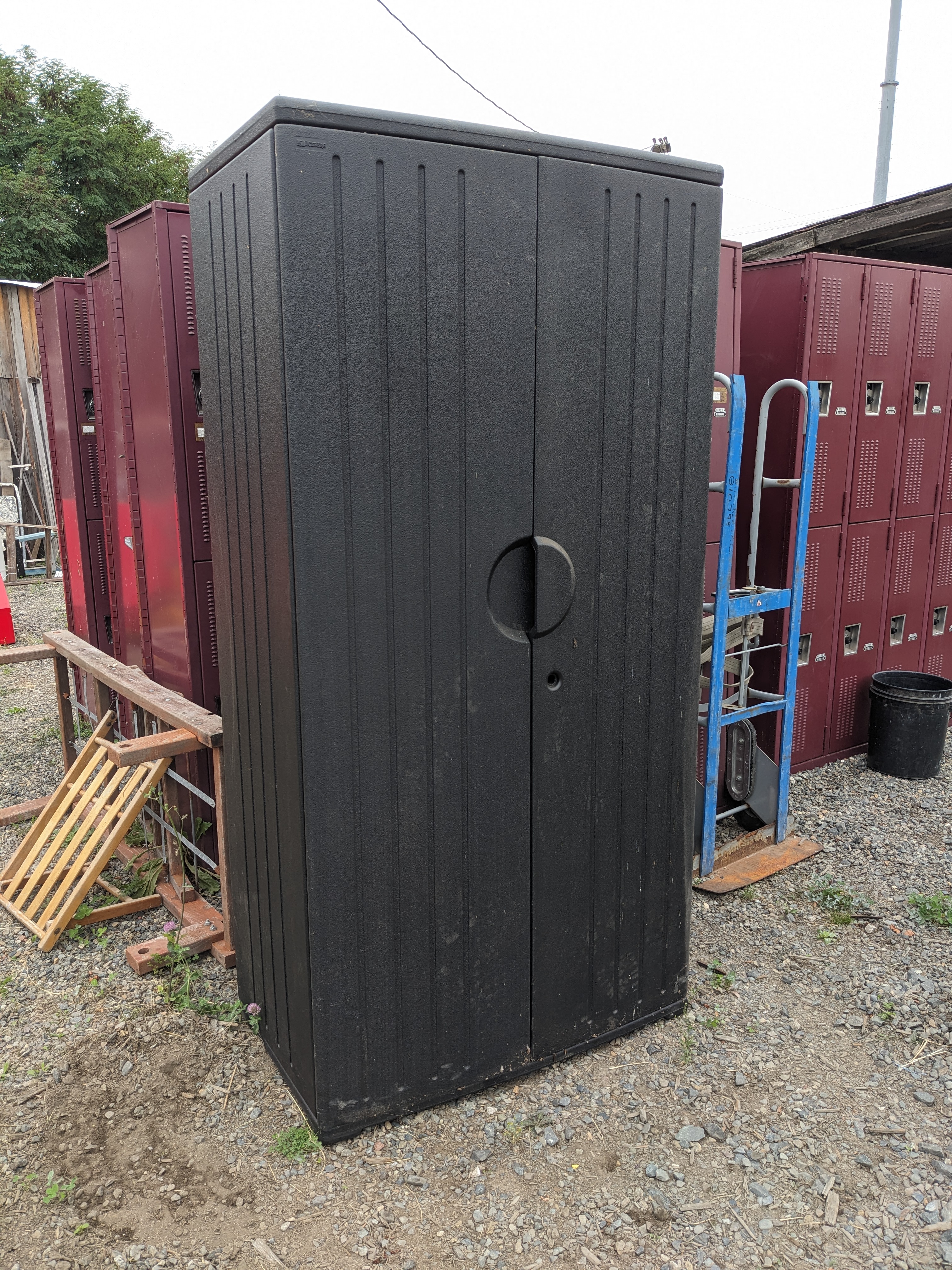 A large black plastic storage cabinet. This cabinet is in great condition with some wear from use, though it's missing a lock, and the doors come off when treated roughly. This cabinet measures 36 x 72 x 22 inches.