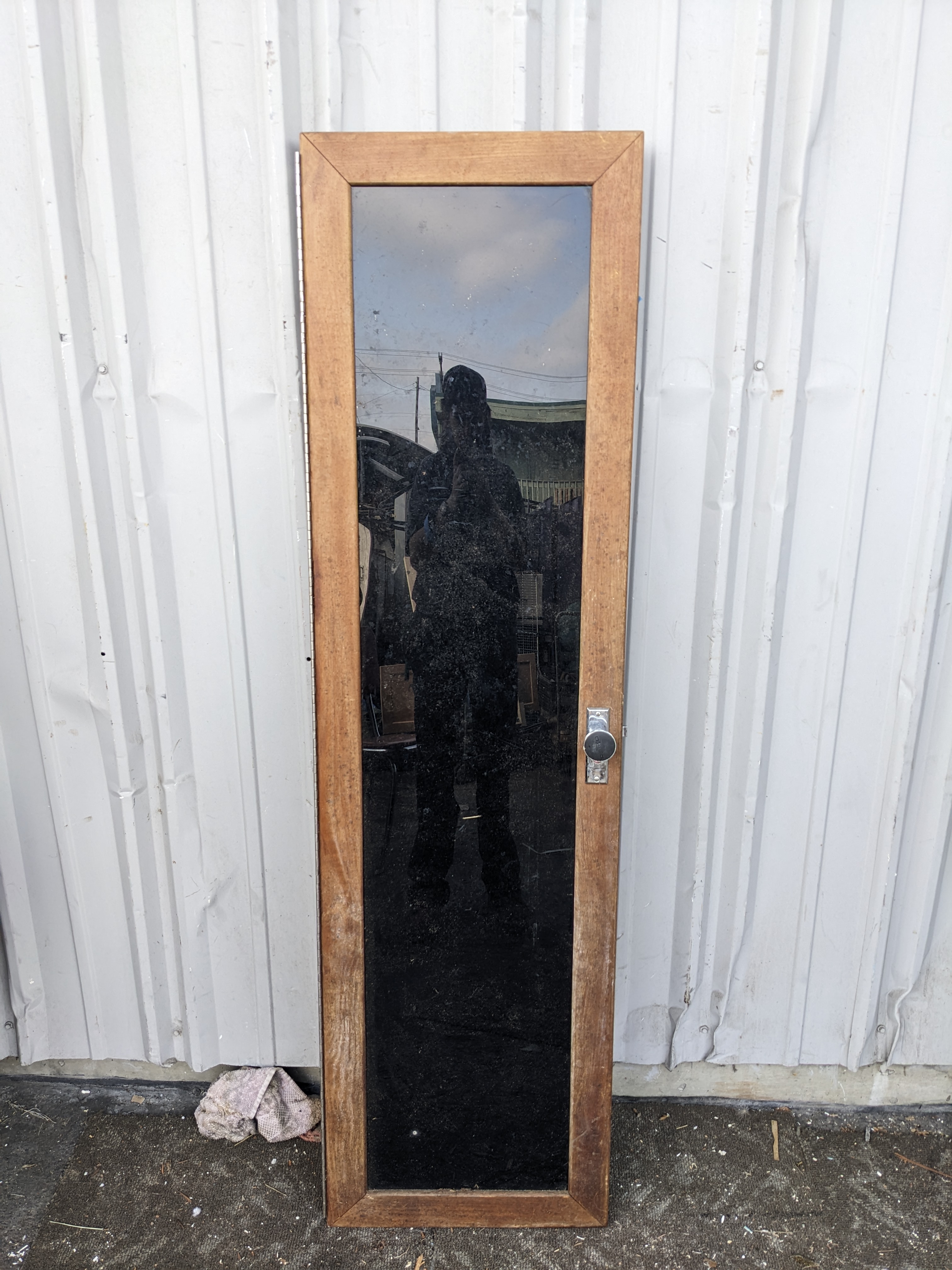 This wooden door was salvaged from an old boat. The teak wood and the black glass give this piece a handsome look.