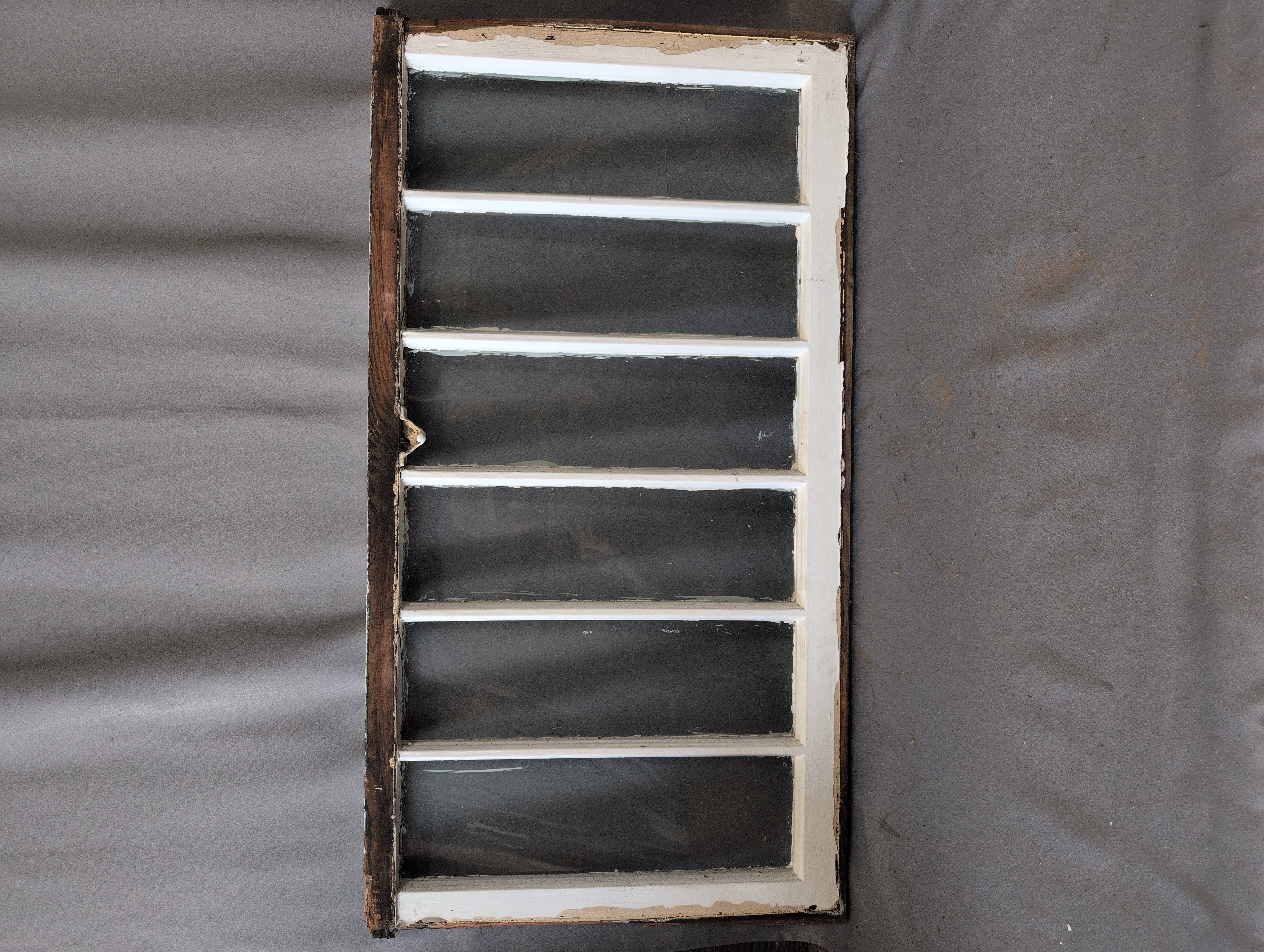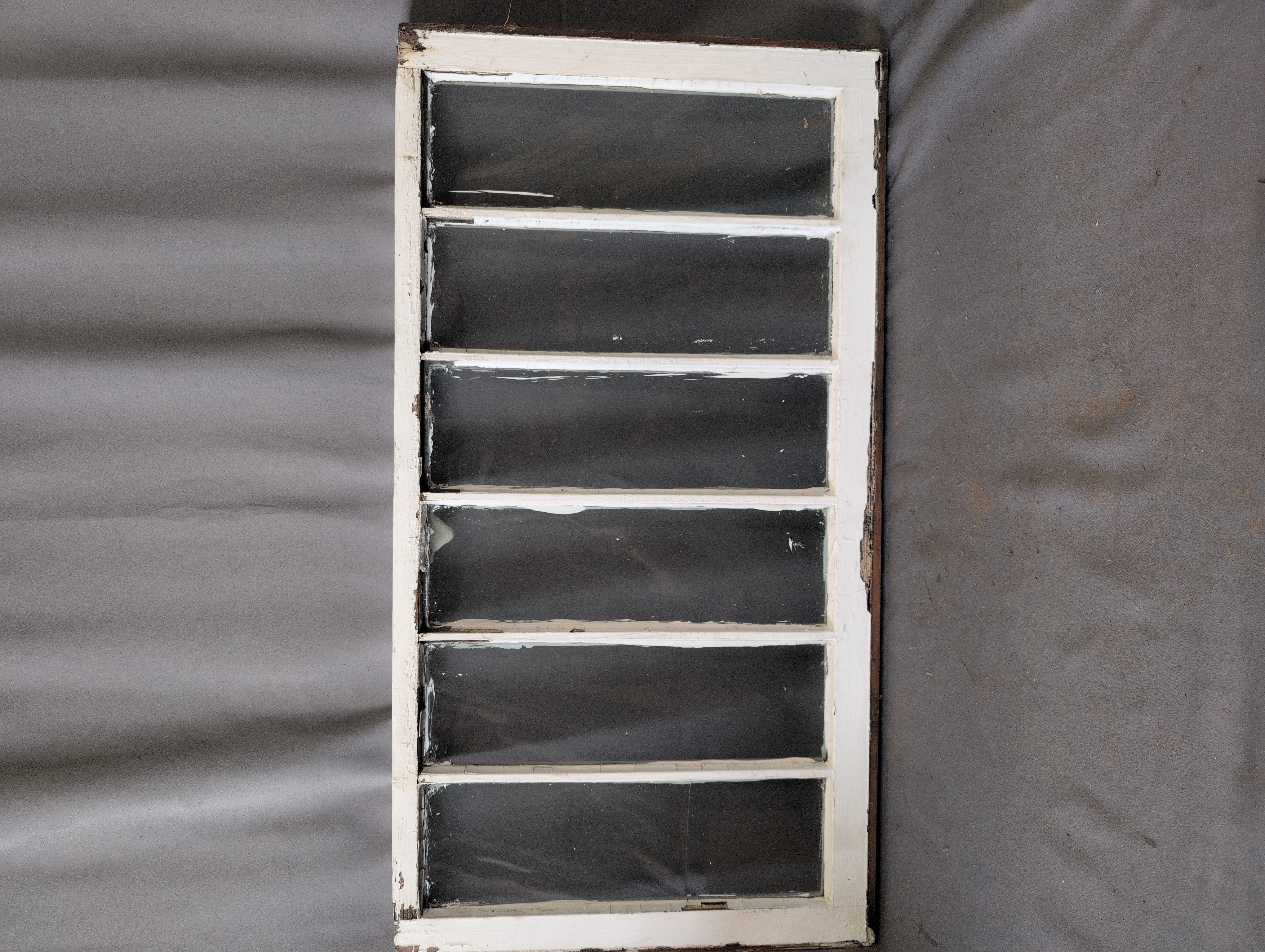 This wood window has six panes but one has a crack through it. It's painted white on both sides with no other damage.