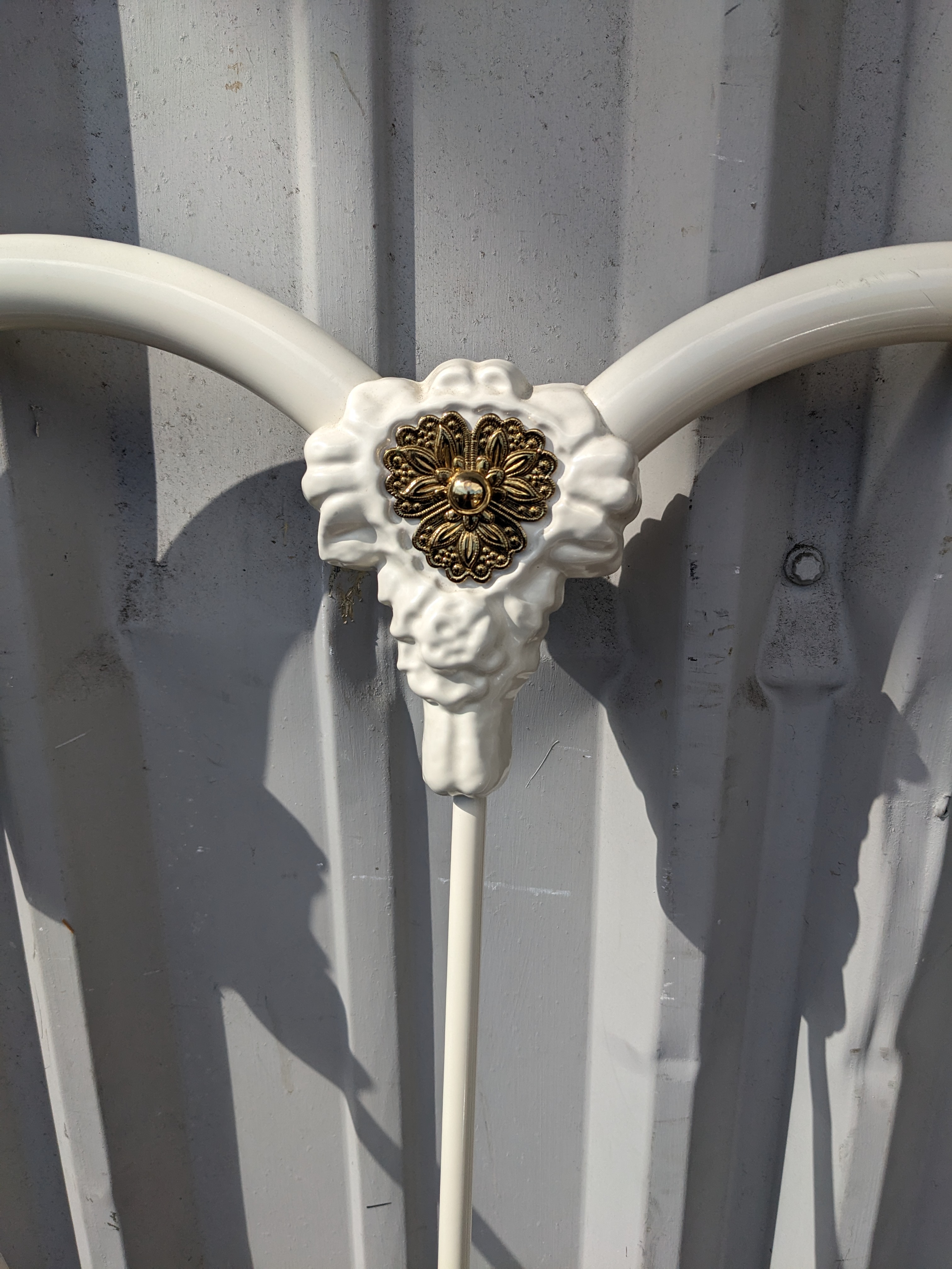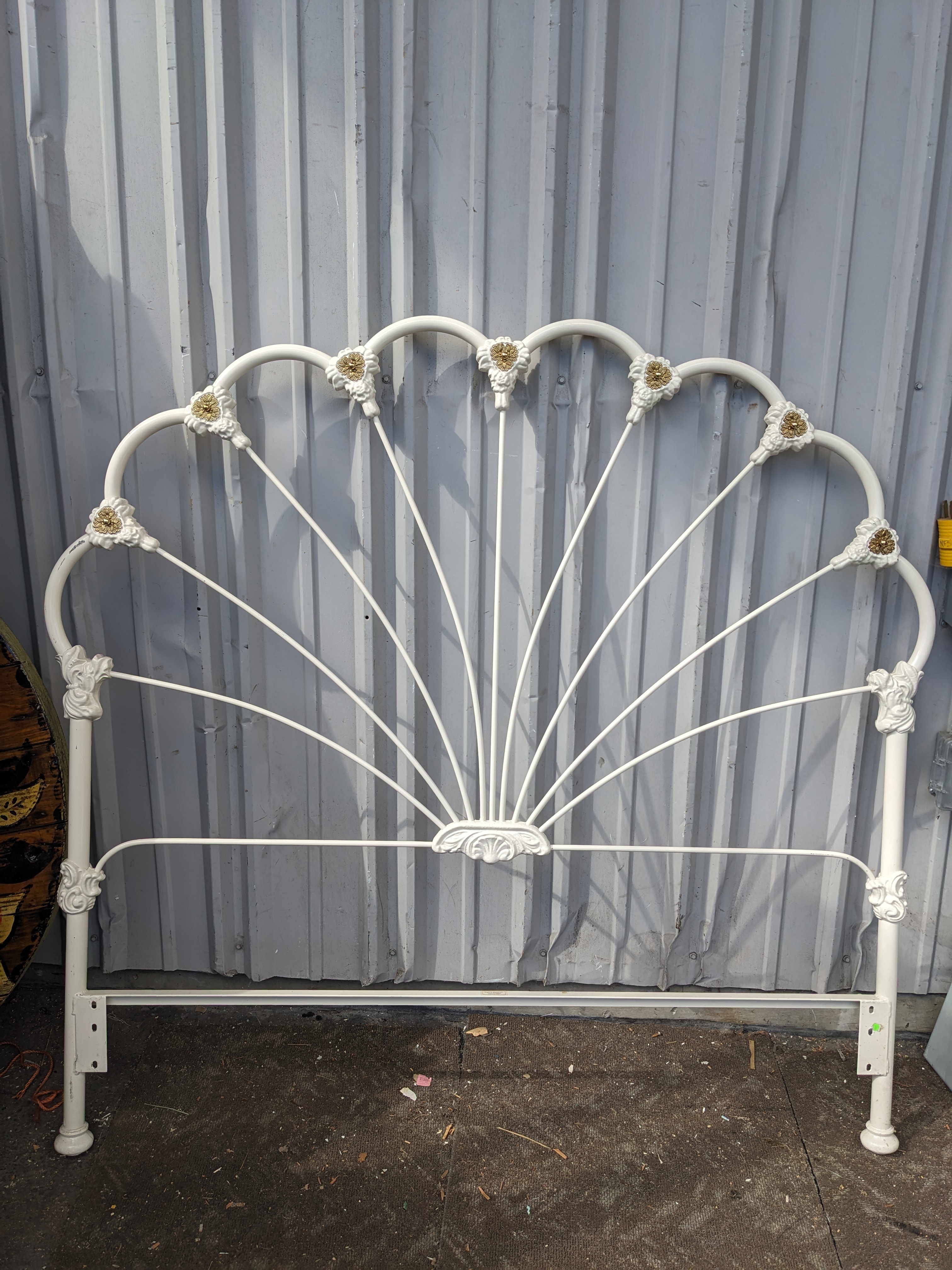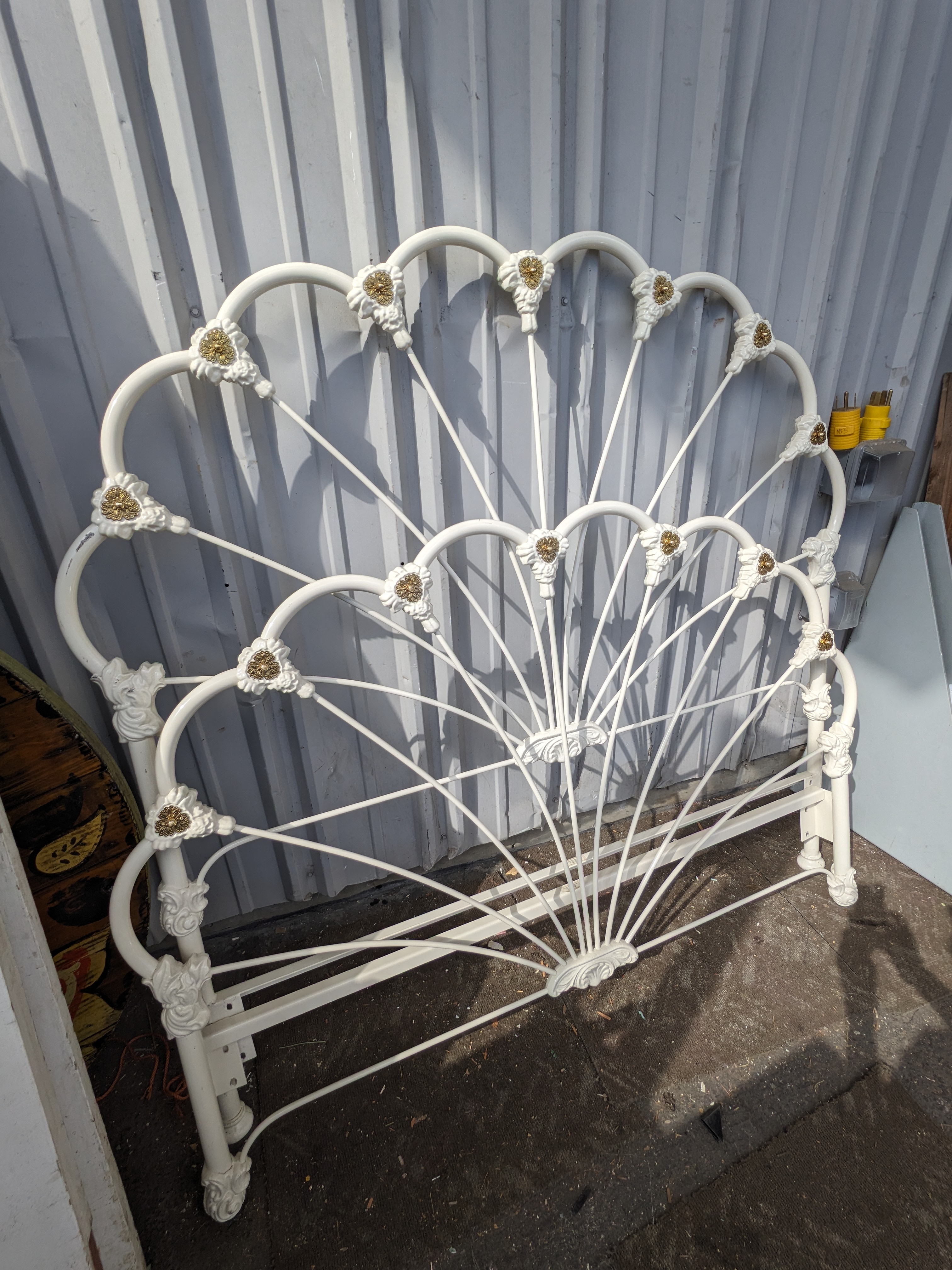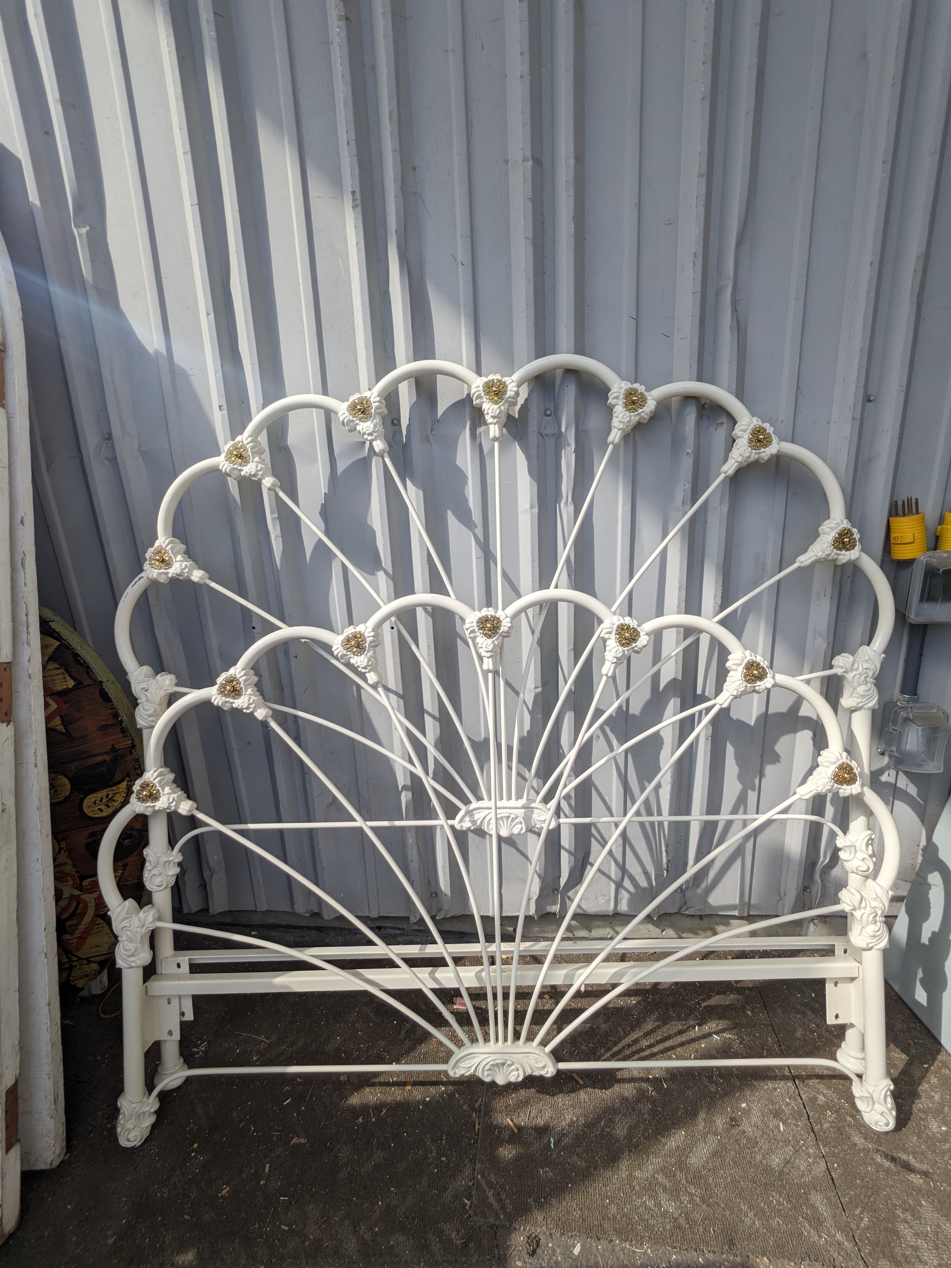 Beautiful cream colored wrought iron queen sized bed frame with gold ornate embellishments. Measurements: