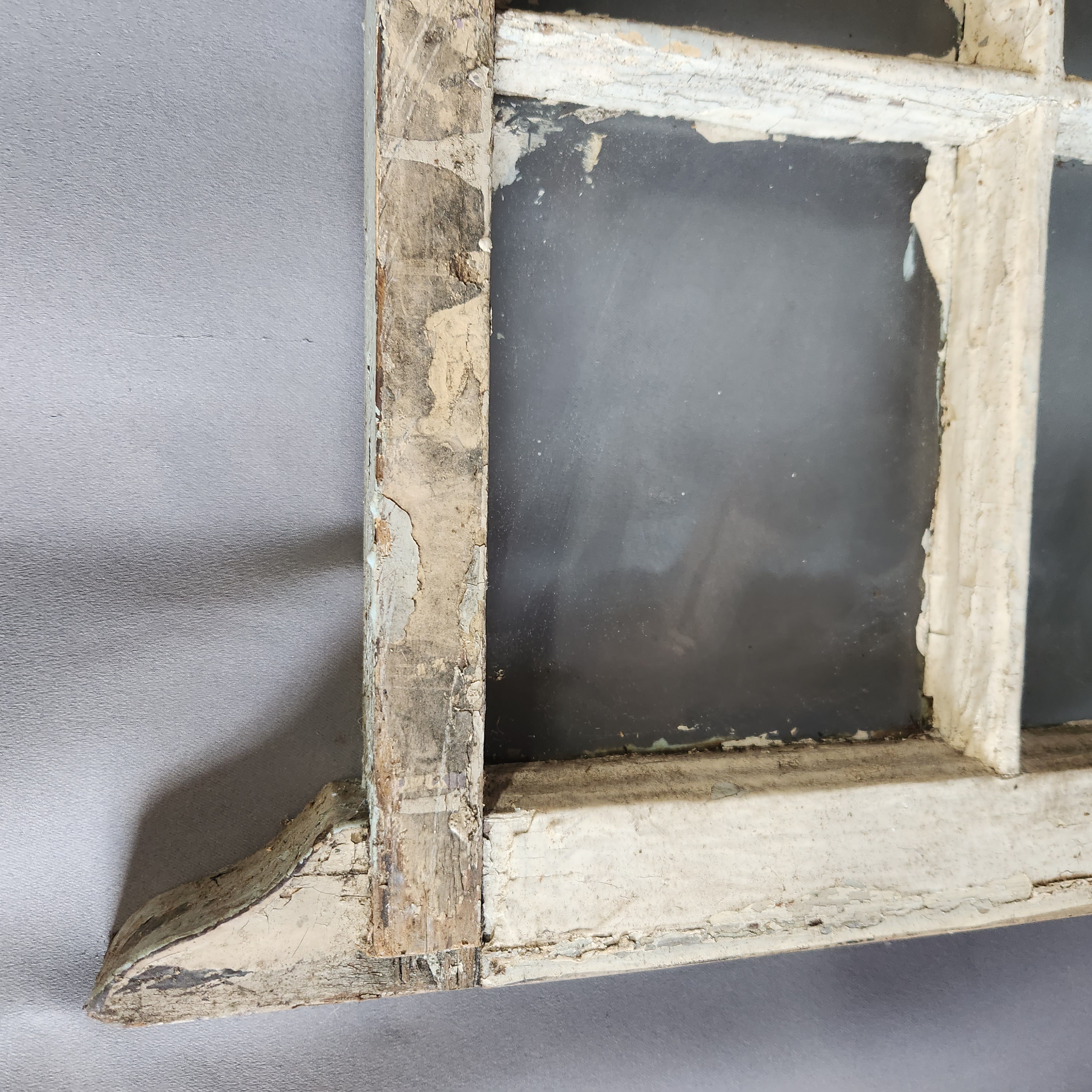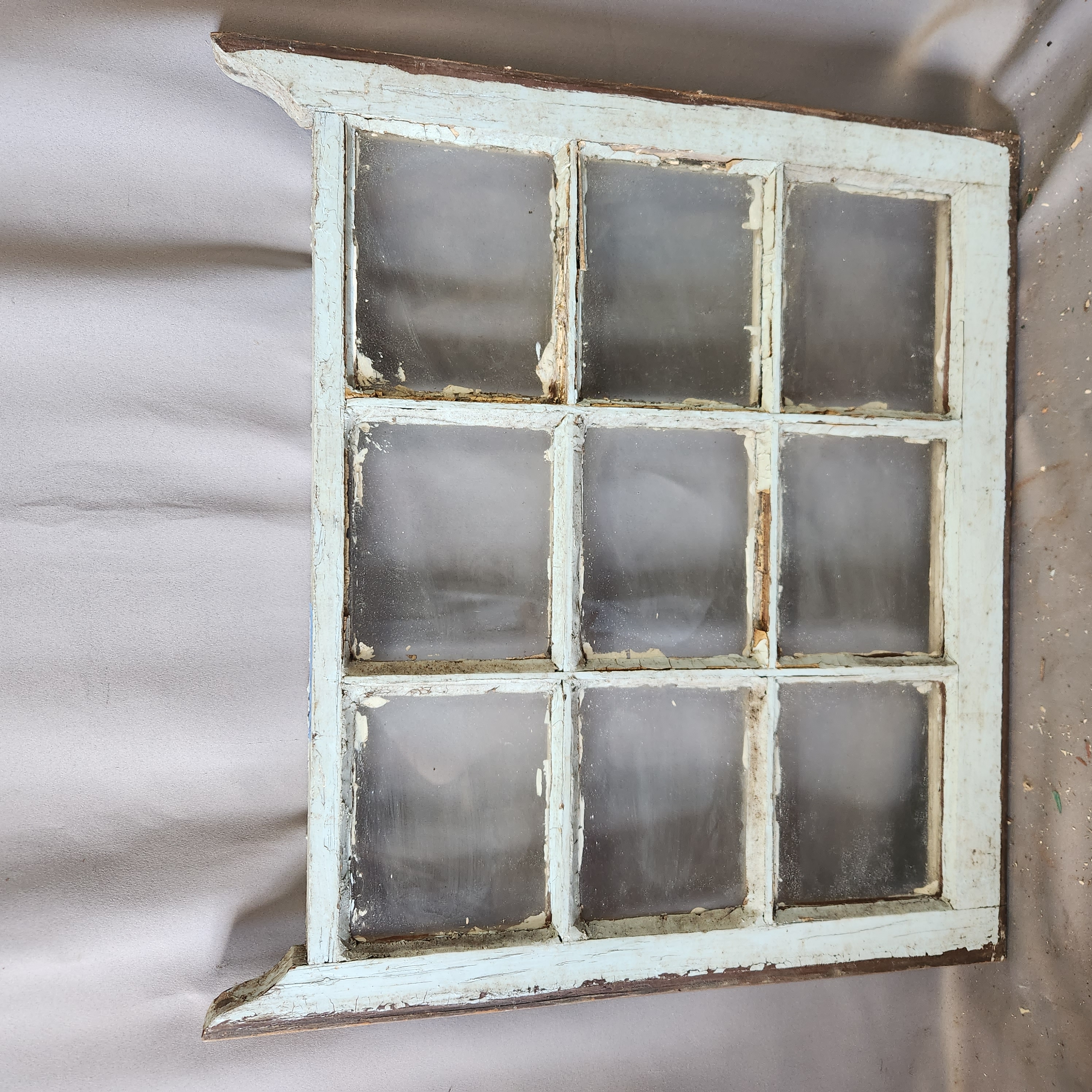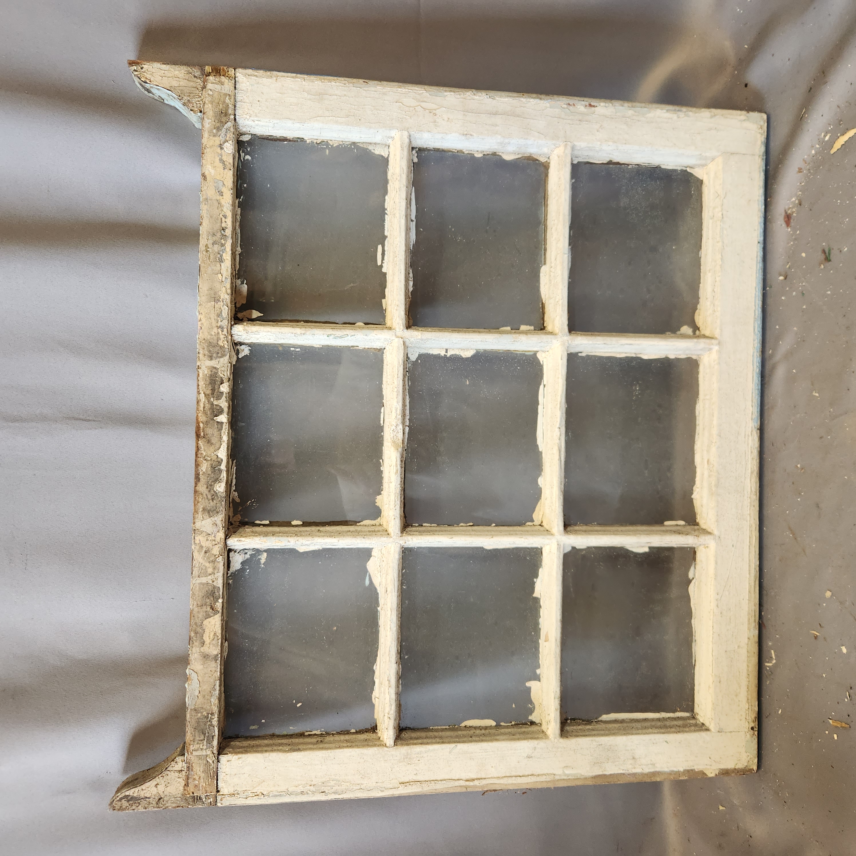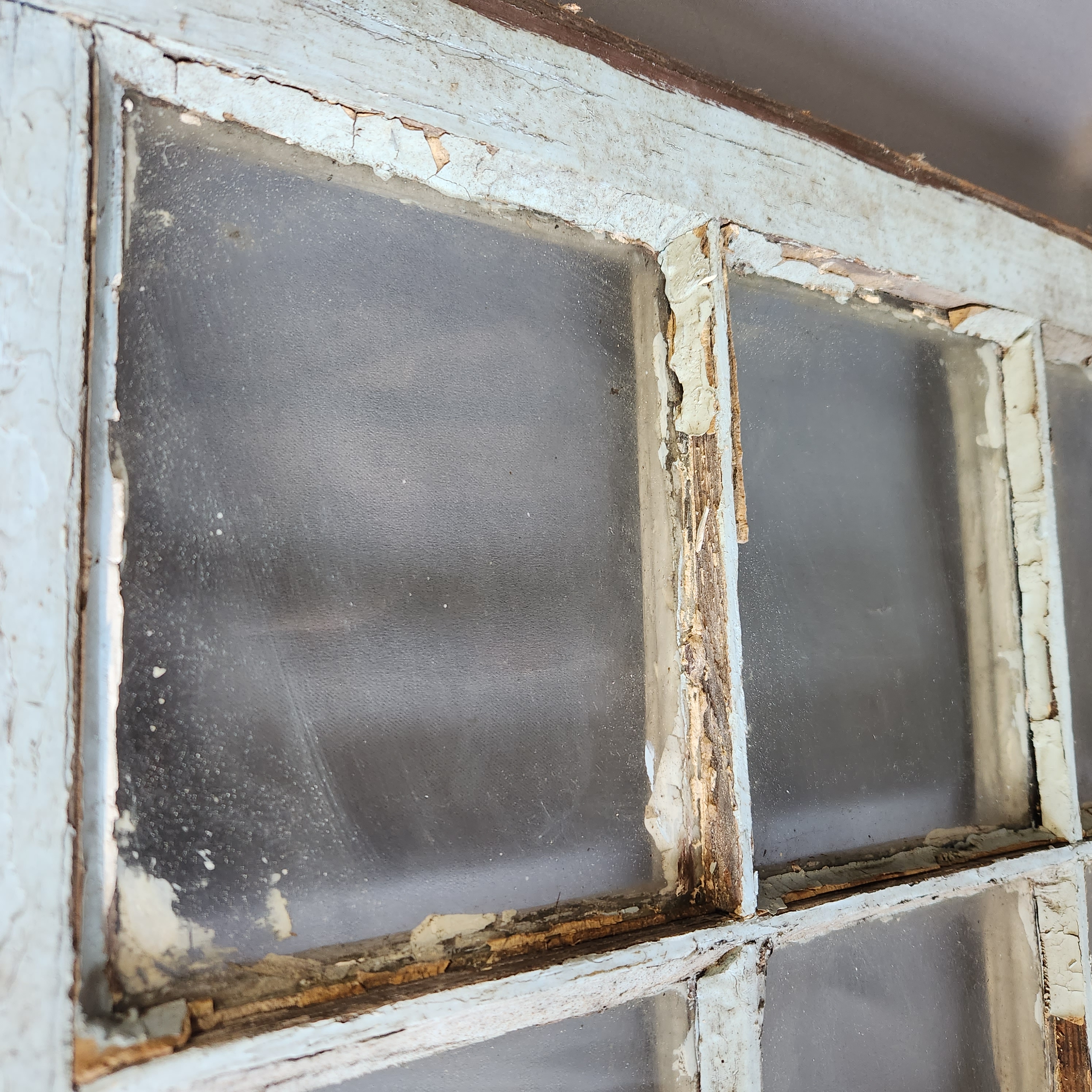 A wooden window that has been painted on both sides. In fair condition, paint is peeling and wood frame is very worn, lots of marks and scratches.