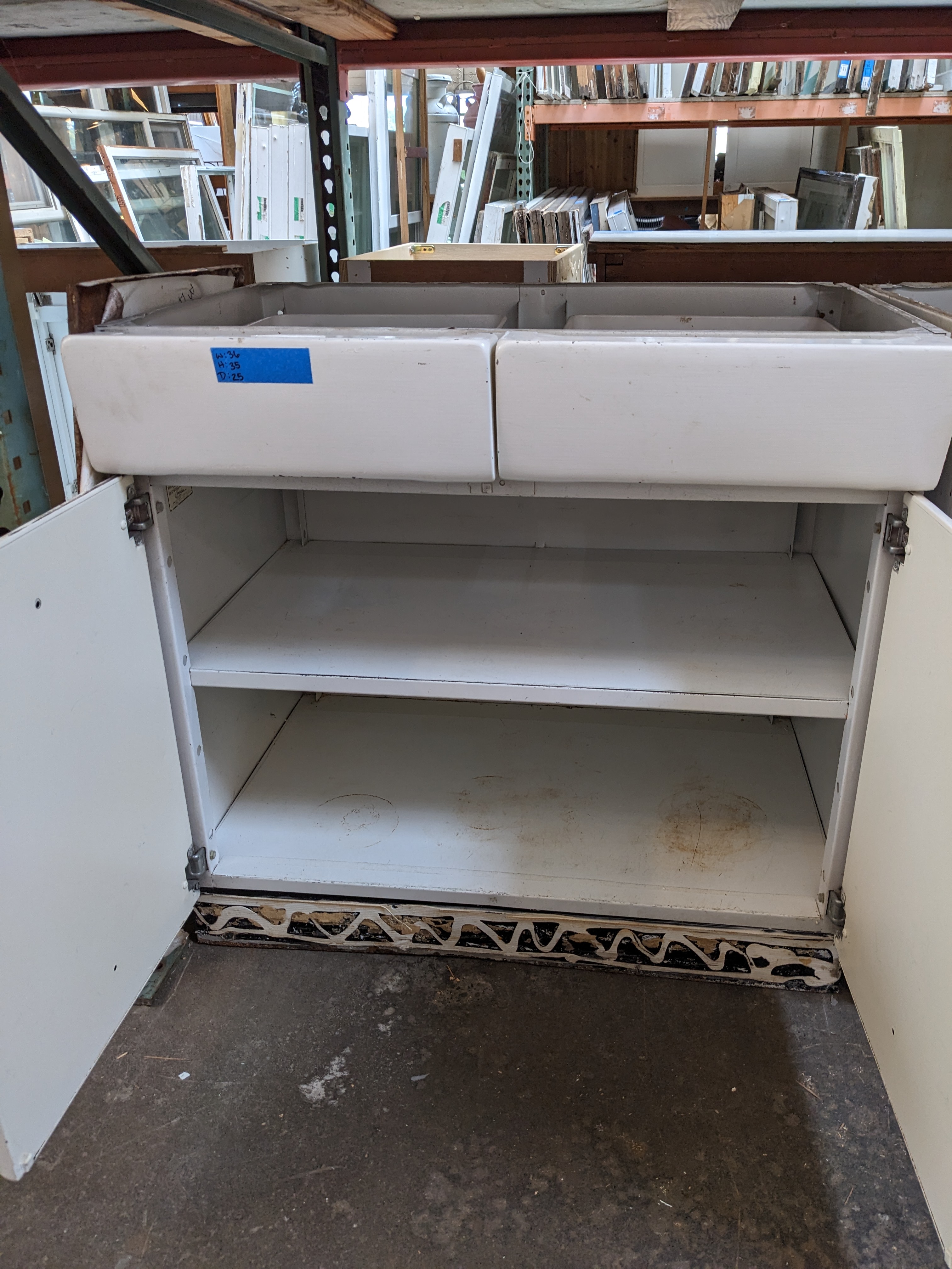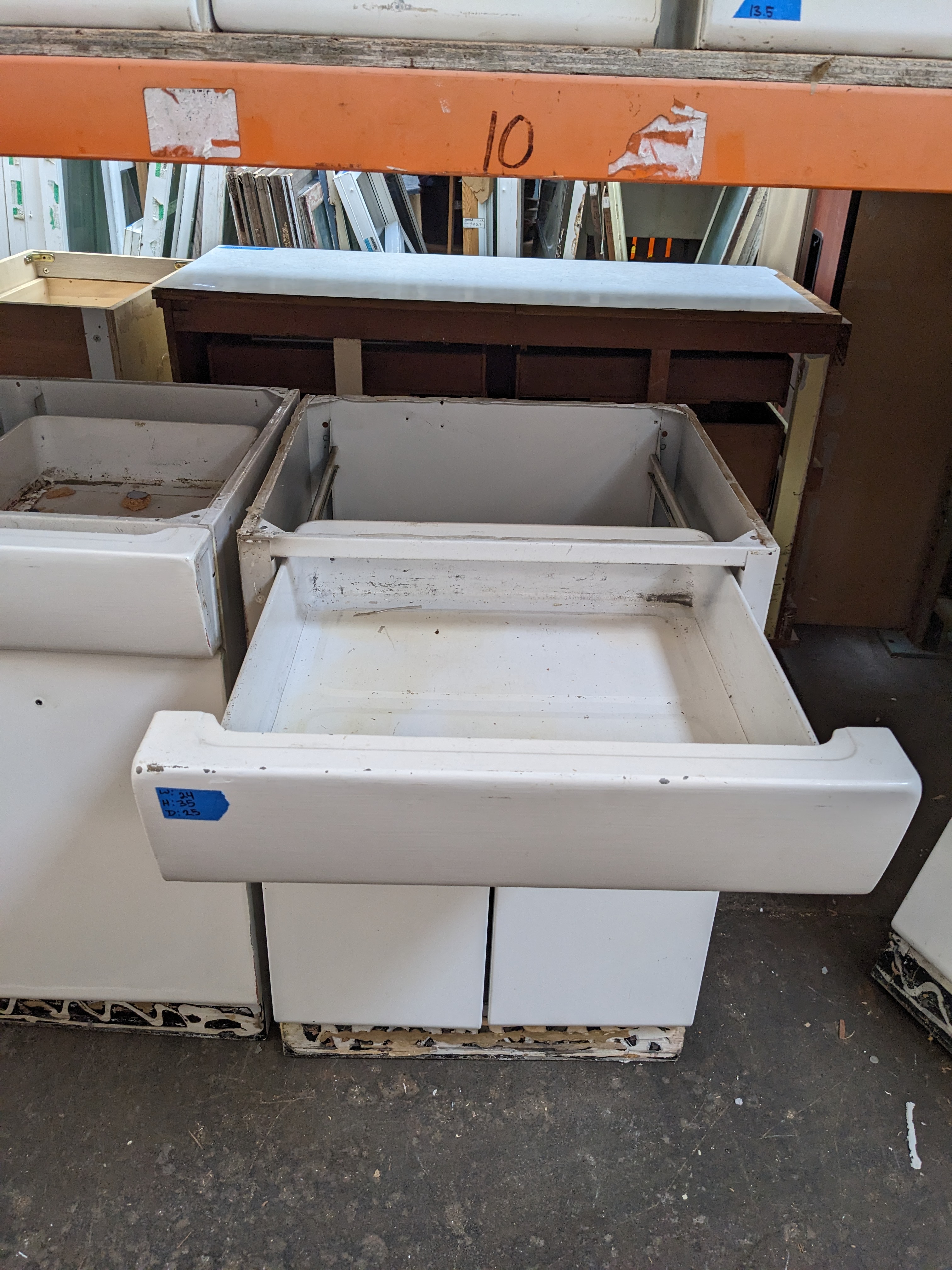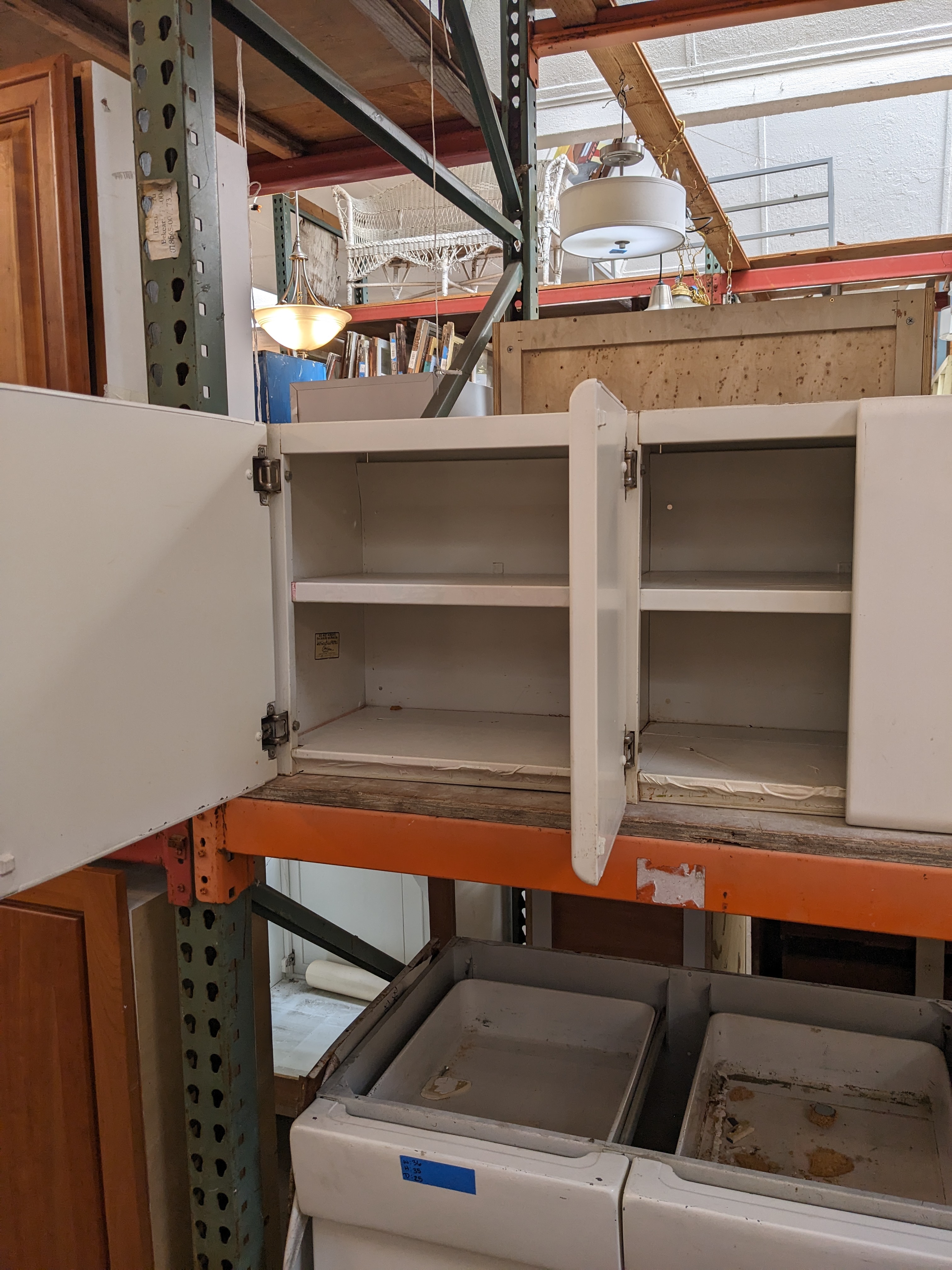 A white metal cabinet set with 3 uppers and 2 lowers.