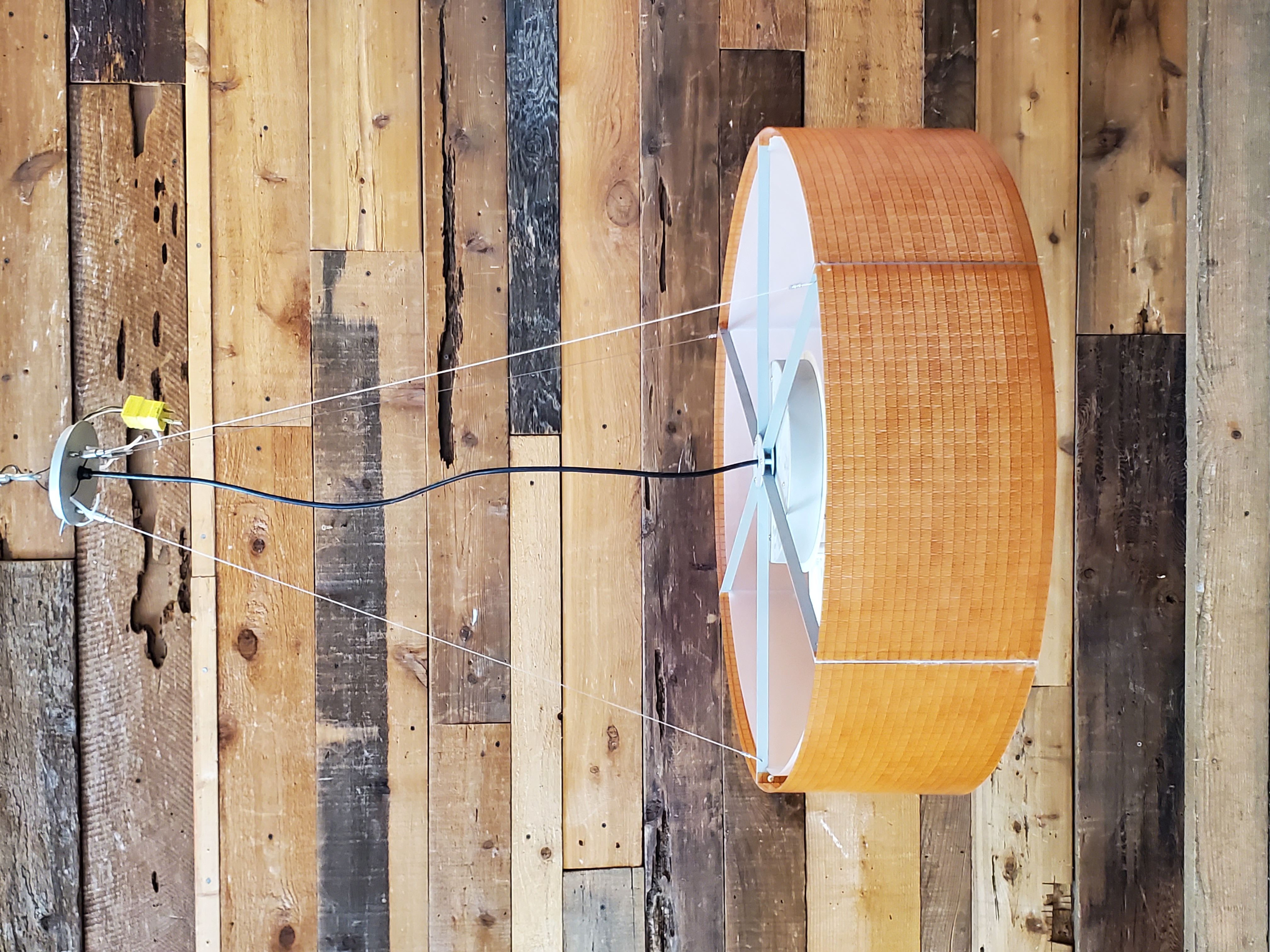 Drum style chandelier in retro orange, hangs 42.5 inches from ceiling with a halo of 3 bayonette socket bulbs.