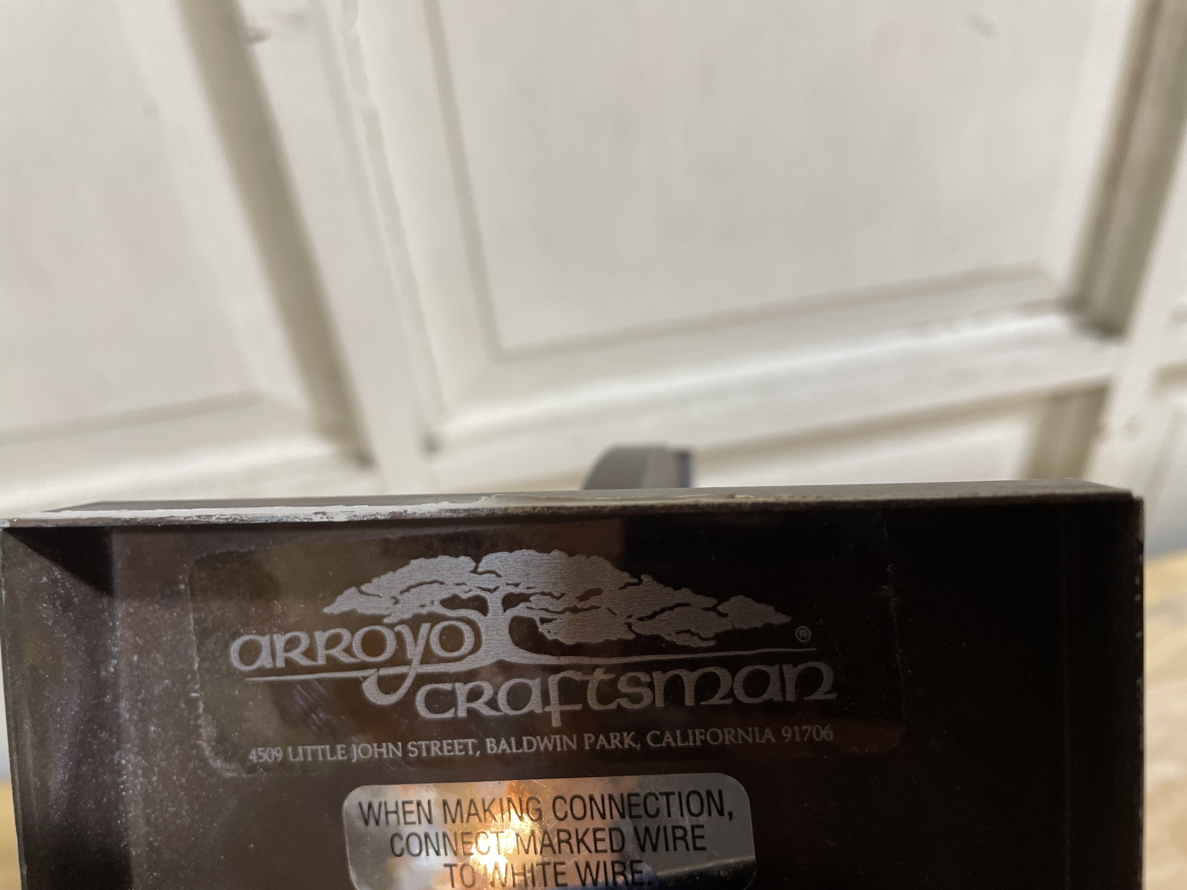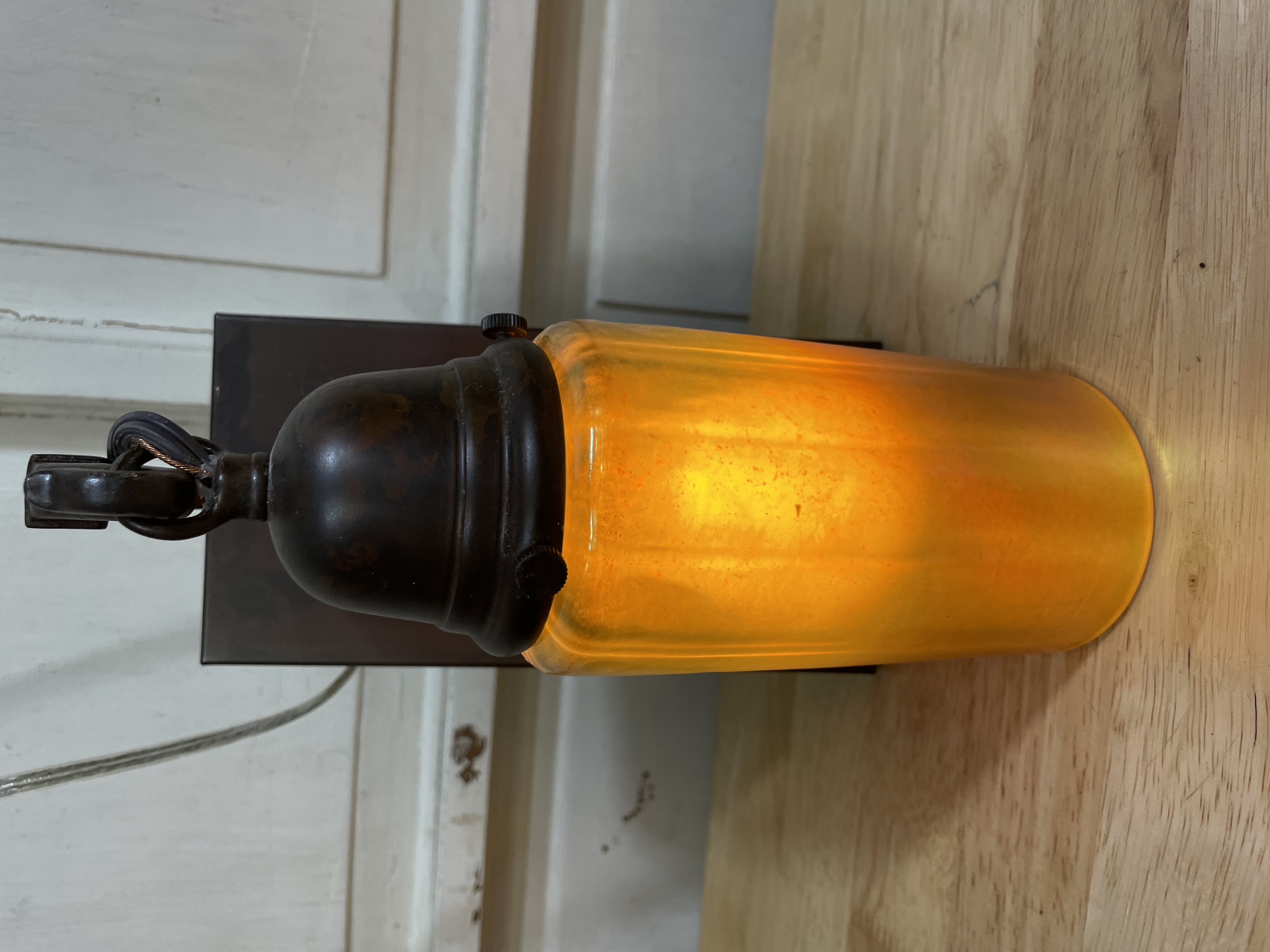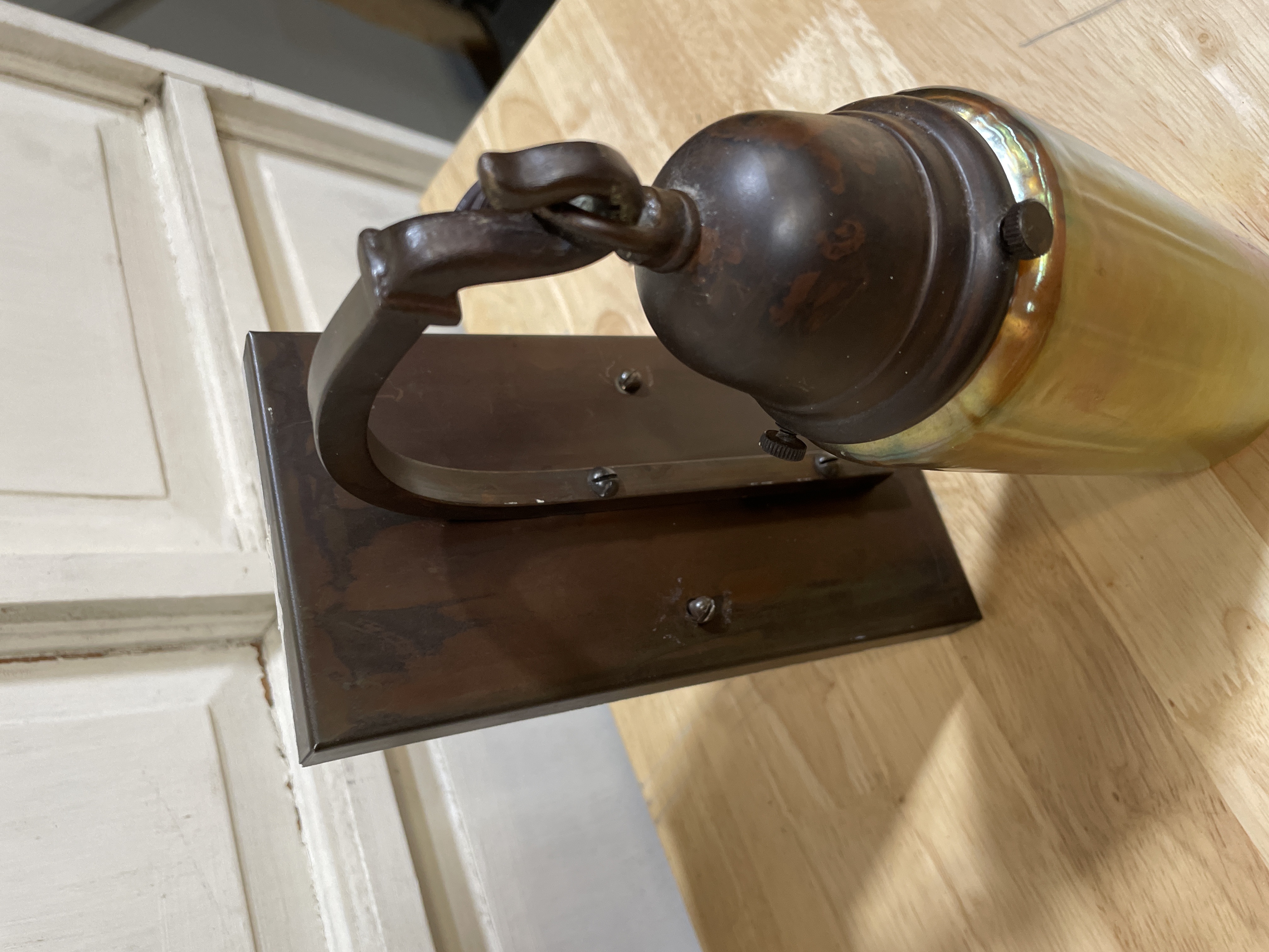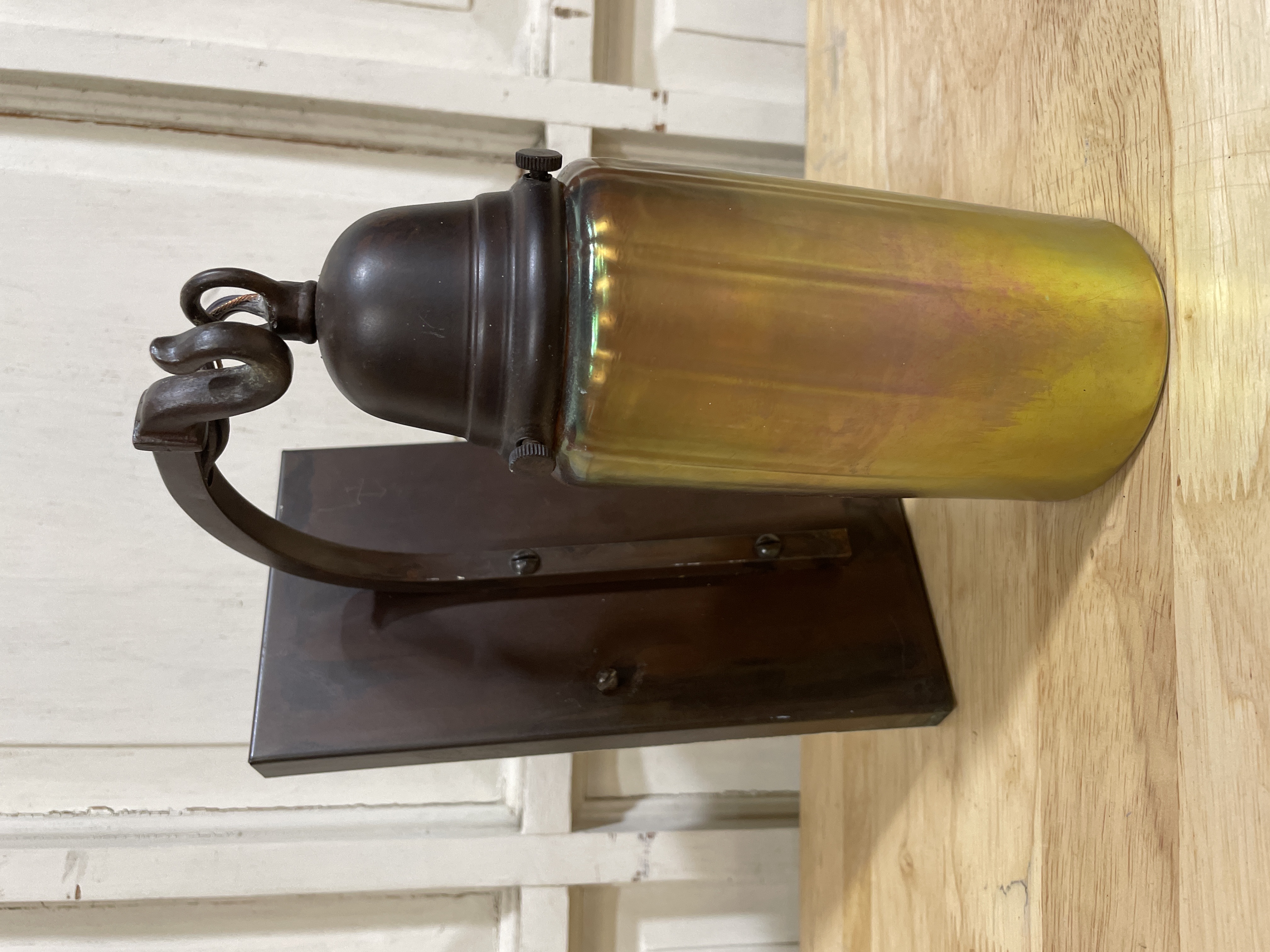Stunning (reproduction) style. Dark rustic brown/bronze finish with off gold-white iridescence shade. Handcrafted in California. High quality. No flaws and in good condition.