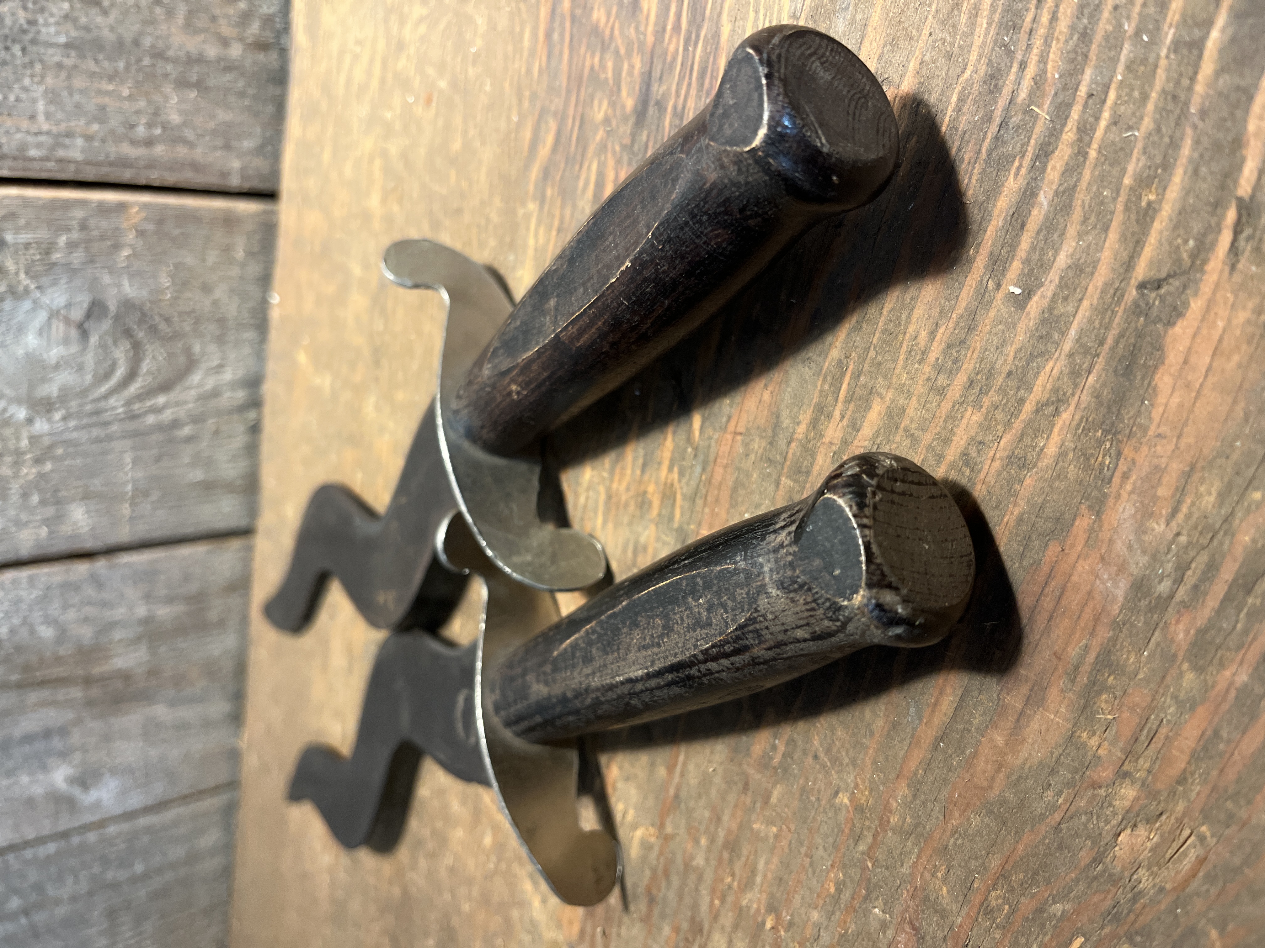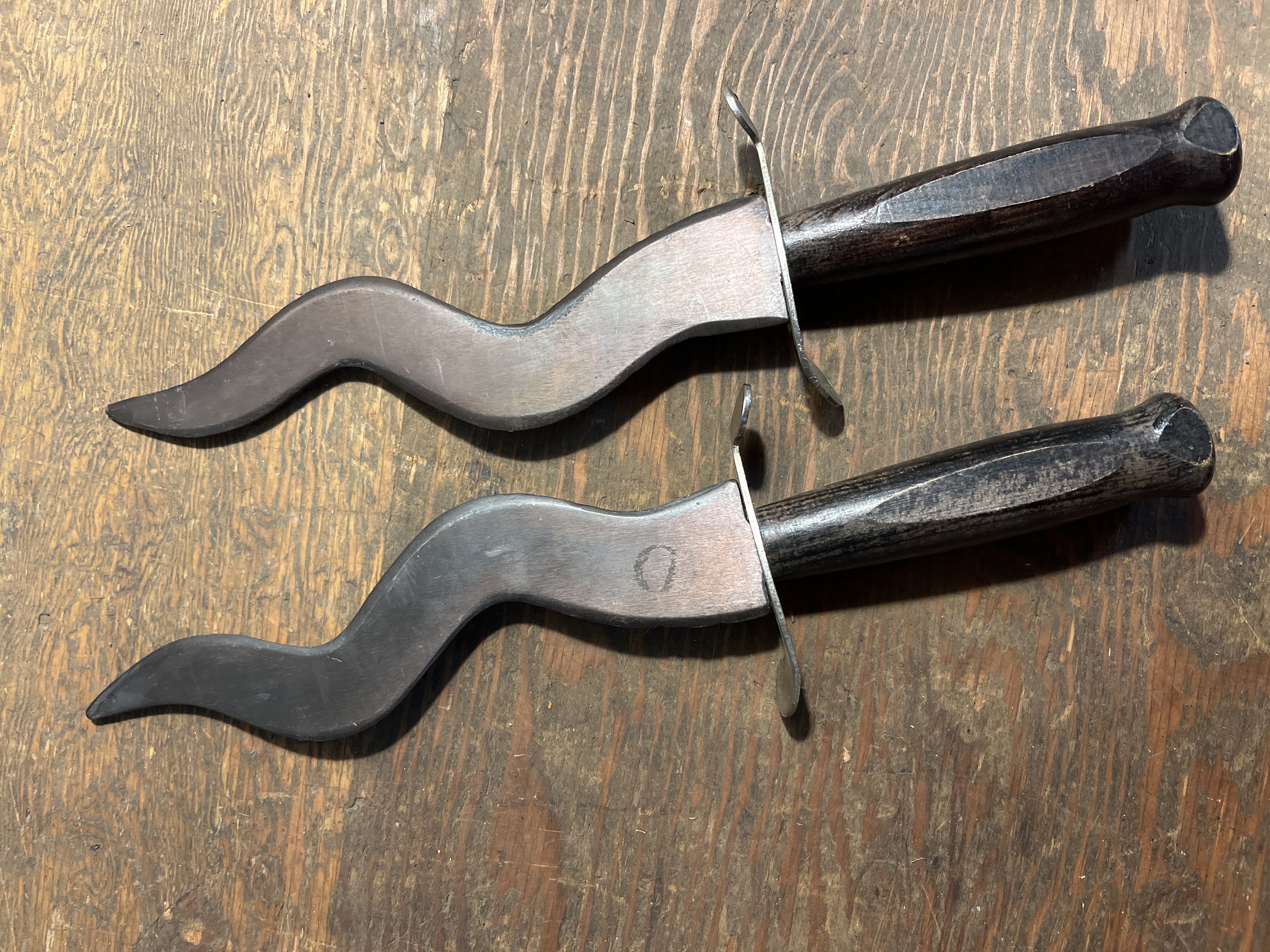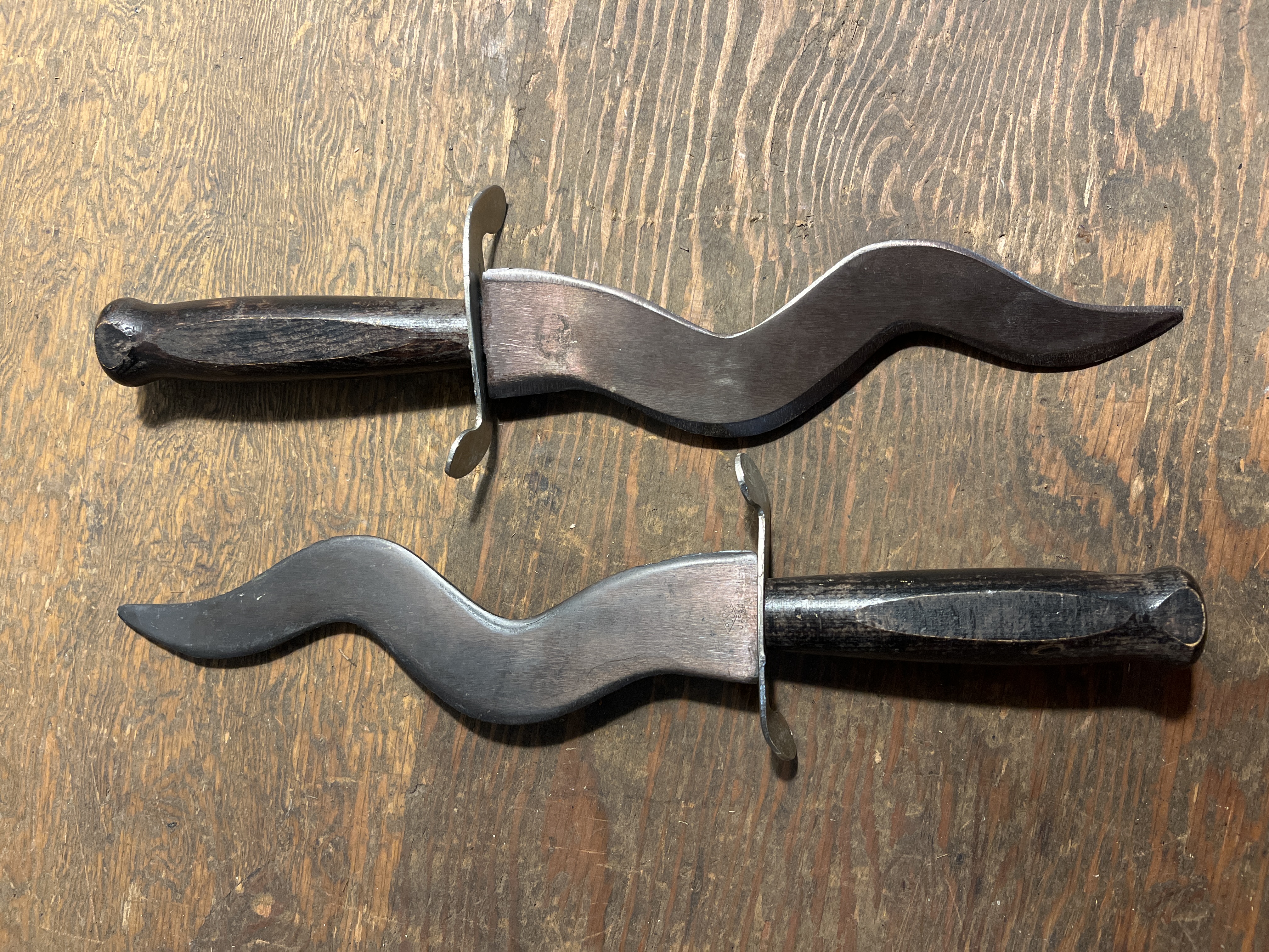 Two kris style daggers with wooden grips and steel blades. The blades are very dull with next to no edge. Great for decor! Measures 3.625 inches across the guard and 12.5 inches top to bottom. Halloween decor!
