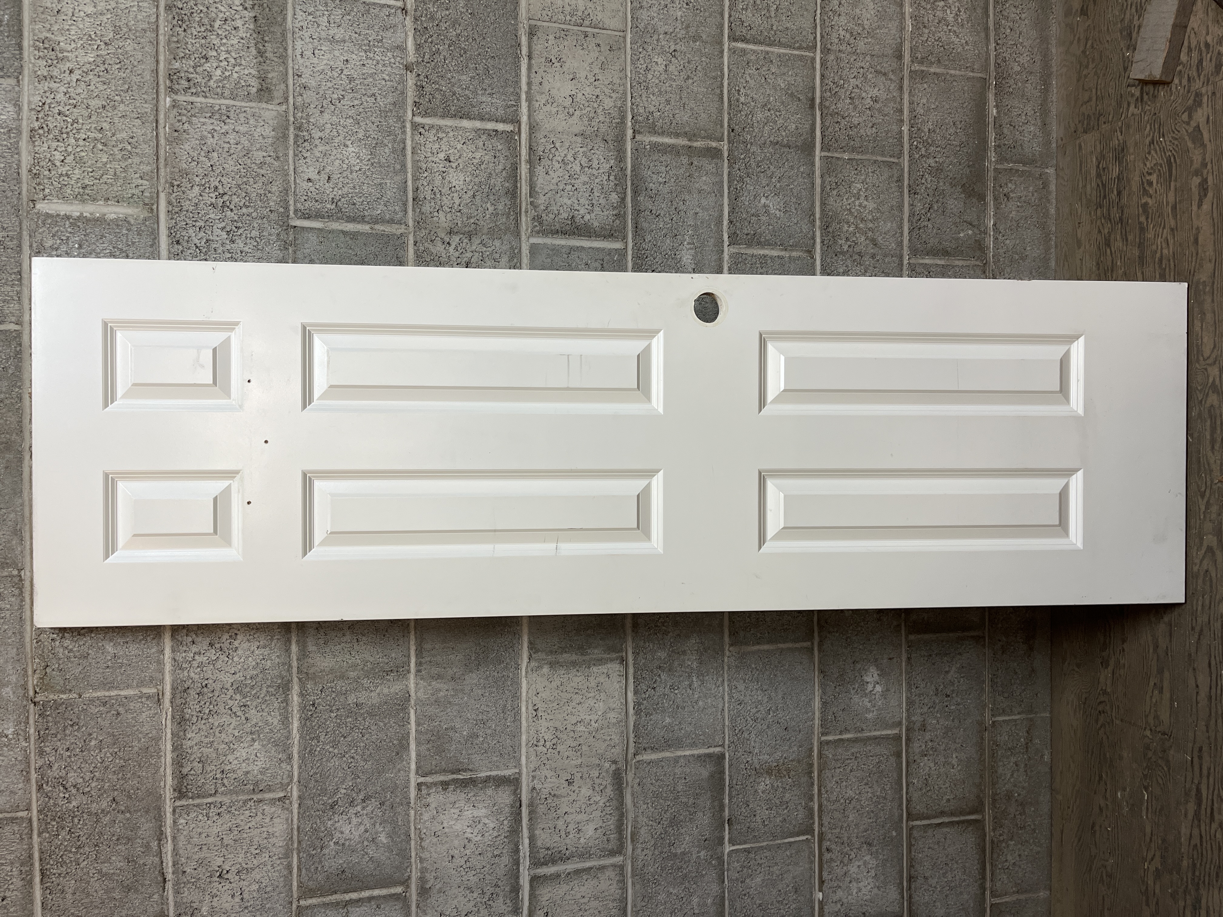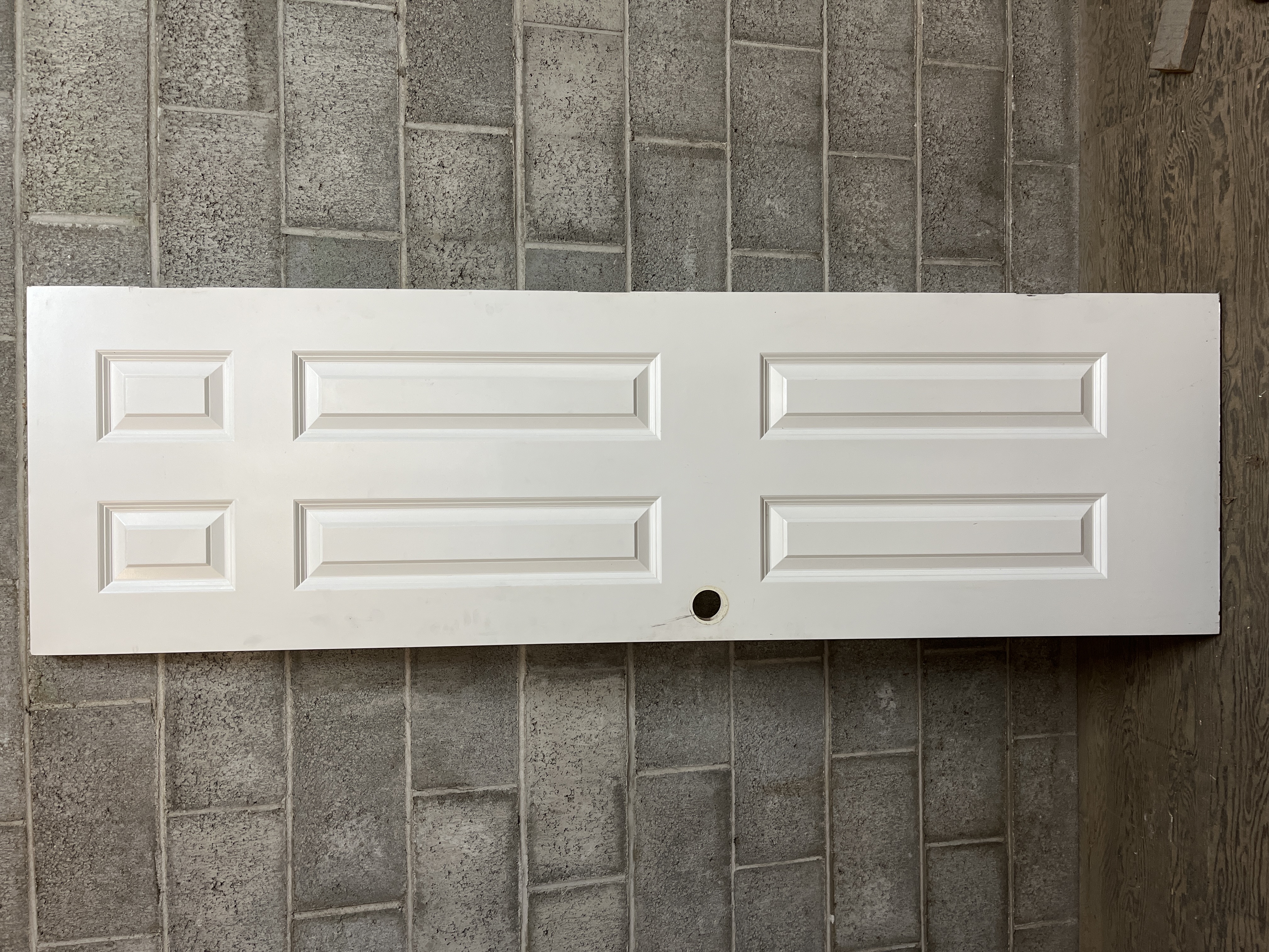 A previously installed left hand swing six panel door in a less common smaller size. Door is in good shape with minor wear and scratches. Three screws were drilled into the exterior side of the door at some point. Measures 23.75 x 80 inches.