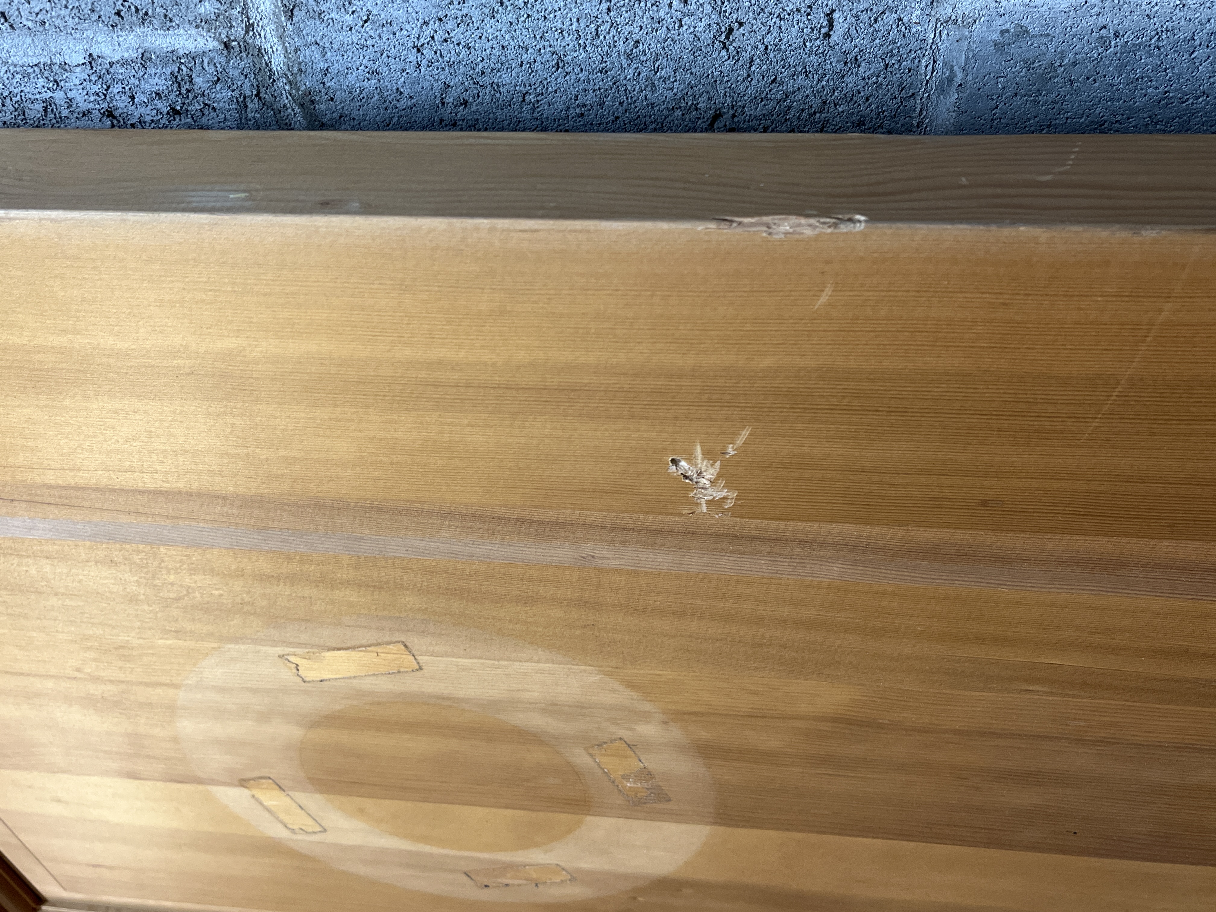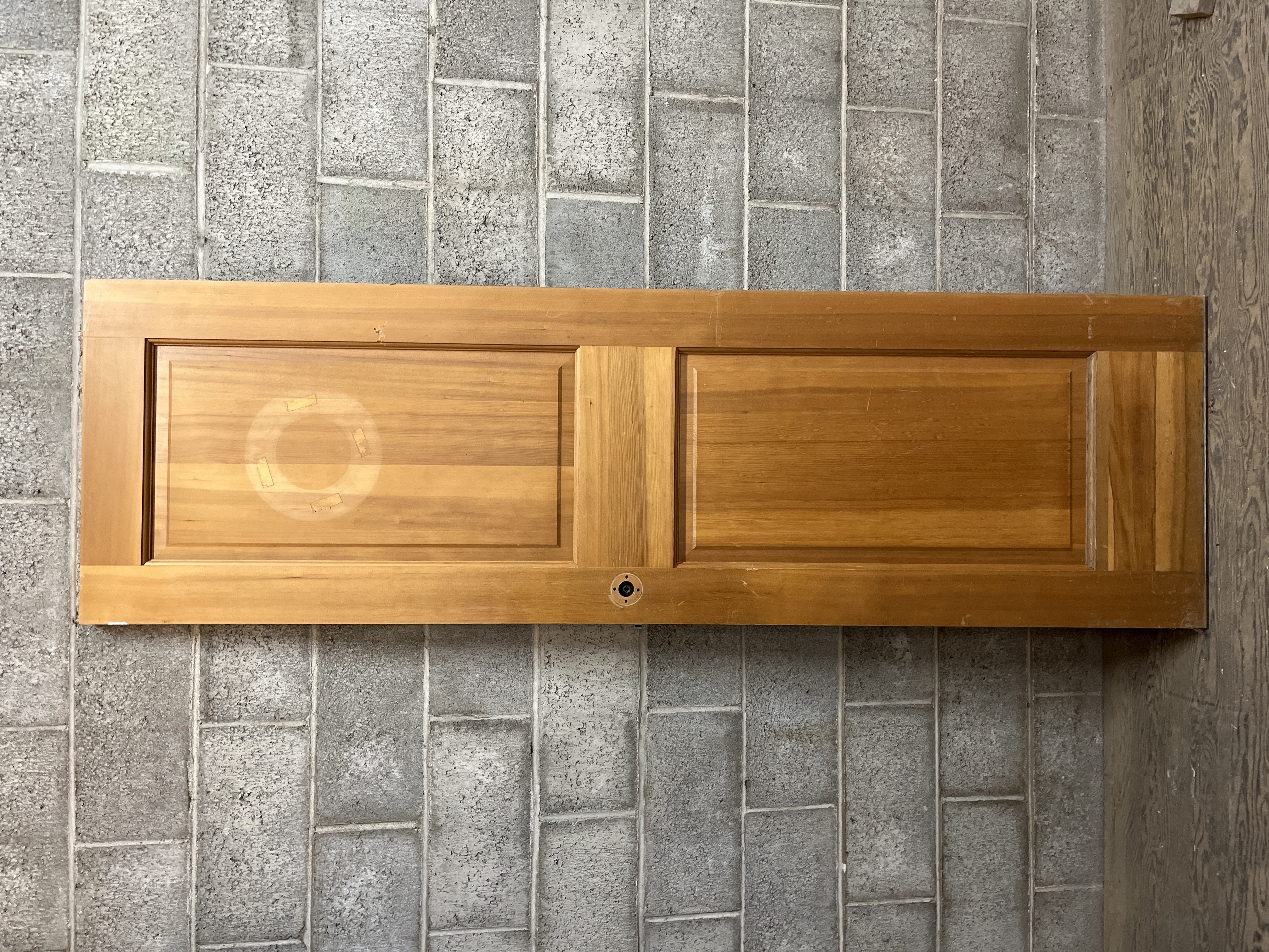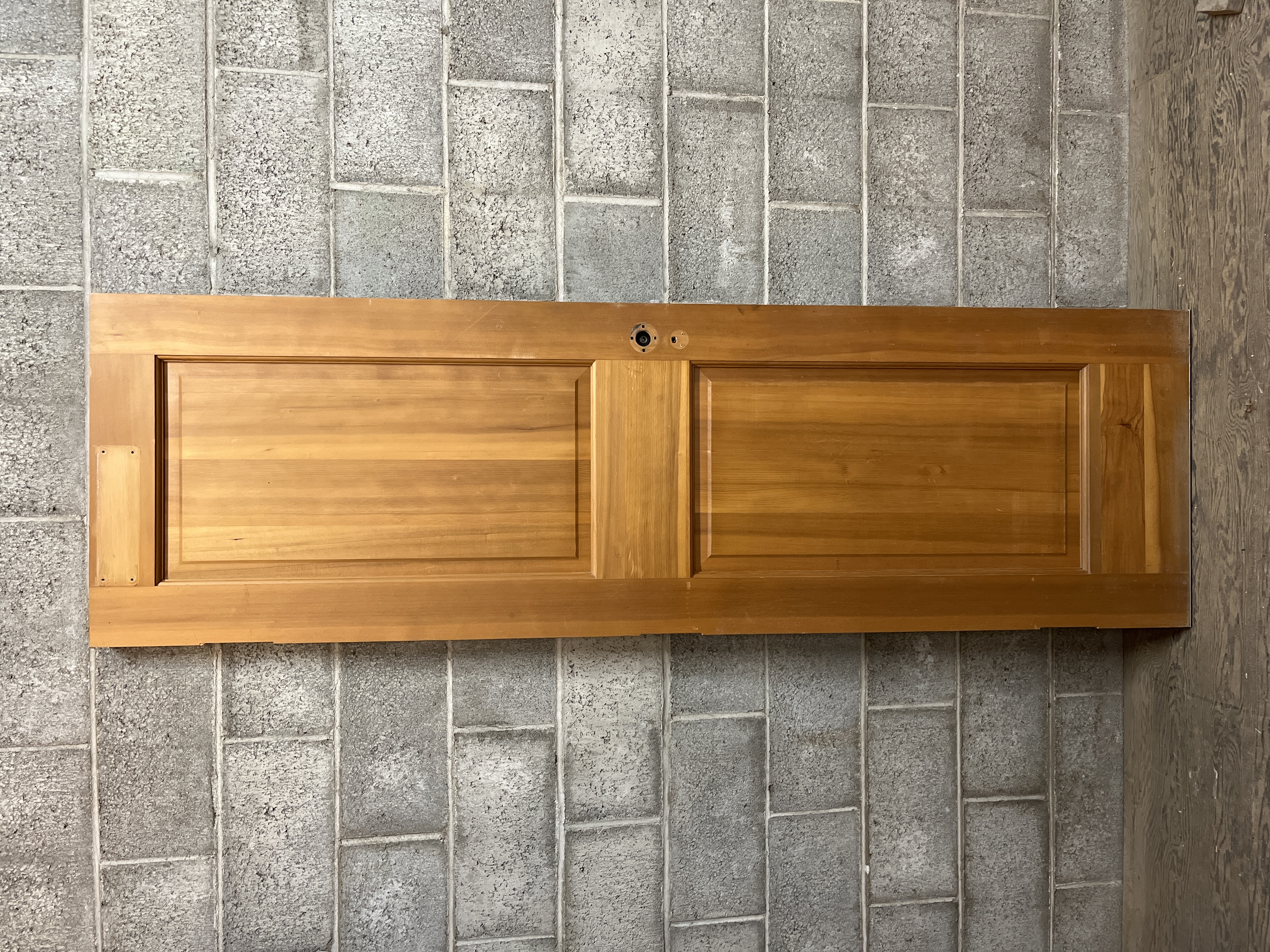 A nice unpainted right hand swing two panel door. Has a big mortise box inside and it accepts vintage hardware. There are some storage gouges but overall this door is in nice shape. Measures 23.875 x 79.125 inches.
