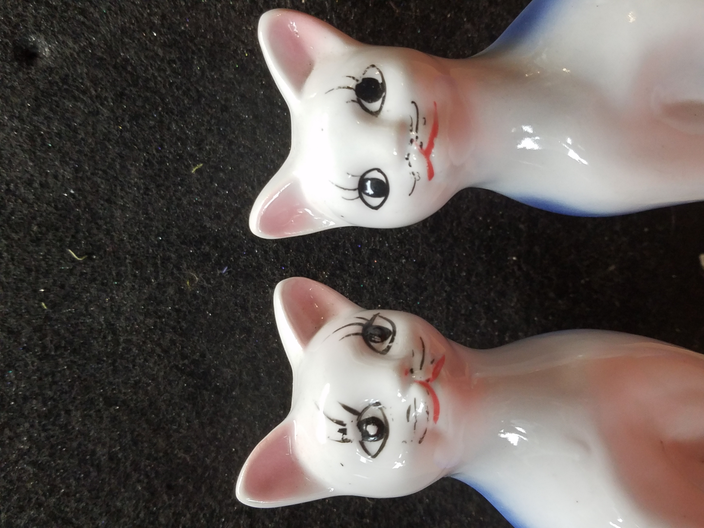 Pair of ceramic cats with large, expressive eyes framed with long spidery lashes. These fashionable felines have powder pink ears and a blue stripe running along their fronts and tails.