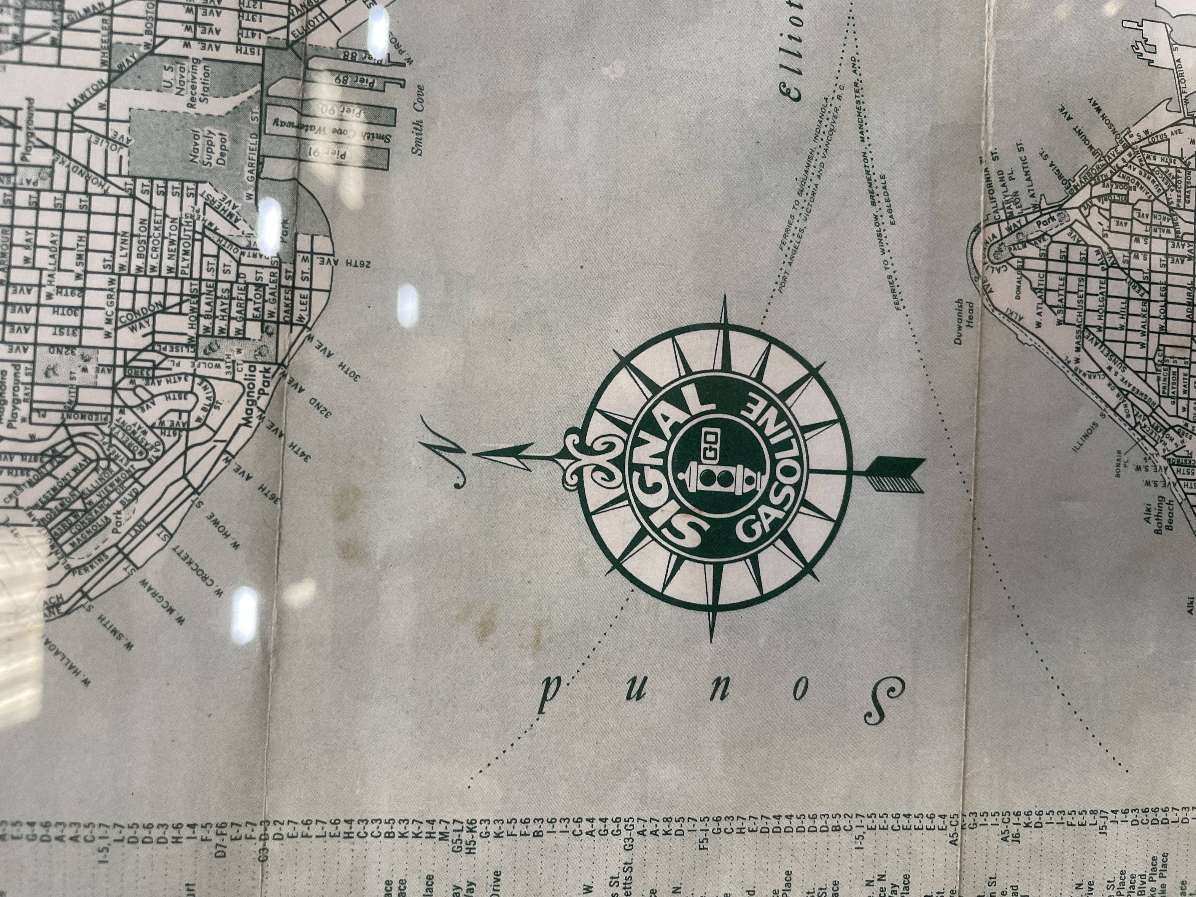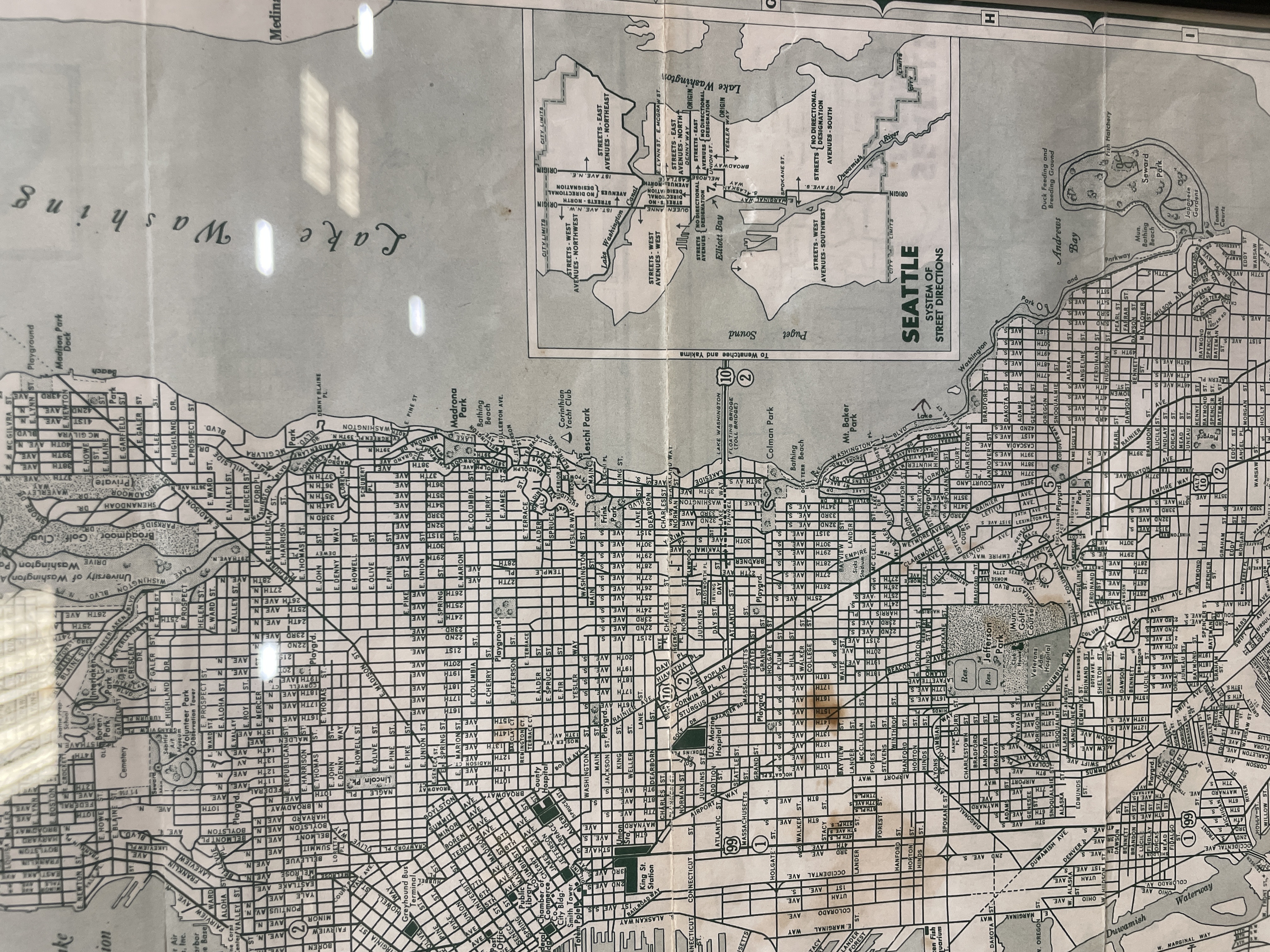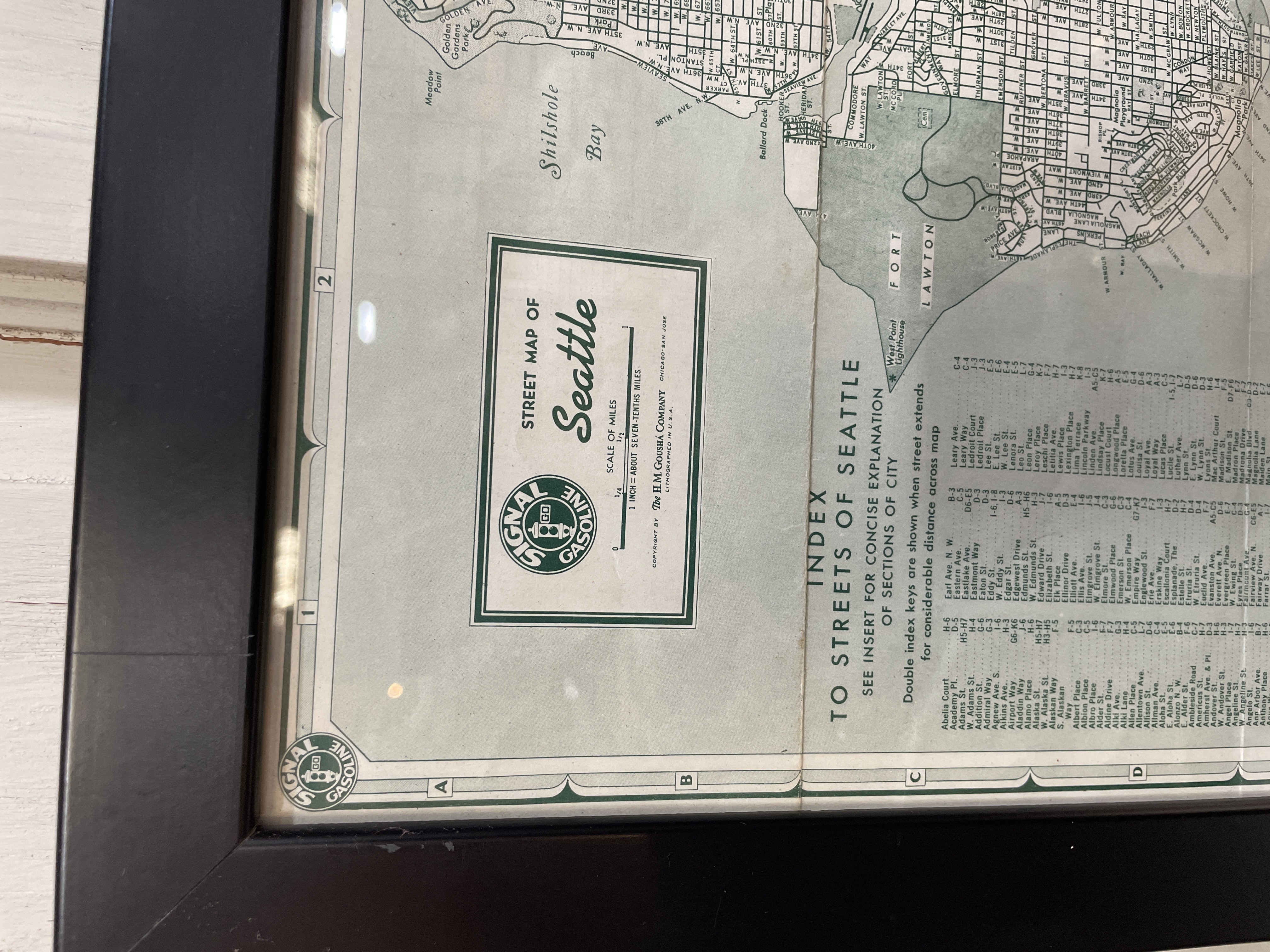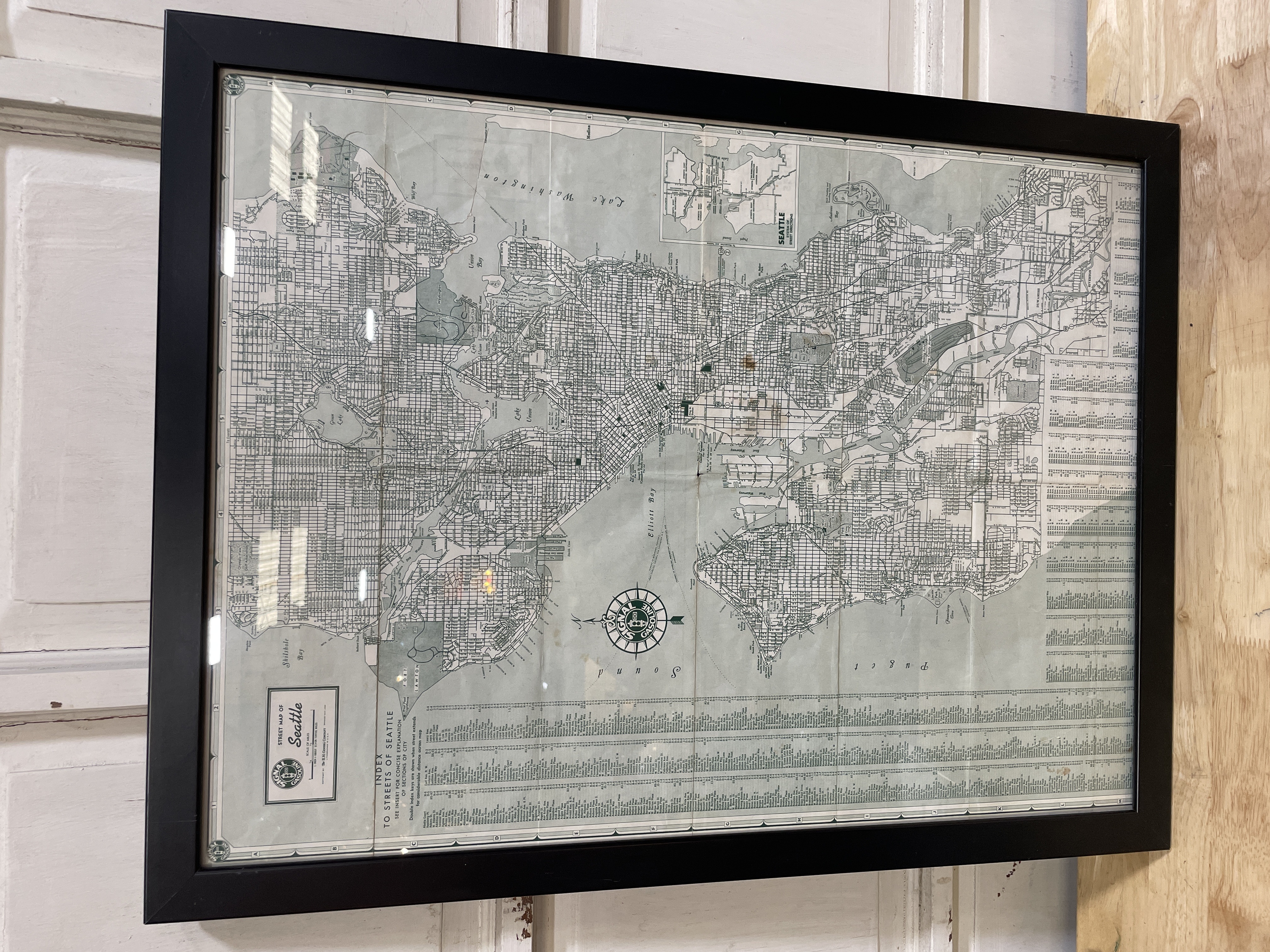 Around the 1920’s this map included index to the streets of Seattle providing an overview of the city’s layout and geographical features. Black frame and map has a few aging spots.
