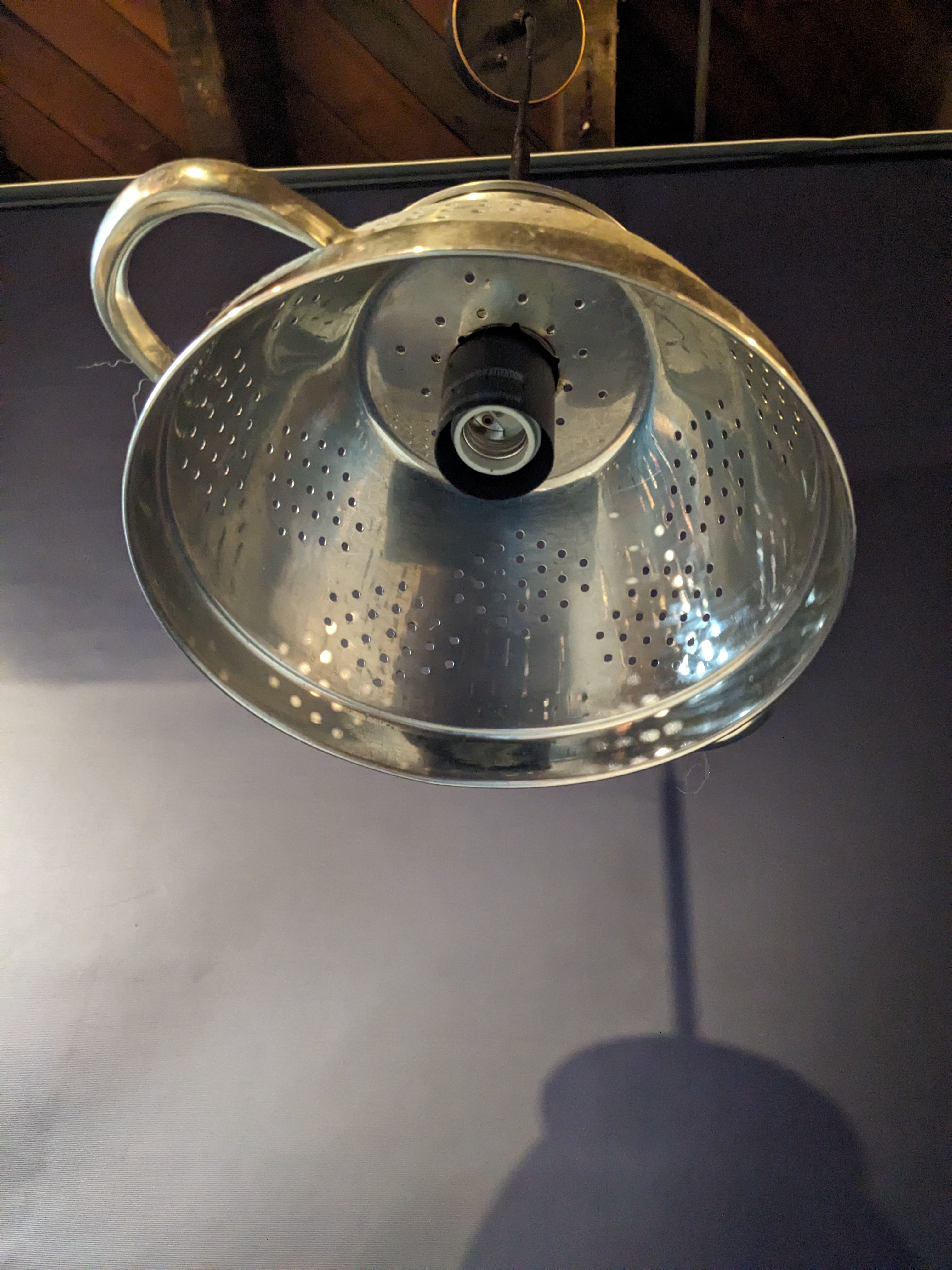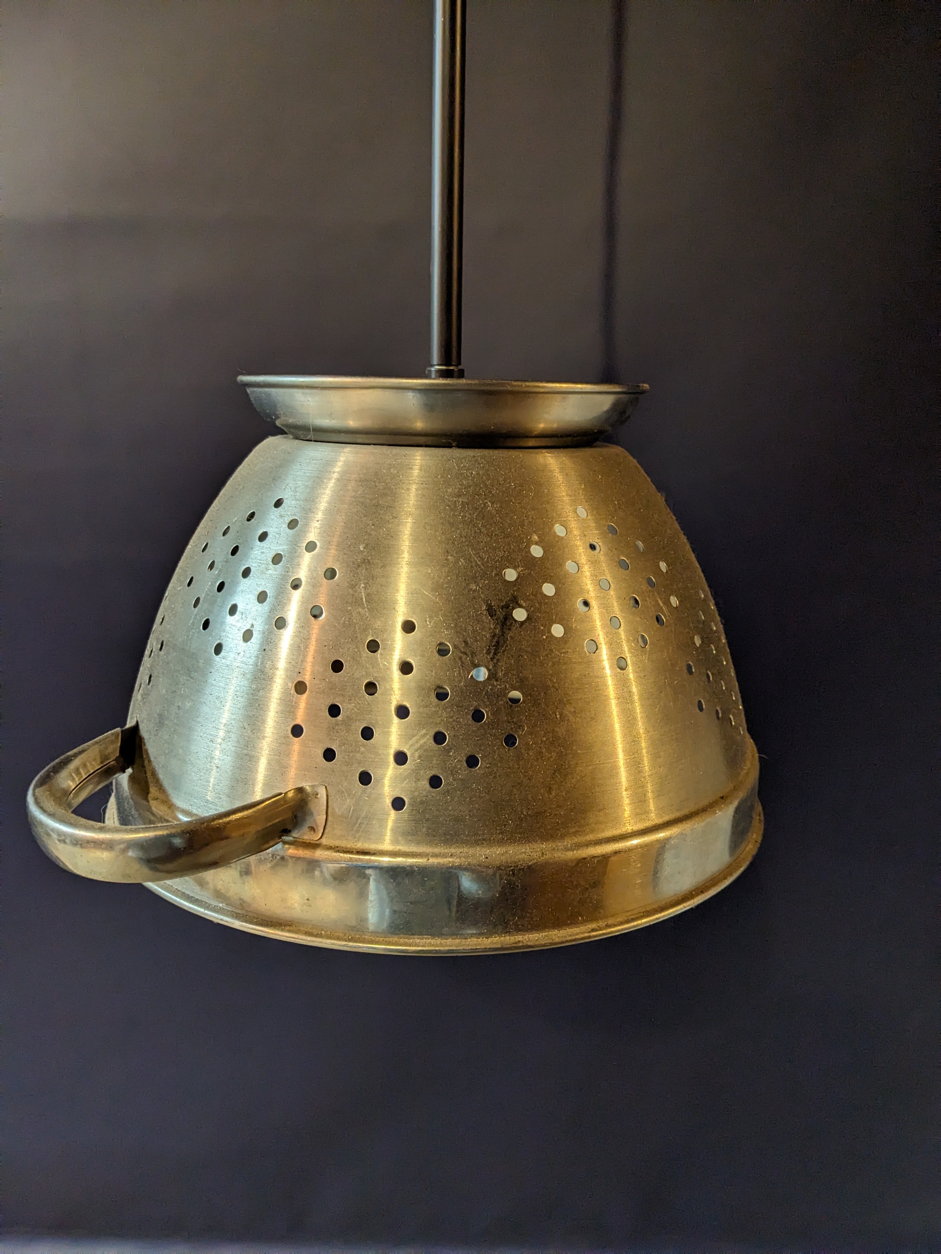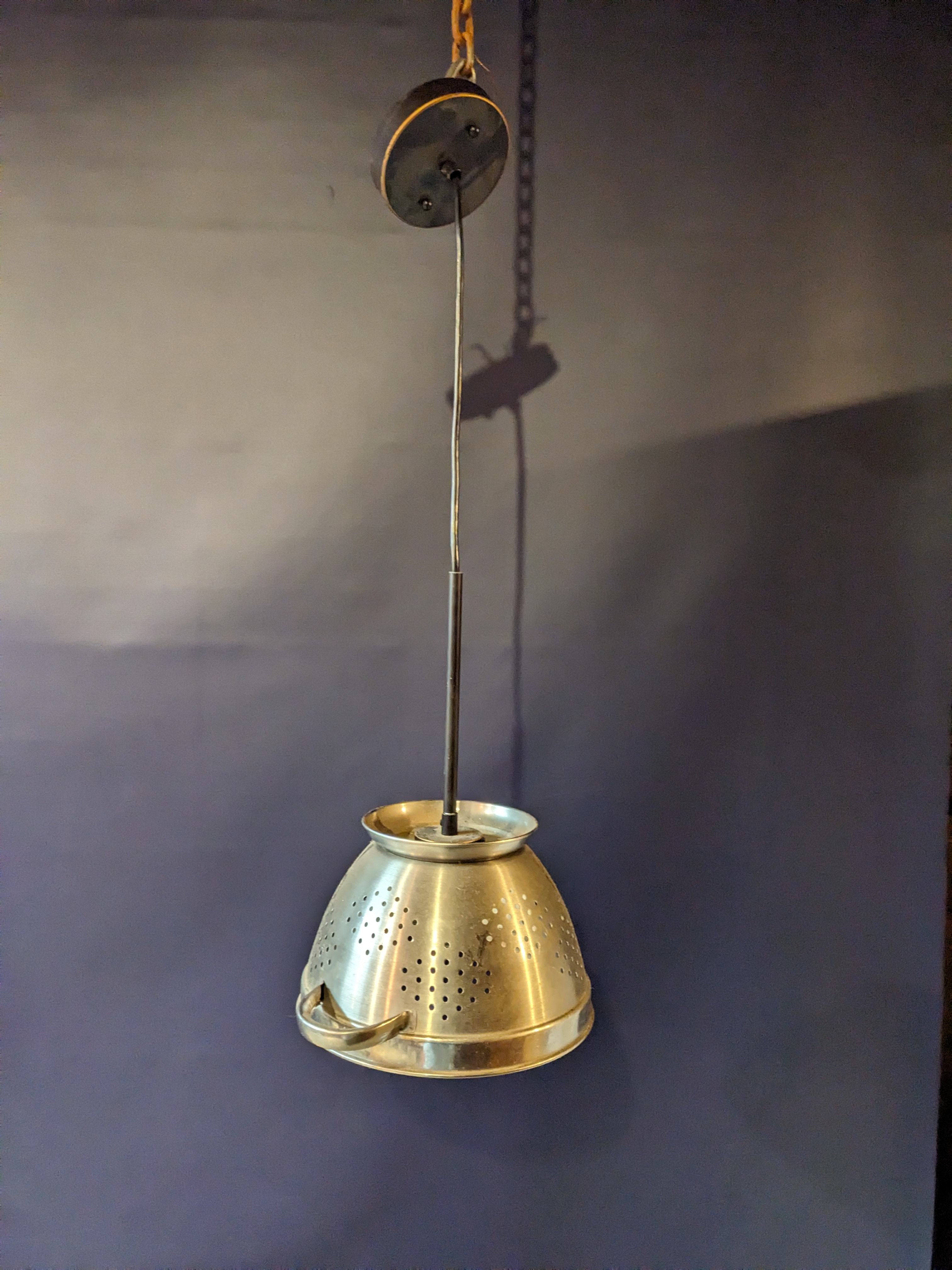 A very unique light made from a colander. This light is in excellent condition with no notable damage aside from some very small wear. It measures roughly 13 x 28 x 10 inches.