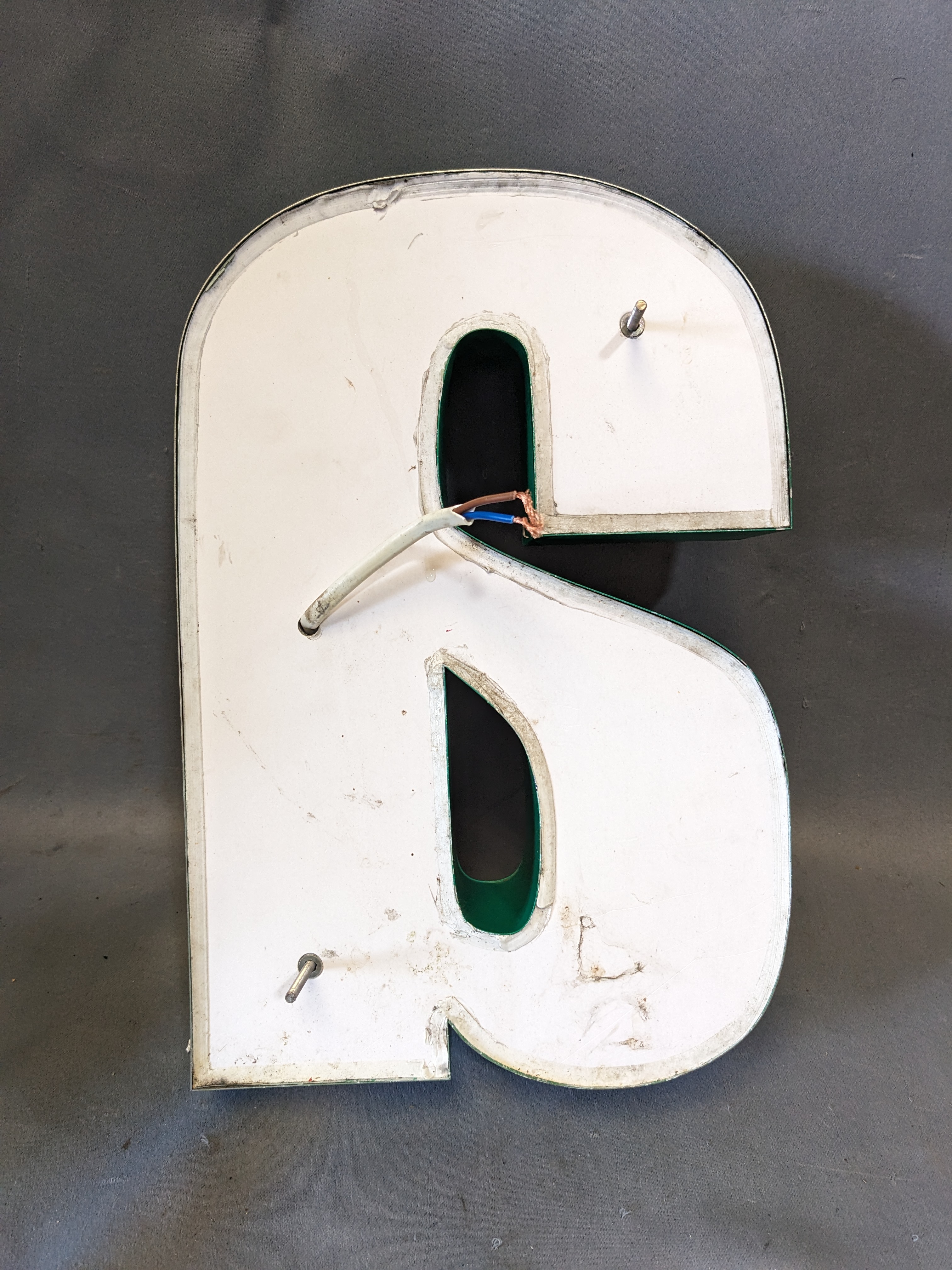 Recycled commercial sign letter. Metal frame with a plastic infill. Wired for lighting, but has not been tested. Mounting hardware still attached. 8.5 x 12.5