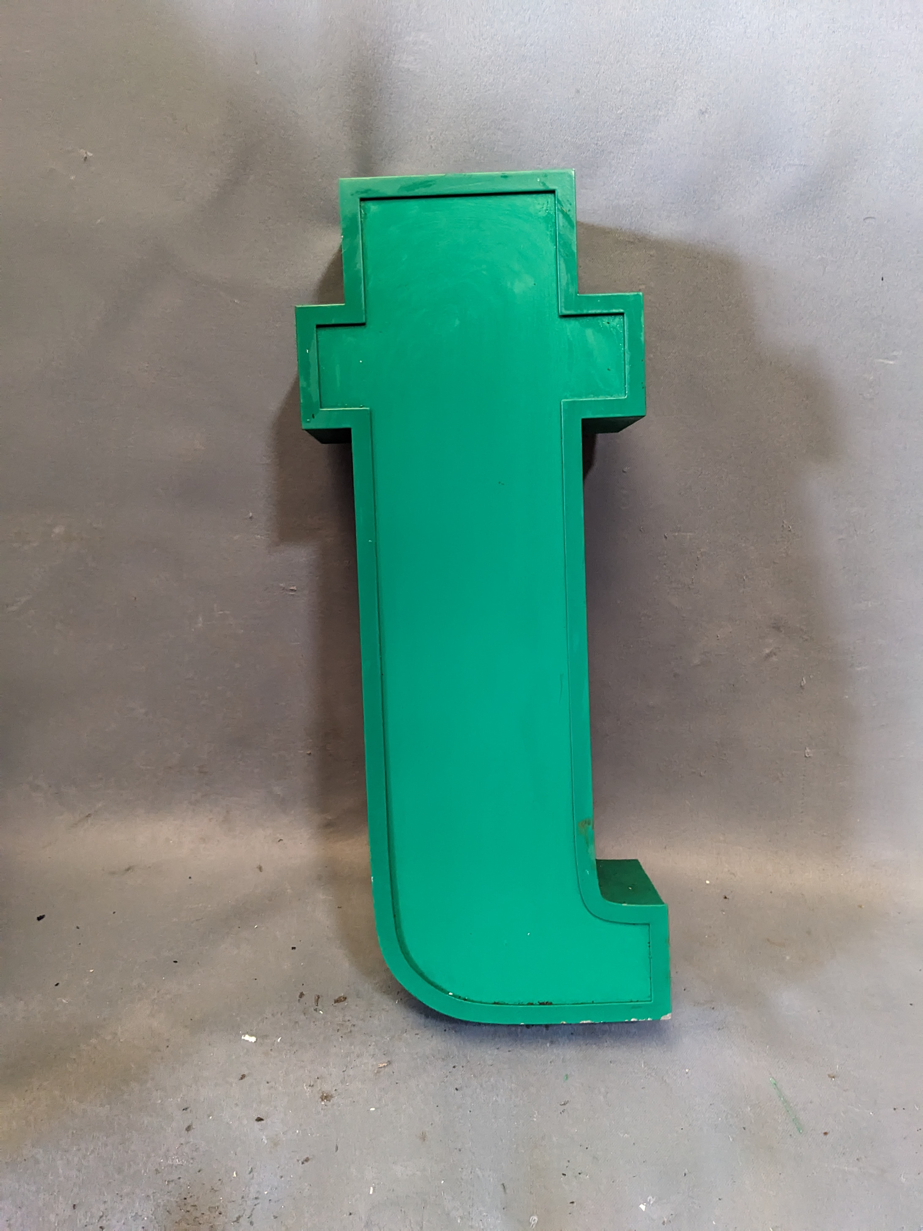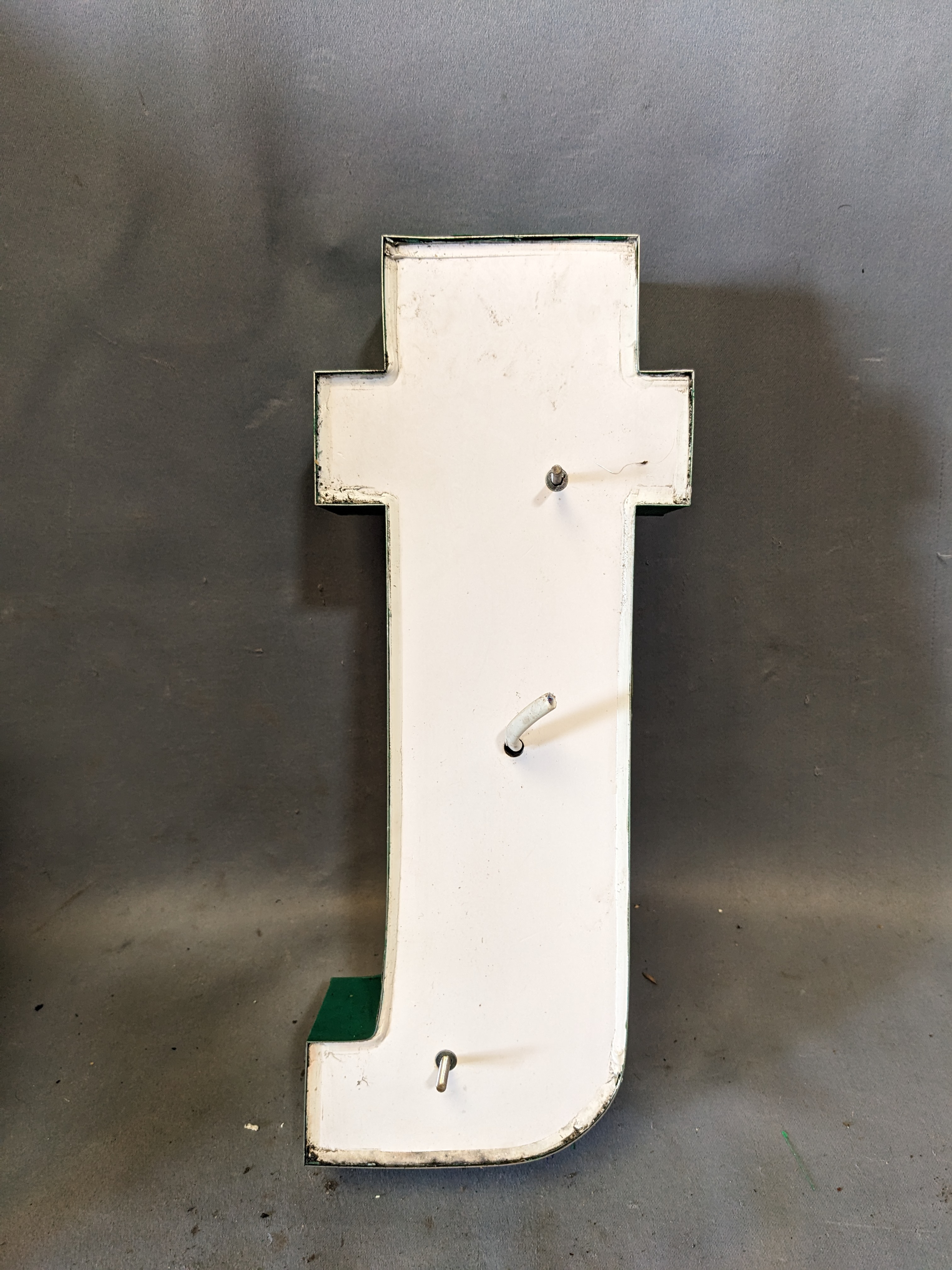 Recycled commercial sign letter. Metal frame with a plastic infill. Wired for lighting, but has not been tested. Mounting hardware still attached. 6.5 x 15