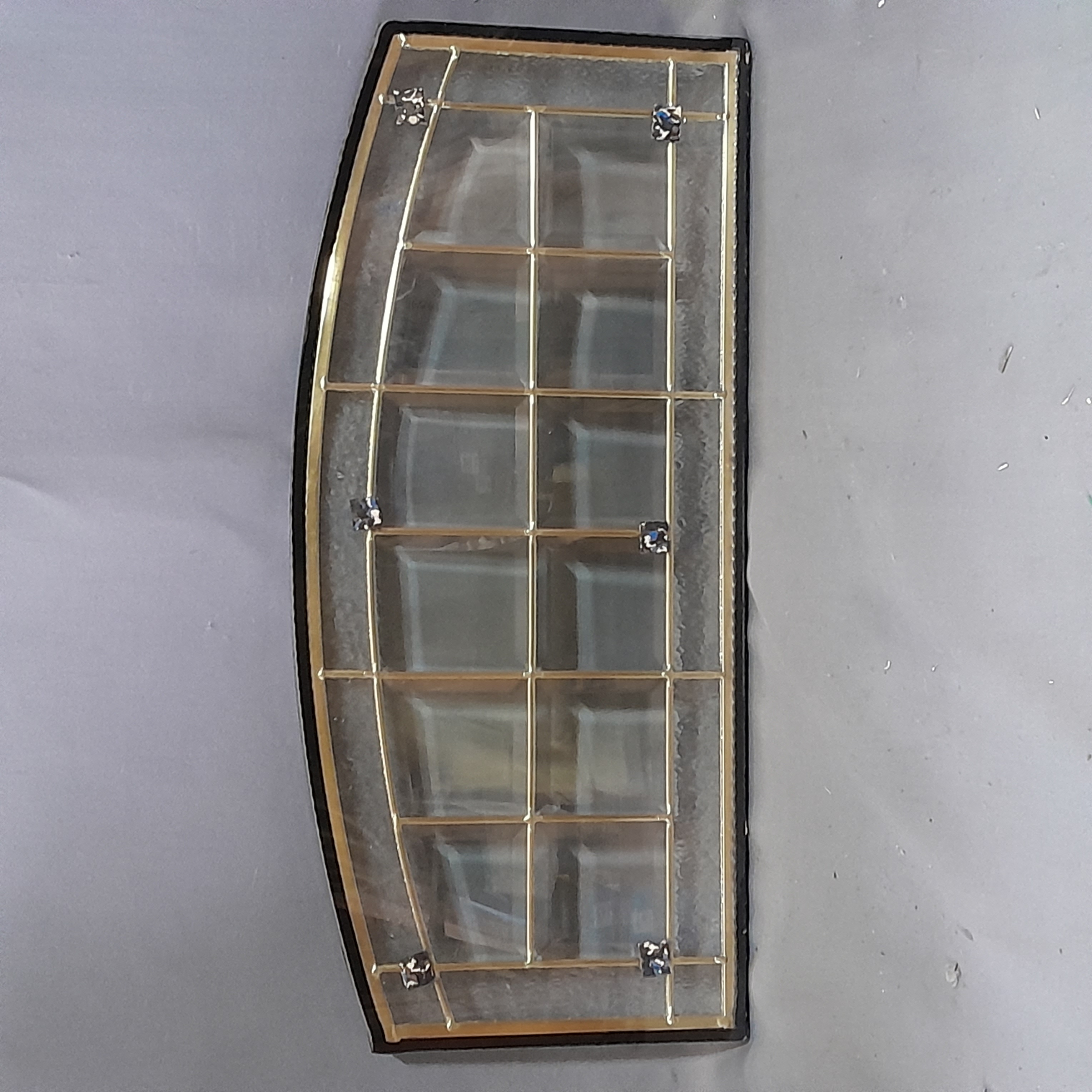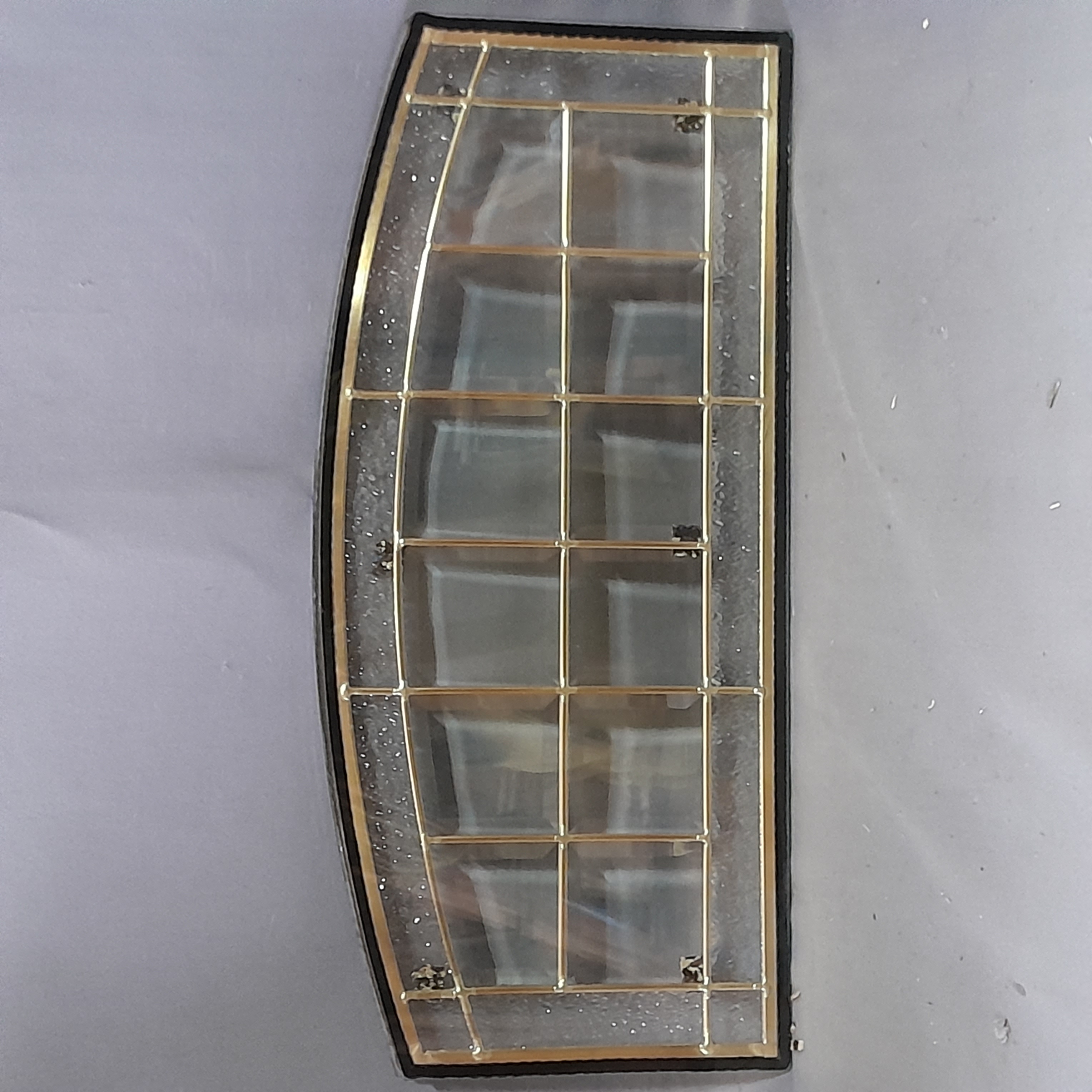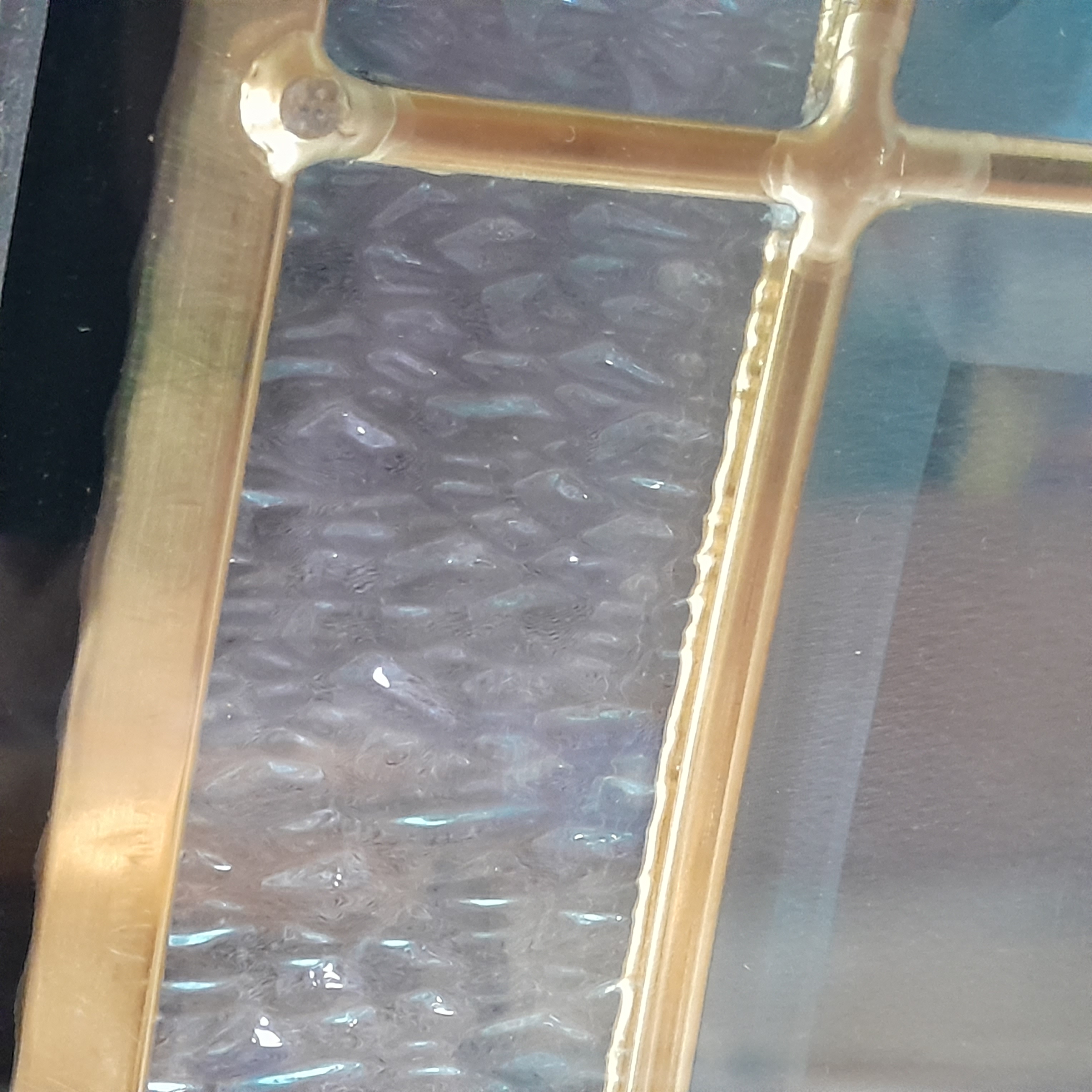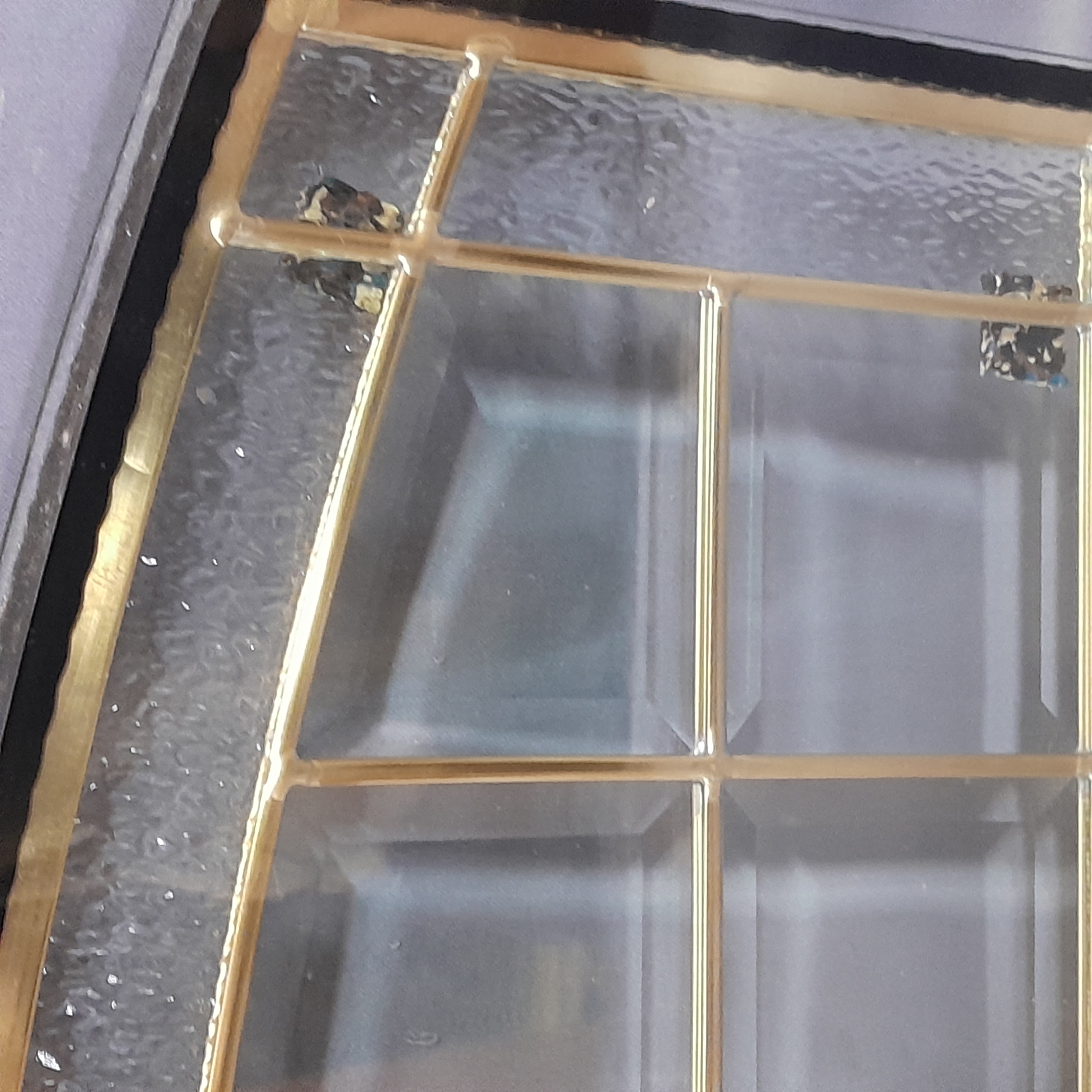 This beautiful and shiny brass accented leaded glass insert is in excellent condition. The beveled and opaque glass marry well together and provides a fun reflection when sun shines through it. No cracks, spits or chips. The rectangular pattern would add to any project.