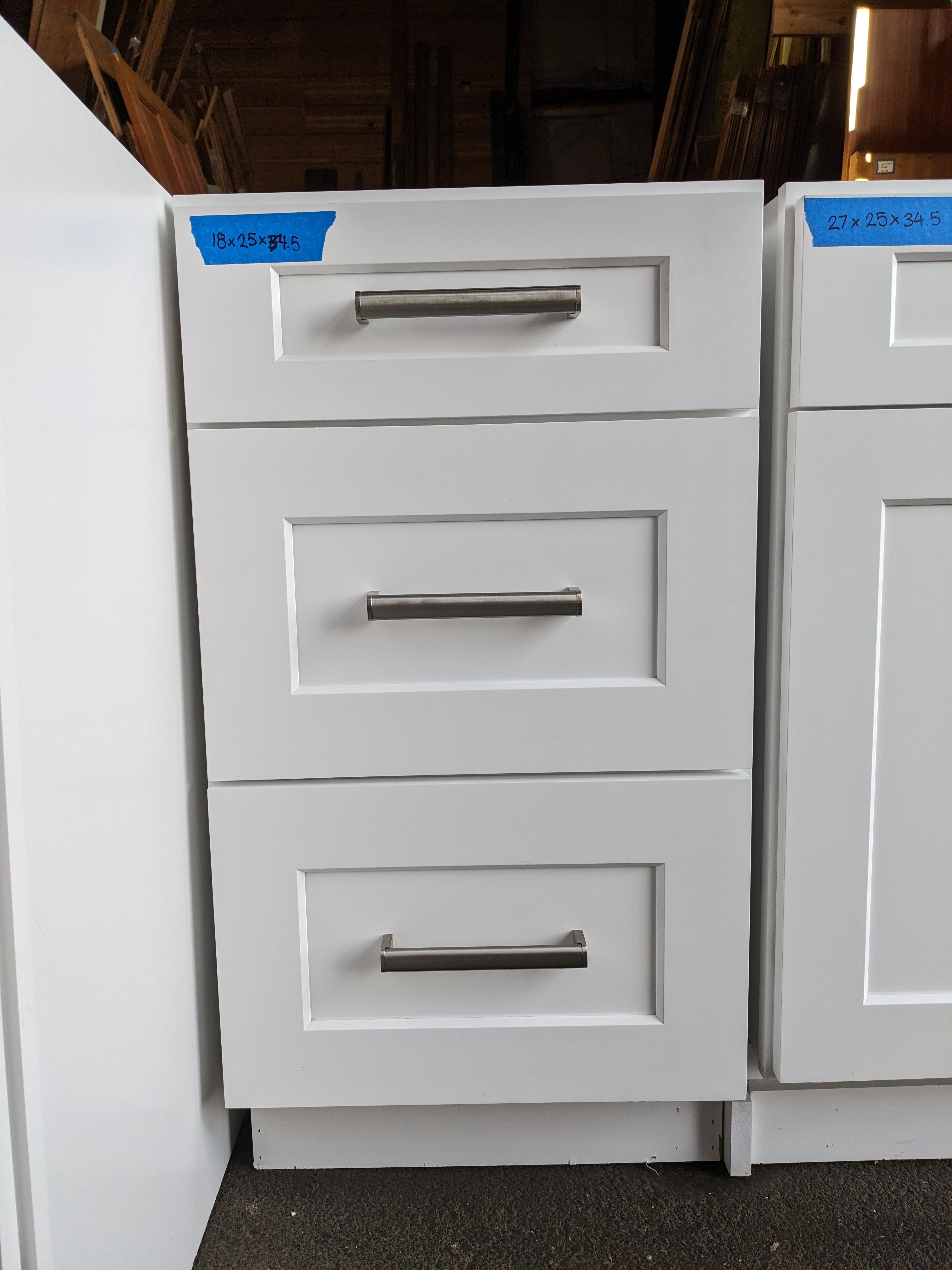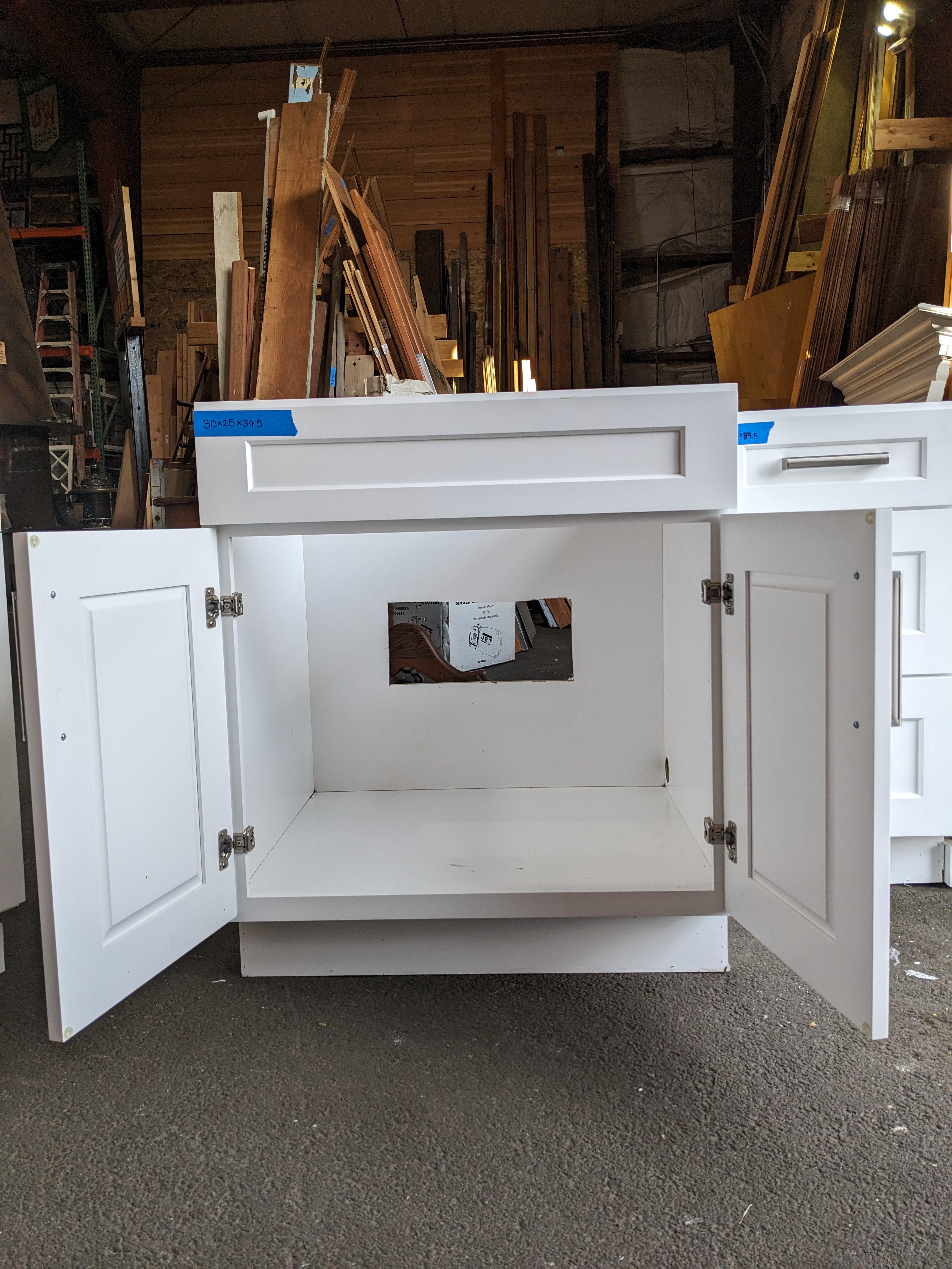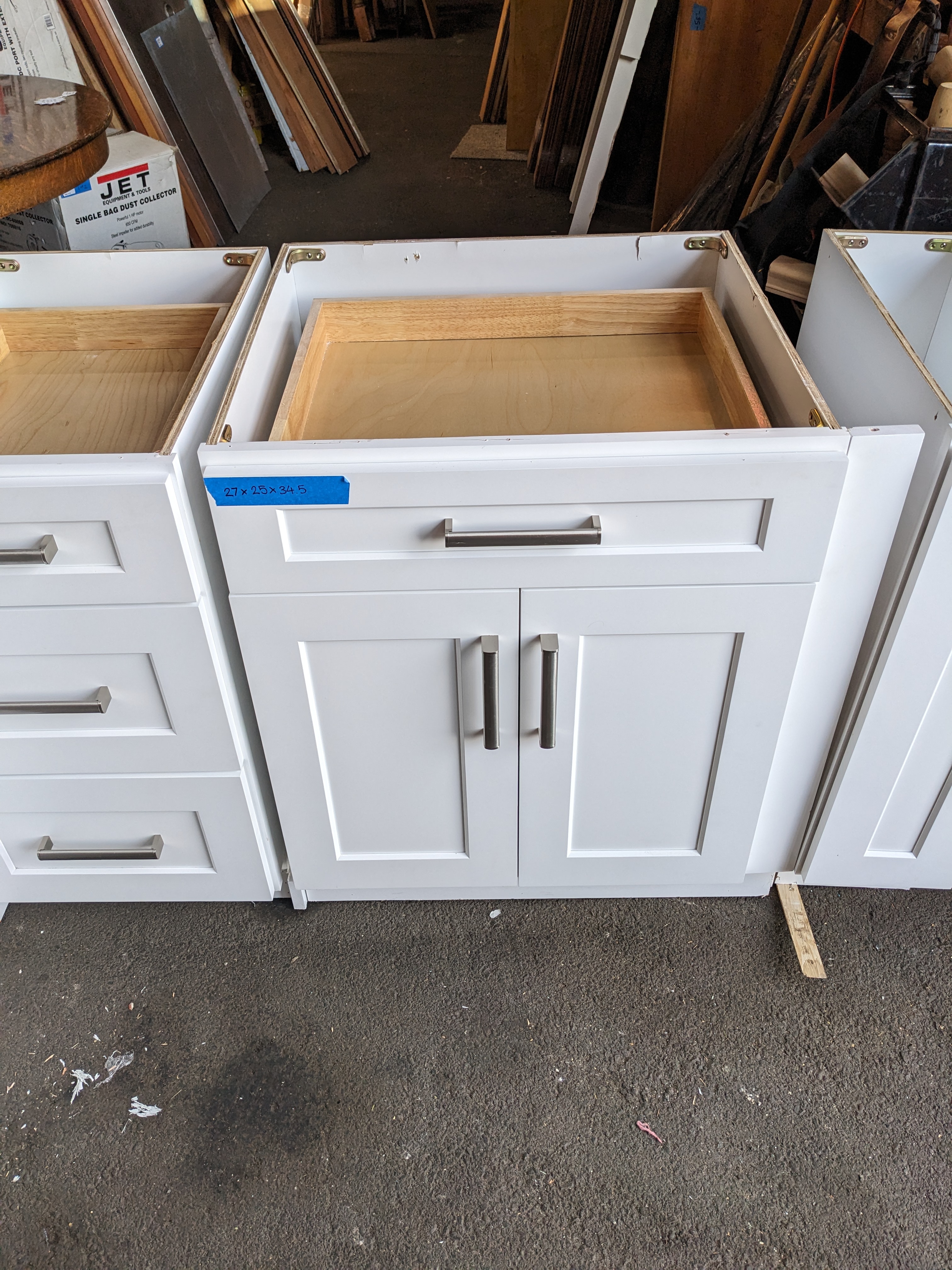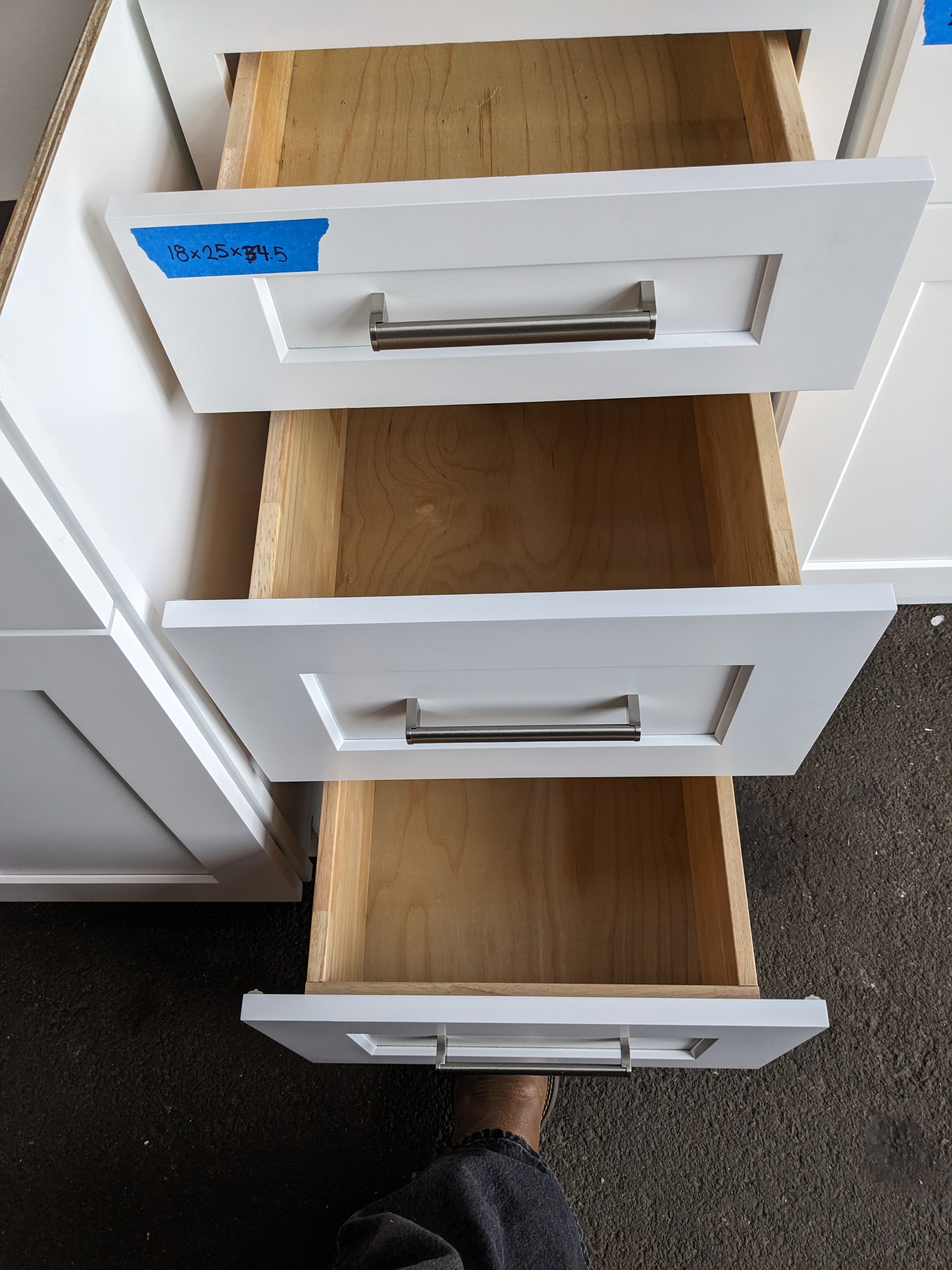 Awesome contemporary white plywood cabinet set finished with stainless steel hardware. It's got everything! Soft close! Dove tails! Clean, and ready take home.