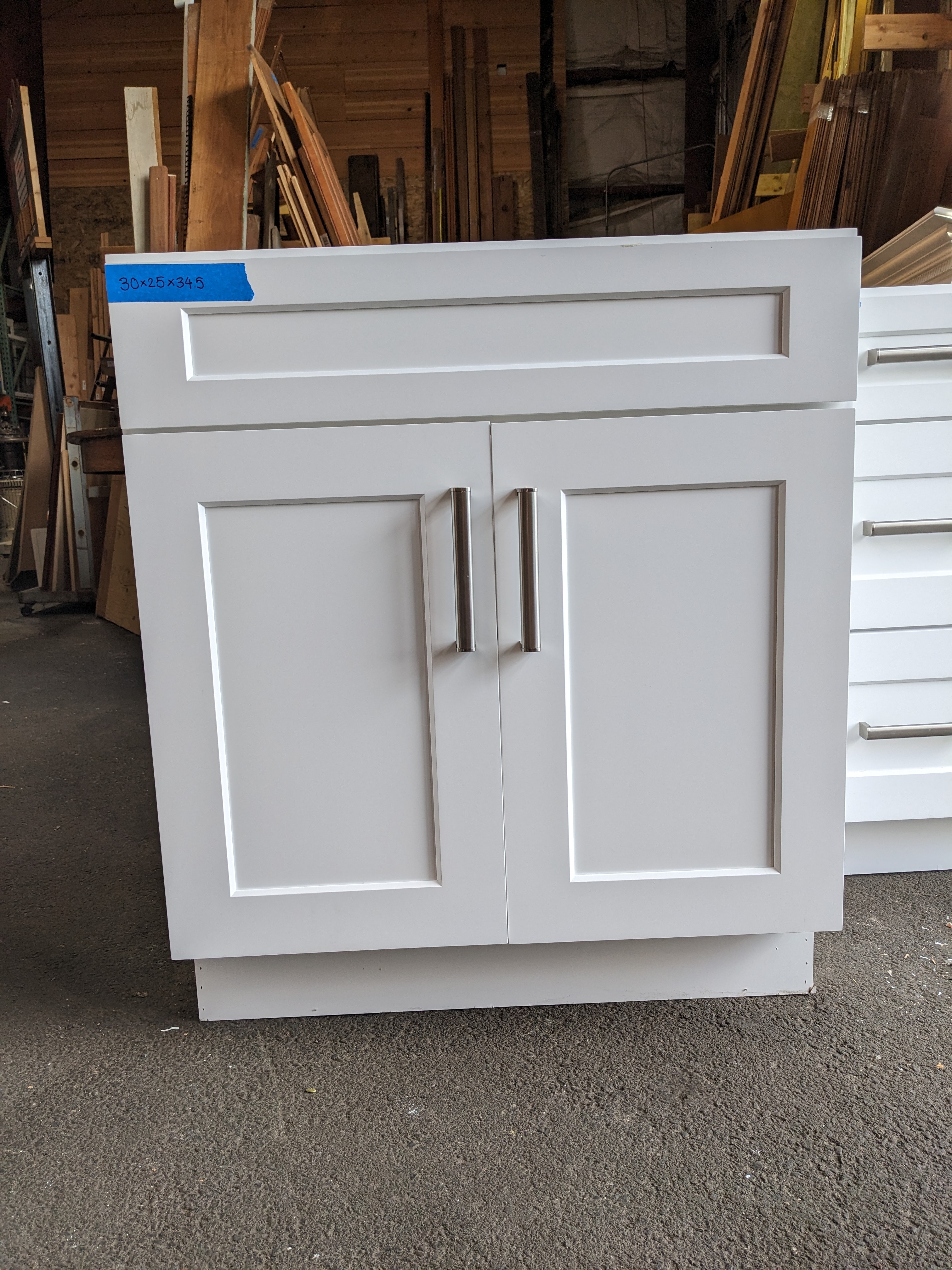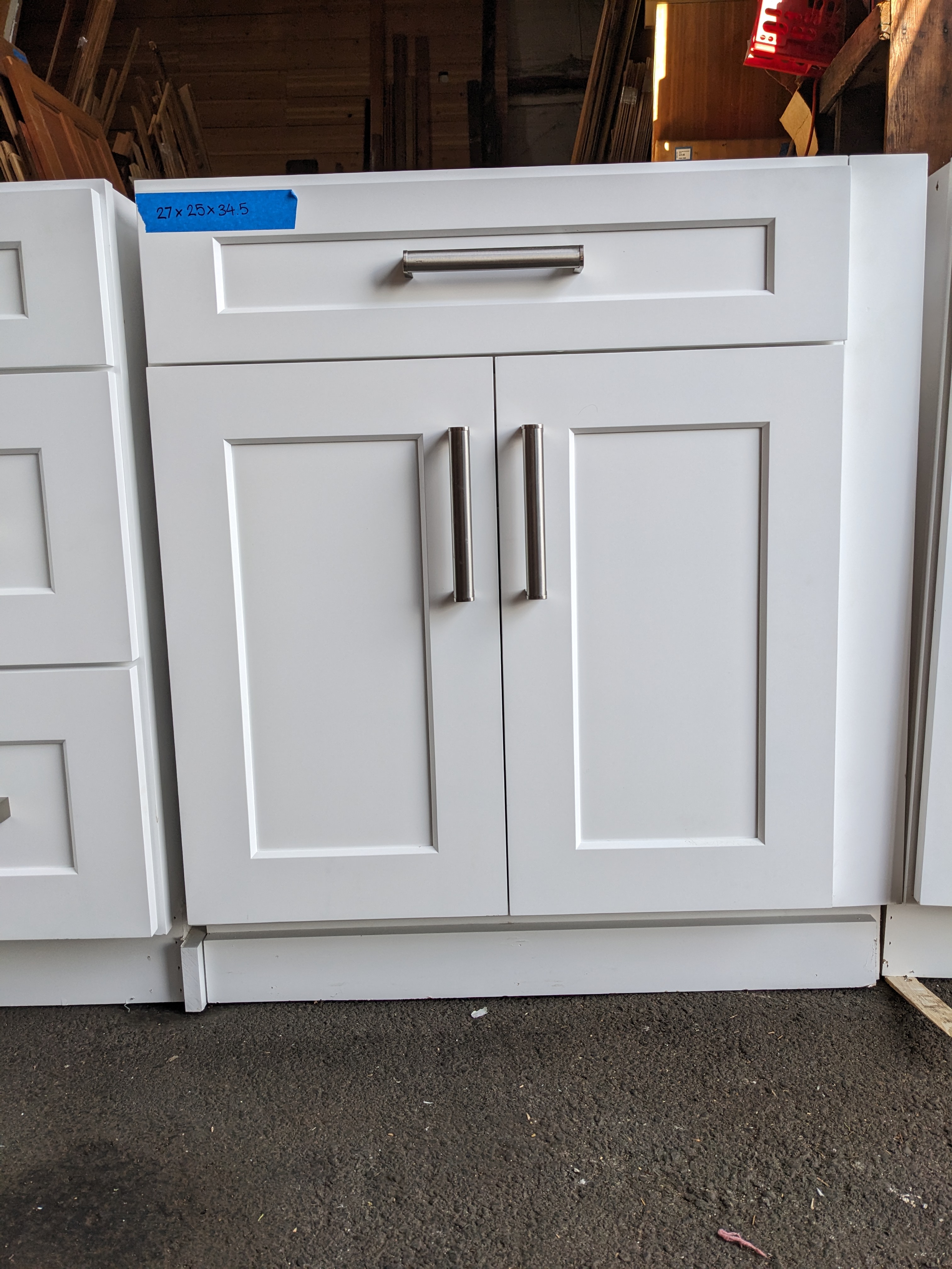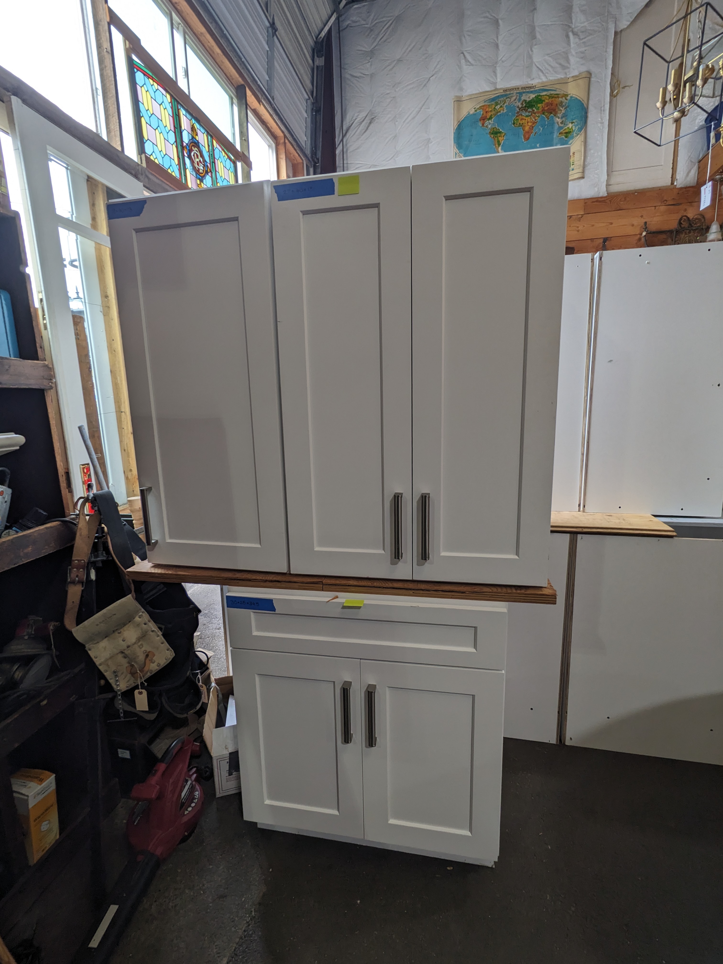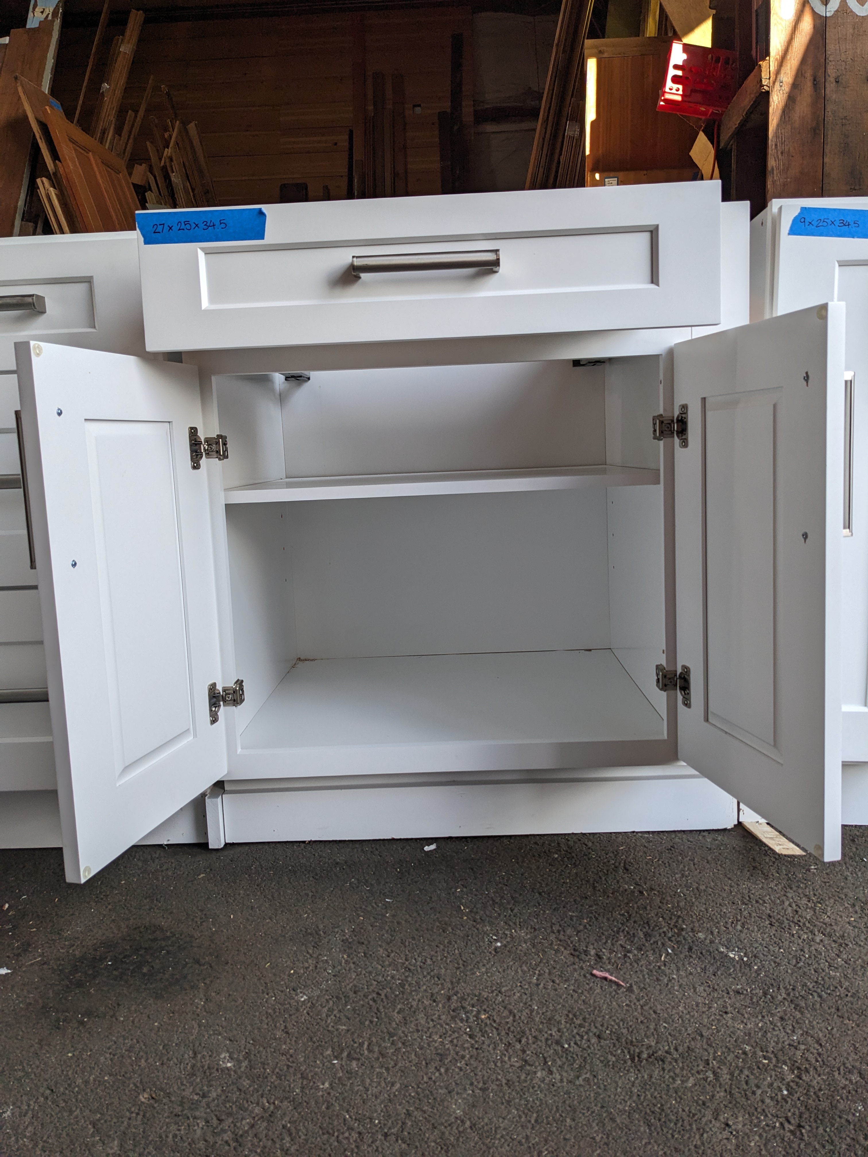 Awesome contemporary white plywood cabinet set finished with stainless steel hardware. It's got everything! Soft close! Dove tails! Clean, and ready take home.