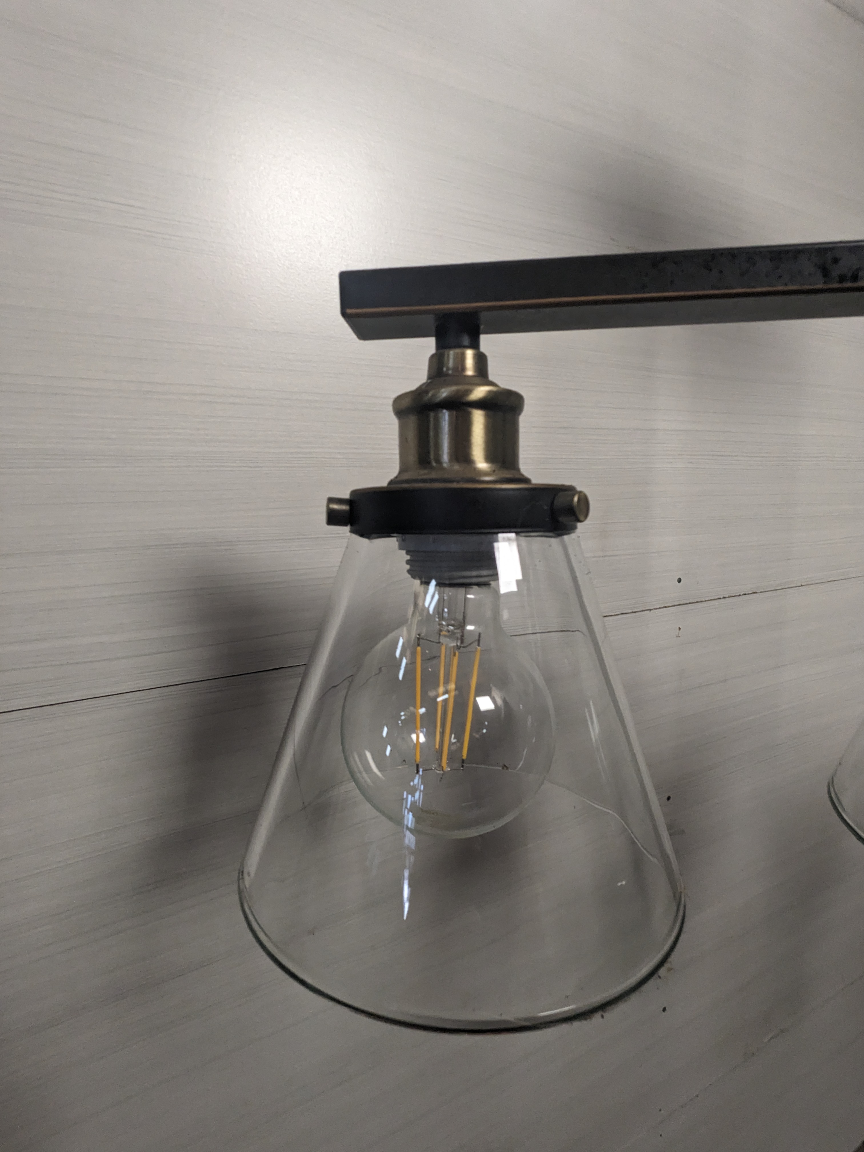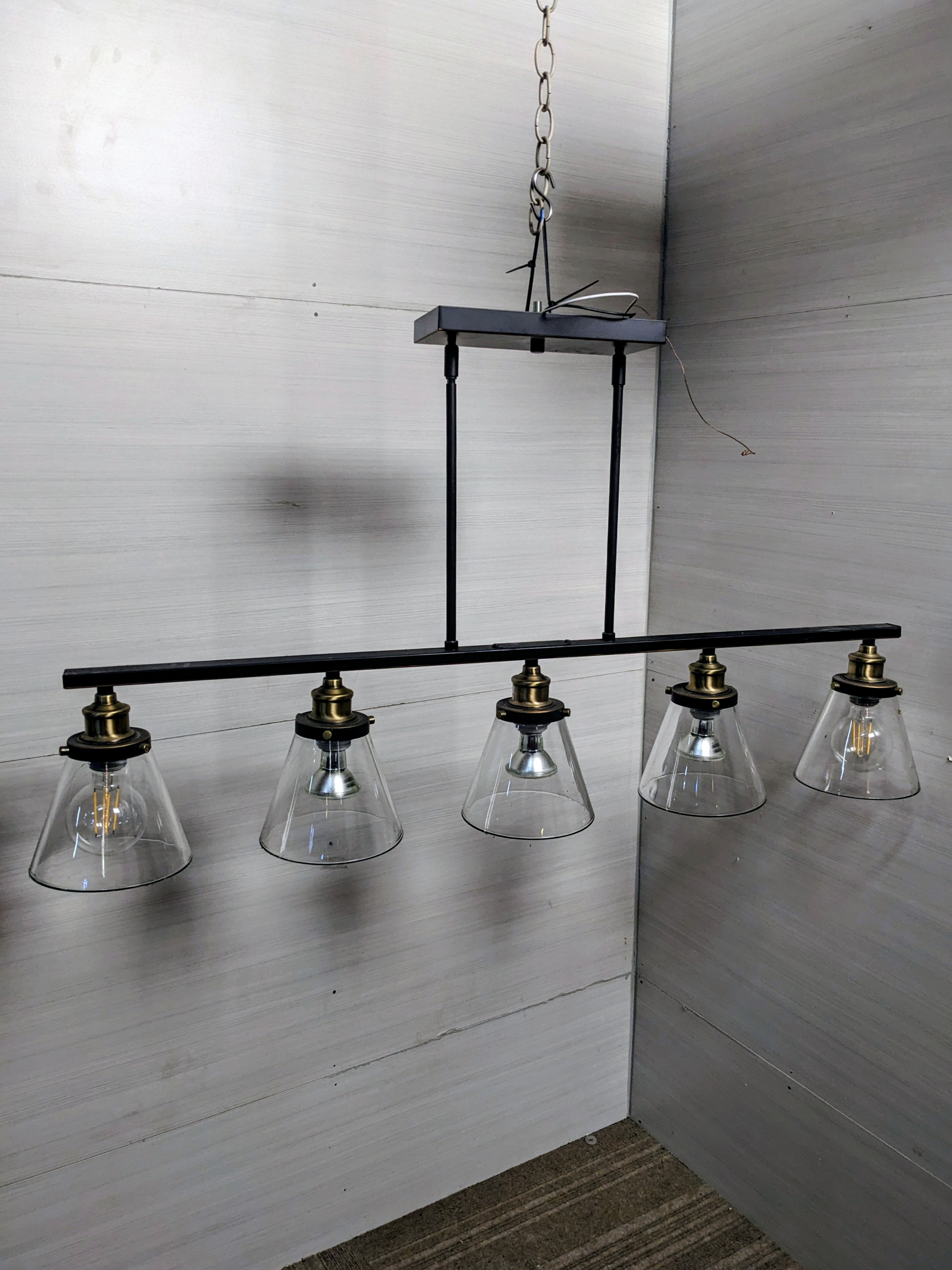 A beautiful and modern chandelier, perfect for above the dining room table. The fitters have a lovely dark brass finish flanked by matte black framing. This piece is sure to sing. In good condition, modern wiring.