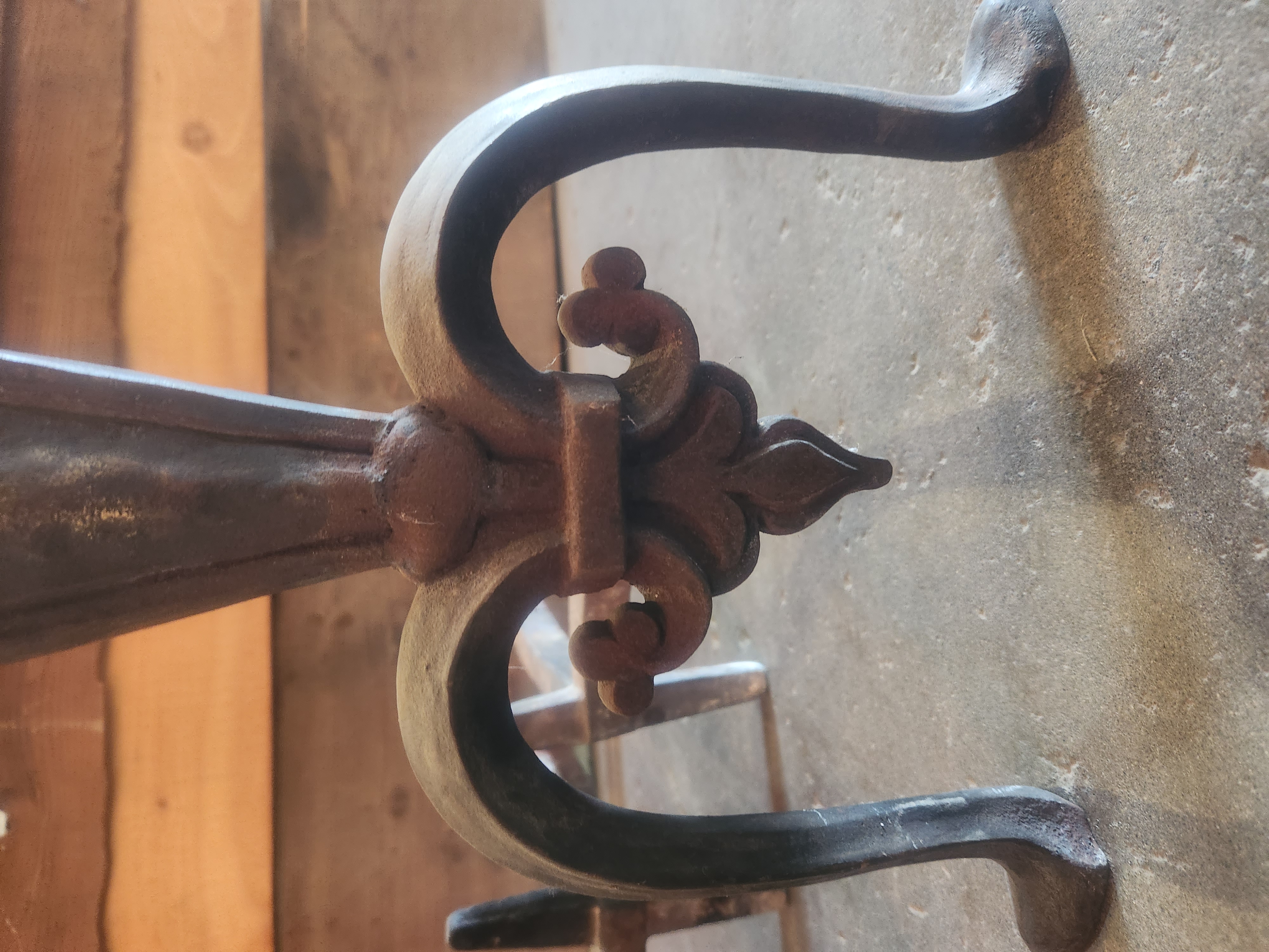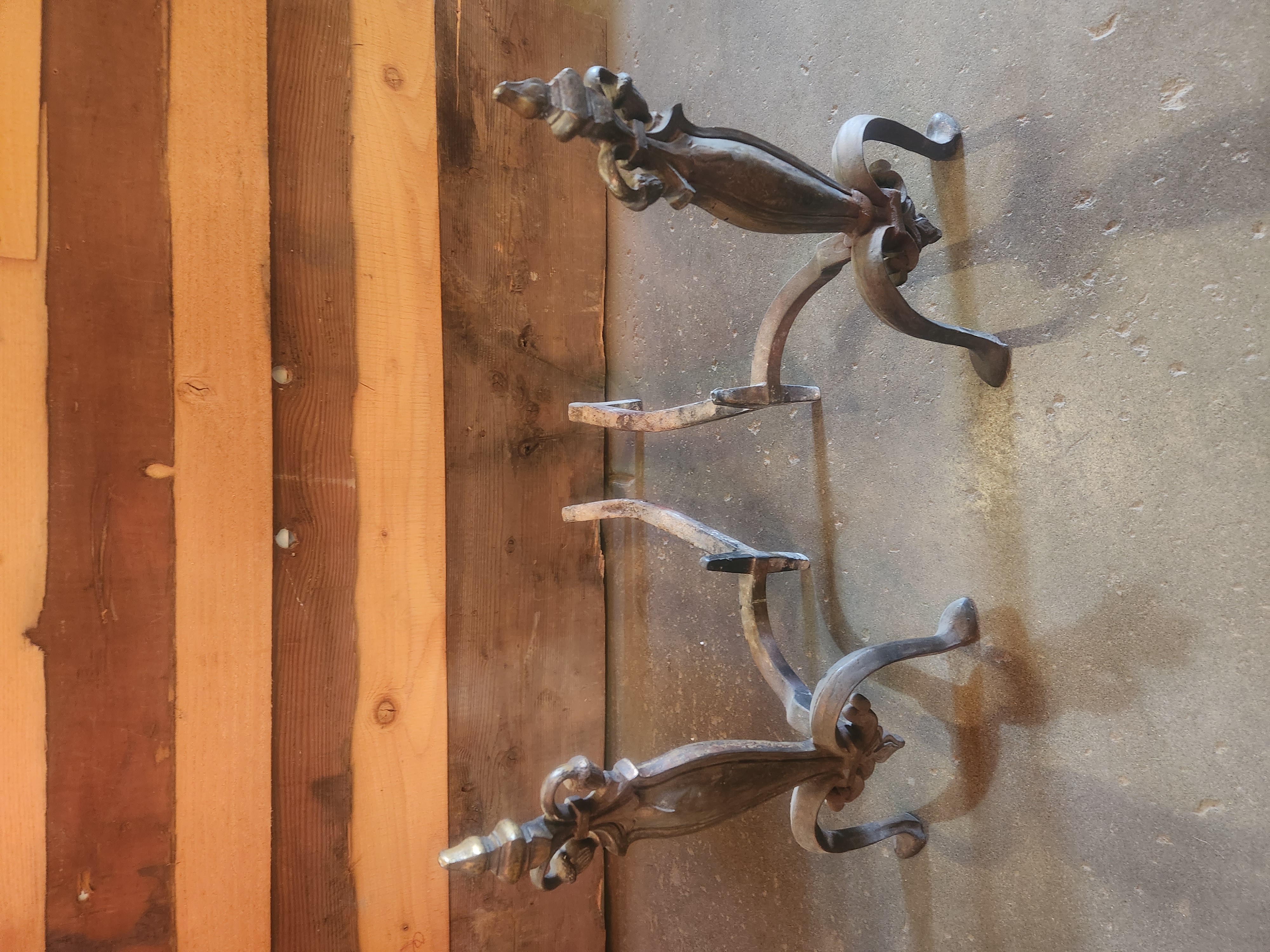 A pair of vintage andirons with fleur de lis and acorn motifs. They both have some patina to them, but will be a great addition to your fireplace.