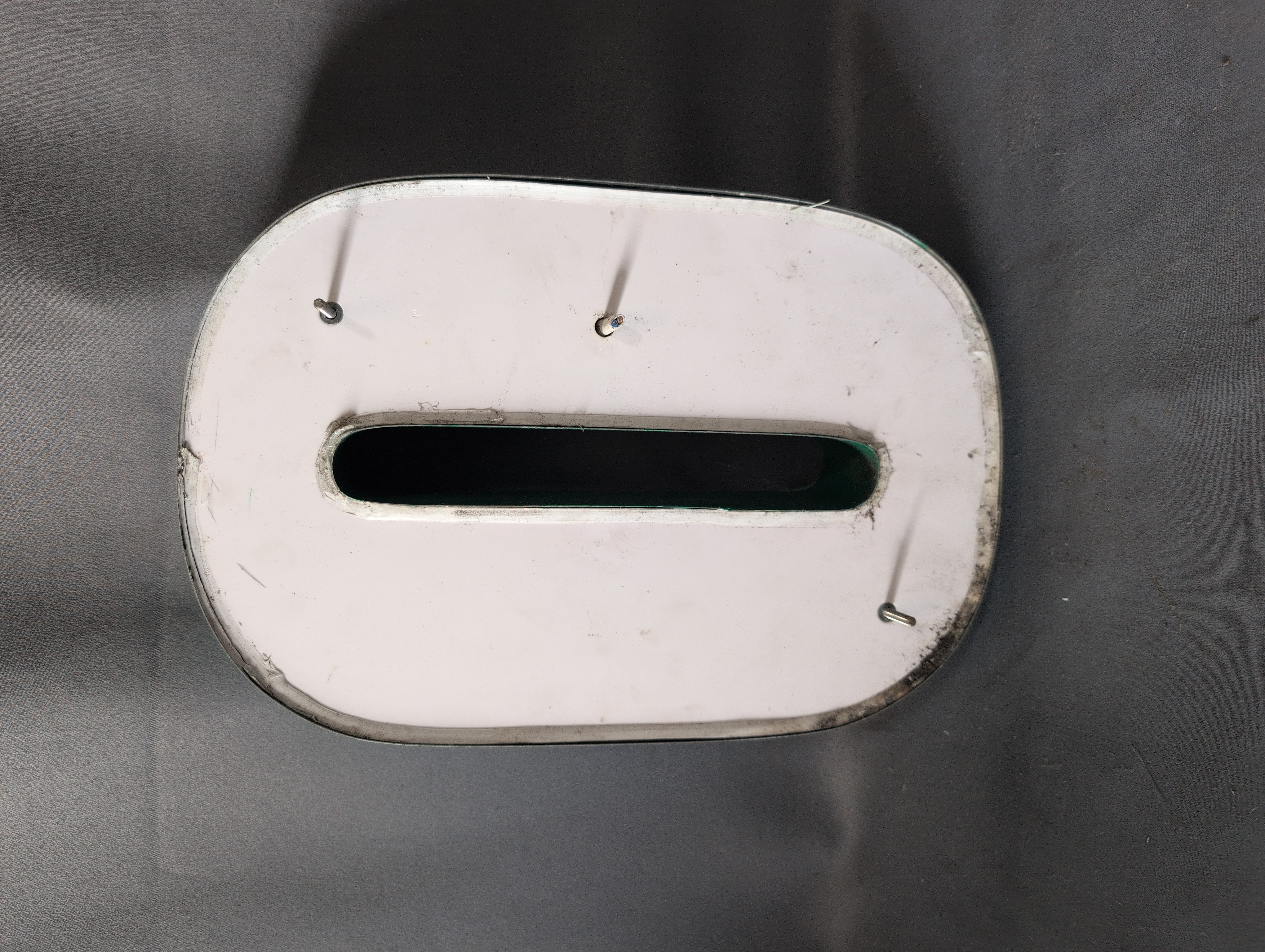 Recycled commercial sign letter. Metal frame with a plastic infill. Wired for lighting, but has not been tested. Mounting hardware still attached. 8.5 x 12.5