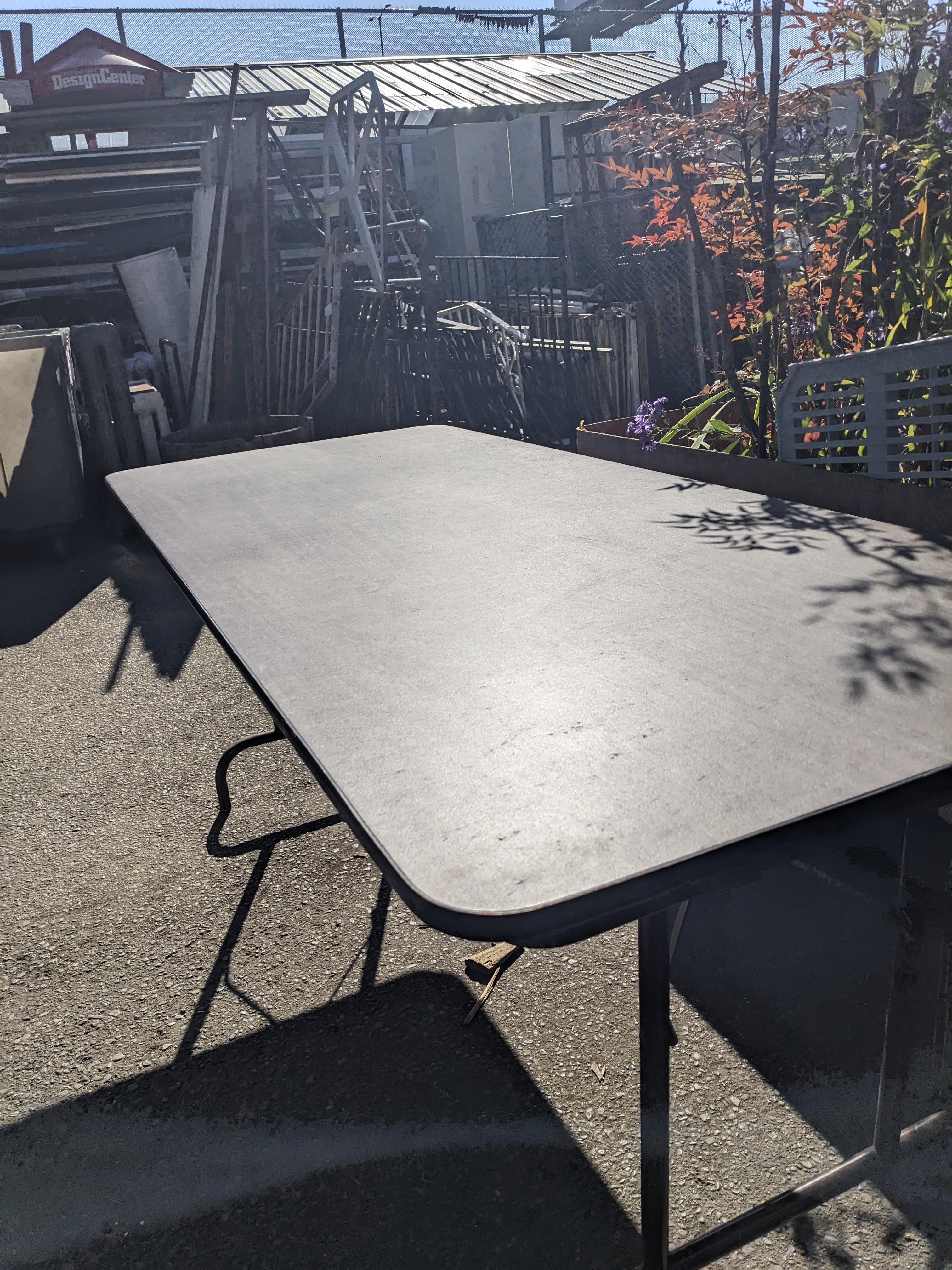 This table measures 72 x 29 x 30.125. It is in good condition with limited and minor scuffing. It has a wood patterned top and is very sturdy. These retail new for over $150 so this is a steal!