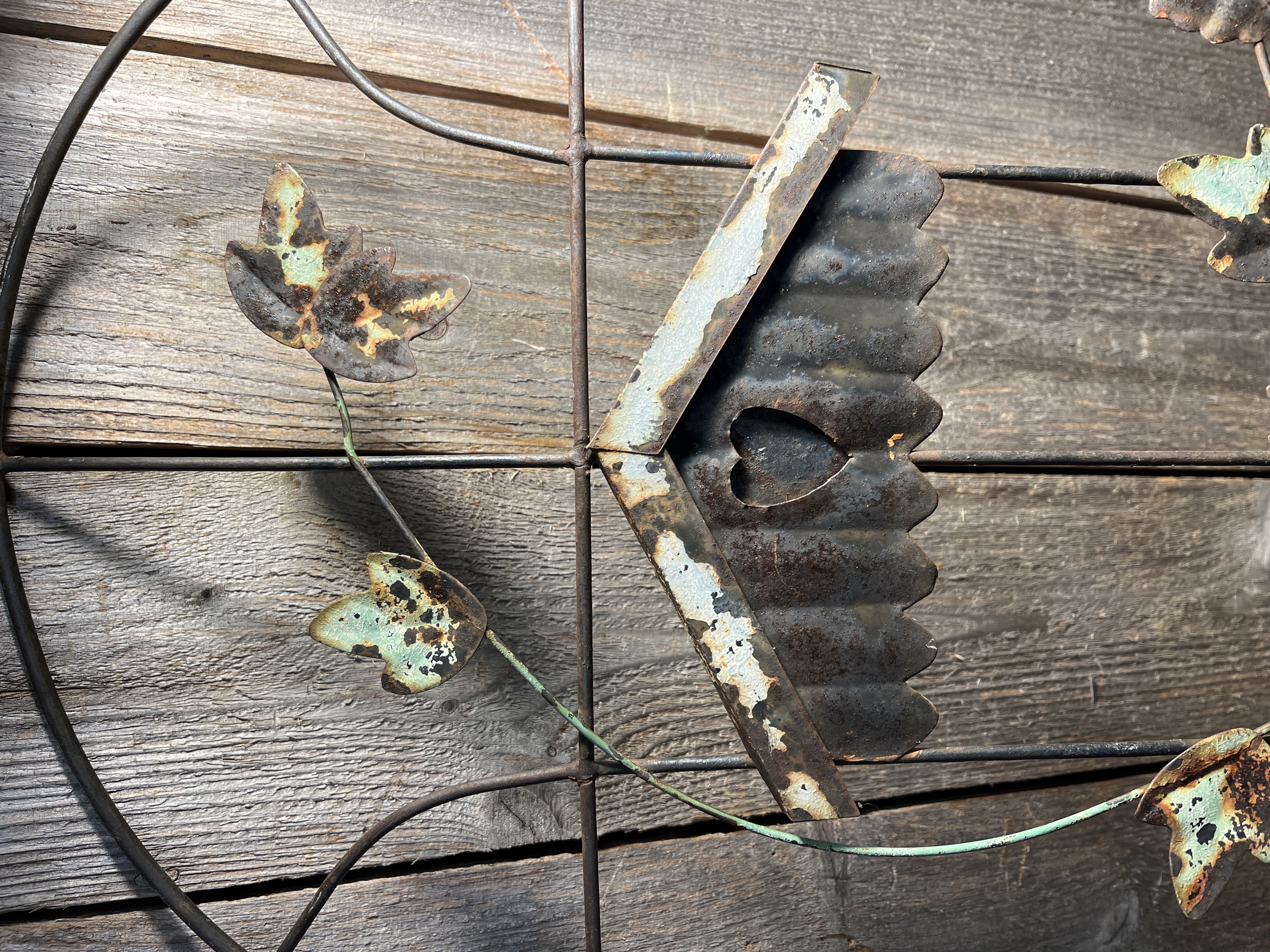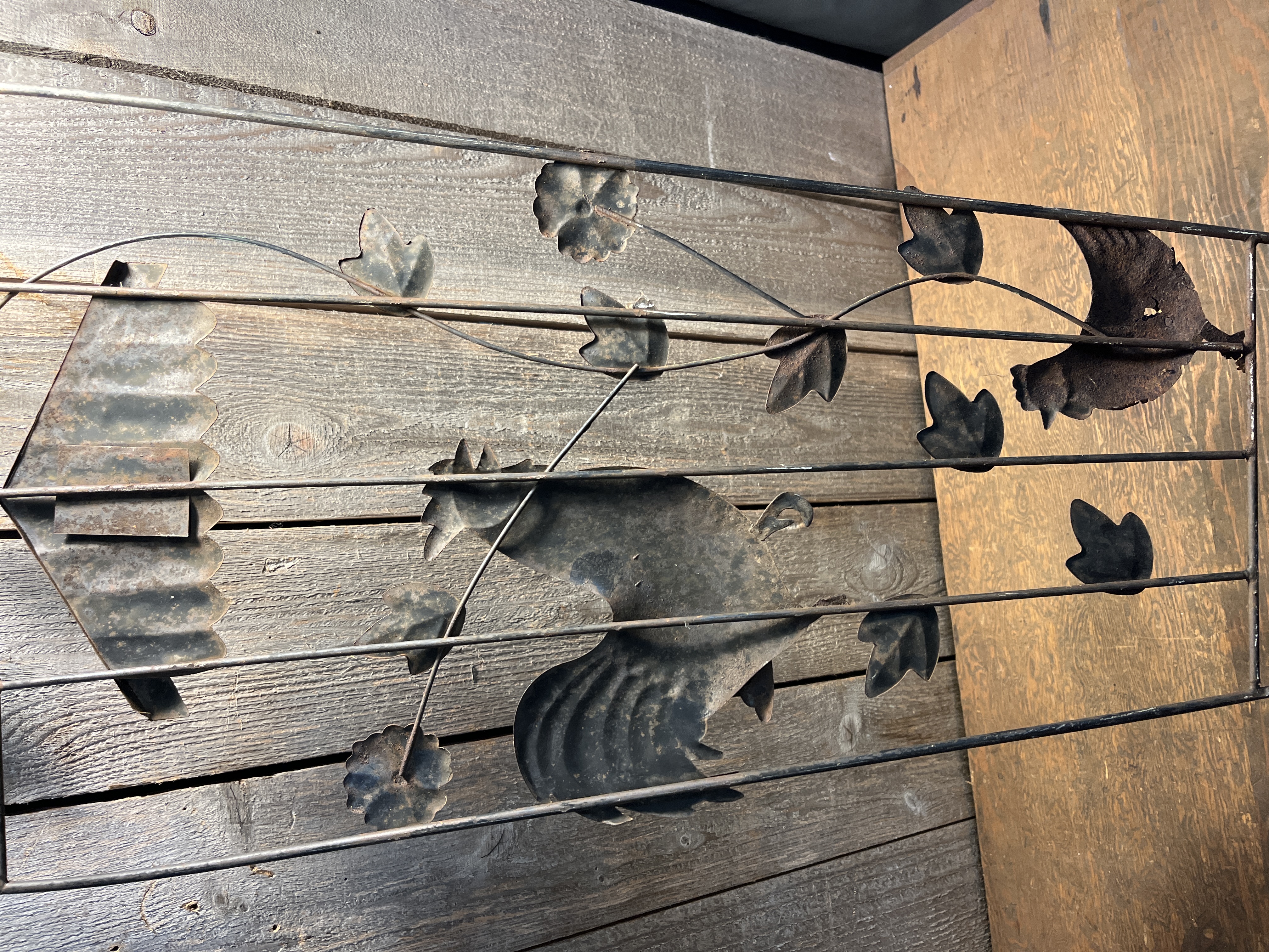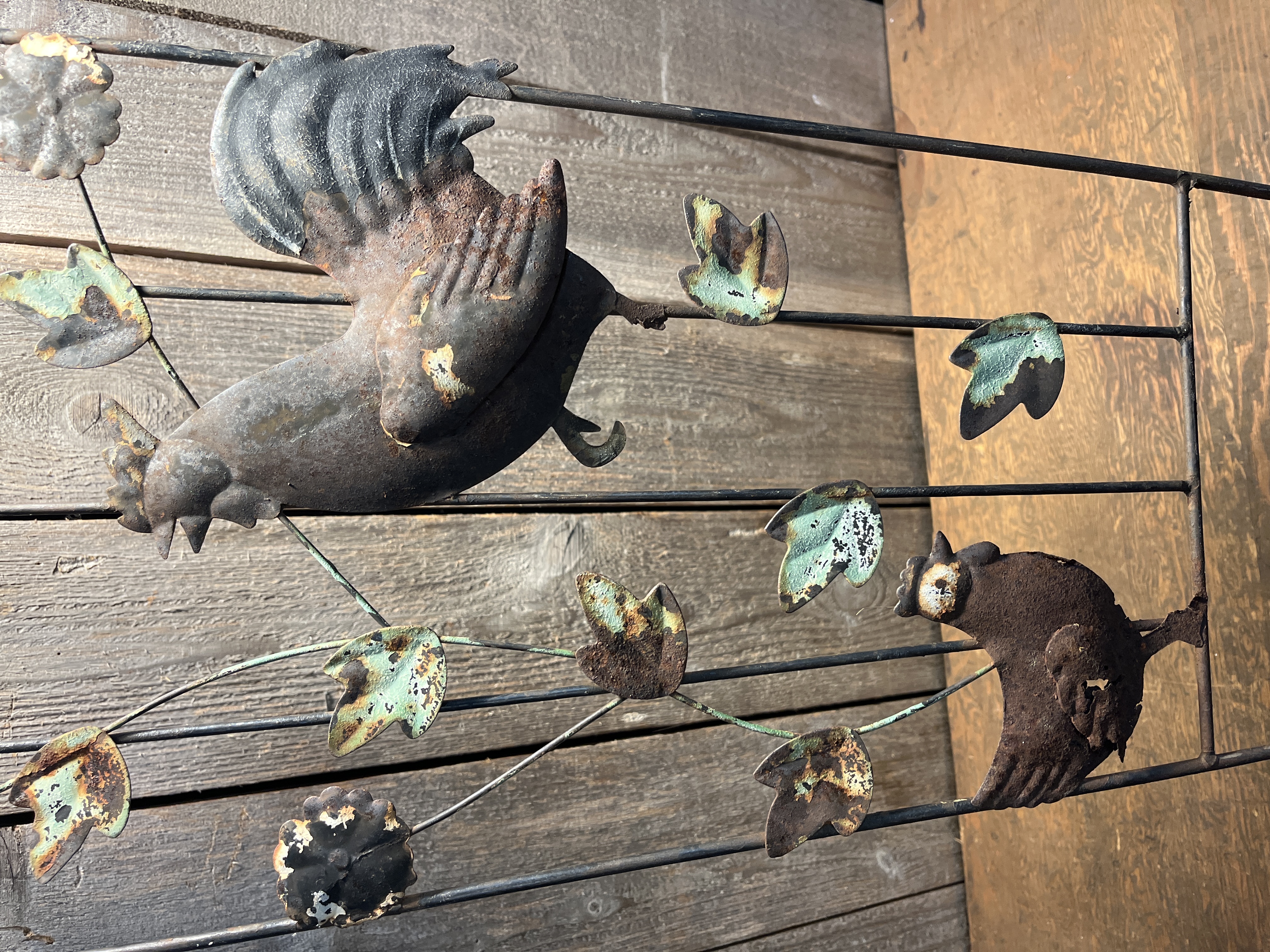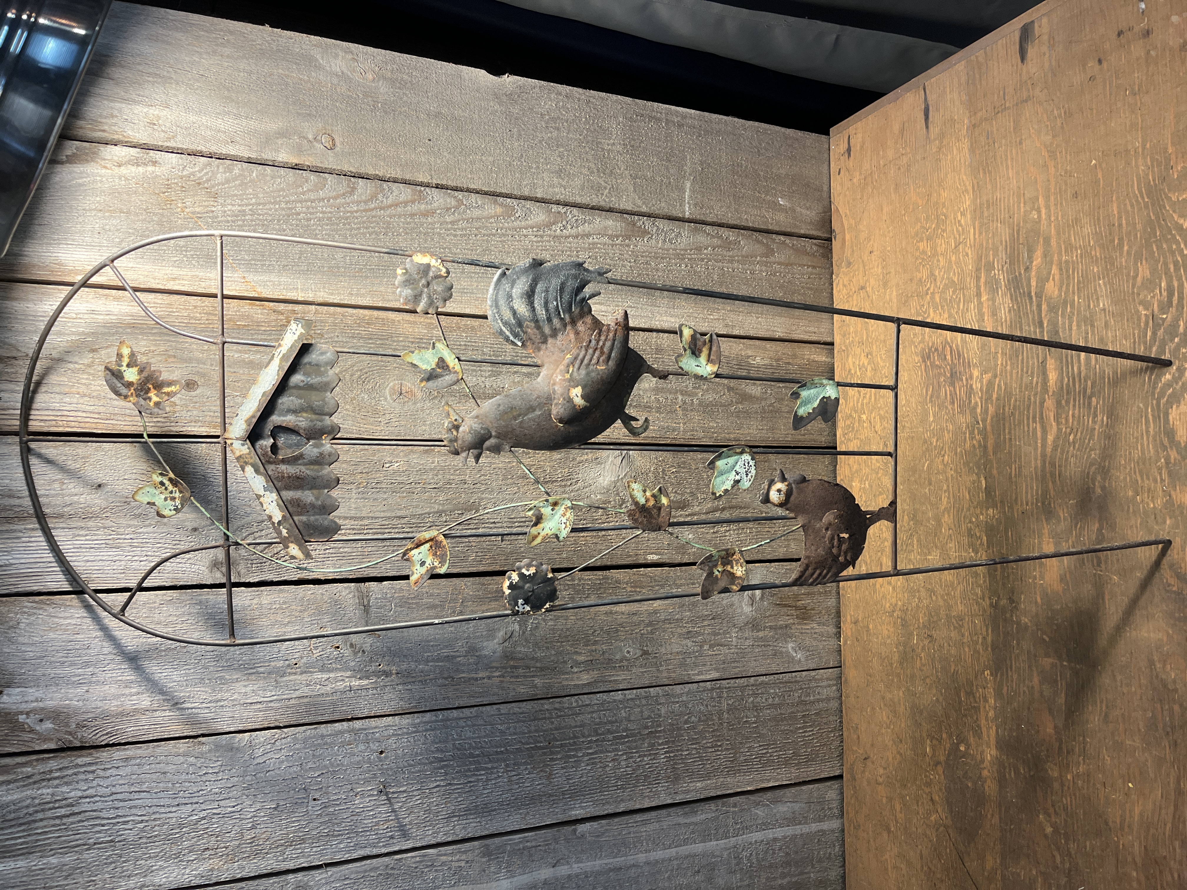 A super cute chicken themed trellis that has that good ol natural patina. A perfect addition to your garden! Measures 13.25 x 36 inches.