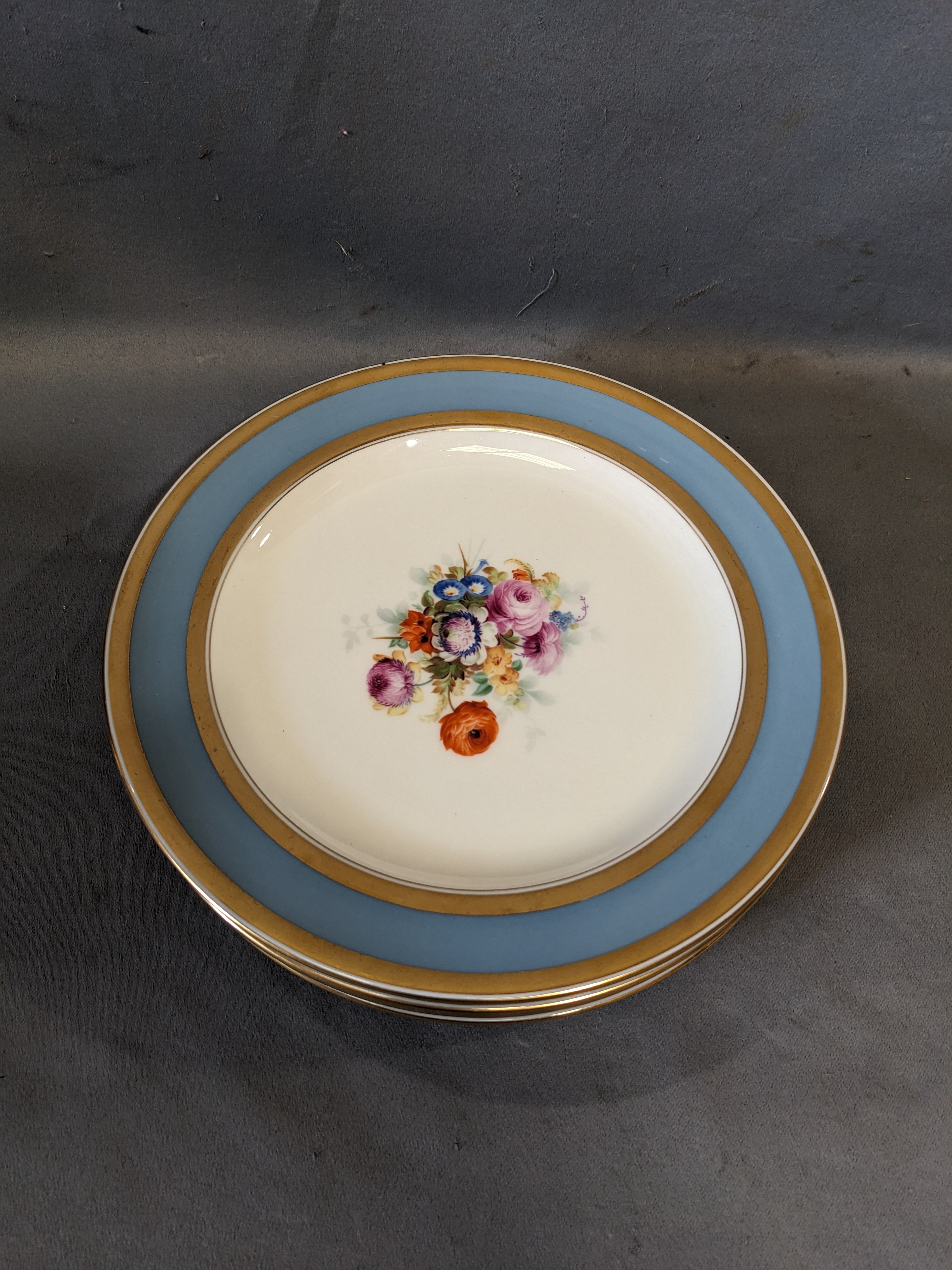 9 Inch Plates with blue and gold rim and floral element in the middle. Price is per plate.