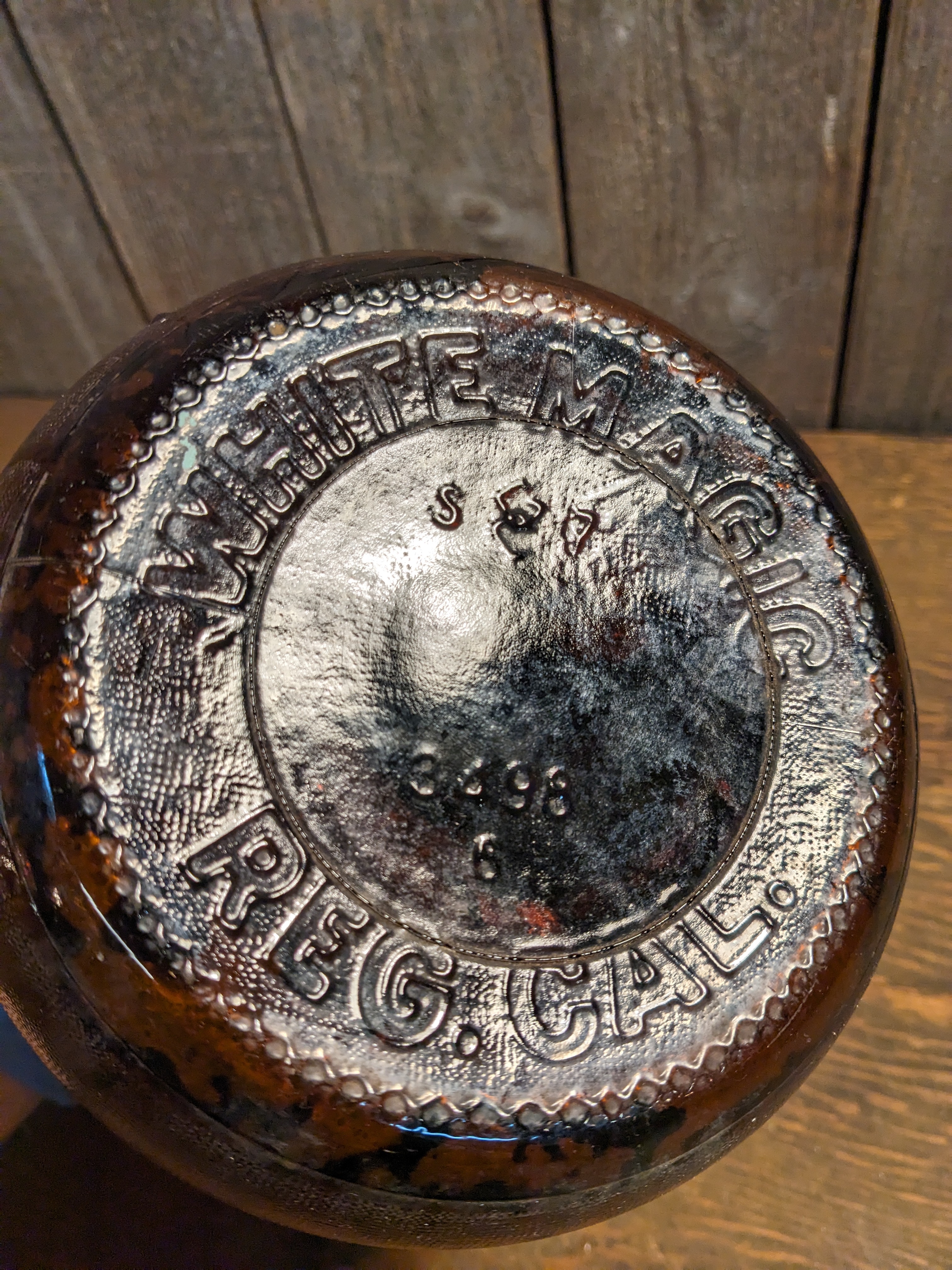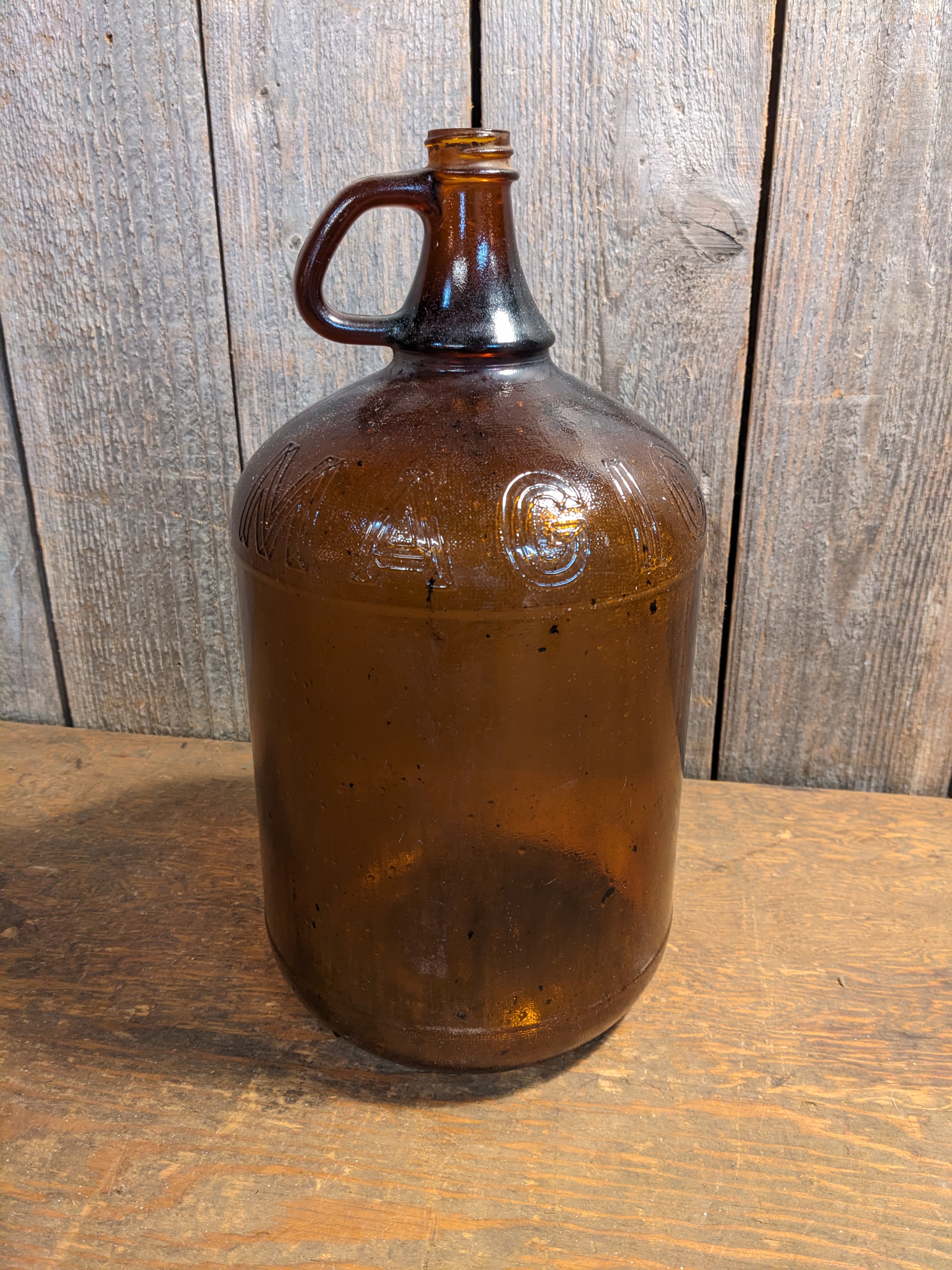 A brown glass jug with the words WHITE MAGIC embossed around the top. This jug was once used to hold bleach, and has since been used for other things. It just needs a quick cleaning on the inside. It measures roughly 6.5 x 12.25 inches.