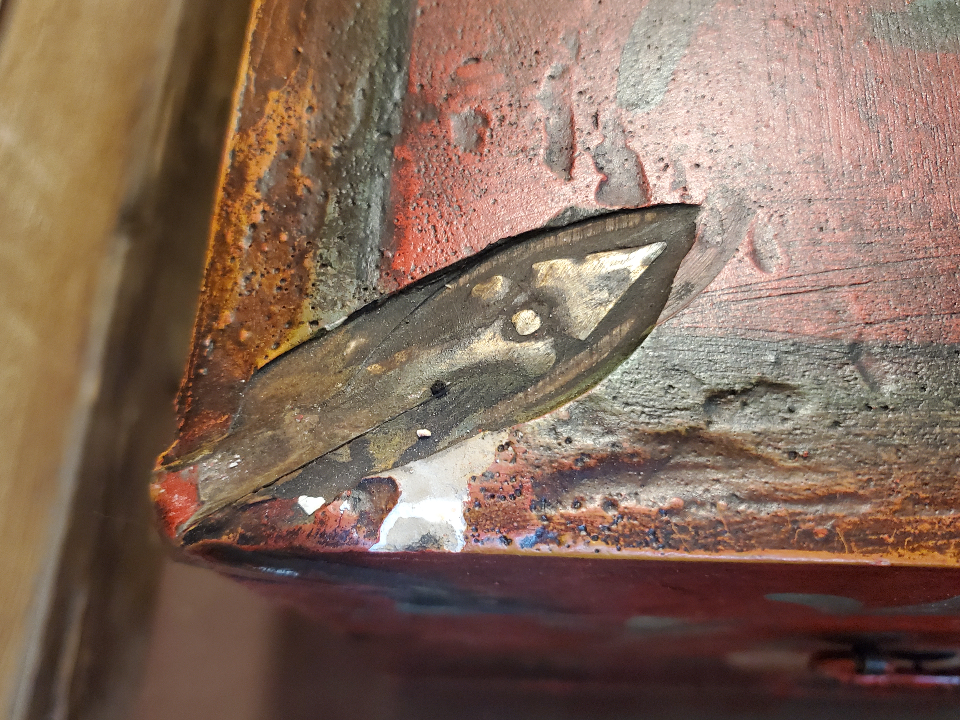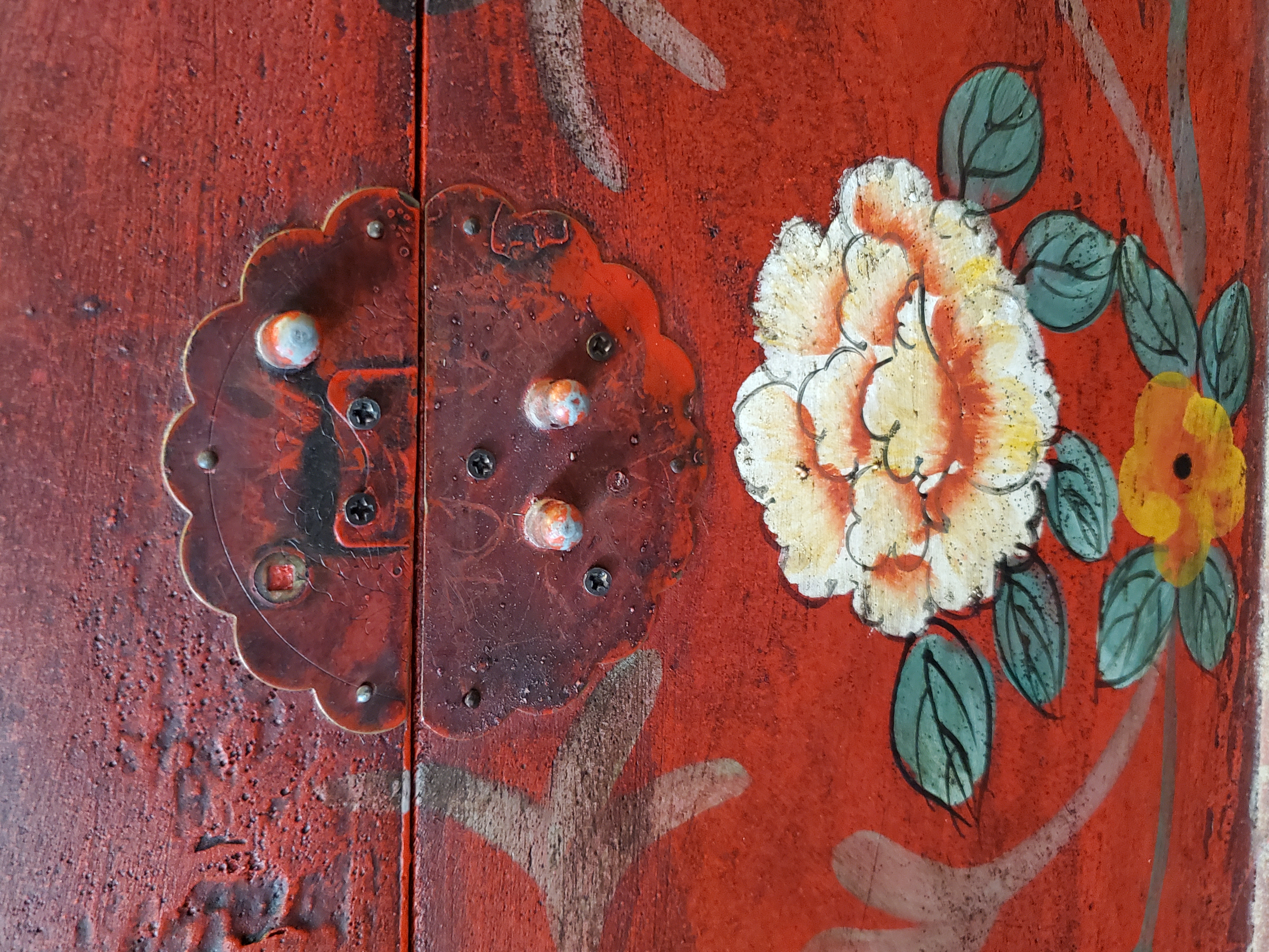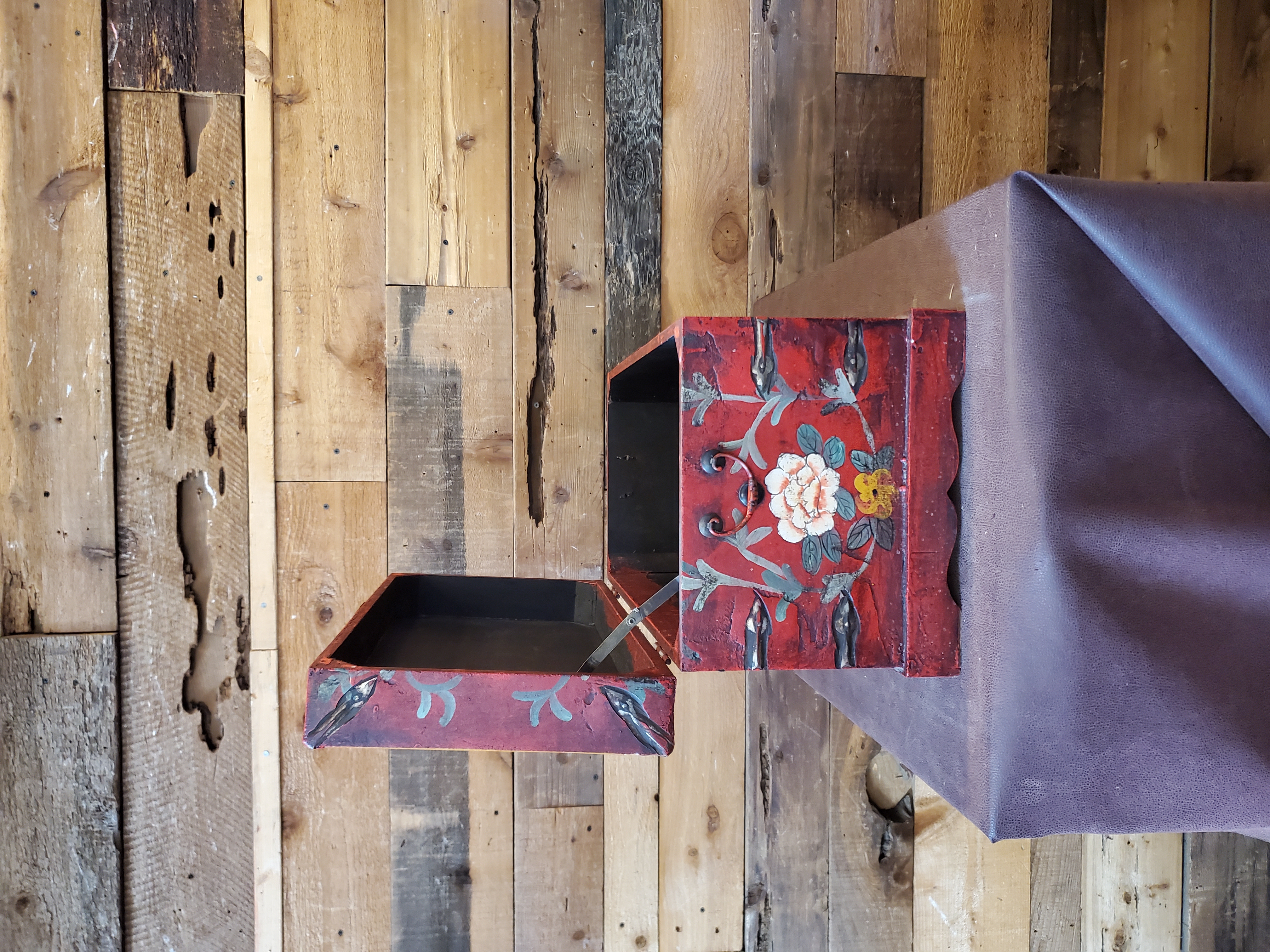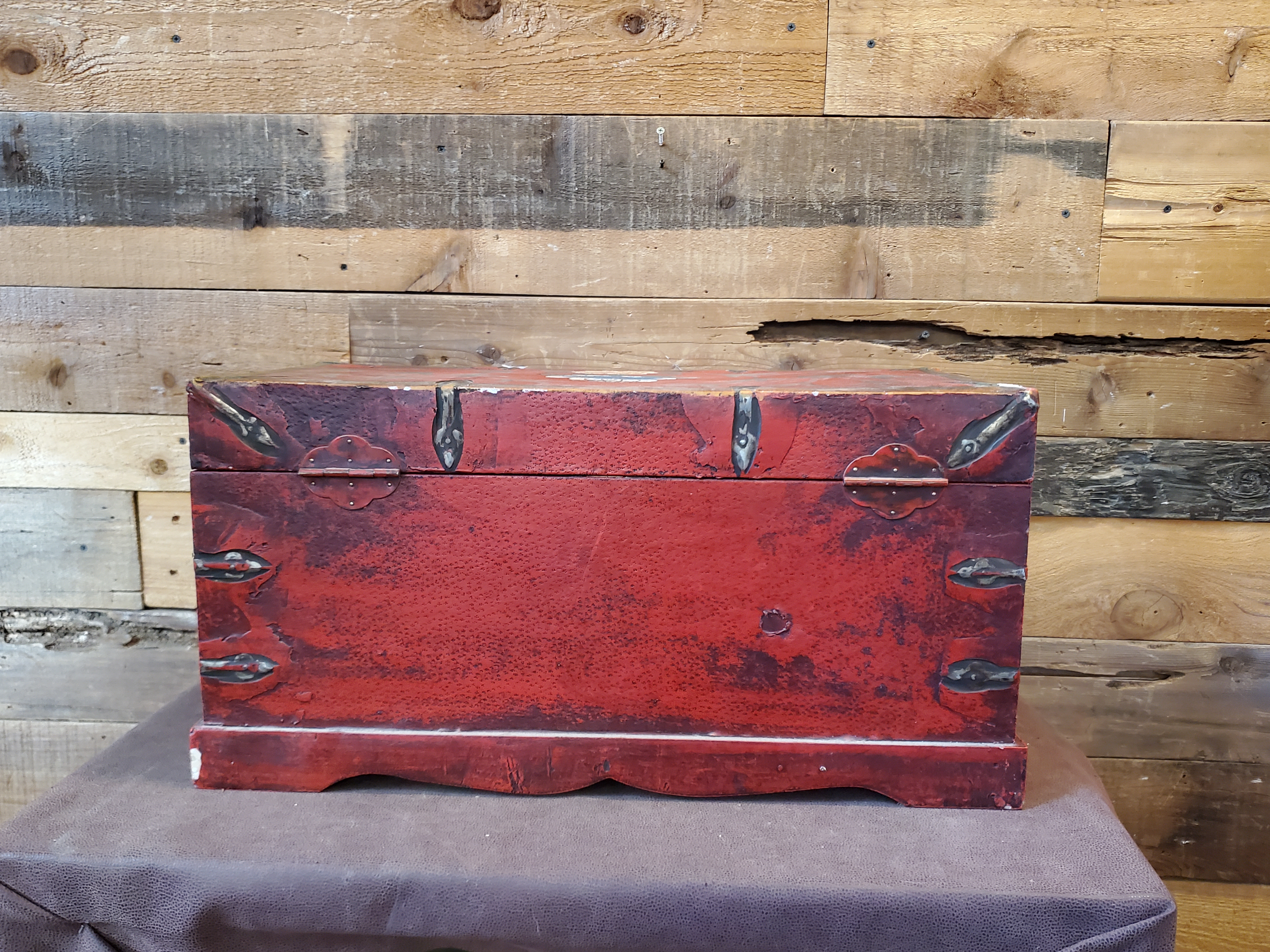 Vintage style red hinged wooden box. Lovely Chrysanthemum design Slight damage as pictured. Missing part of front latch hardware. Dimensions: 23 X 11.5 X 12