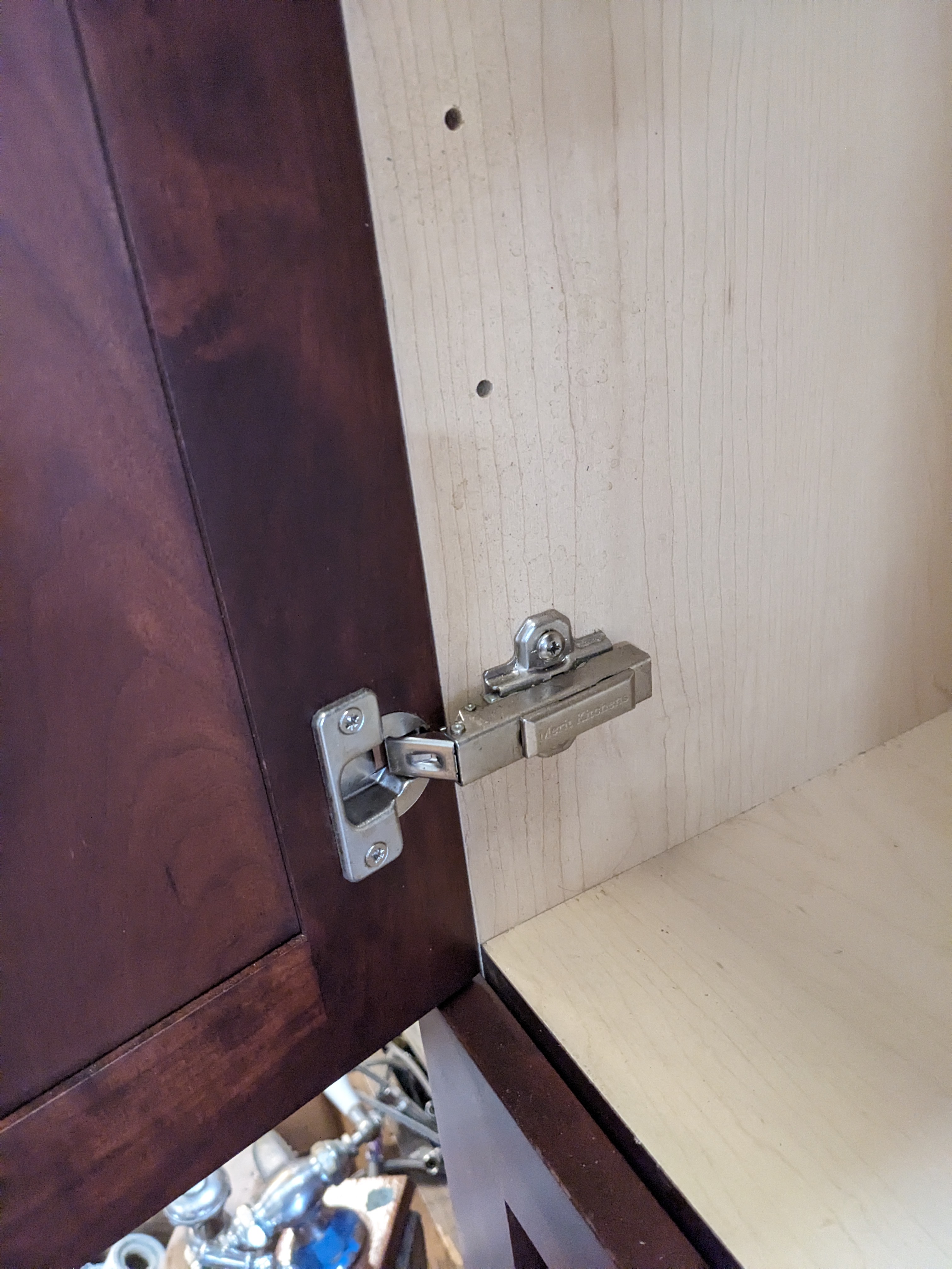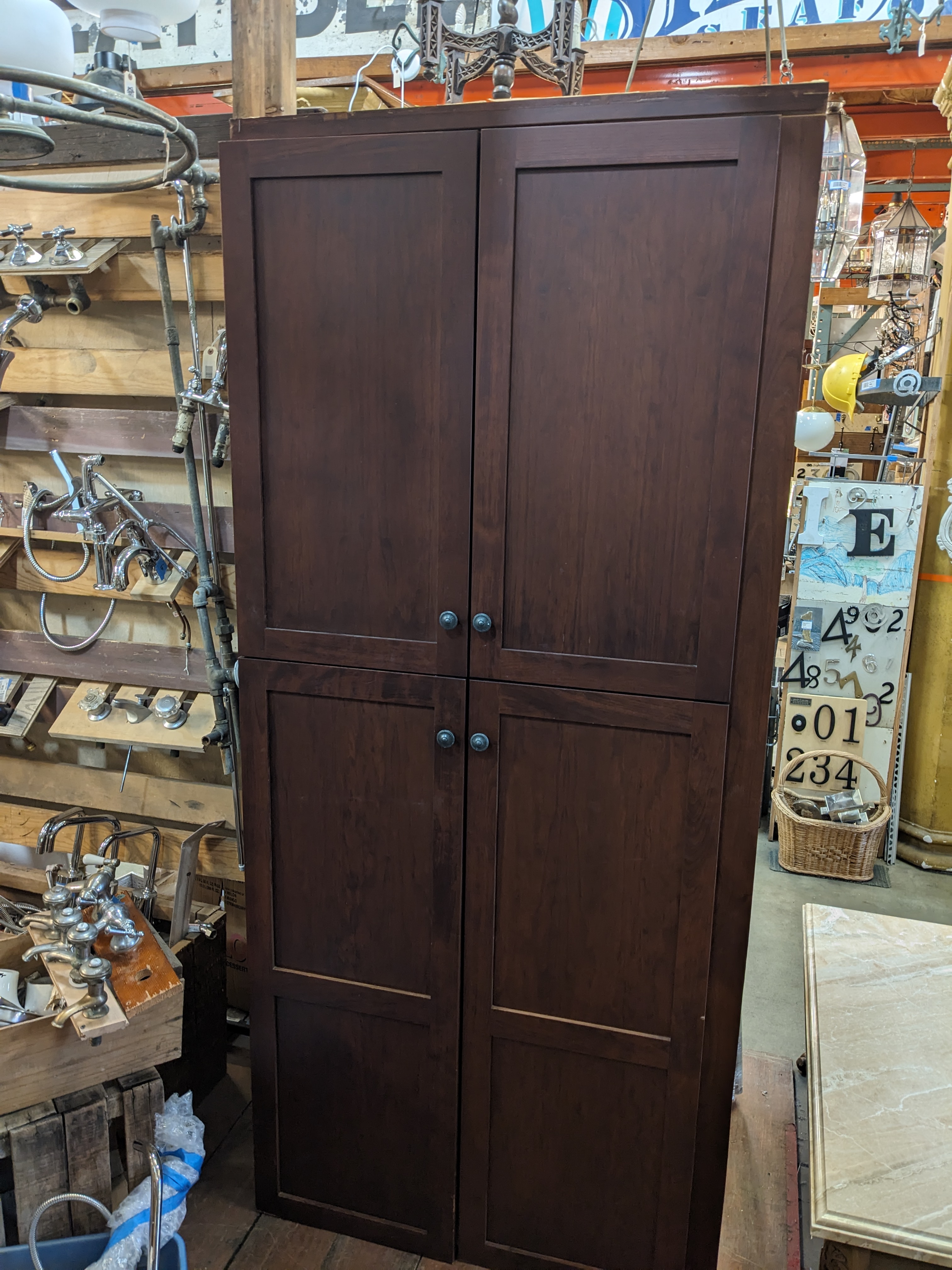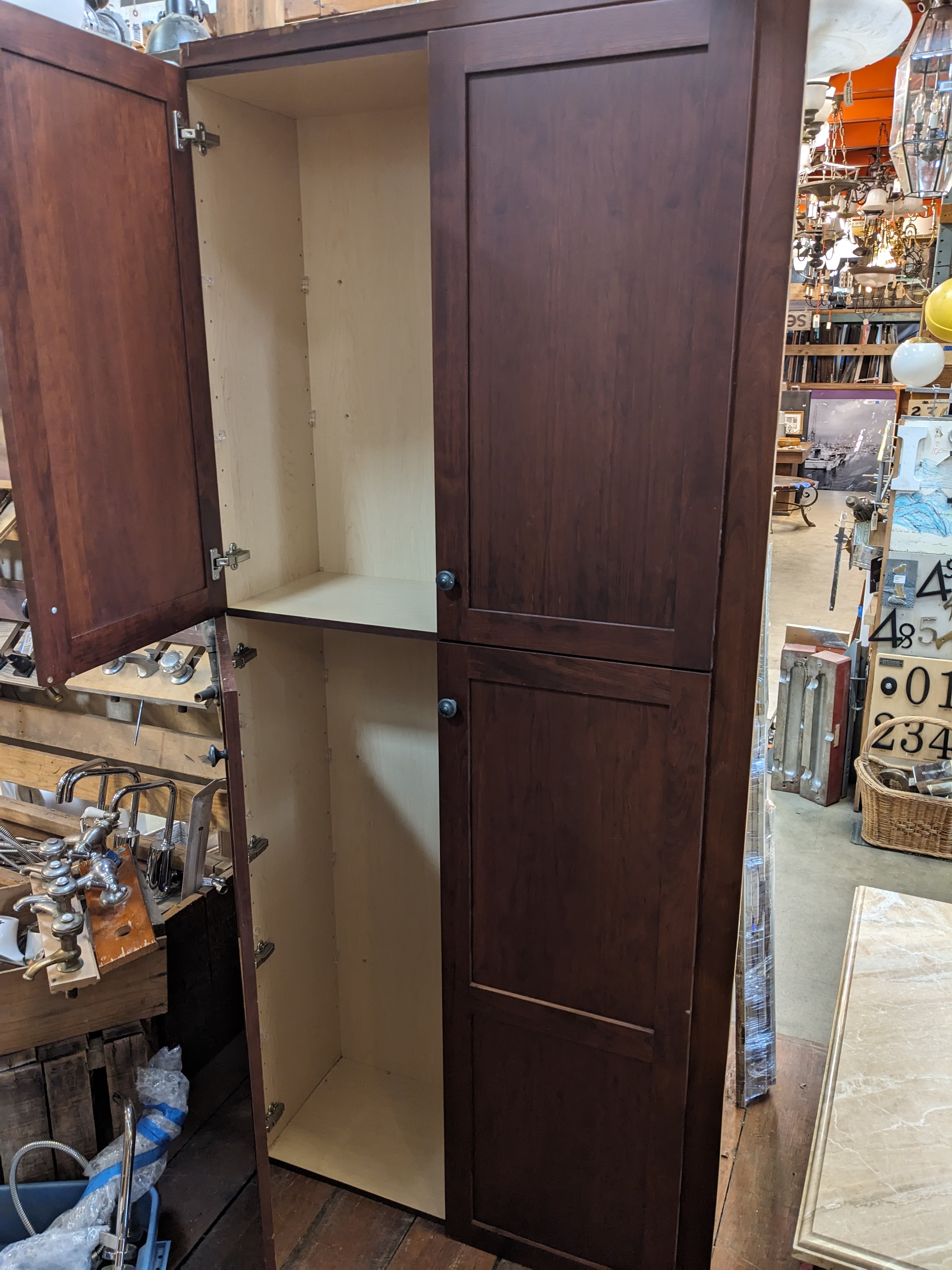 Particle board pantry cabinet with a cherry veneer. Does not come with shelves.