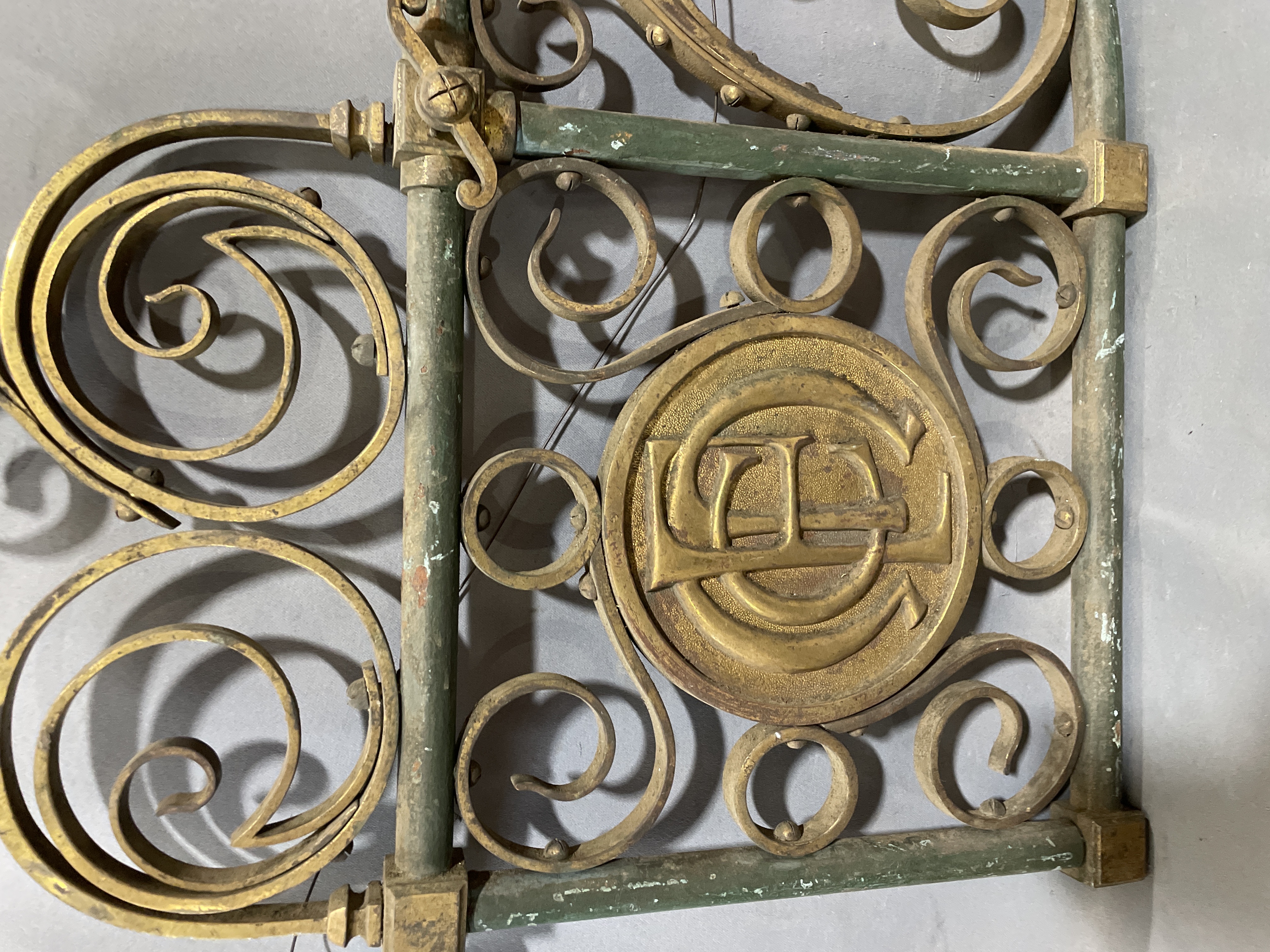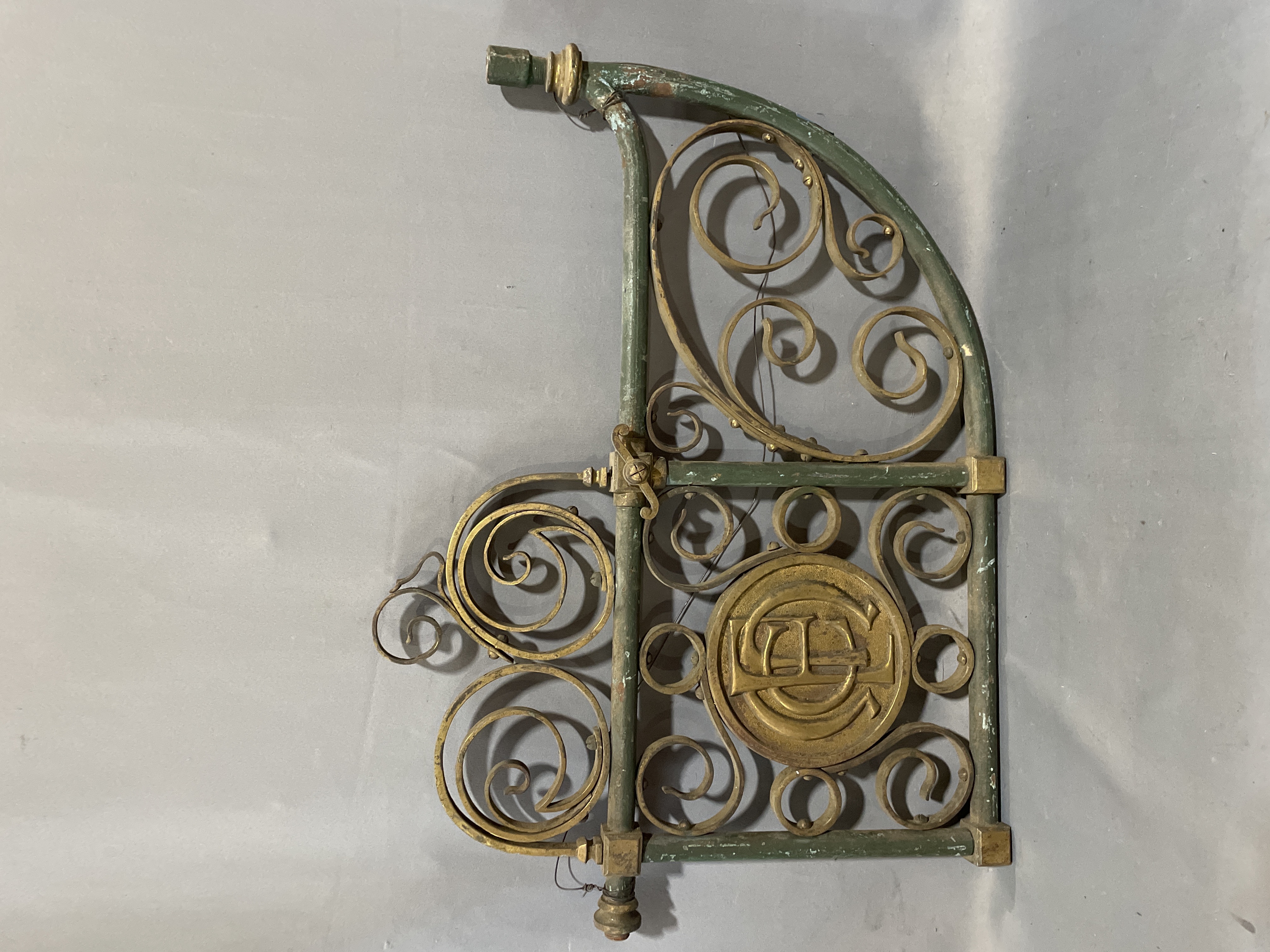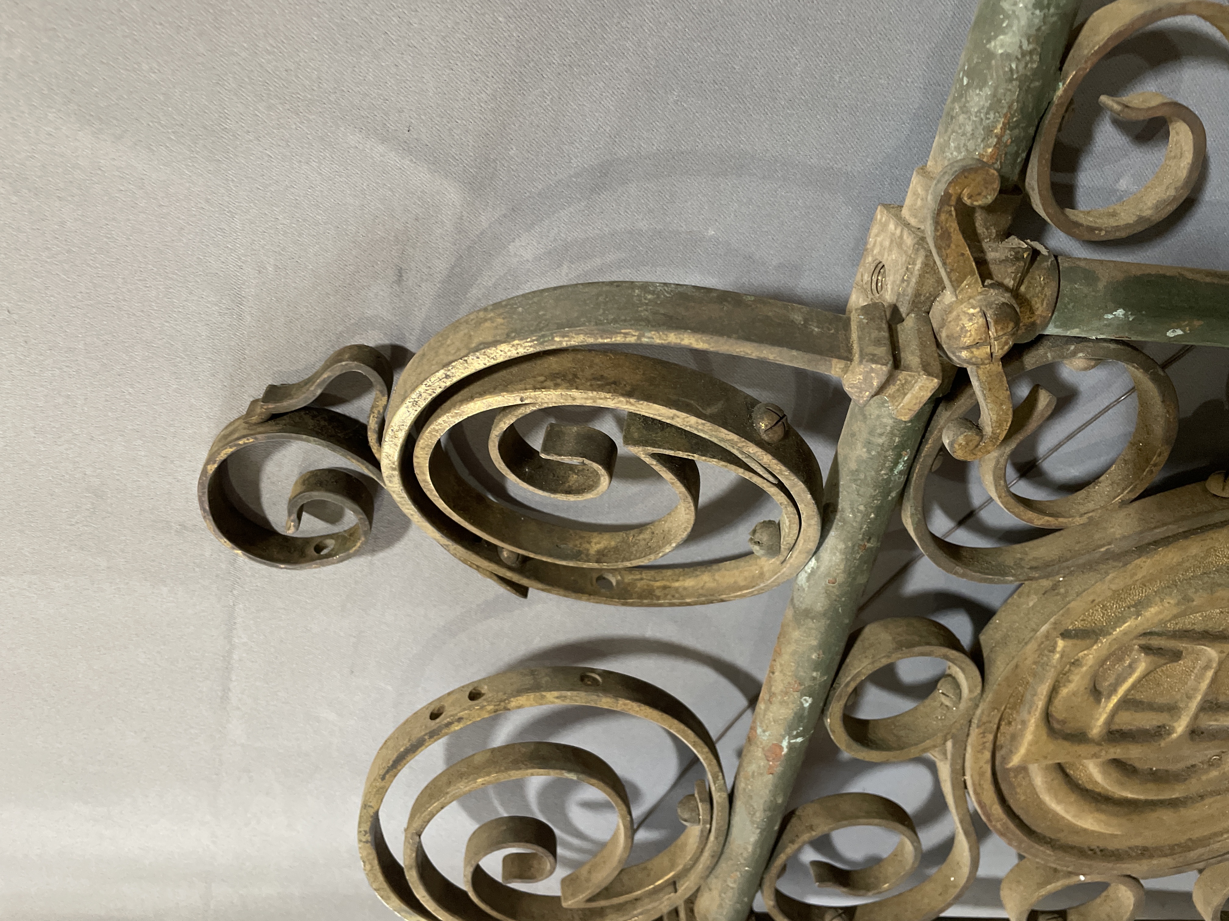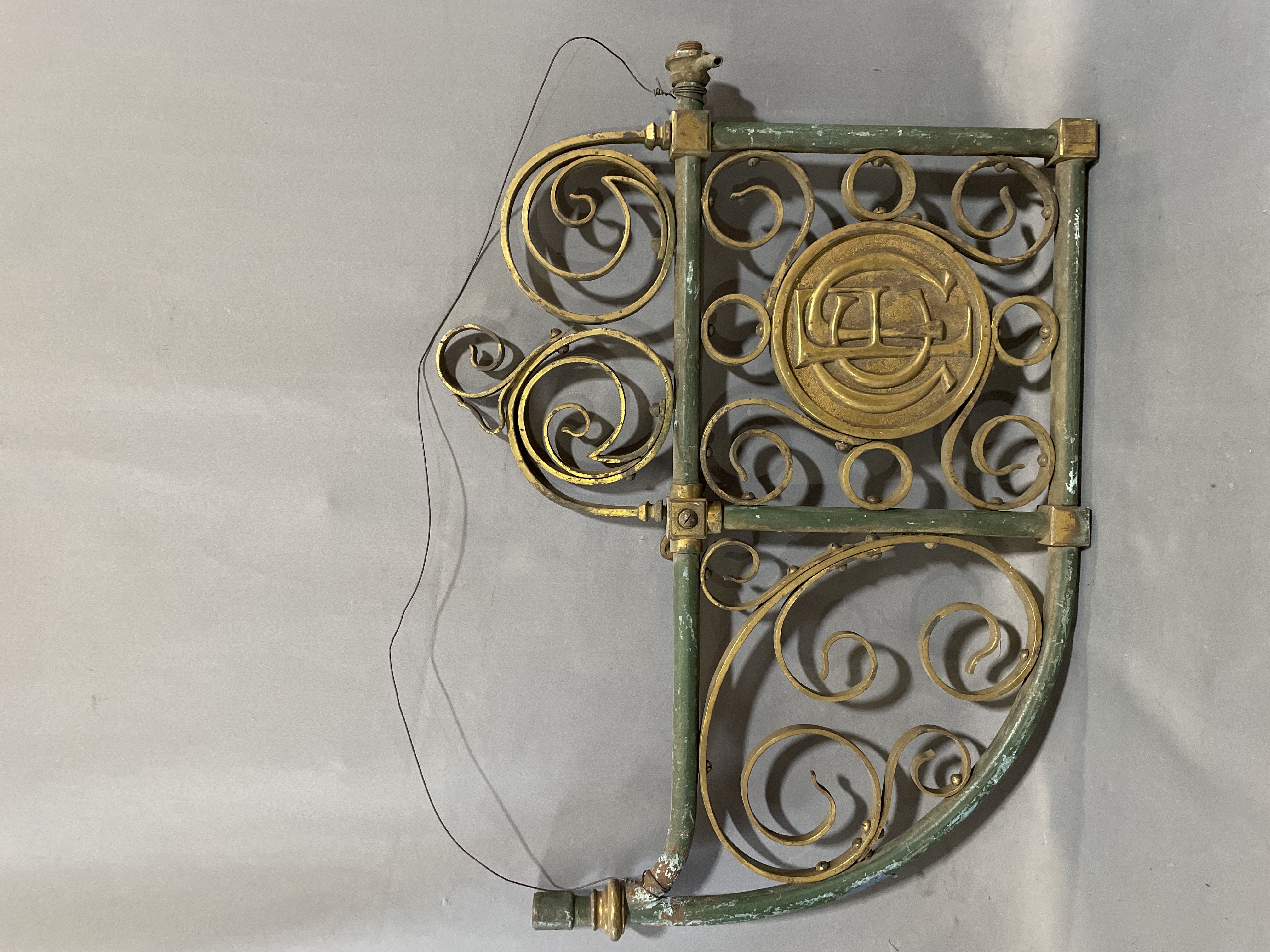 Ornate scroll work with green and gold patina. From the UK around the 1920's or earlier. All rivets and bolts, no welding. Were wall mounted gas lights (missing the gas light). Some screws need adjusting, some scrolls are missing and one section is loose.