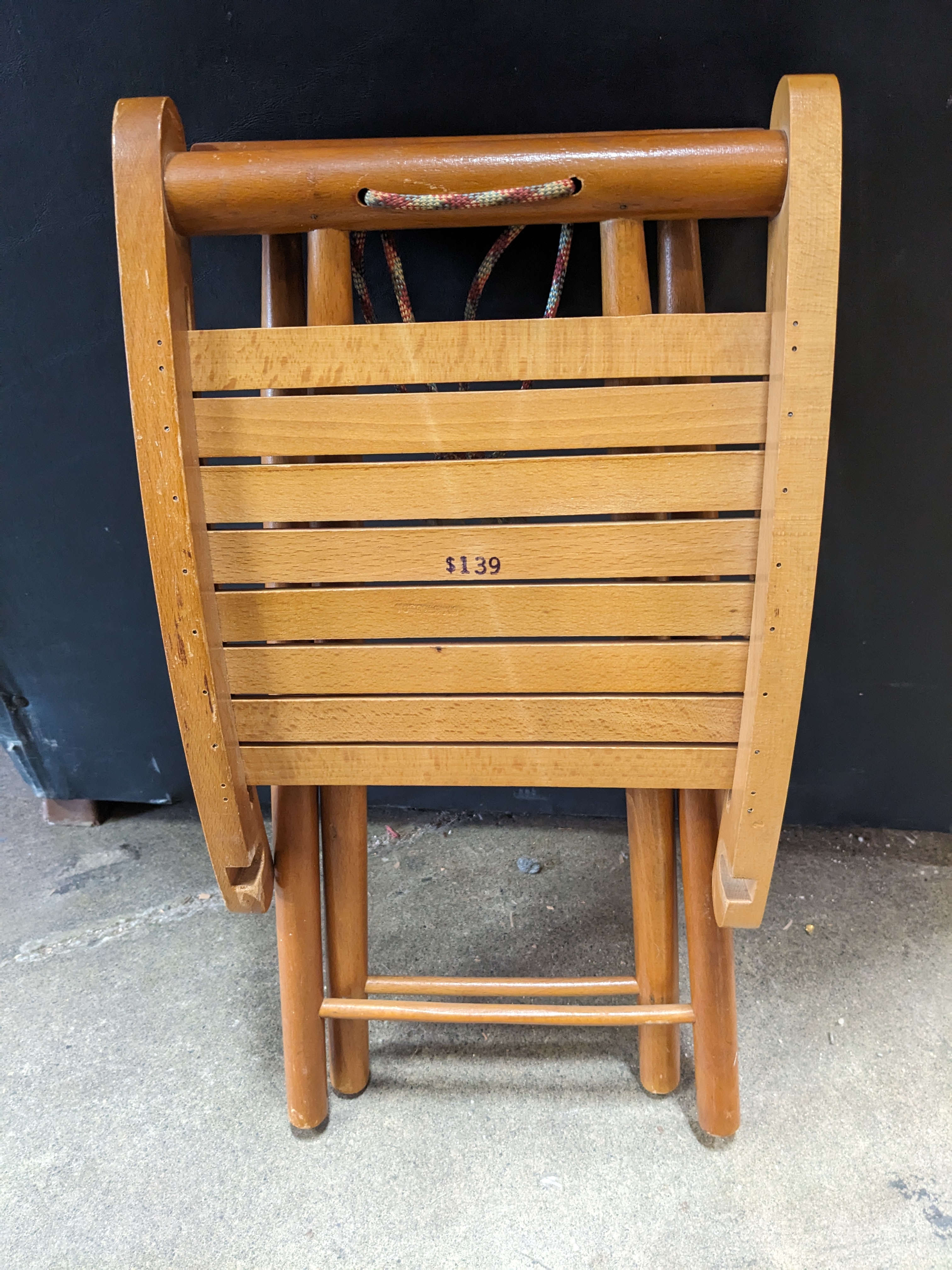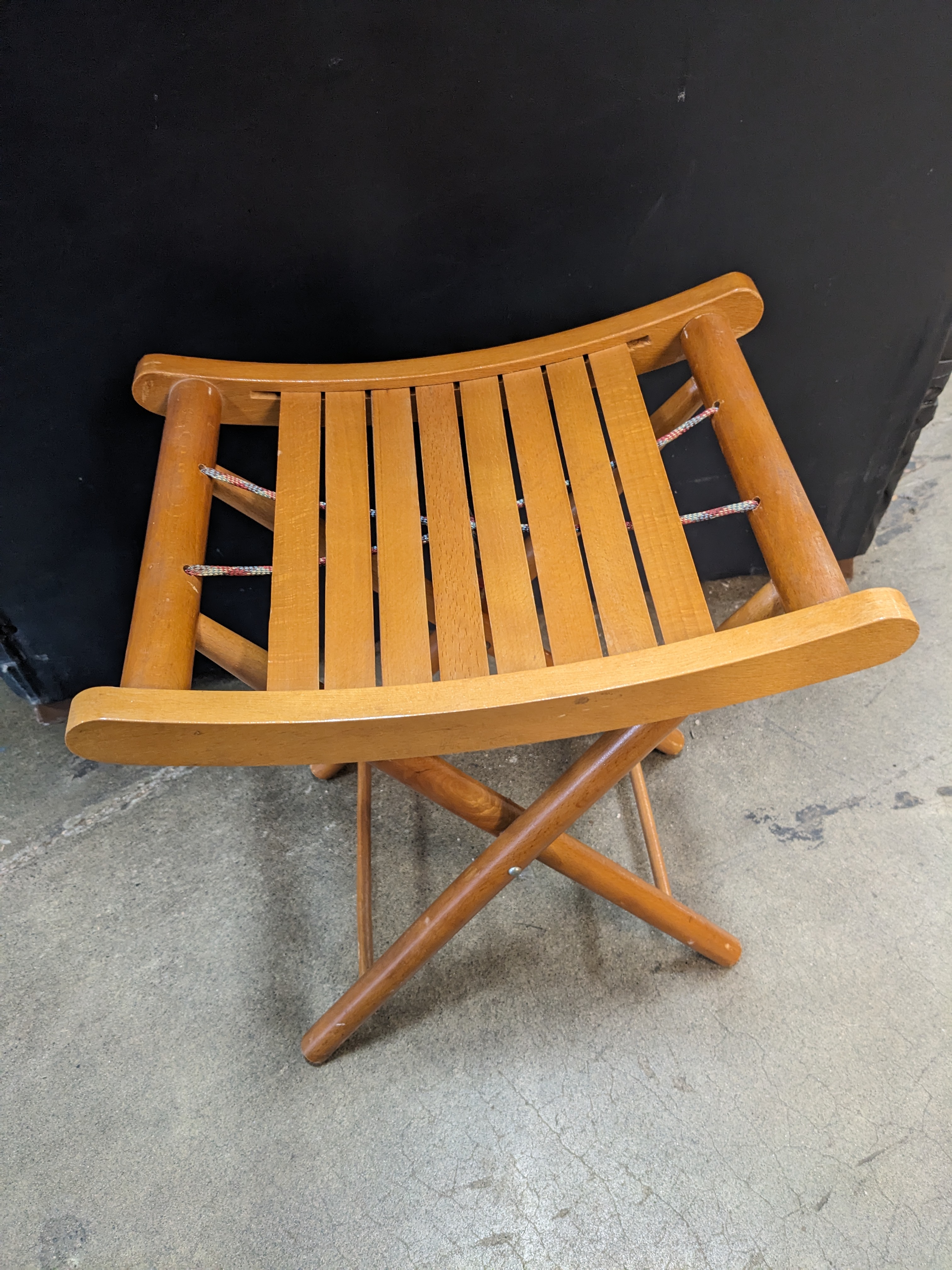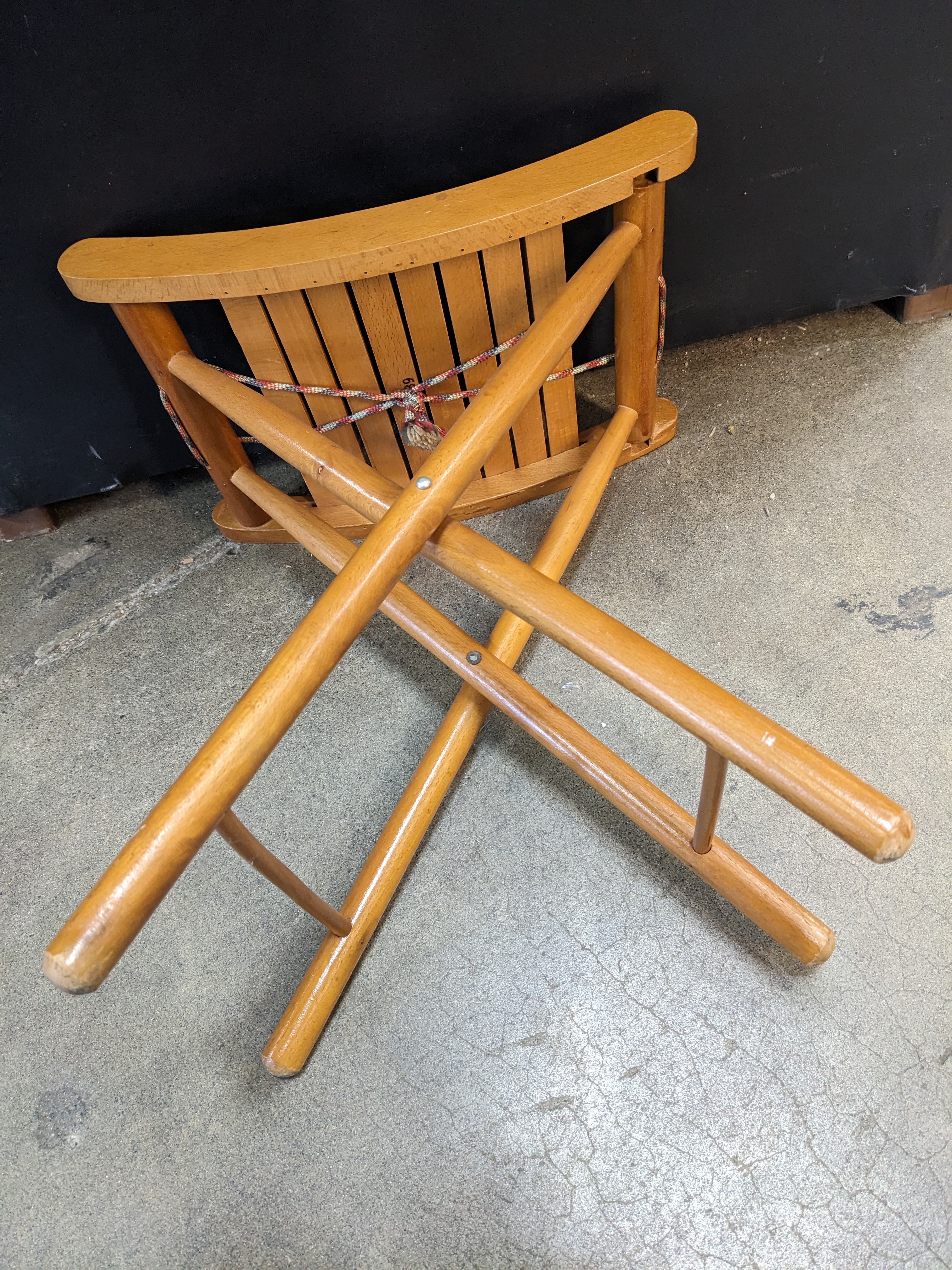This classic camp chair nicely folds up for easy storage when not in use. Perfect for keeping in the car for easy travel. This item is in fantastic condition for its age and can be a swell conversation piece in your home. Manufactured in Yugoslavia.