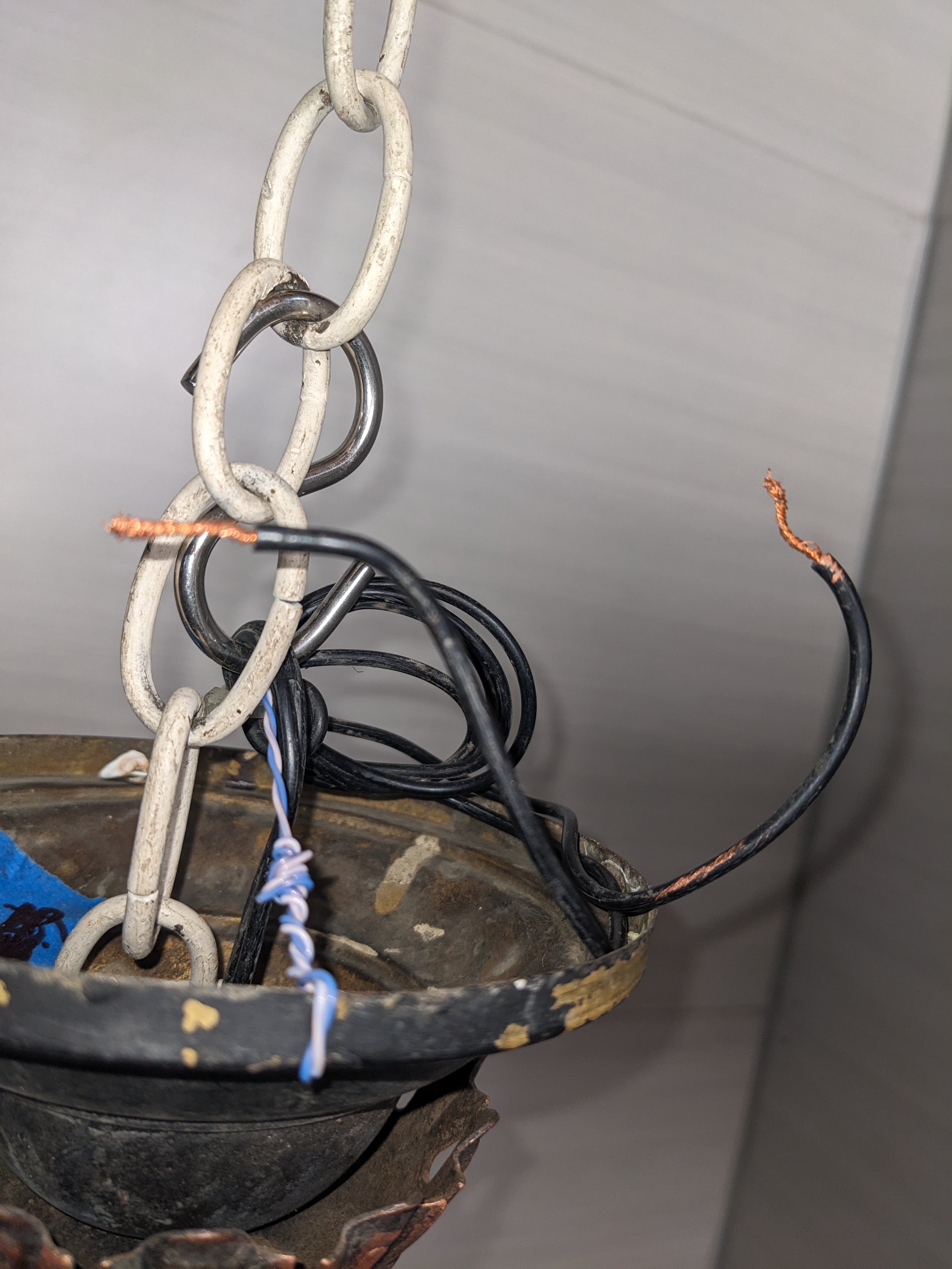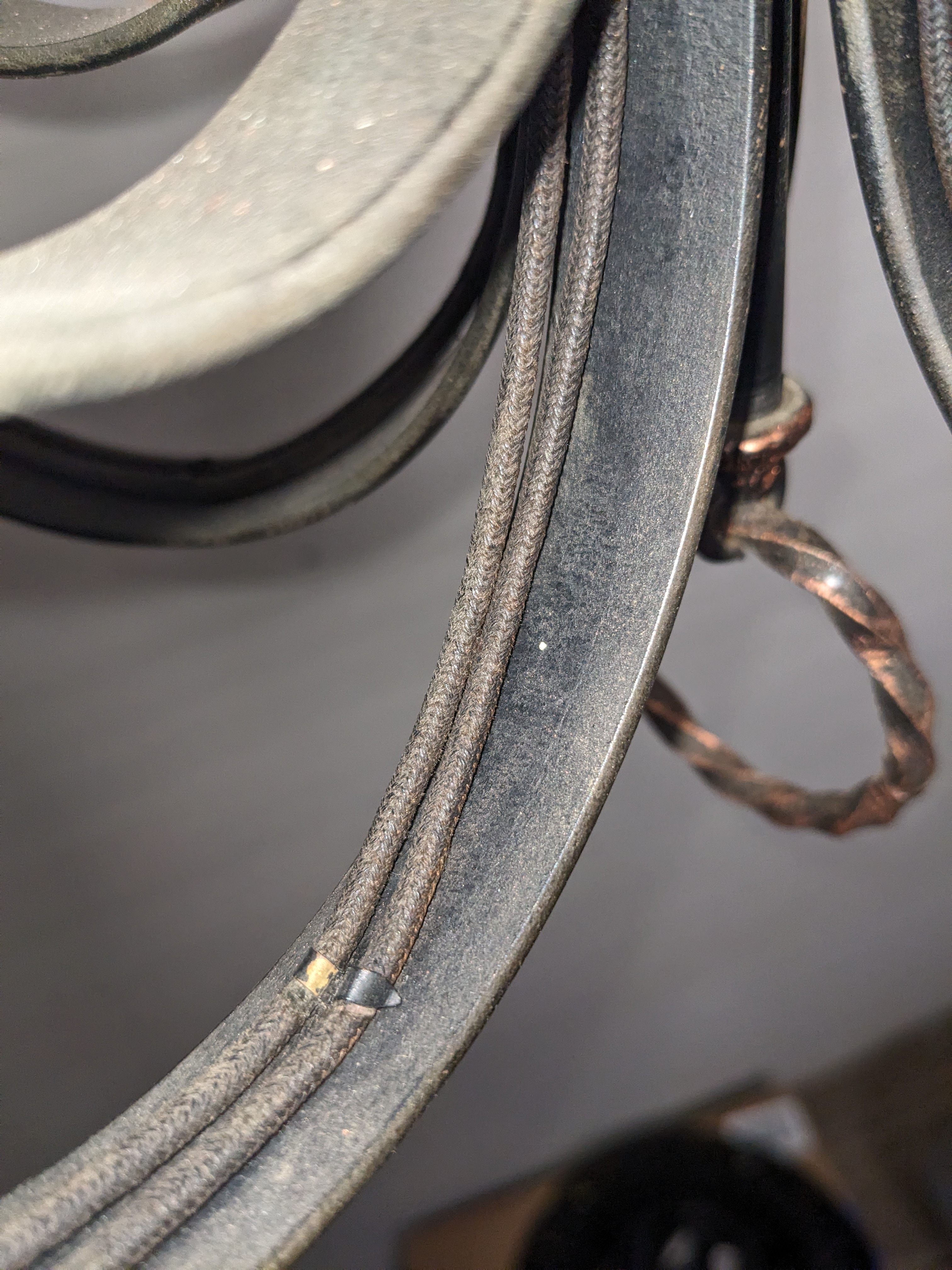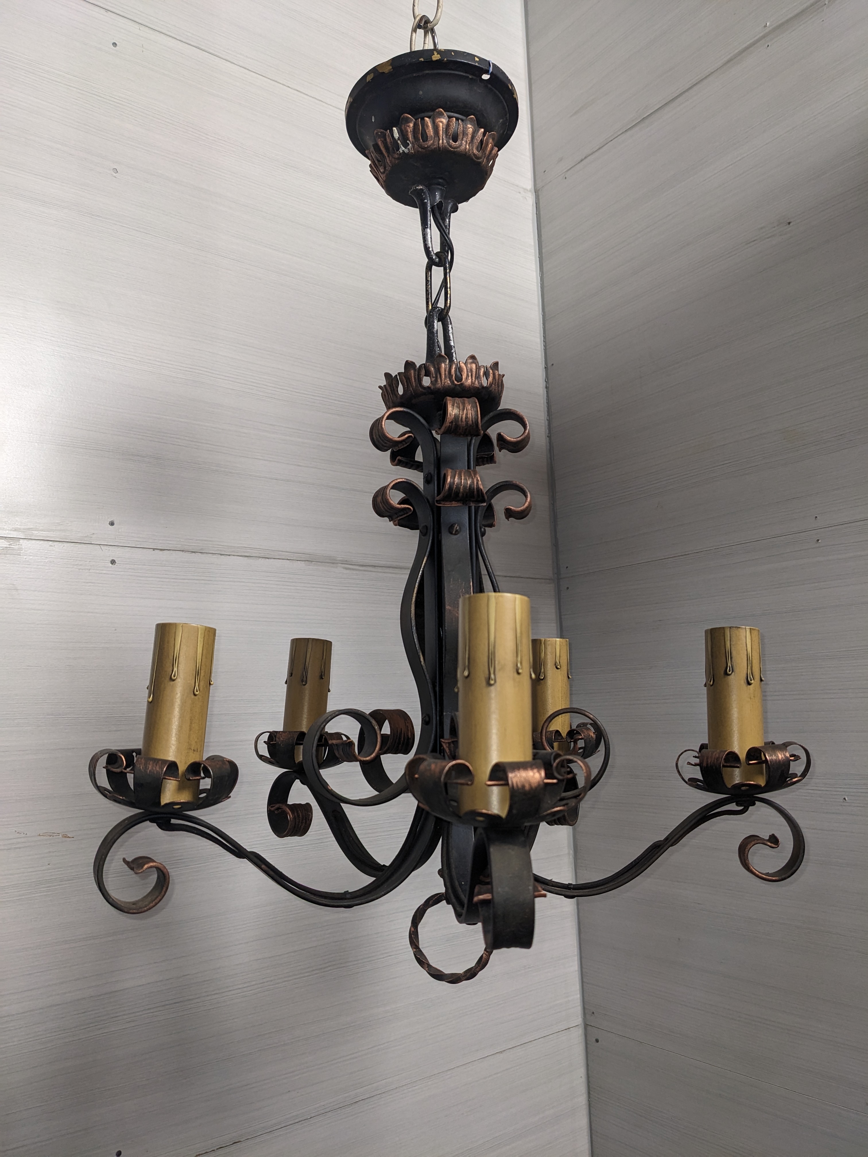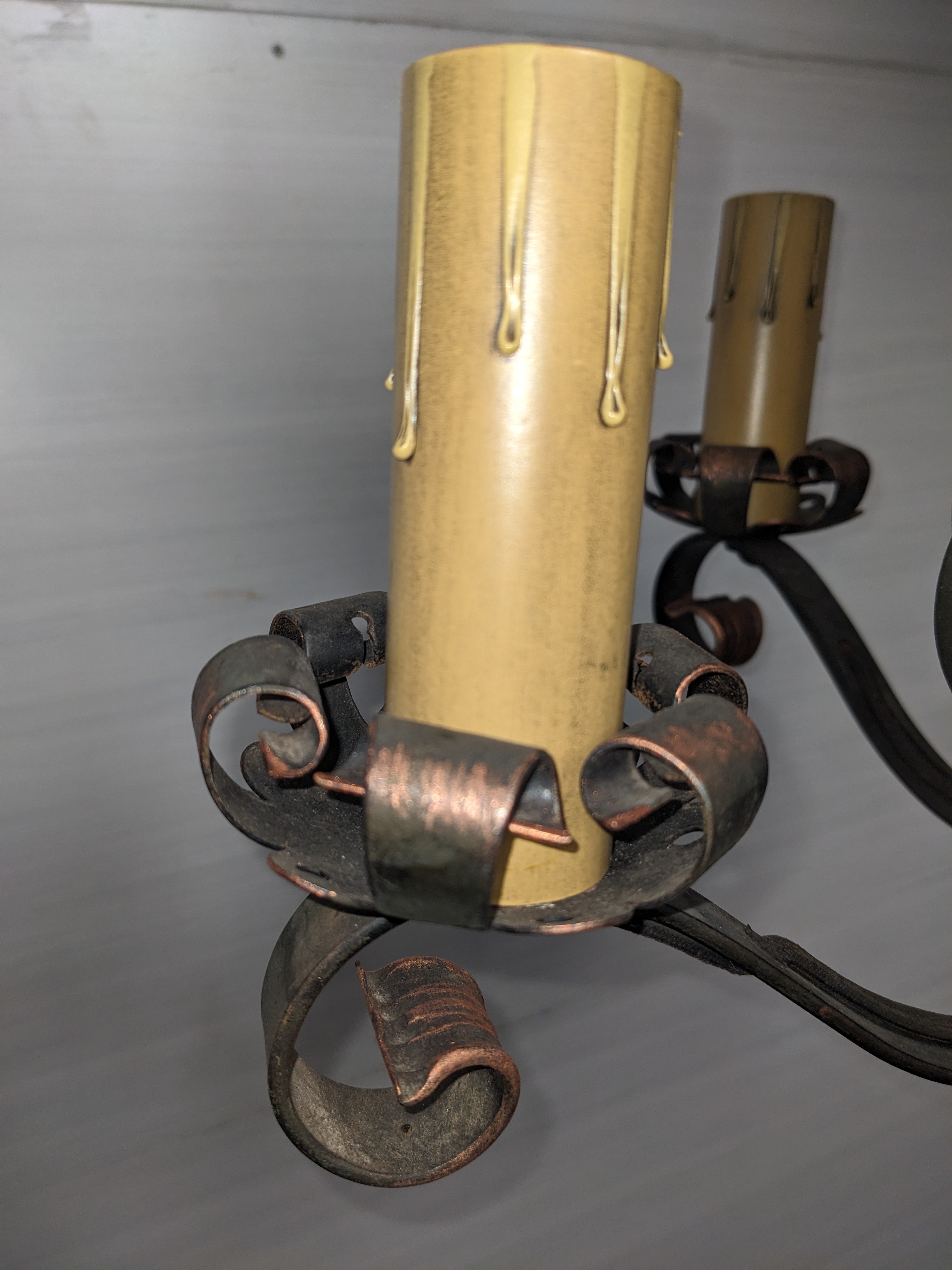 Wrought Iron chandelier with all the scrolls. Black with copper highlights. New candle covers. The wires appear to be newer at the top and older cloth covered coming from the sockets. Visually, the old wires look very good.