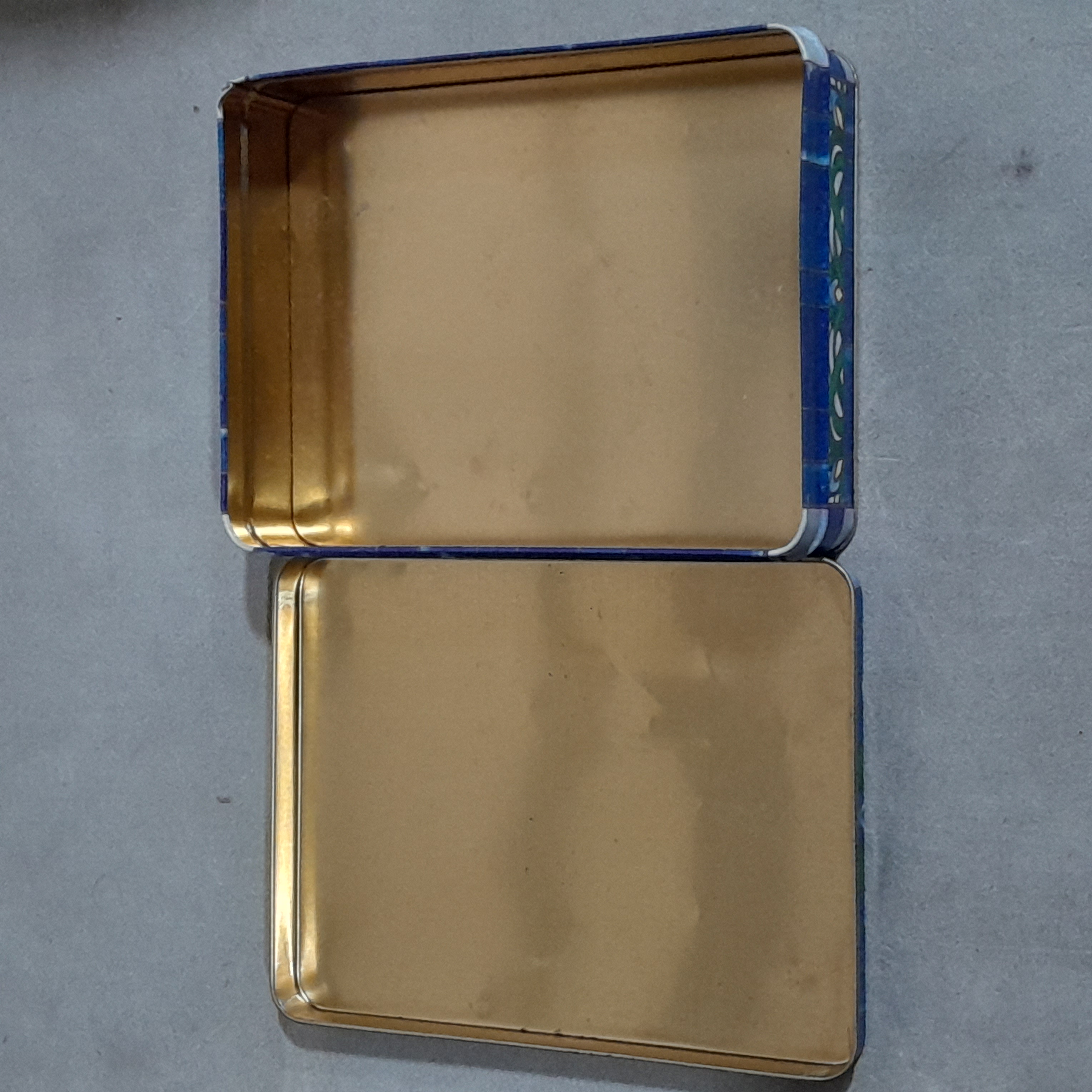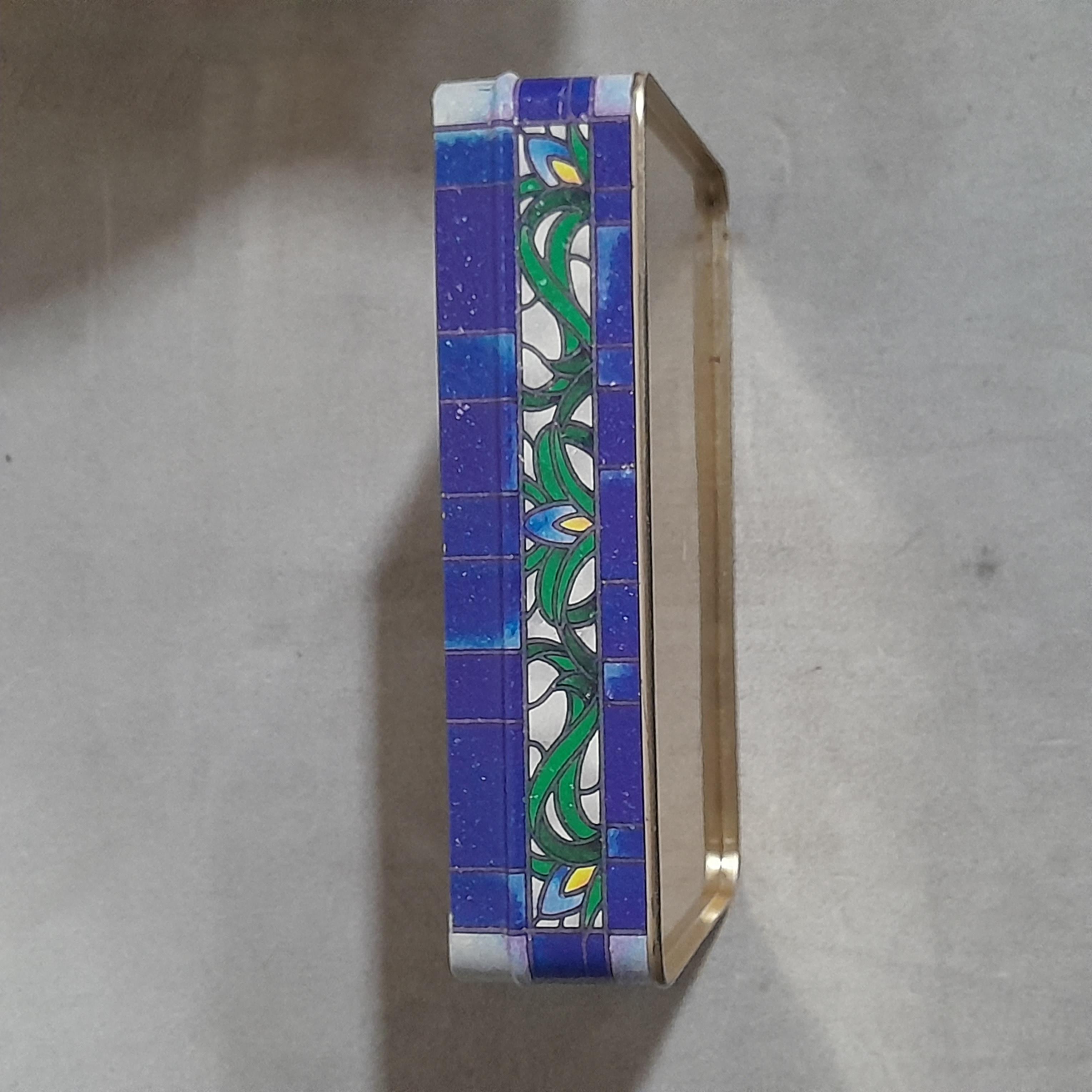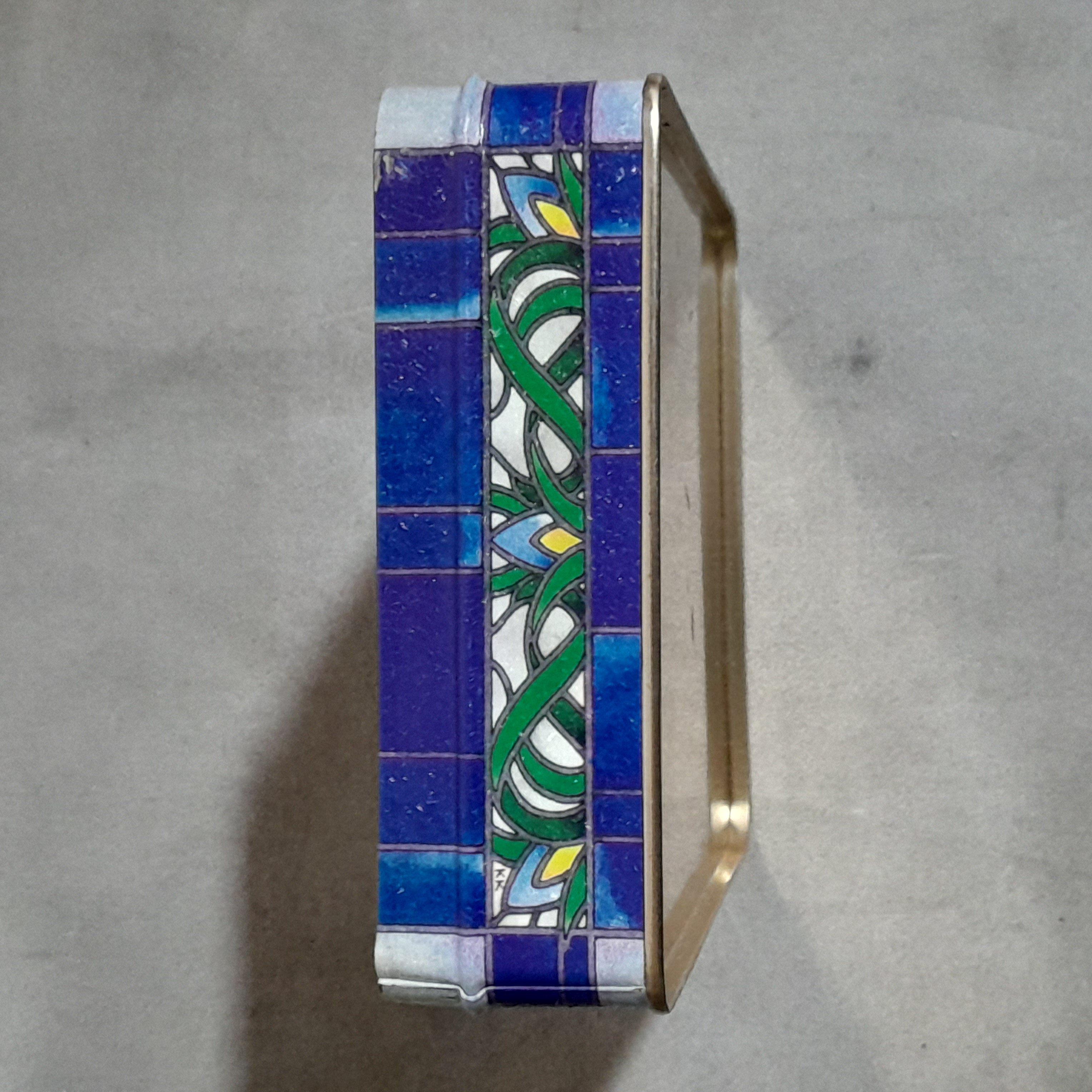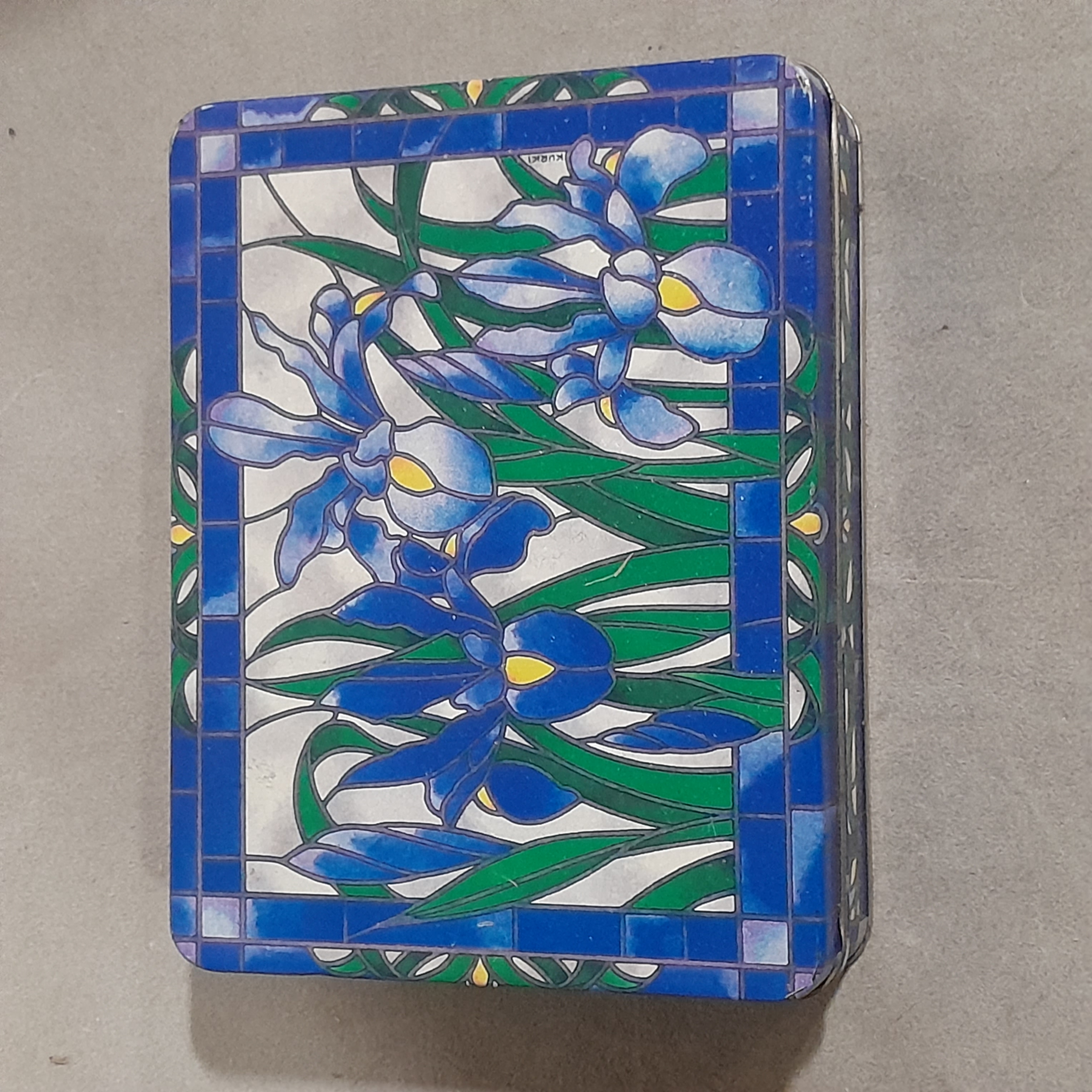This beautiful tin box featuring a patch of Iris flowers could hold all your trinkets. Minimal wear, some small dings but nothing big. No makers mark.