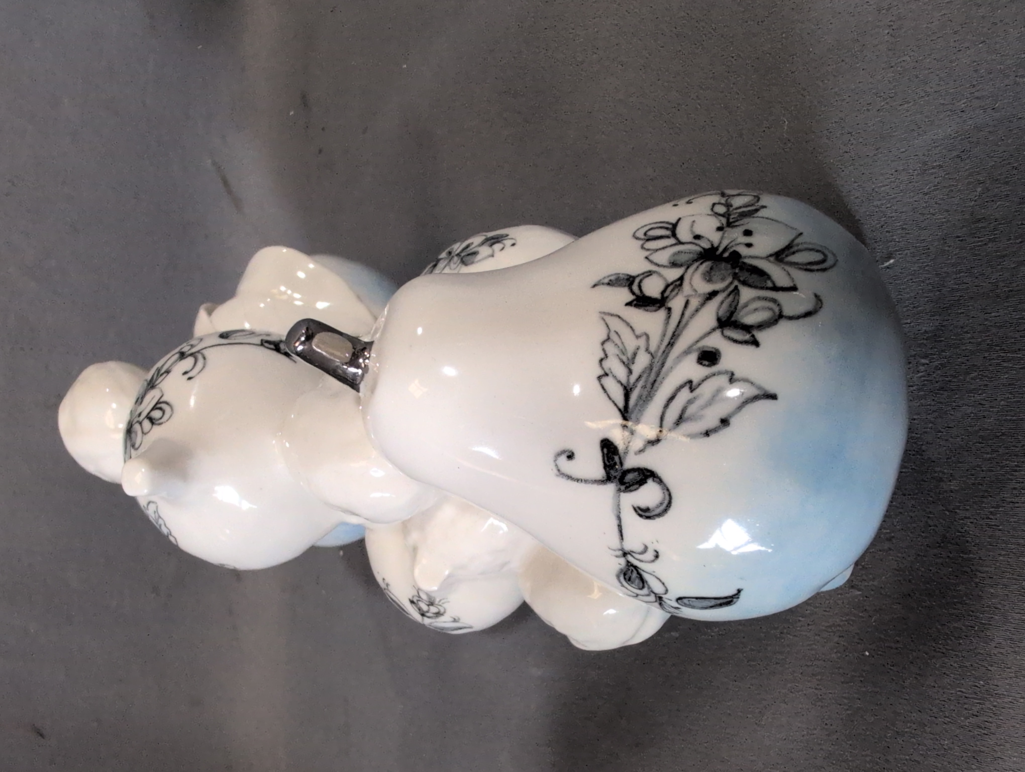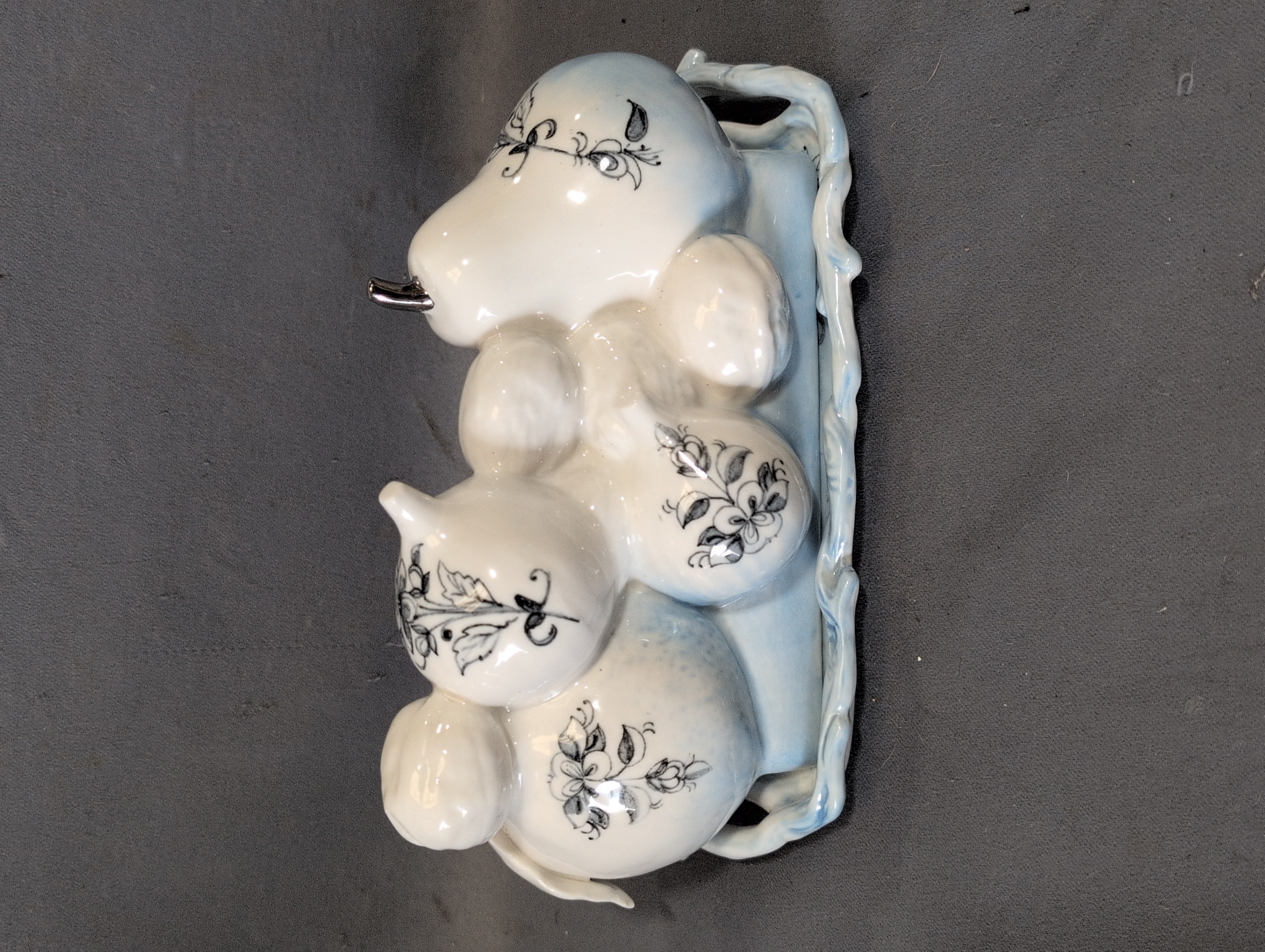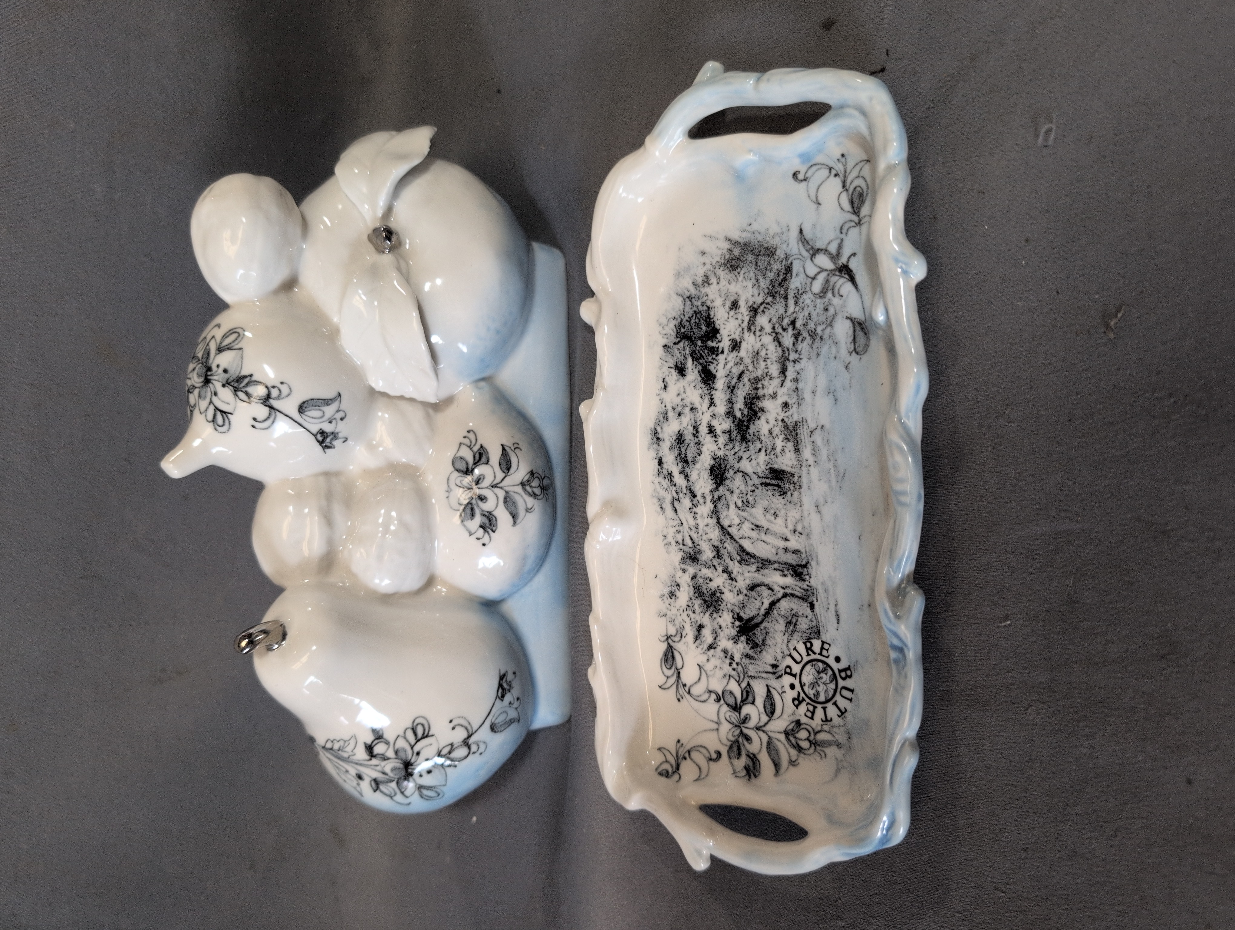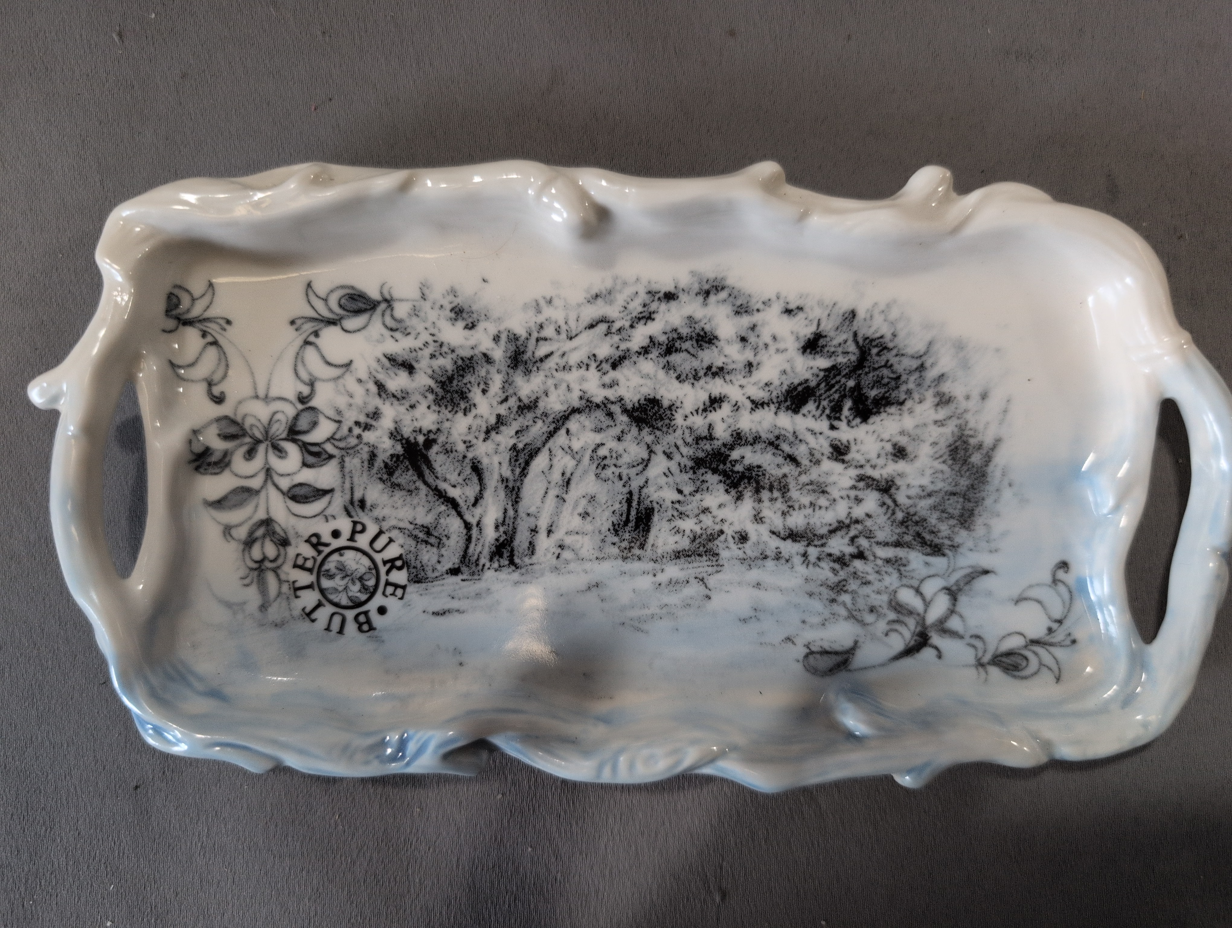 White and blue ceramic "pure butter" dish made by Anthropologie. Features a forelle and fruit design with etched floral elements. Now, some might call this a bit ostentatious for a butter dish, but those people don't have a pure butter heart. Live free, live wild butter fans.