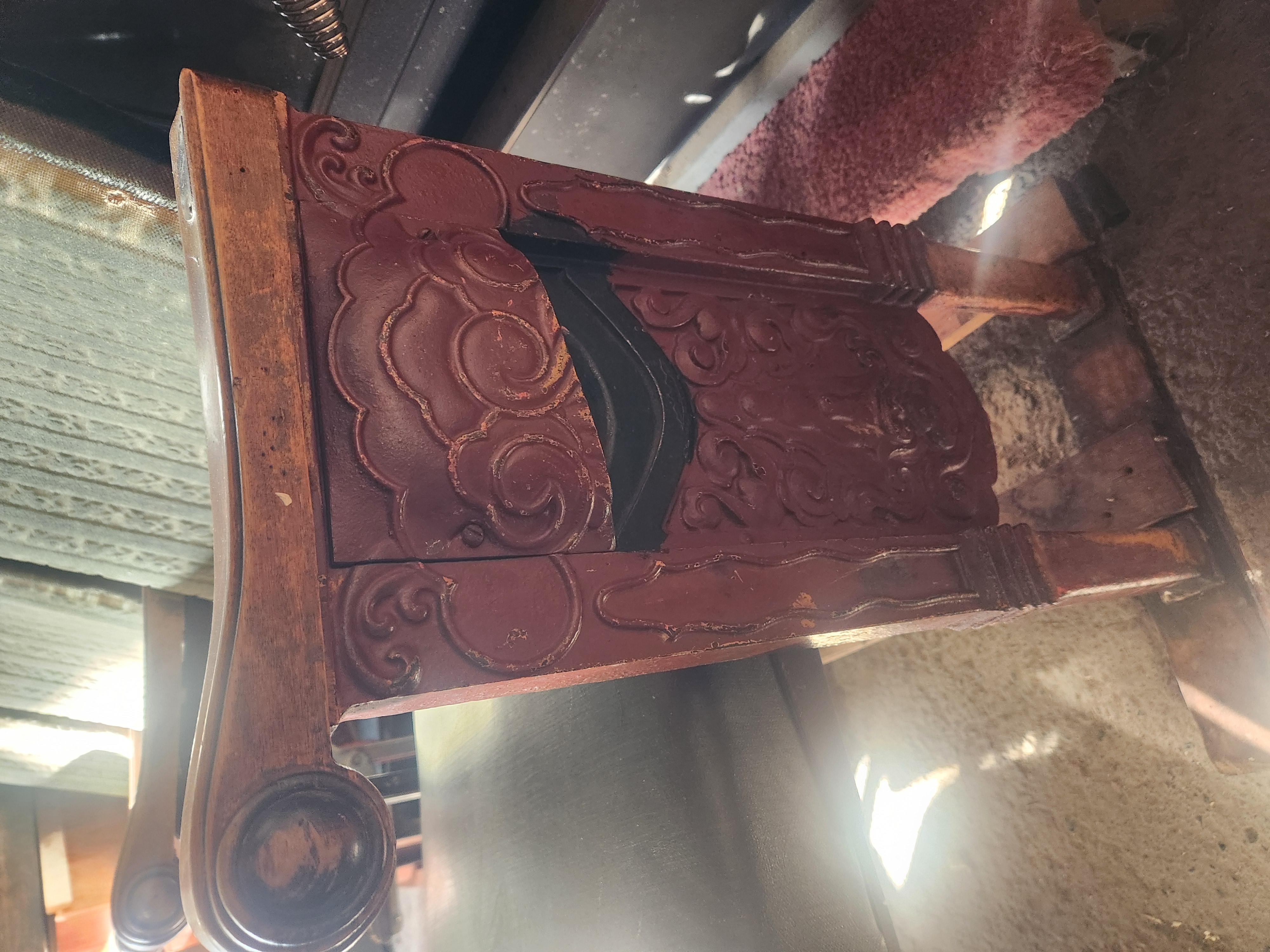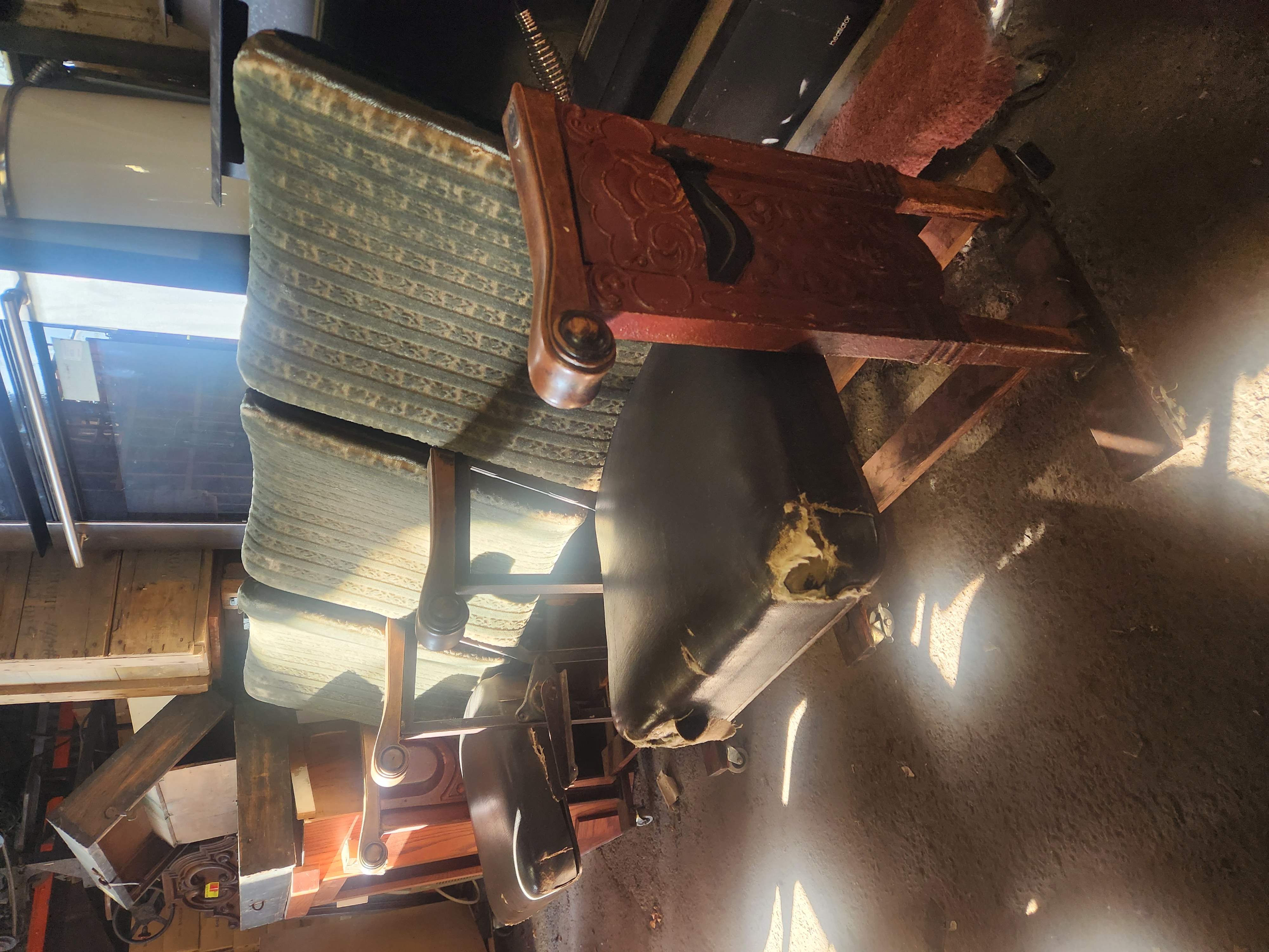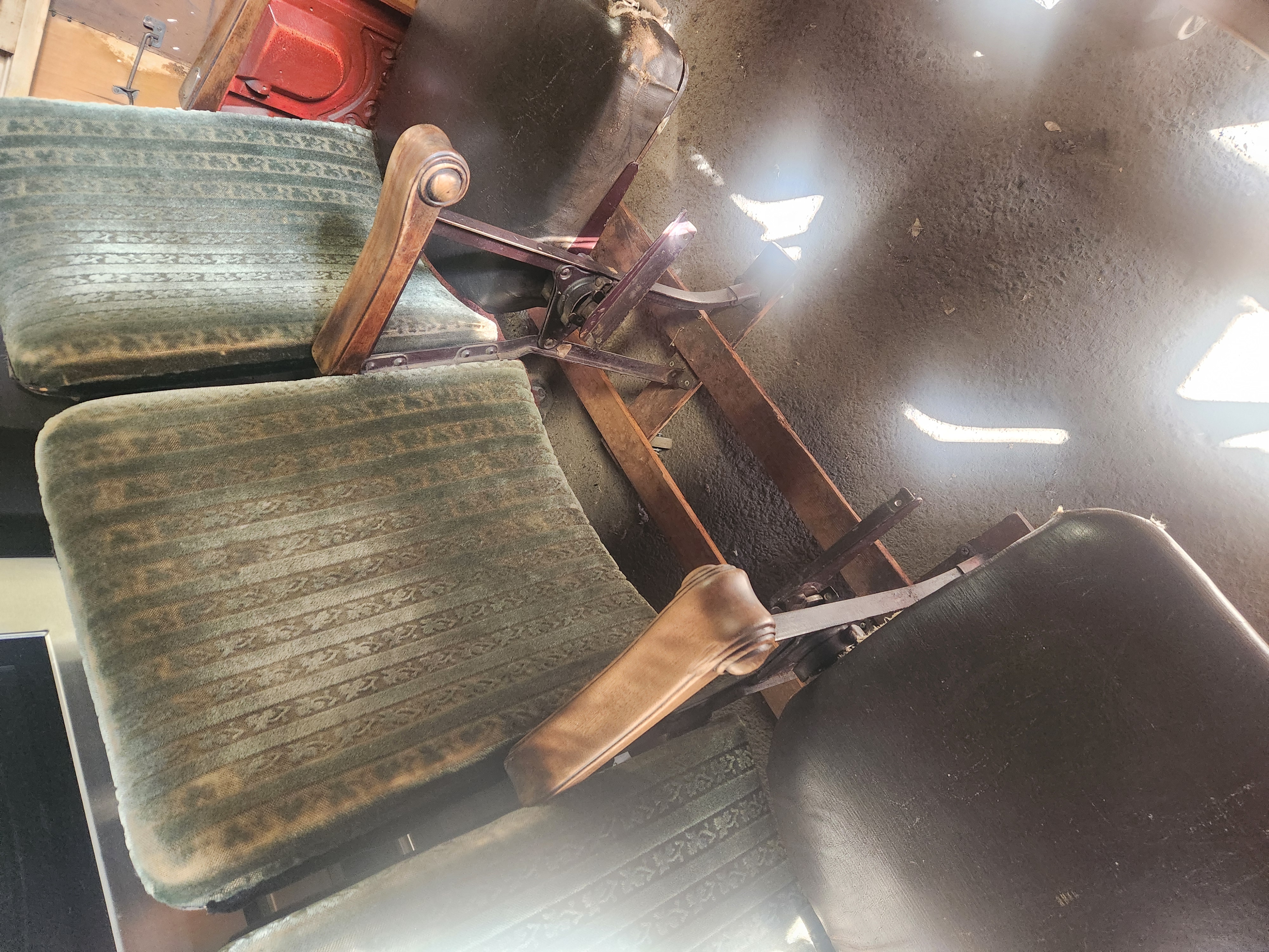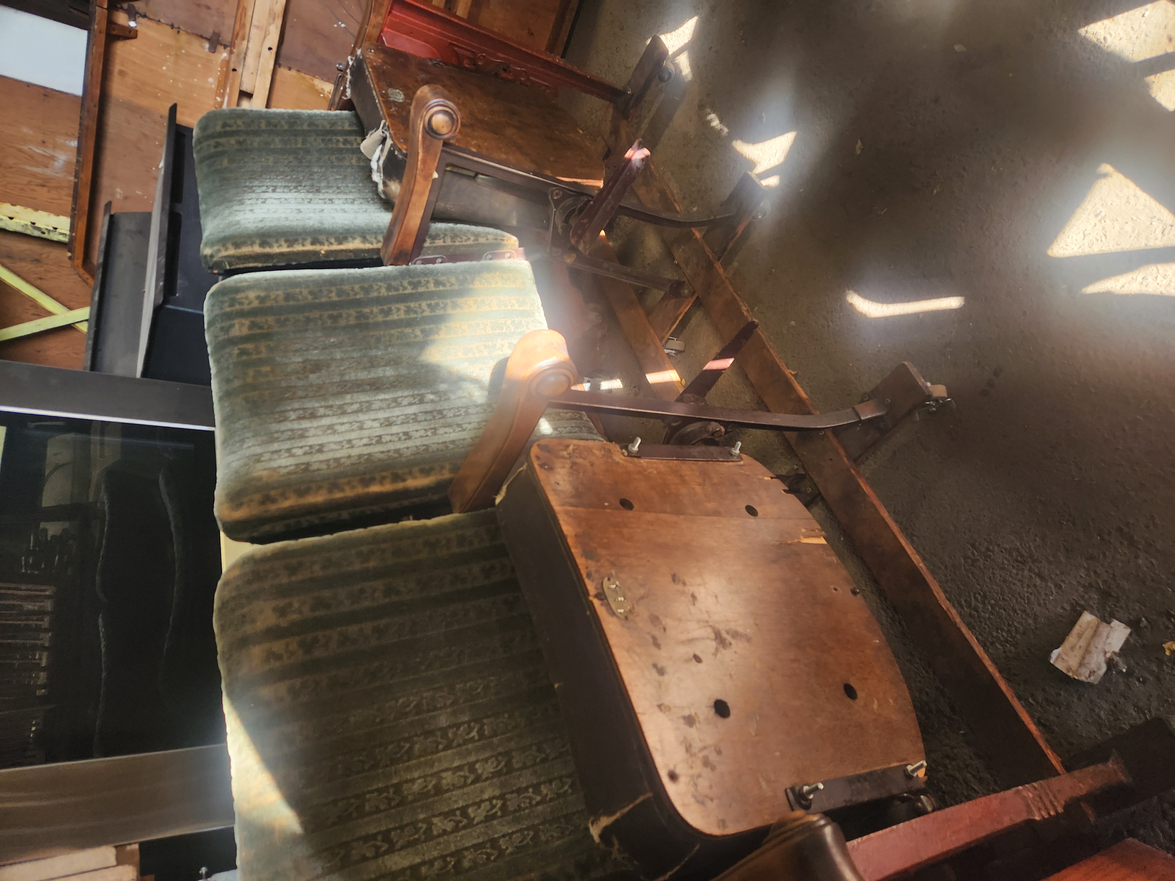 Wonderful set of 3 beautiful Velvet theater seats, perfect for movie night. They could use some love in the upholstery. Other than that, they are comfortable and in decent condition. This set is unfortunately missing the middle seat. They are attached to rollers for ease of moving. The ends are adorned with decorative cast iron pieces. This set measures 66.5 x 36.5 x 22 inches.