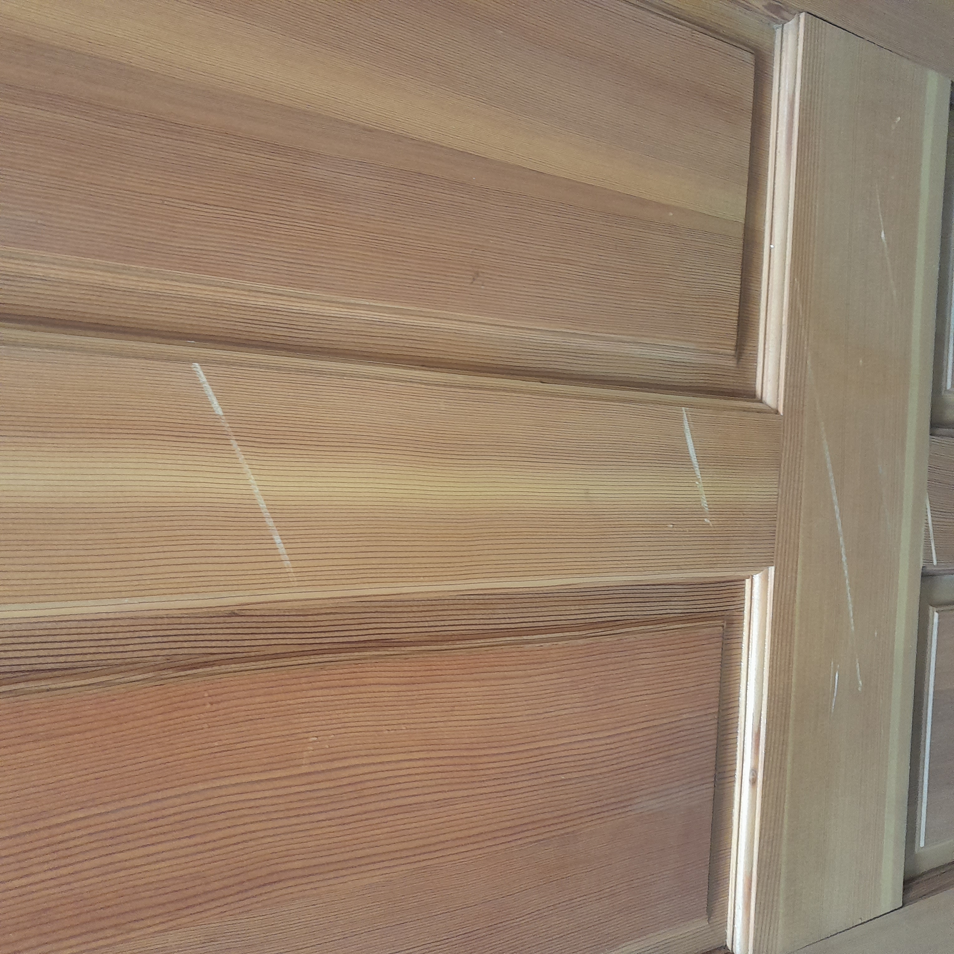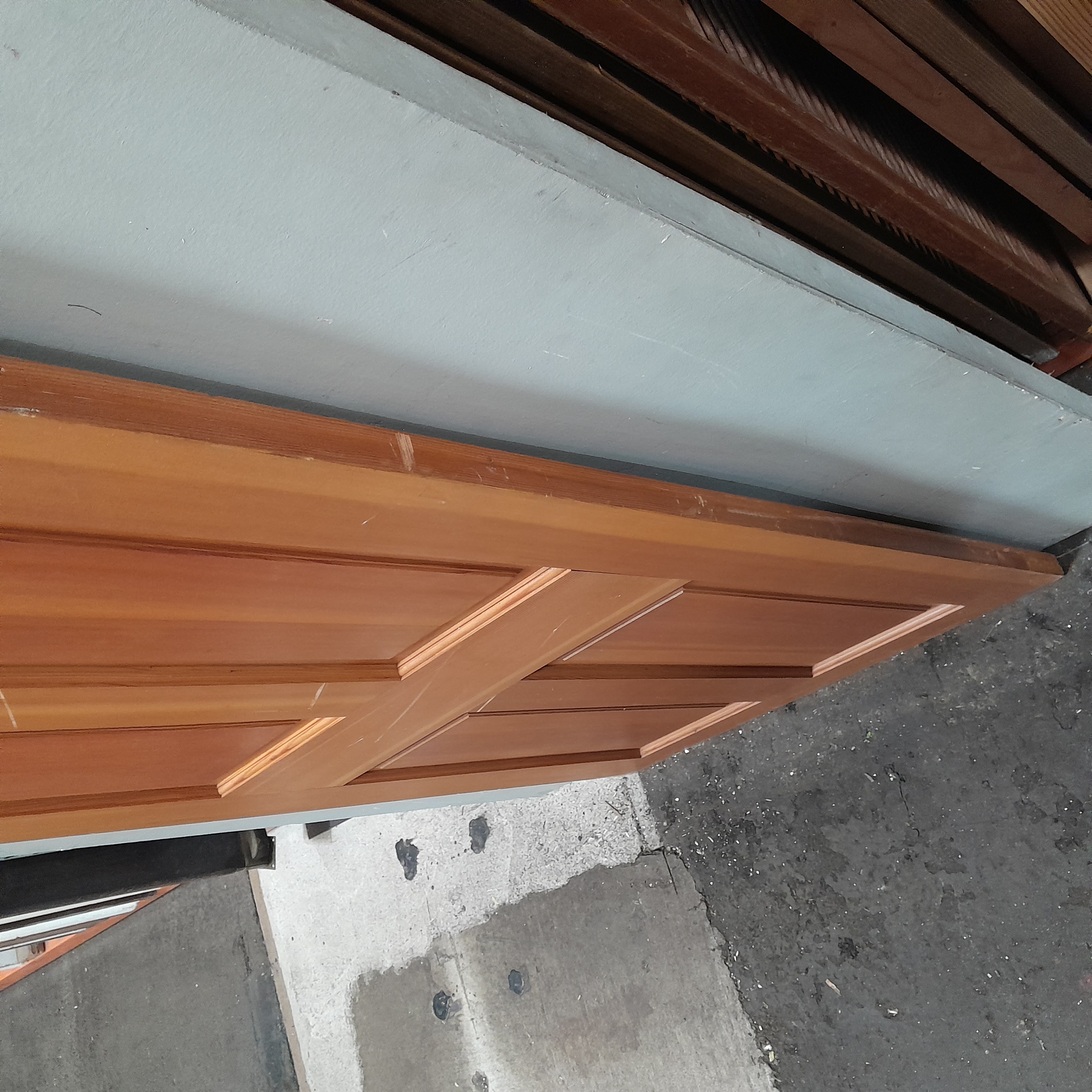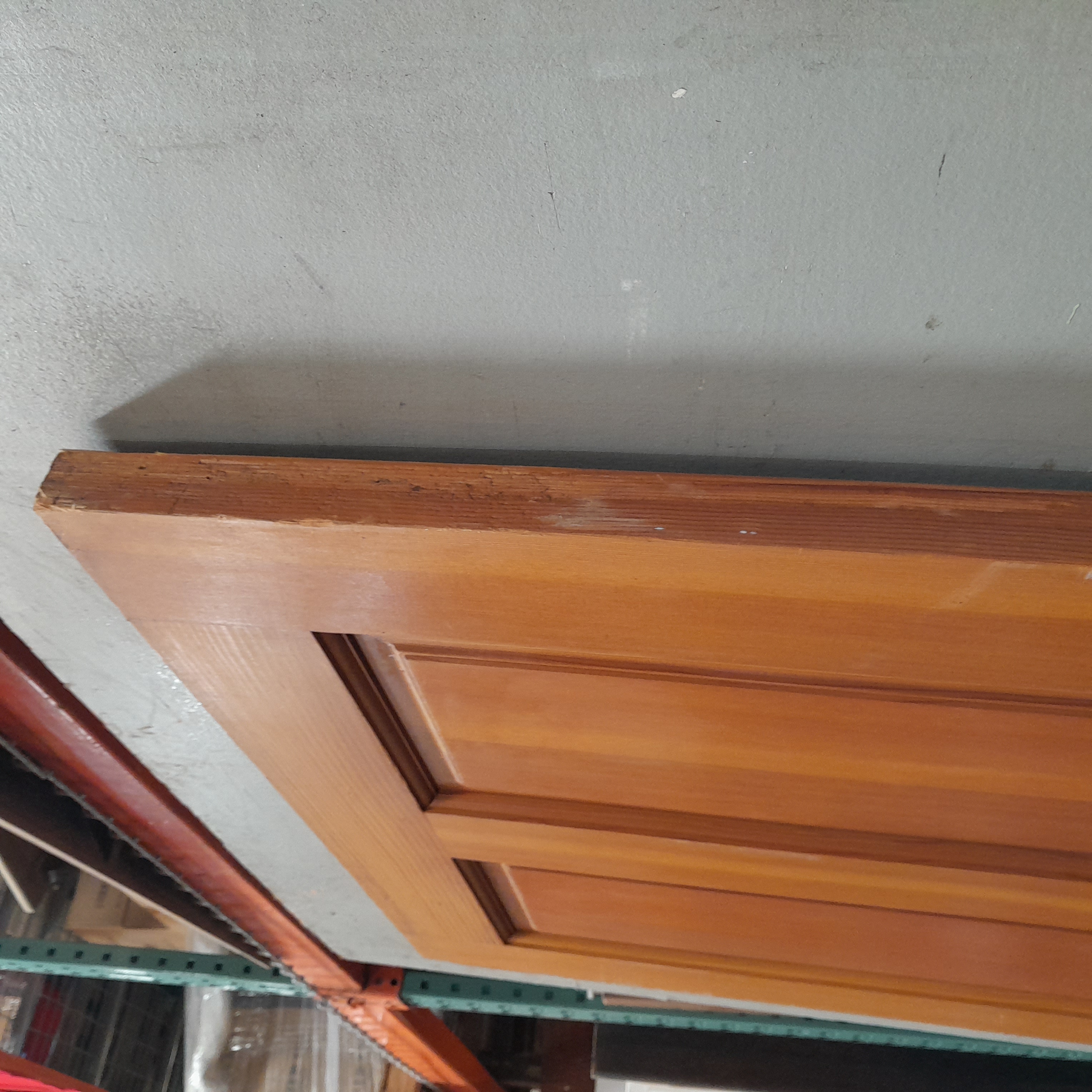 This door appears to have been started as a project and then someone gave up immediately. The bottom 6th of one side was stained and that is it. Maybe they didn't like the color? Perhaps they found a new door that was less work to install? We'll never know. The door has some scratches, scrapes and dents. Could be a really beautiful door with the right time and attention. Made of cvg Fir, it is sturdy.