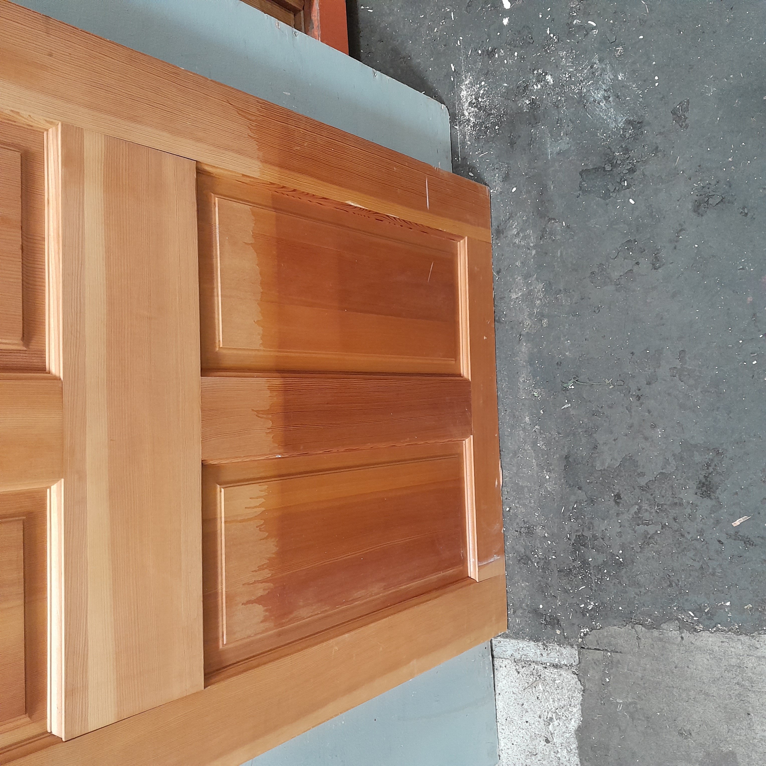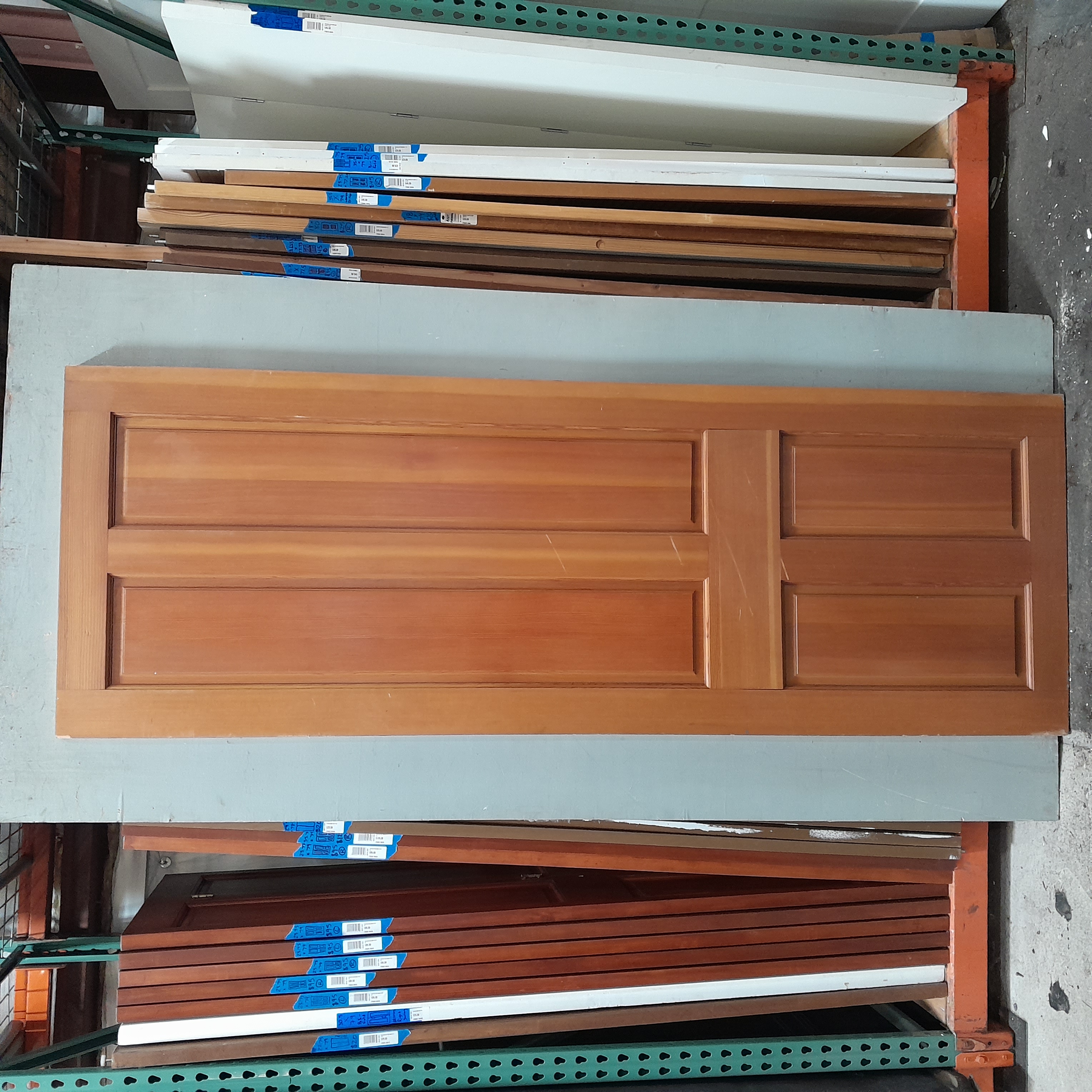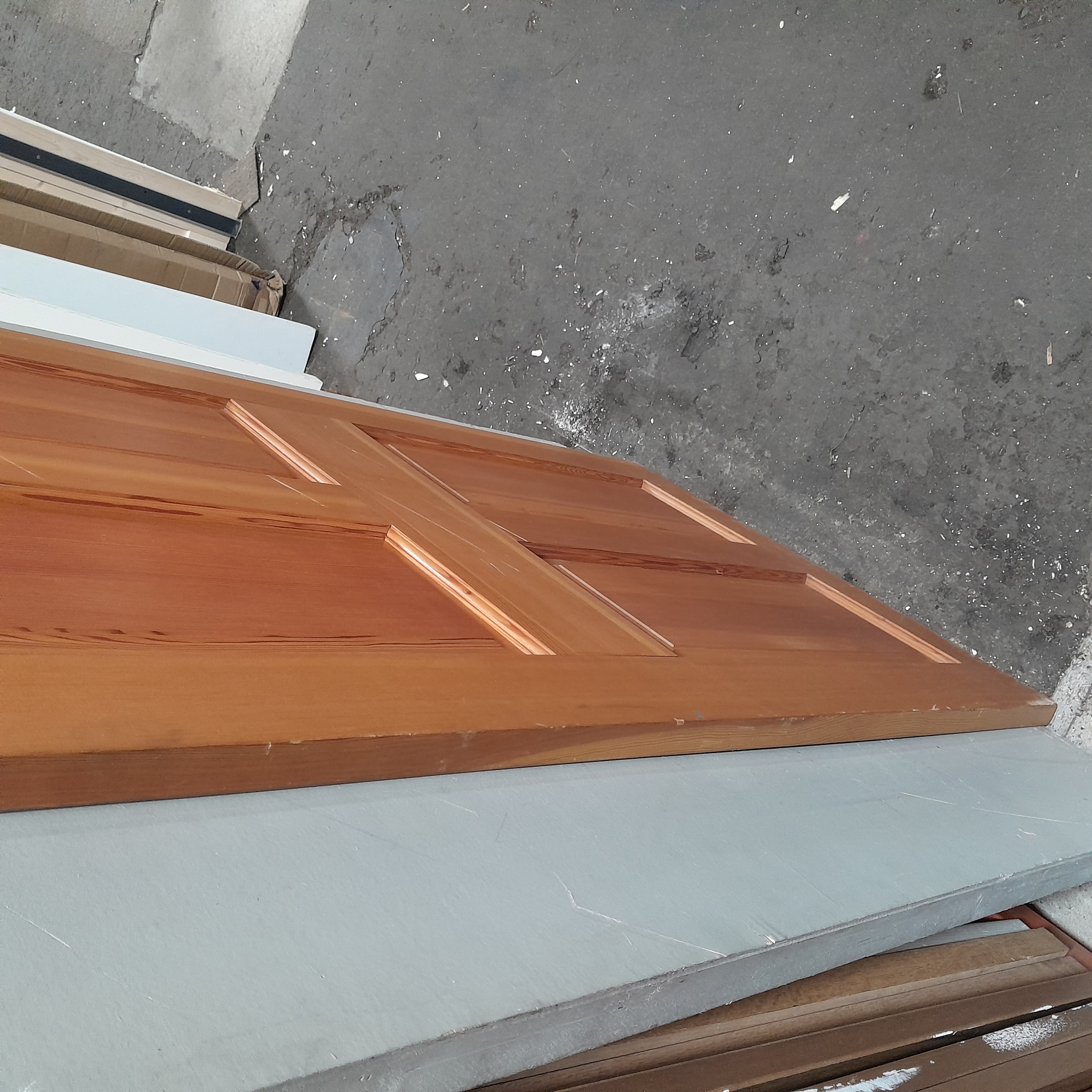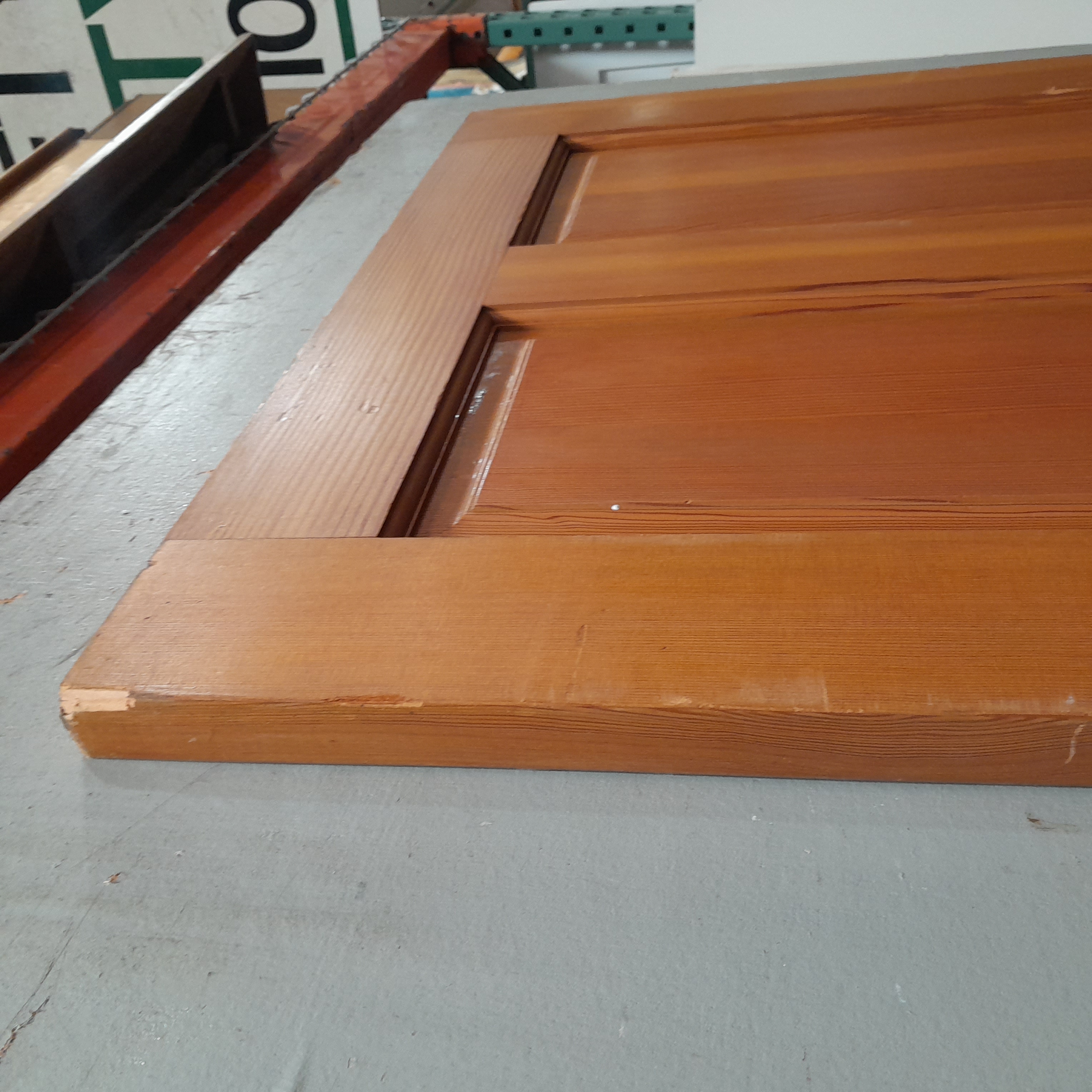 This door appears to have been started as a project and then someone gave up immediately. The bottom 6th of one side was stained and that is it. Maybe they didn't like the color? Perhaps they found a new door that was less work to install? We'll never know. The door has some scratches, scrapes and dents. Could be a really beautiful door with the right time and attention. Made of cvg Fir, it is sturdy.