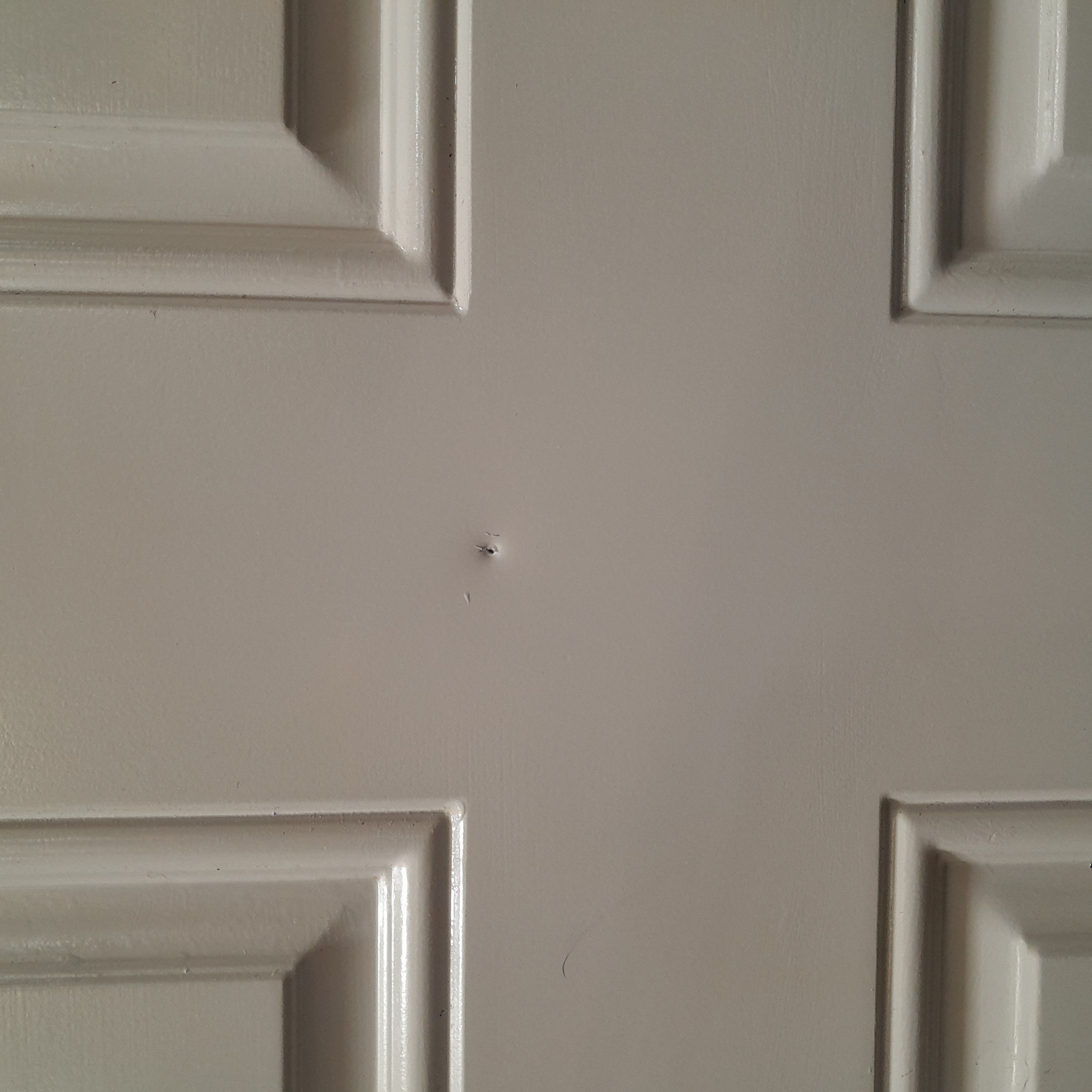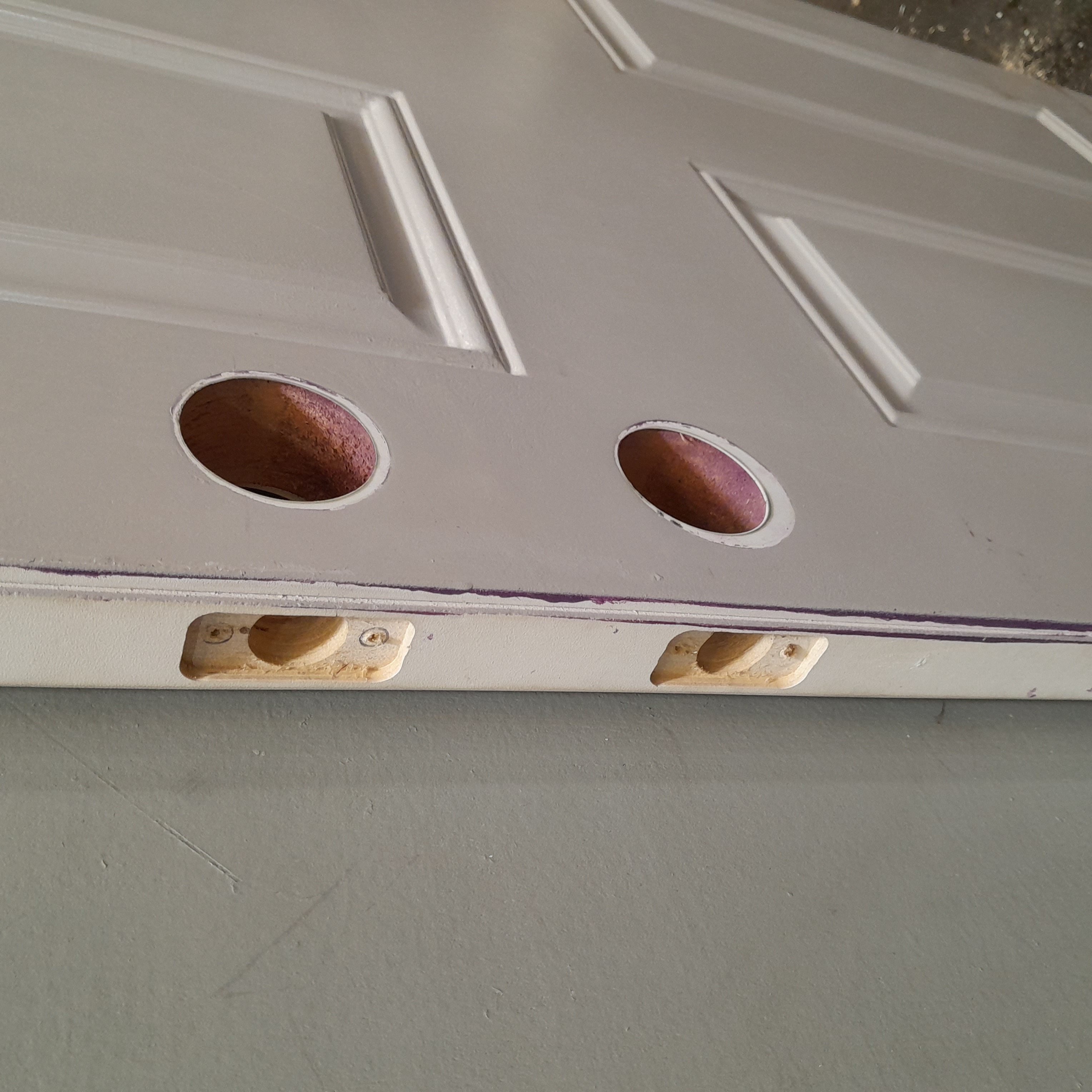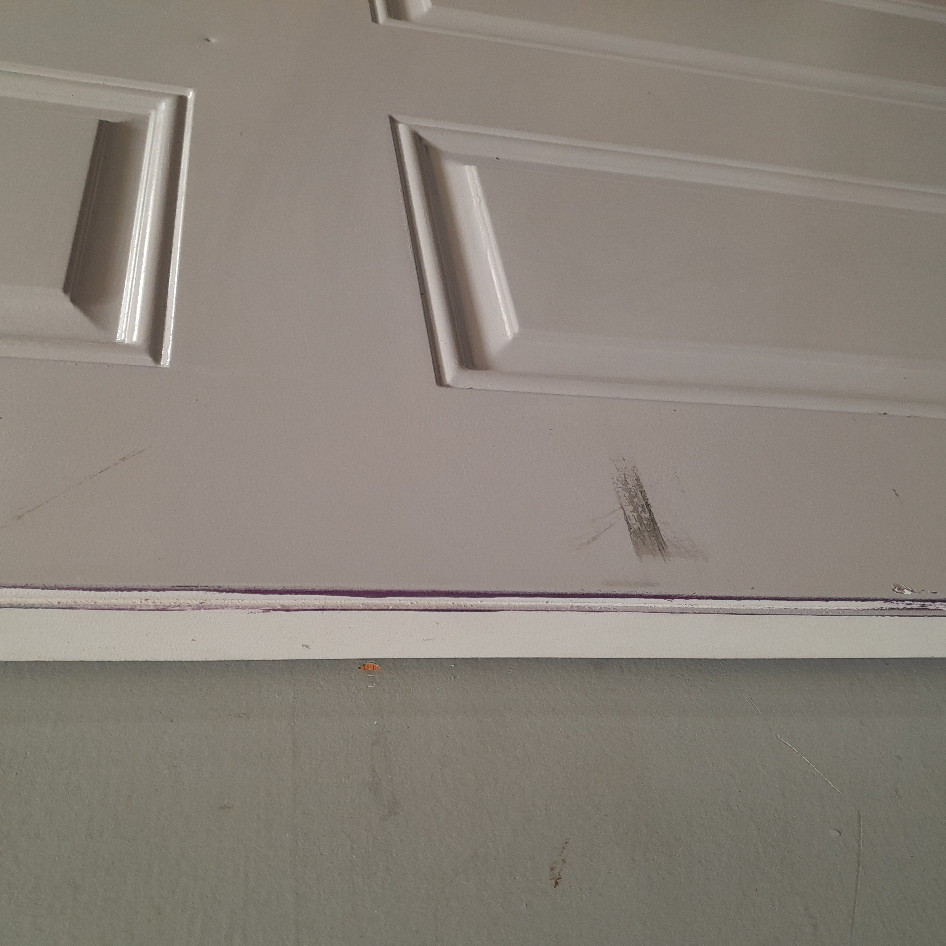 This door has seen better days, could be a good project. It has scuffs and scrapes. Some over sprayed purple paint on the edges. Light weight but solid. Has hole for deadbolt.