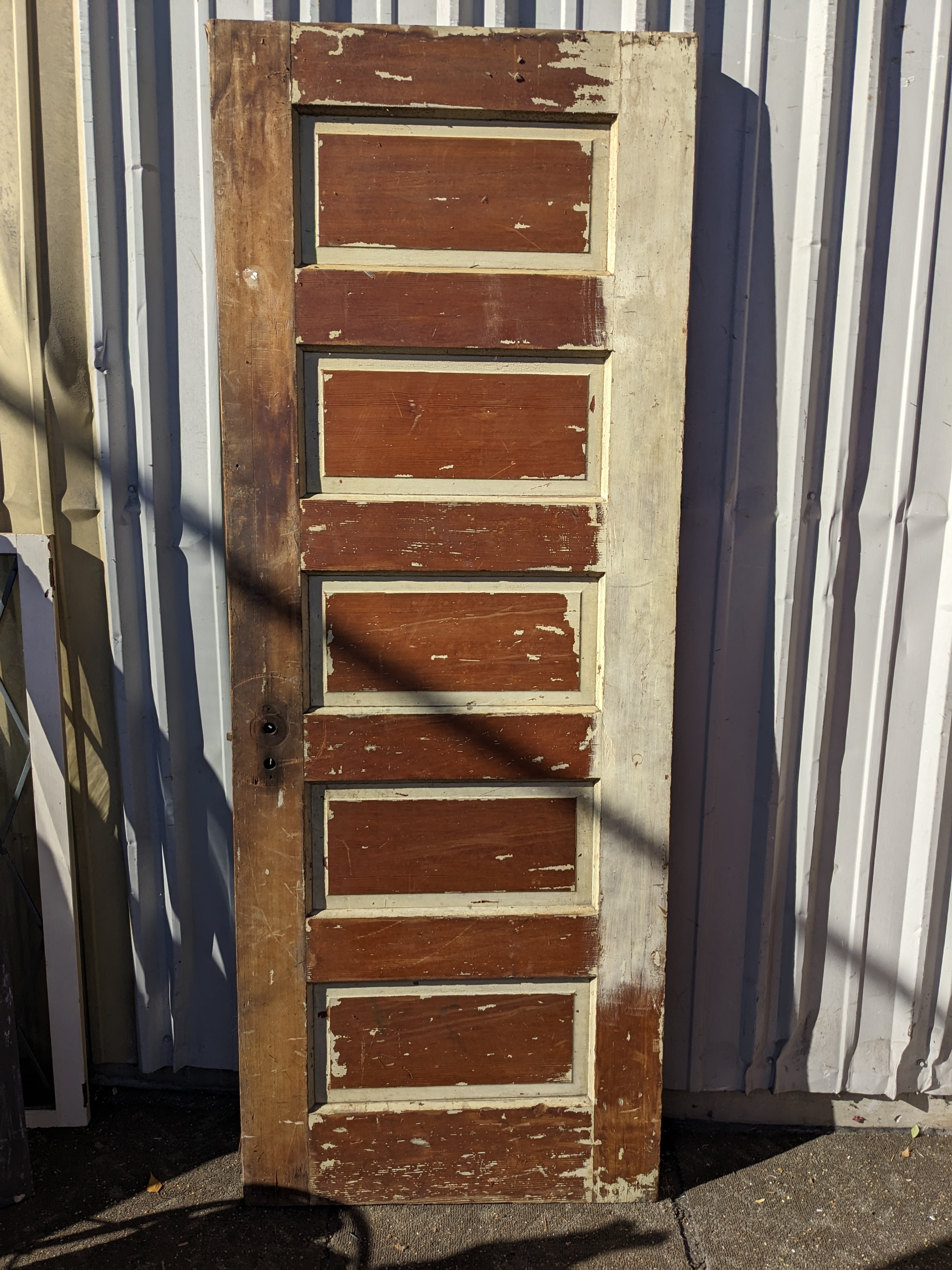 Slightly shabby condition for 5 panel door. Someone attempted to strip p aint. Bottom cut at angle, Height varies between 79-78 in
